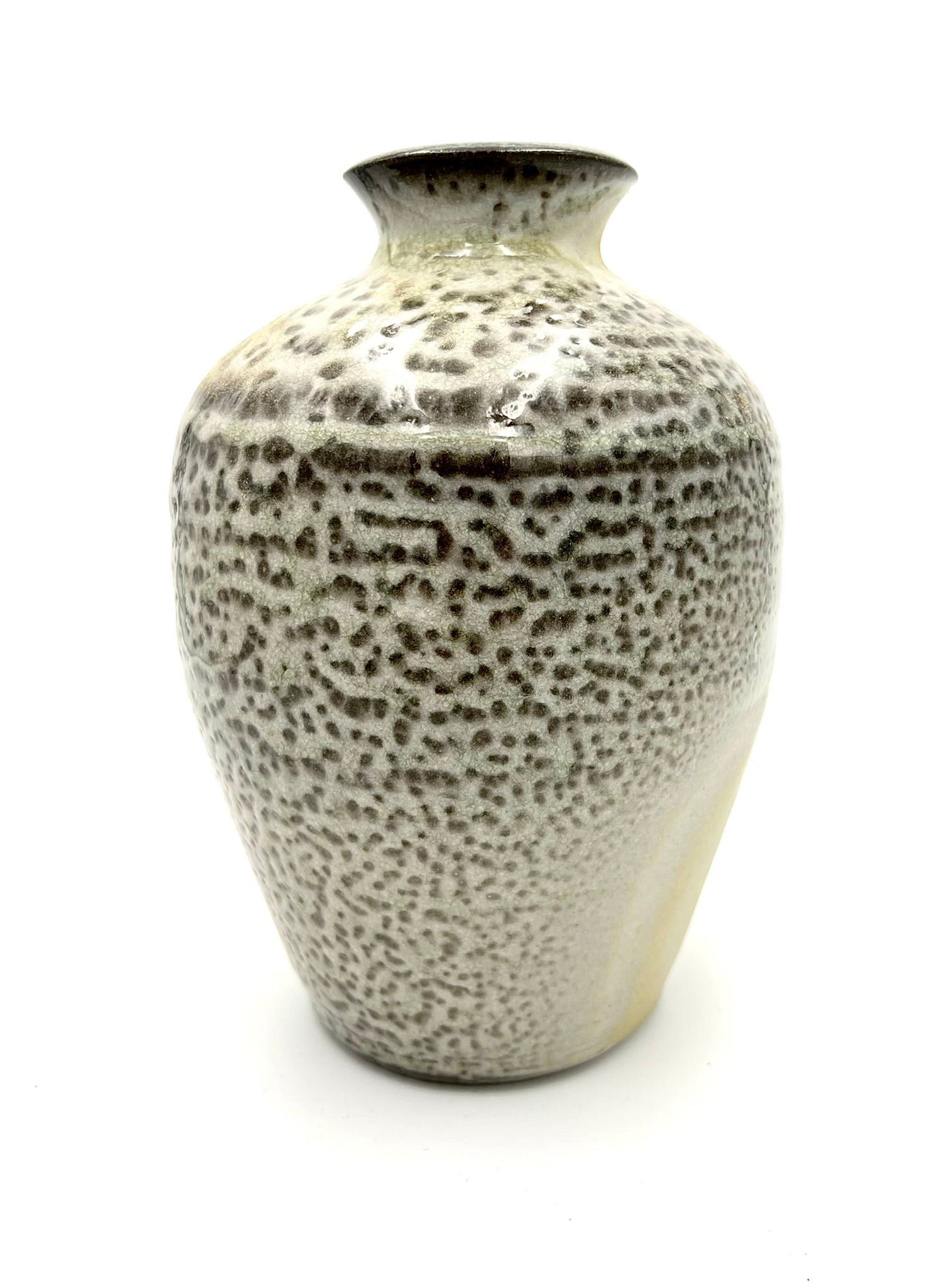 This vase was thrown on the wheel in one piece out of White Rose clay. It was fired on its side on seashells in a wood/soda kiln for 30+ hours. Just look at that soft yellow flashing! And the soda ash texture on the fire side! wow. Grab this bad boy and your favorite 3 flowers and make them ooo and aaah. It measures 9 inches tall and around 6 wide at its widest.