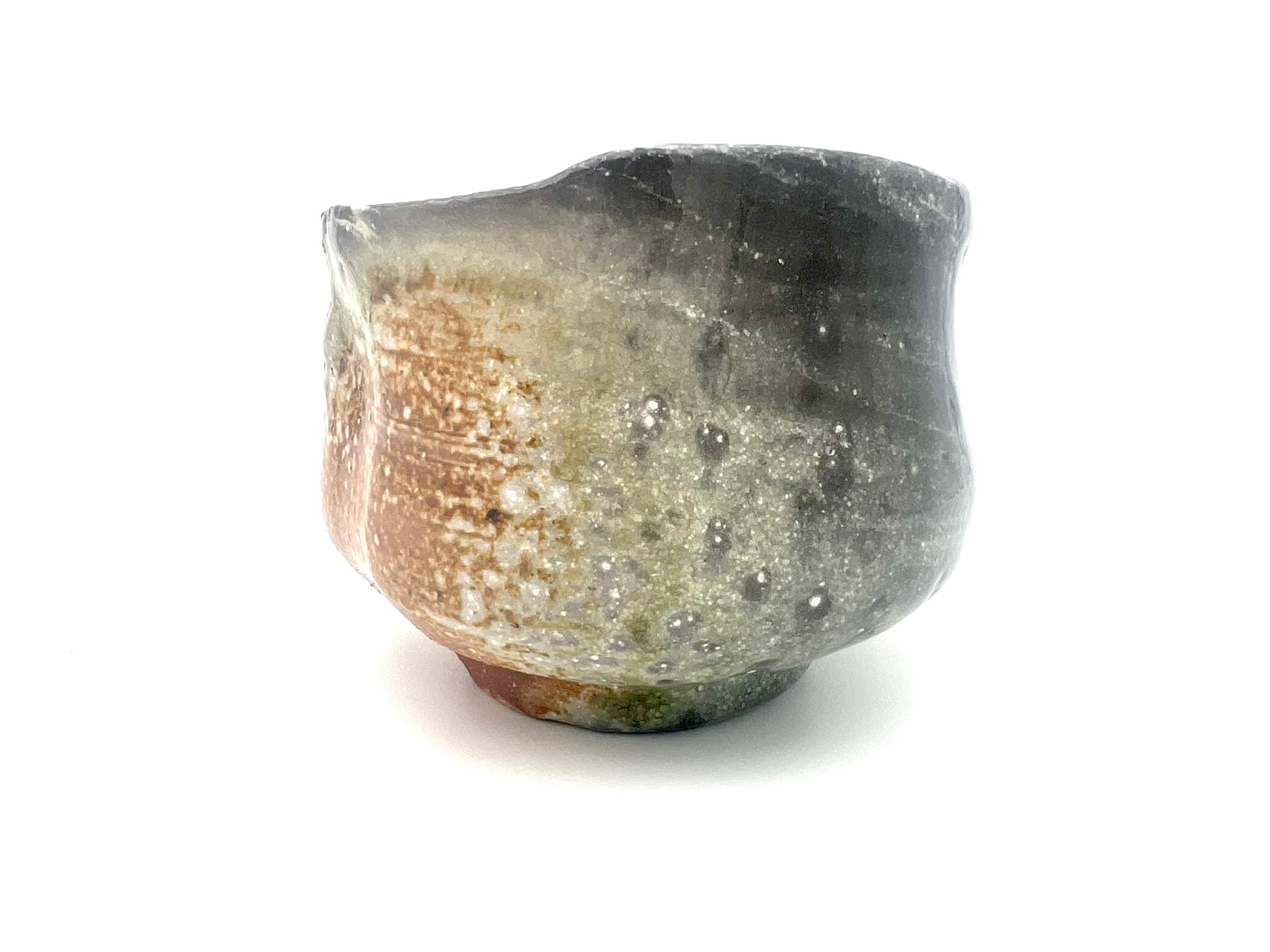 I threw this teabowl on the potters wheel of Macnamee kaolin. I wedged molochite and 30 mesh silica sand into the clay body. This cup is made for the hand, not for symmetry. It is lined in Penn State Shino. It was fired in the wood/soda kiln in Seabeck, WA. It measures 3.5 inches wide & 4 inches tall.