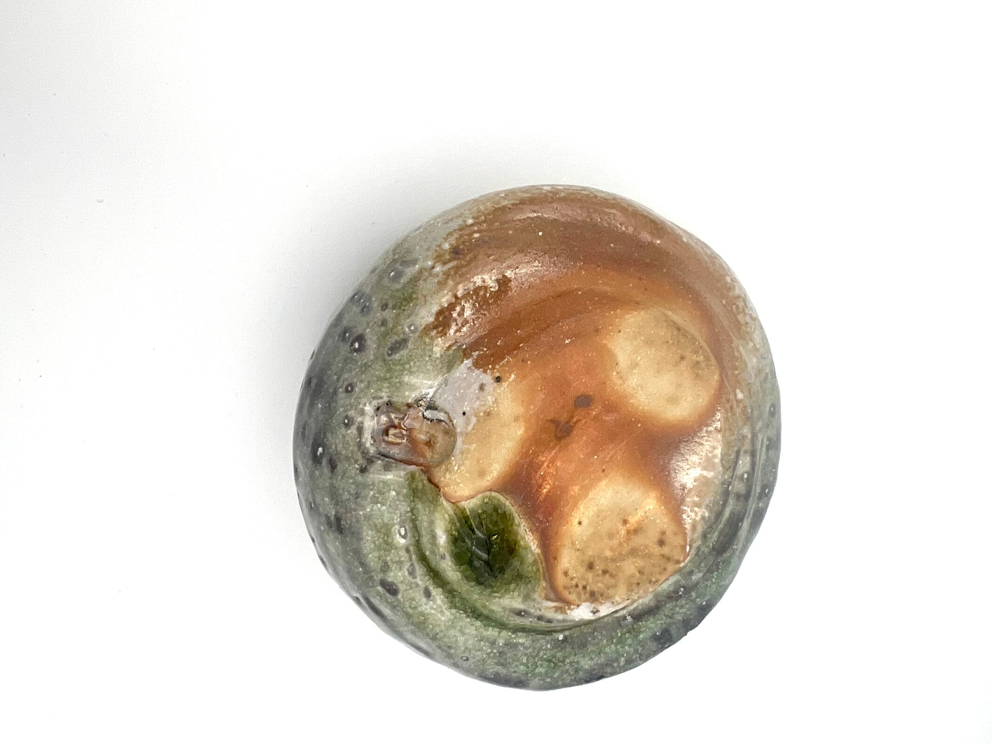 I threw this teabowl on the potters wheel of Macnamee kaolin. I wedged molochite and 30 mesh silica sand into the clay body. This cup is made for the hand, not for symmetry. It is lined in Penn State Shino. It was fired in the wood/soda kiln in Seabeck, WA. Wow it has a drip hanging off the bottom! Look at the Carbon Trapping! It measures 3.25 inches wide & 4 inches tall.
