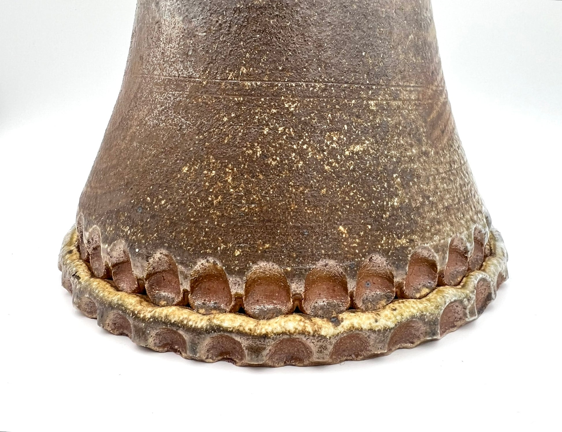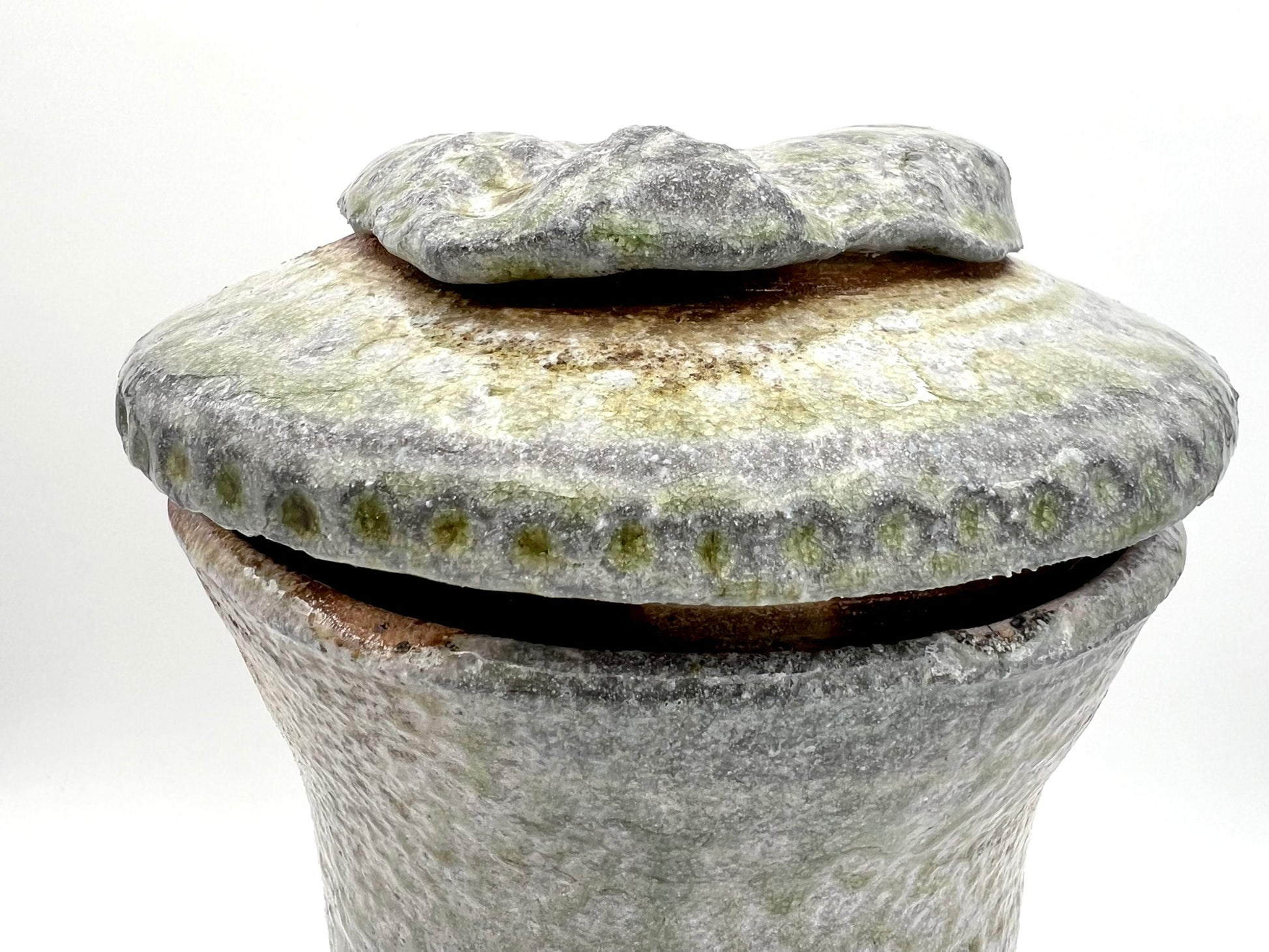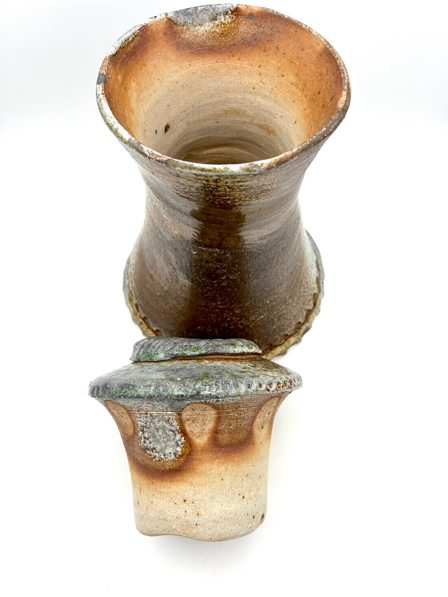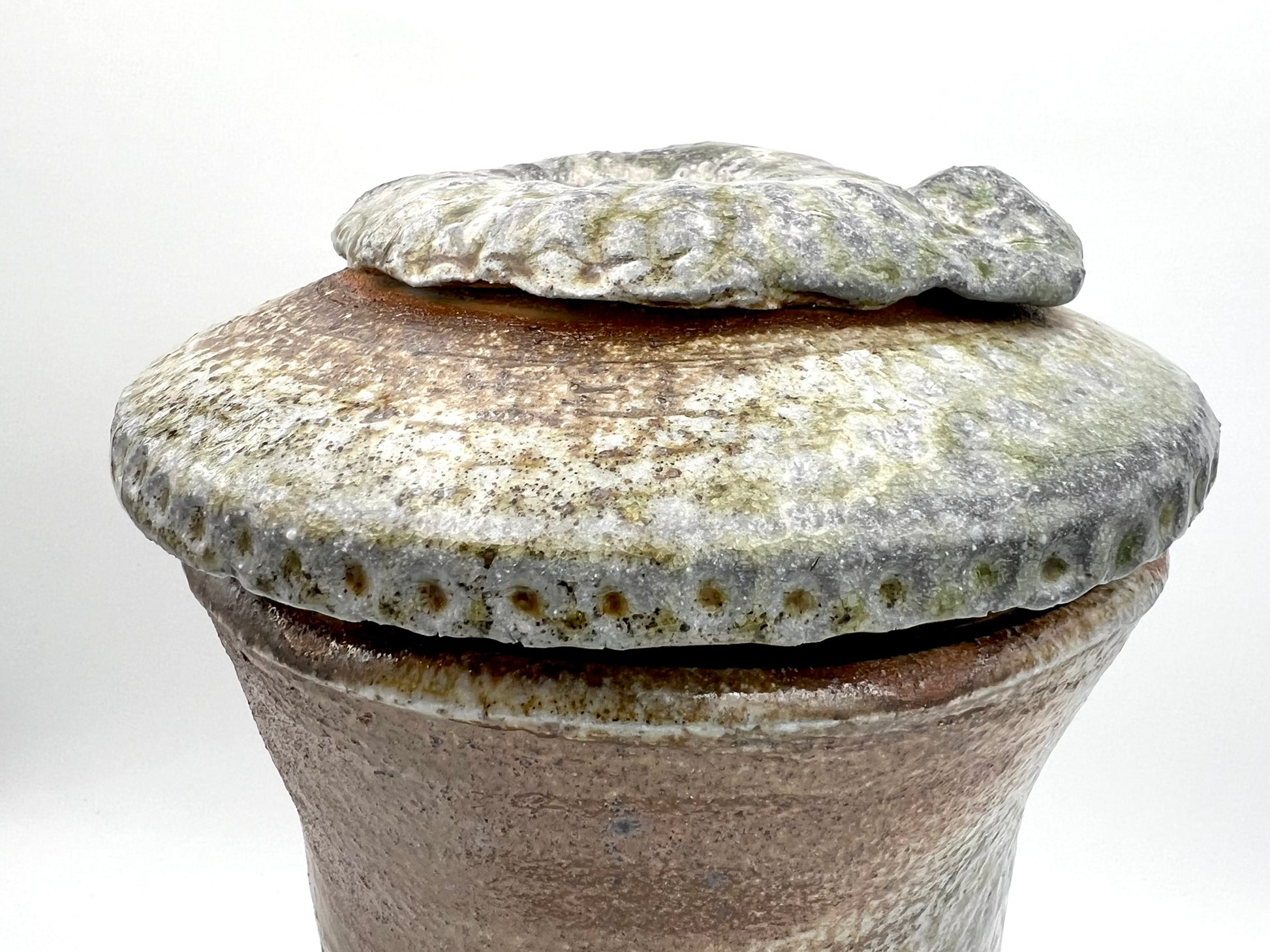 This is a large wheelthrown and altered lidded vessel. wood/soda fired.