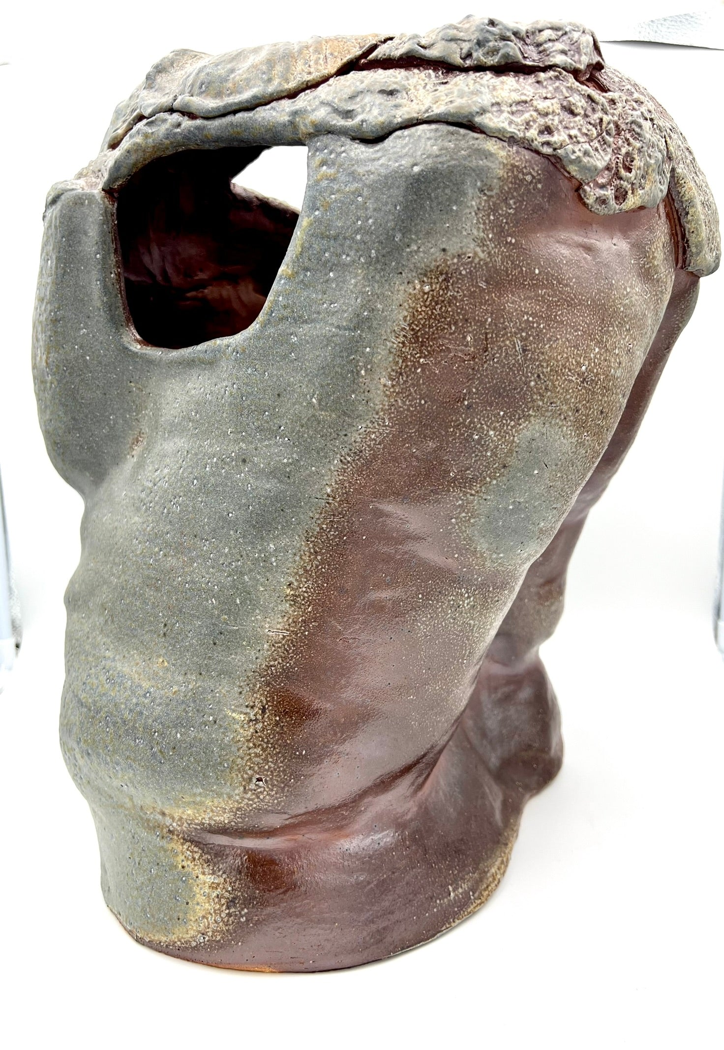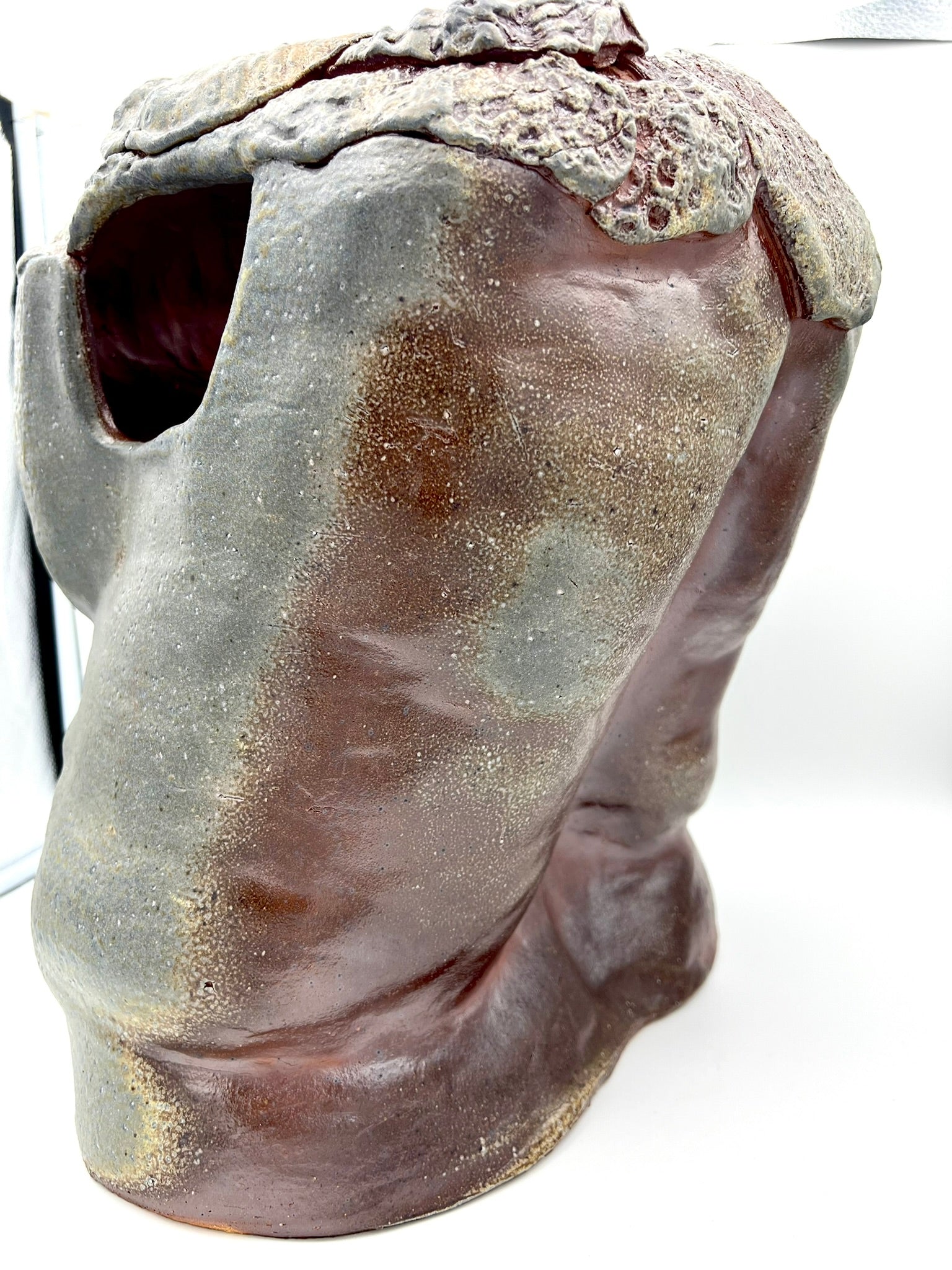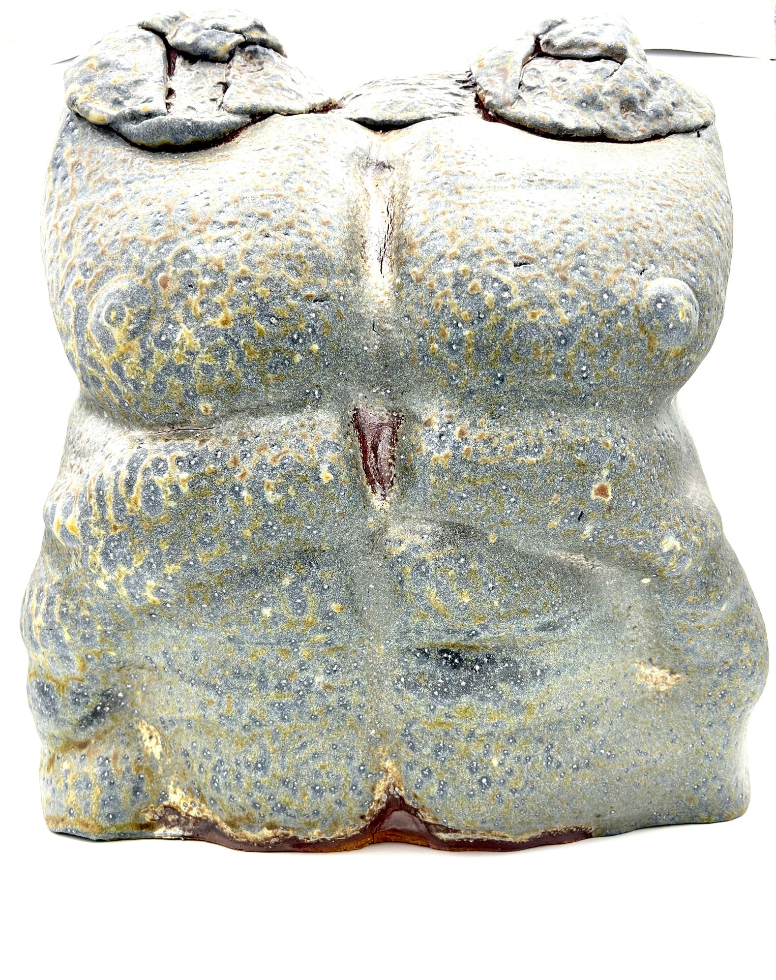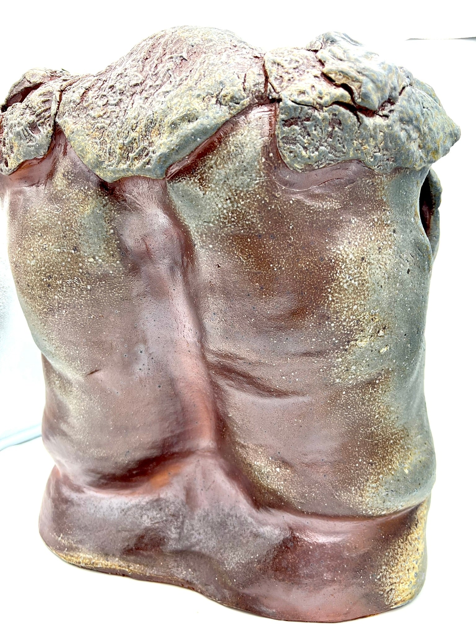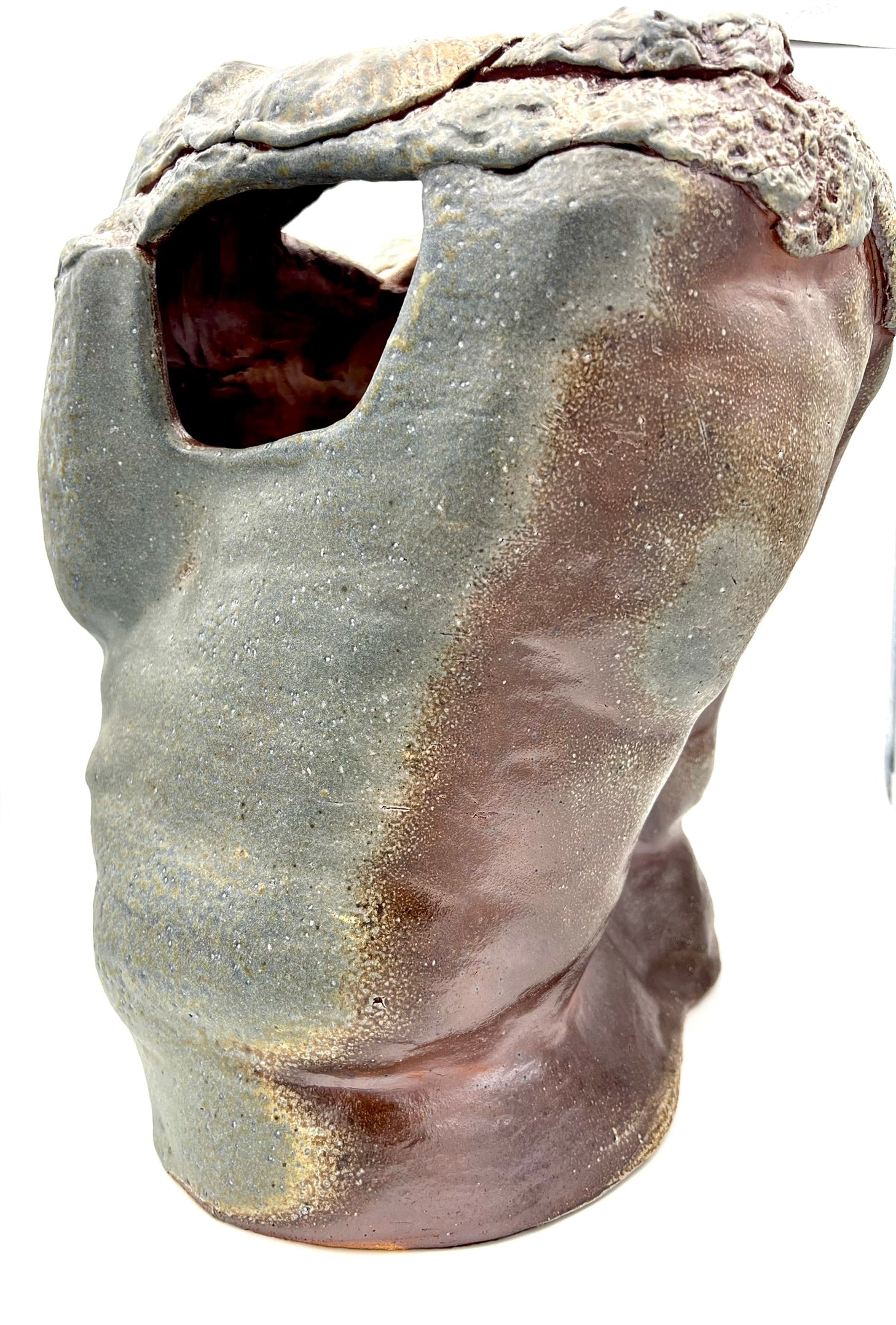 I threw this Armour on the potters wheel in 3 sections of Newcomb Tile Mix. I wedged a healthy amount of Ceramic Rutile into the clay body itself. I sculpted the tall cylinder on the wheel into the form you see here. The piece was fired in the old Chicken Cat wood/soda kiln at East Creek. it measures 13 inches wide x 11 inches deep x 16 inches tall.