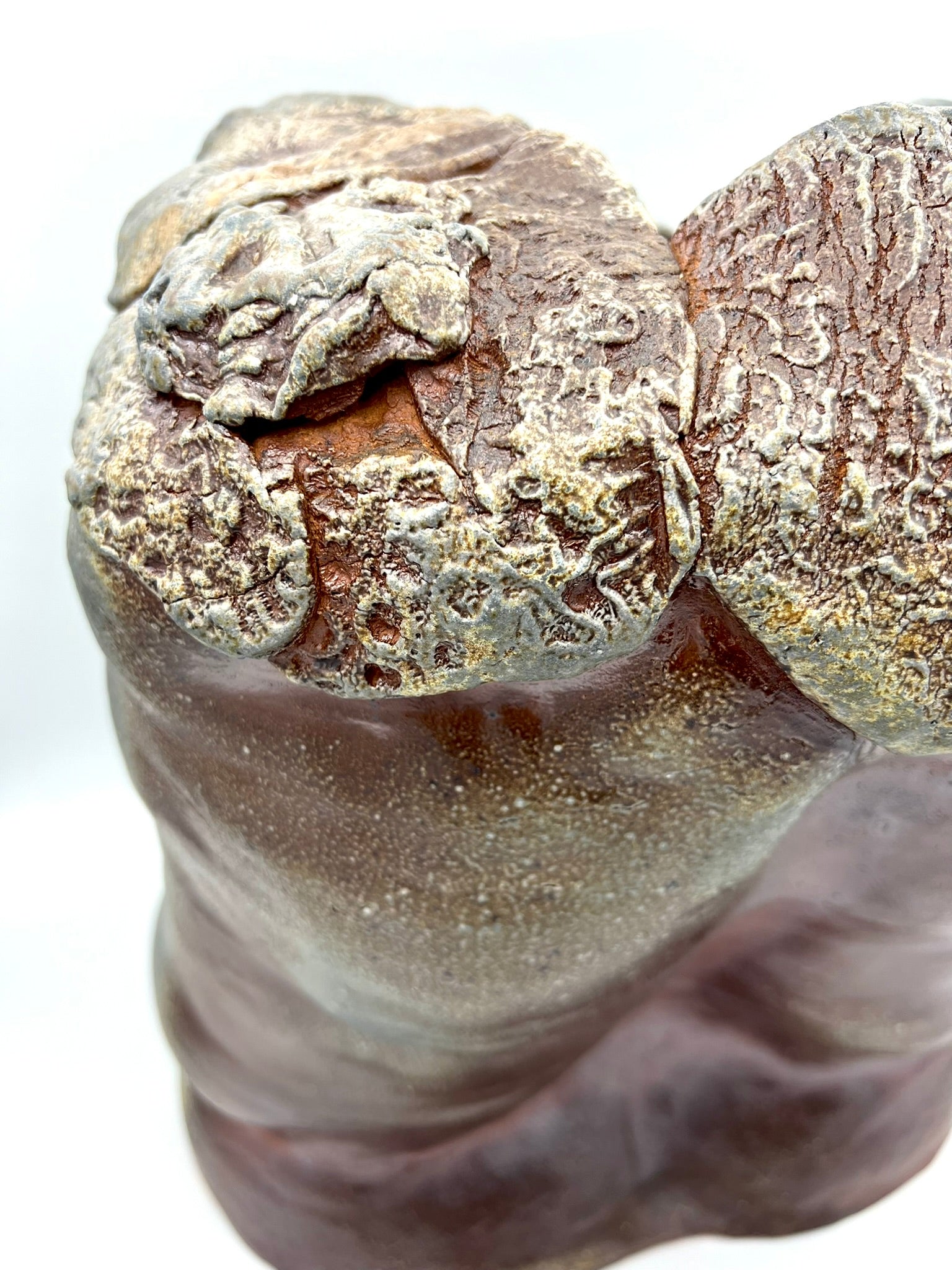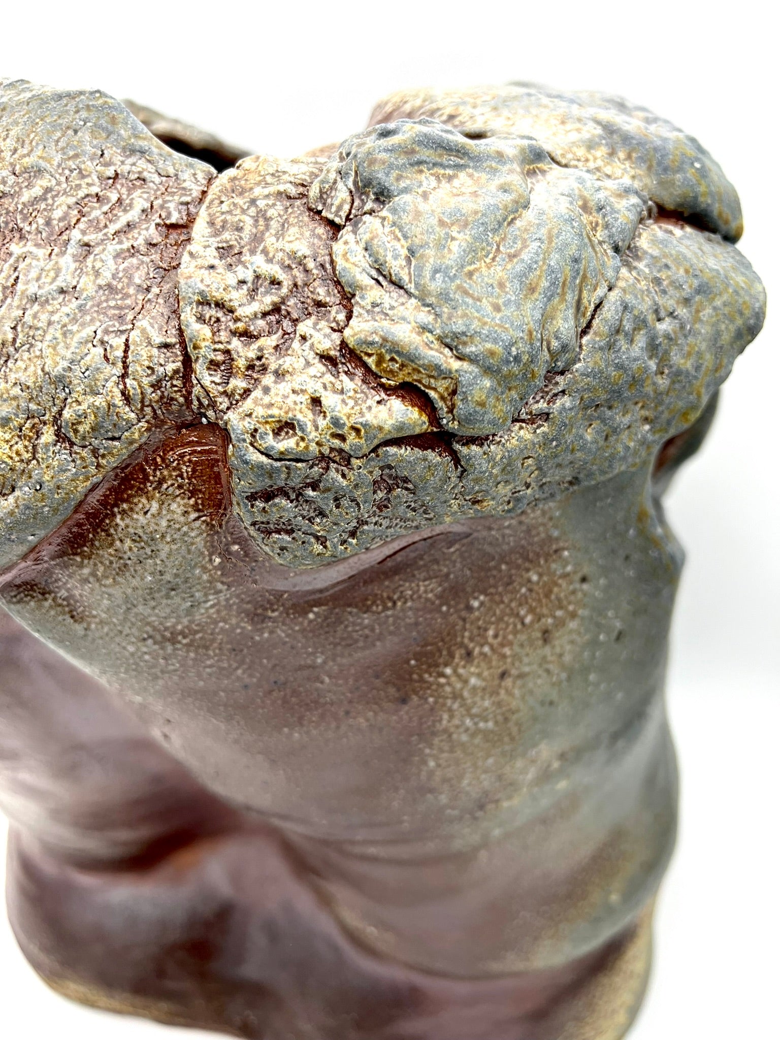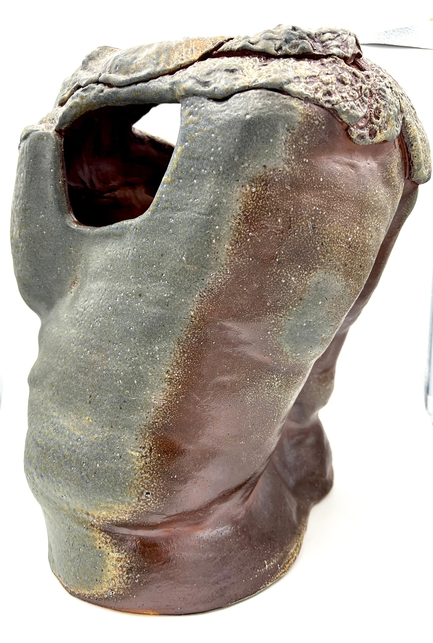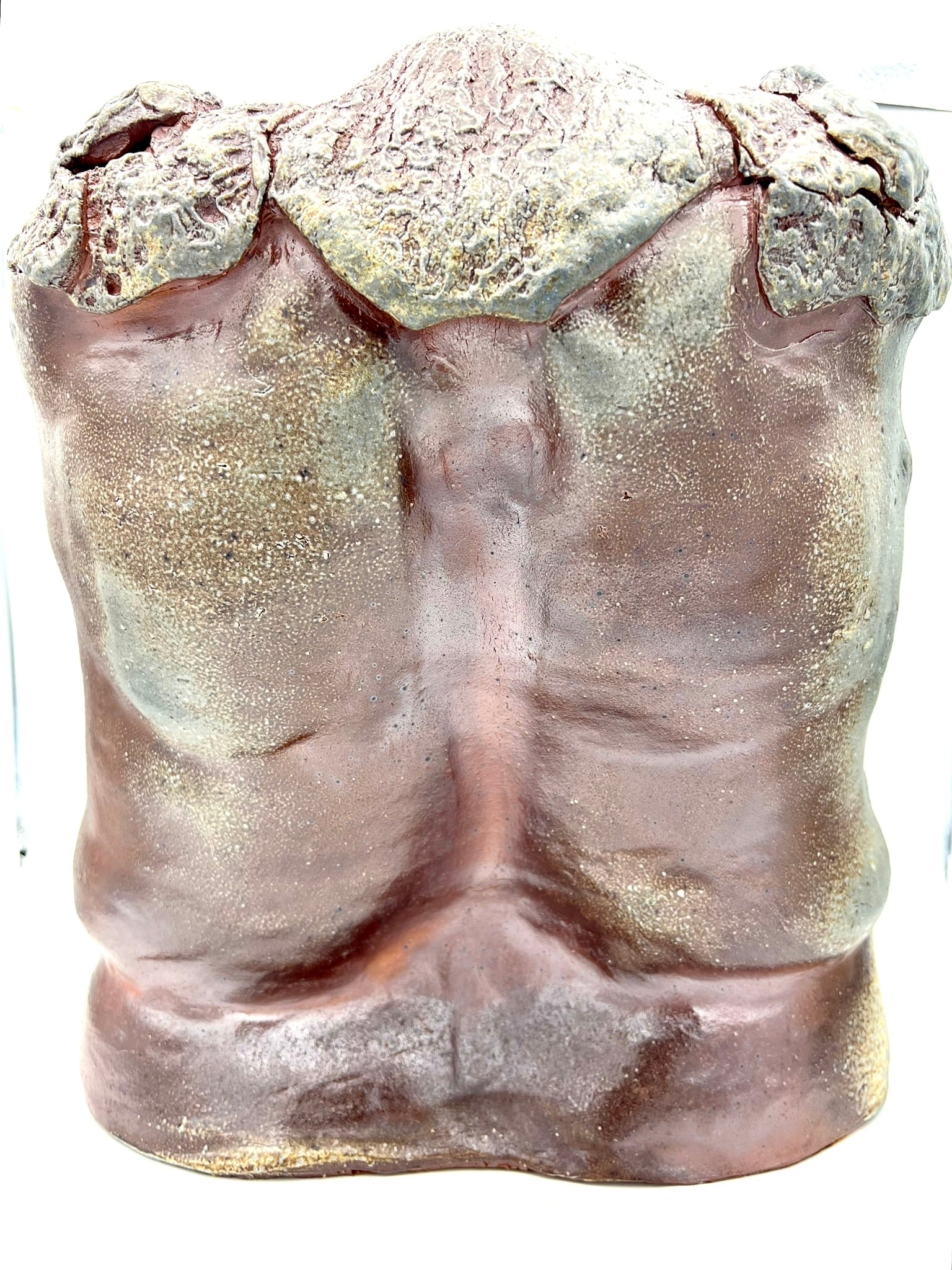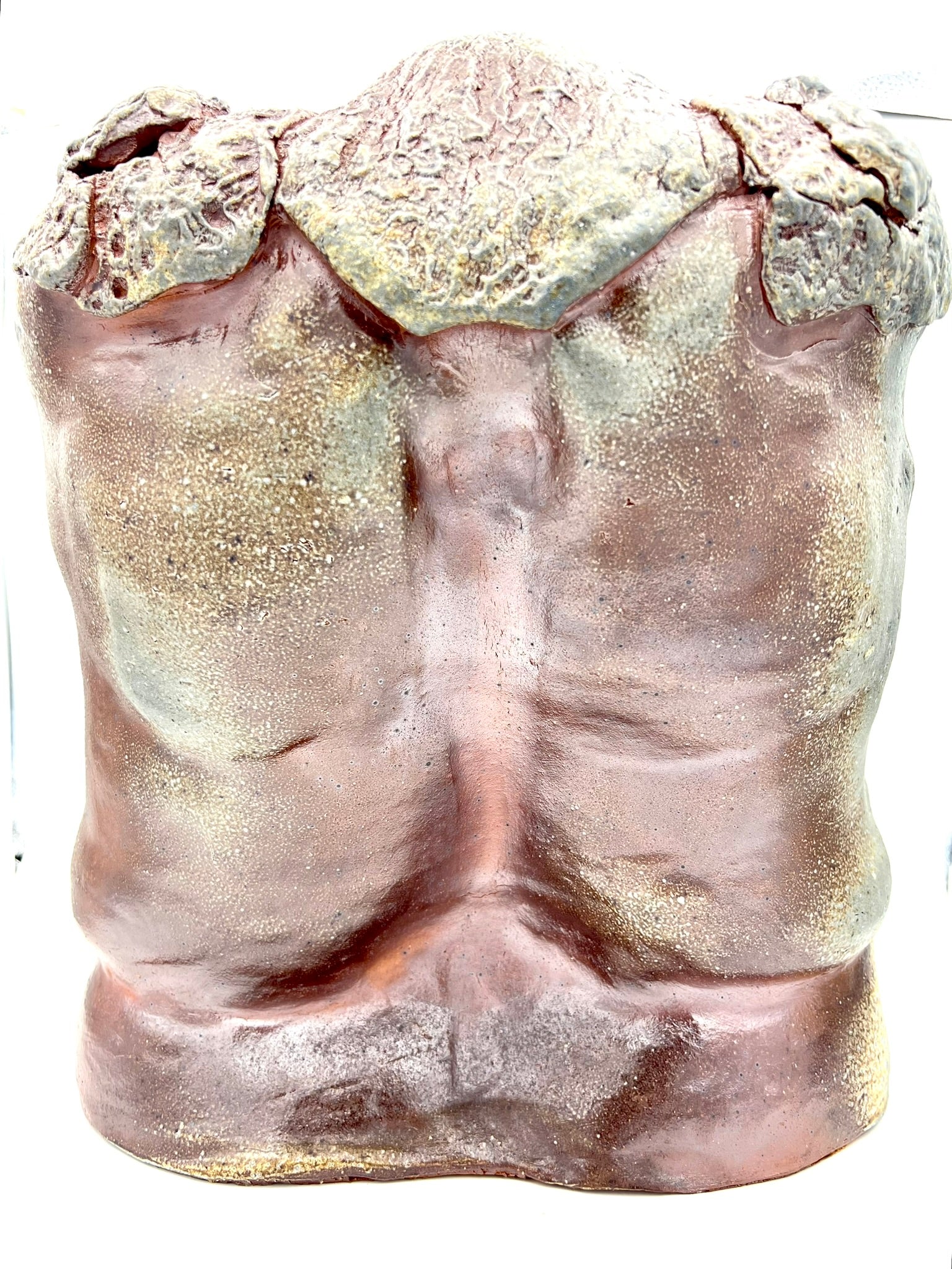 I threw this Armour on the potters wheel in 3 sections of Newcomb Tile Mix. I wedged a healthy amount of Ceramic Rutile into the clay body itself. I sculpted the tall cylinder on the wheel into the form you see here. The piece was fired in the old Chicken Cat wood/soda kiln at East Creek. it measures 13 inches wide x 11 inches deep x 16 inches tall.
