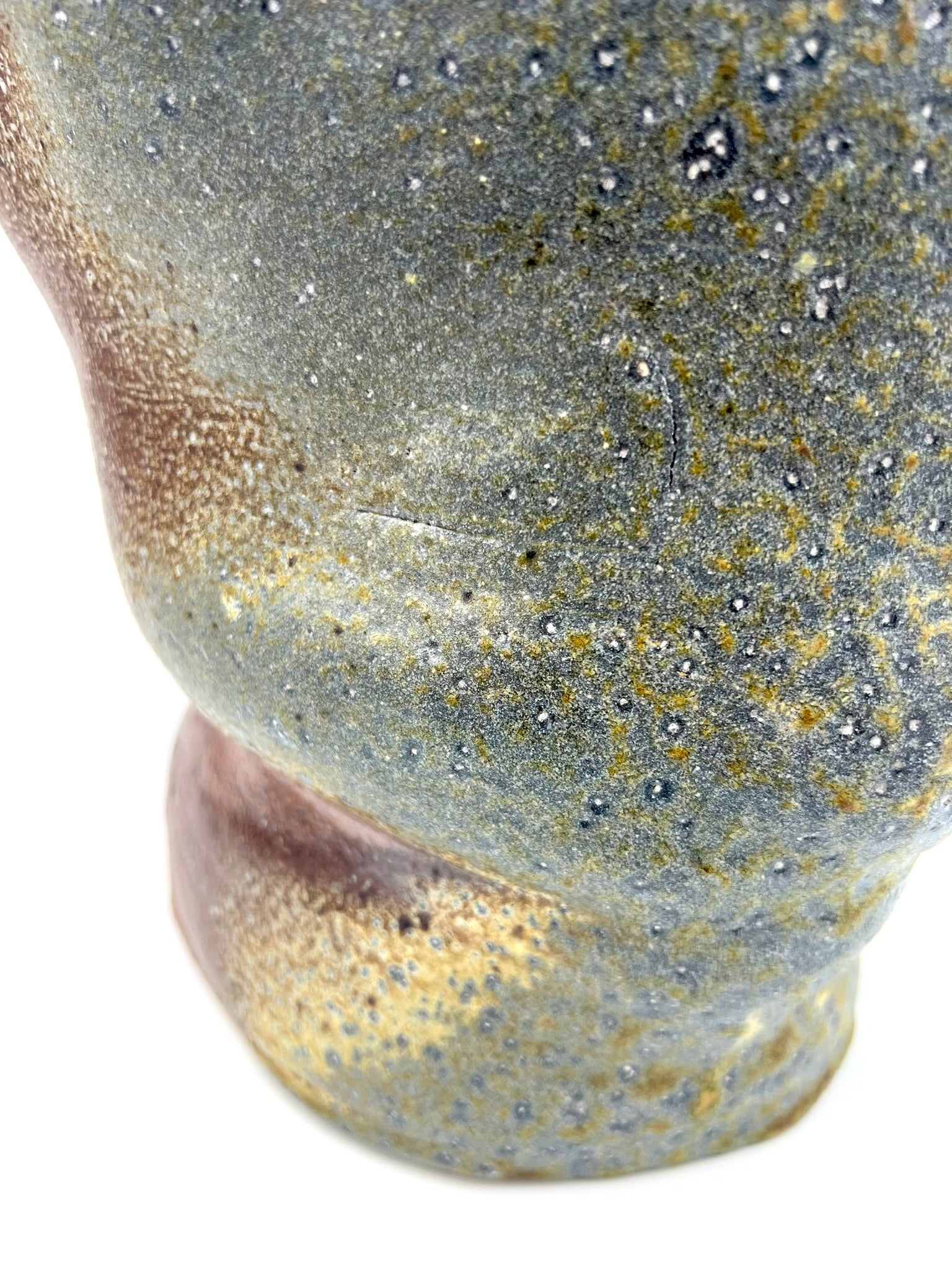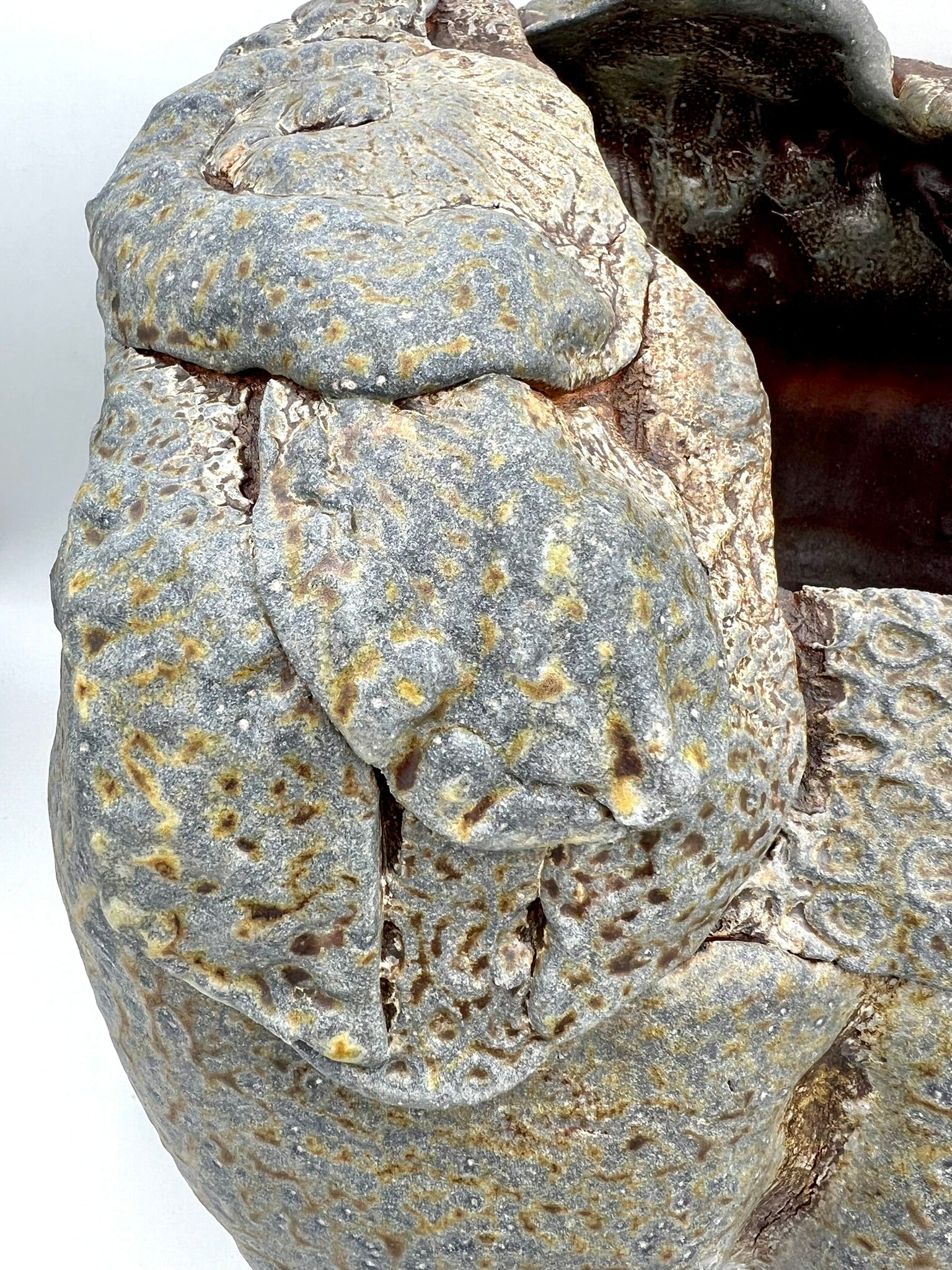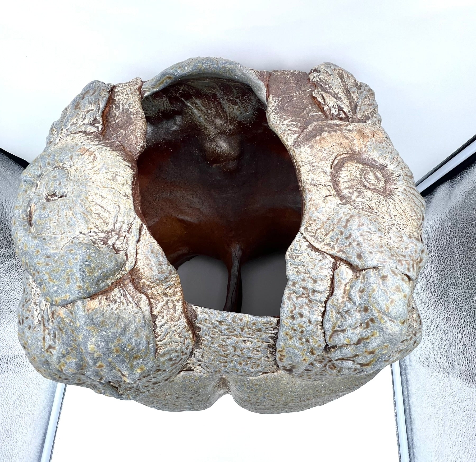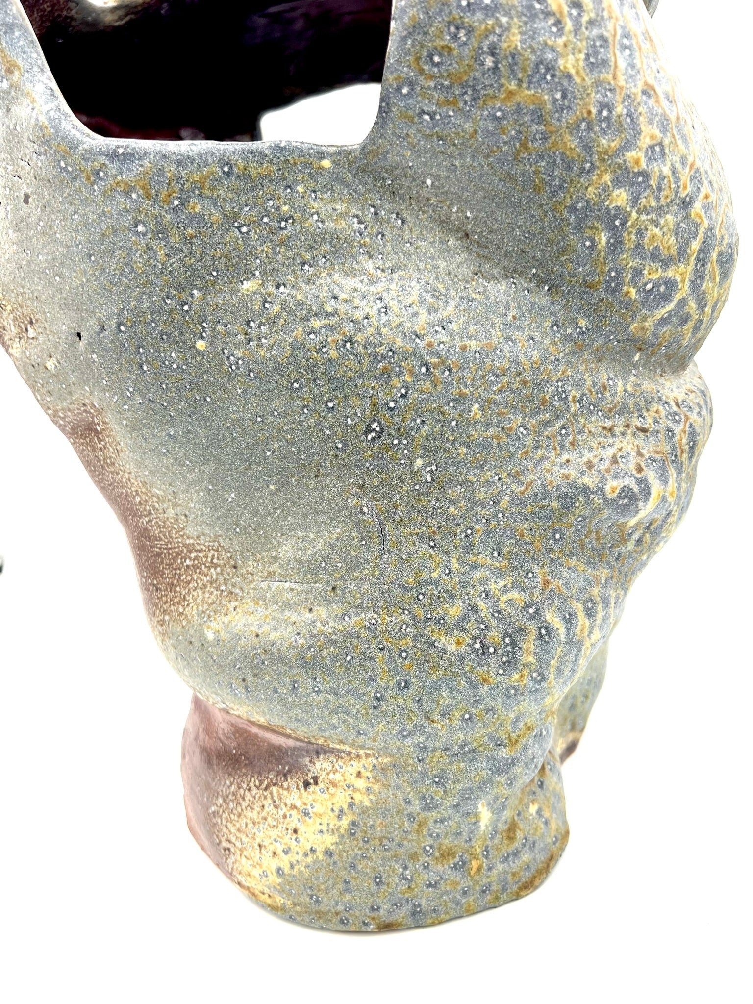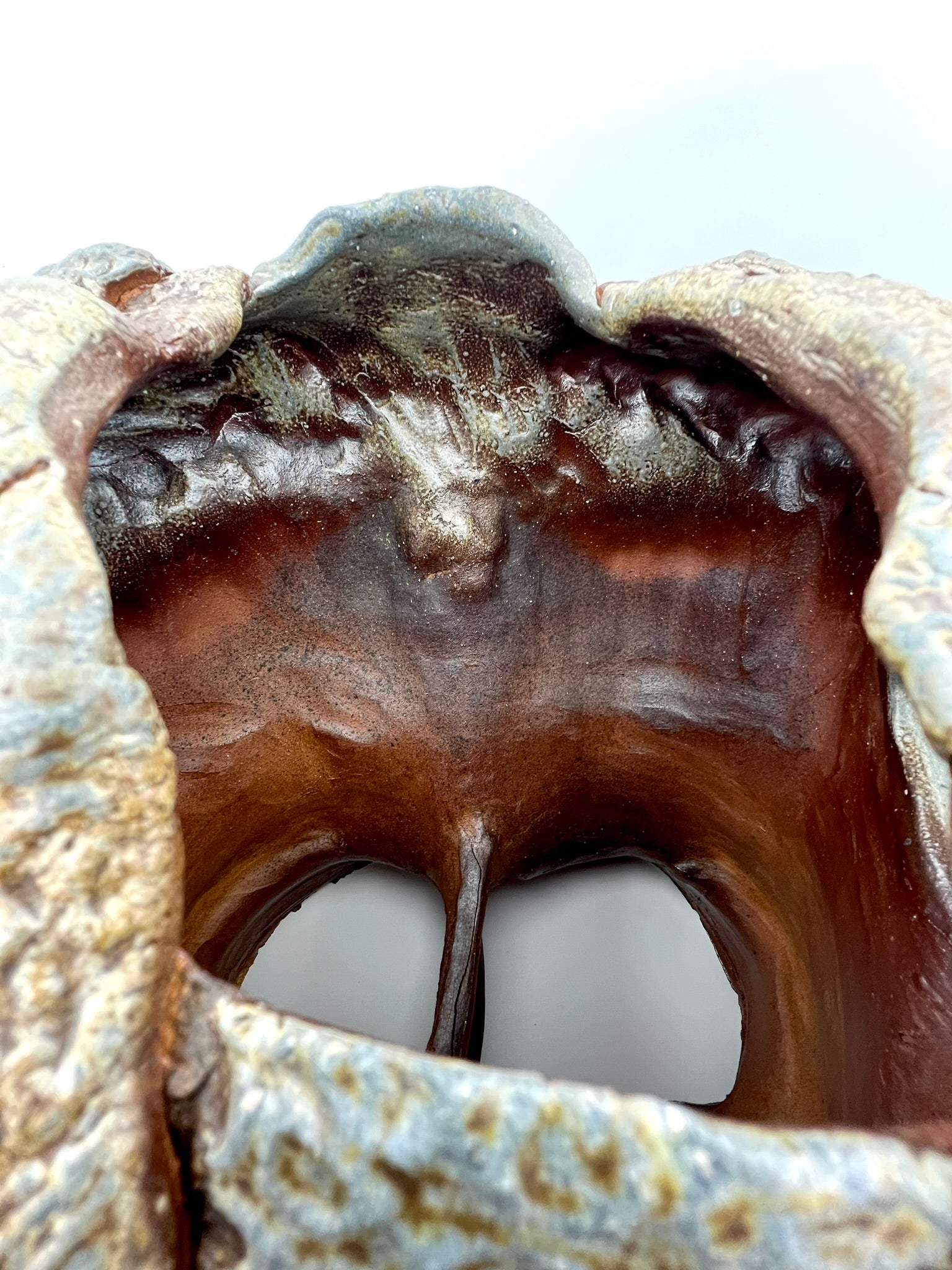 I threw this Armour on the potters wheel in 3 sections of Newcomb Tile Mix. I wedged a healthy amount of Ceramic Rutile into the clay body itself. I sculpted the tall cylinder on the wheel into the form you see here. The piece was fired in the old Chicken Cat wood/soda kiln at East Creek. it measures 13 inches wide x 11 inches deep x 16 inches tall.