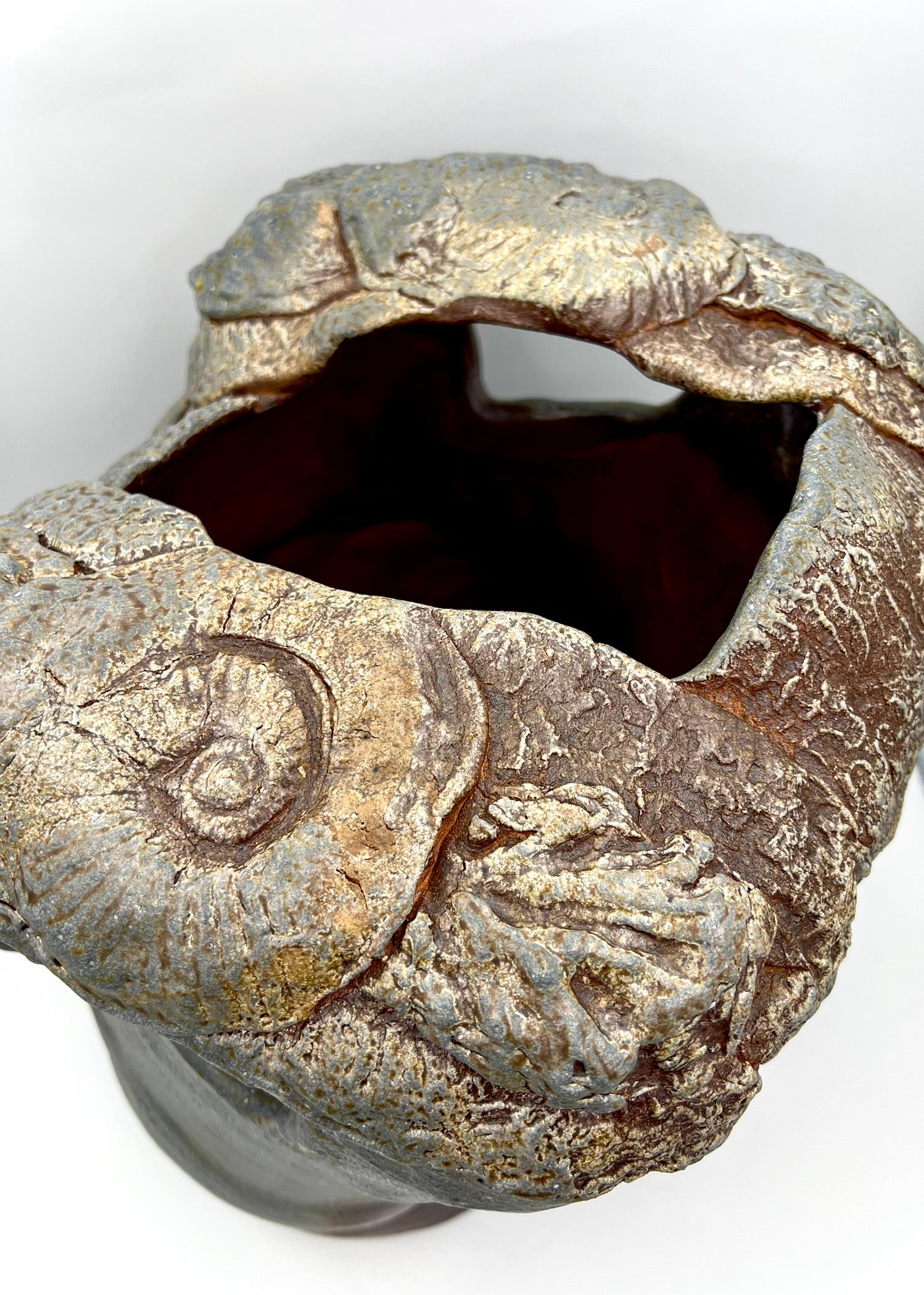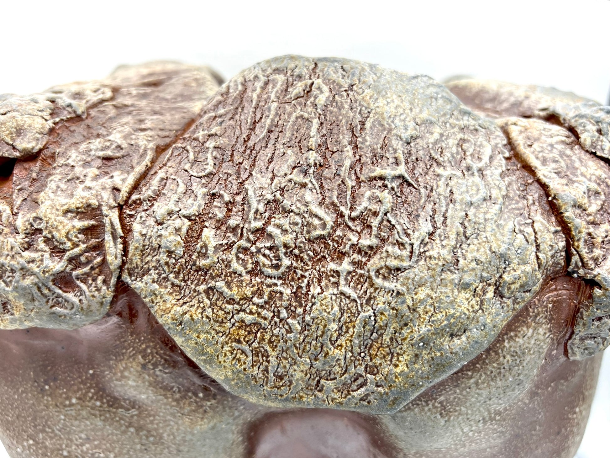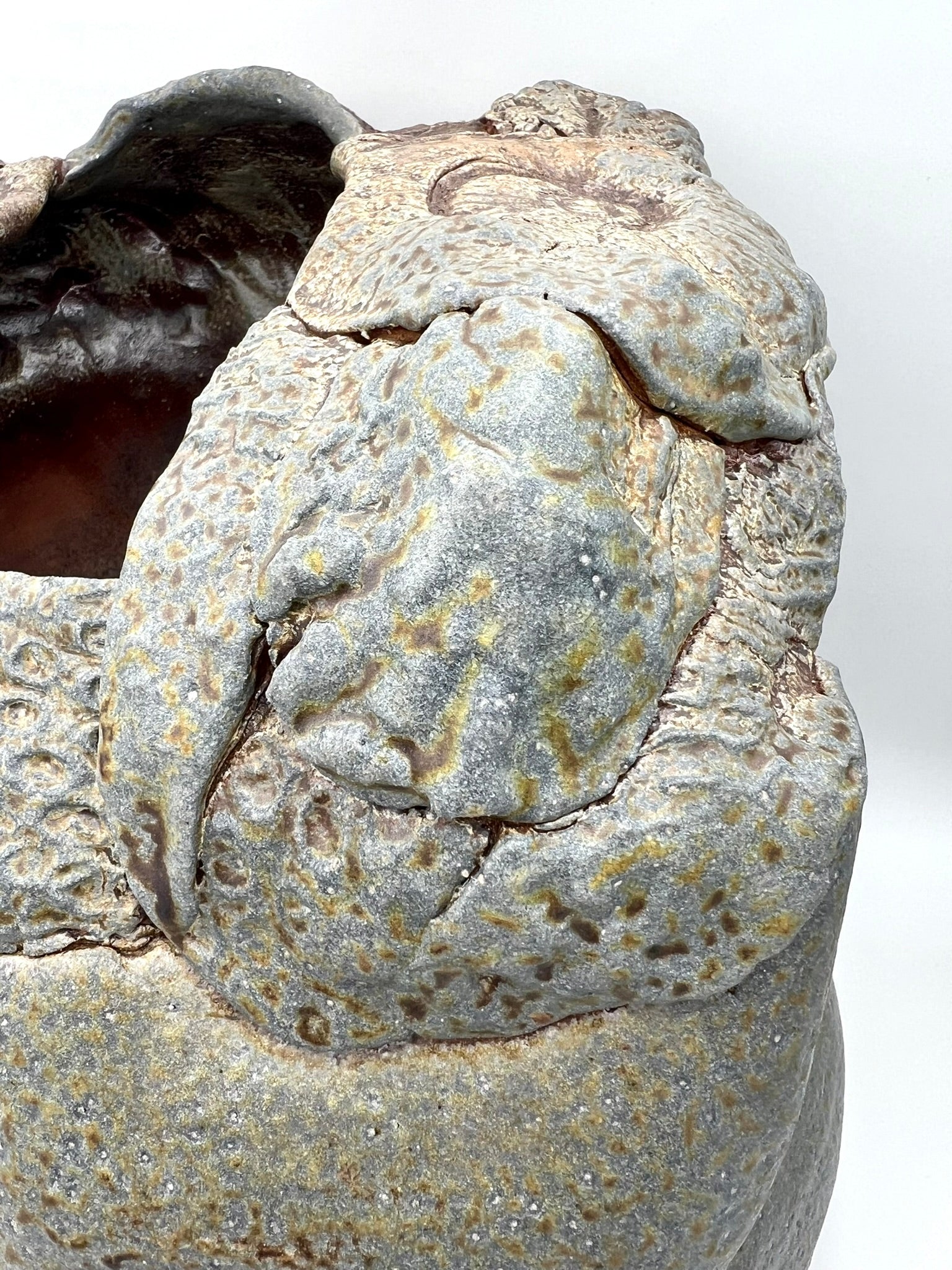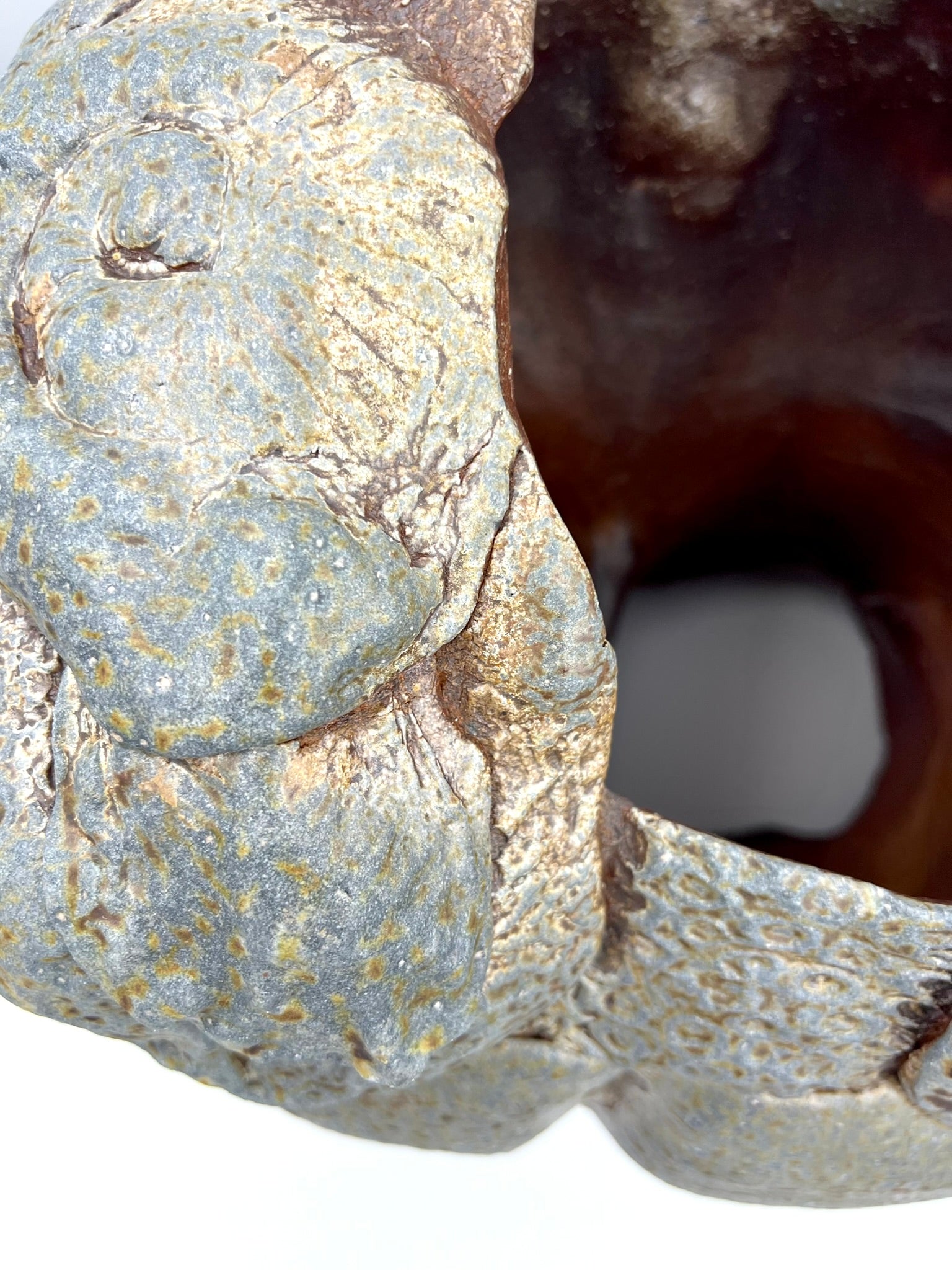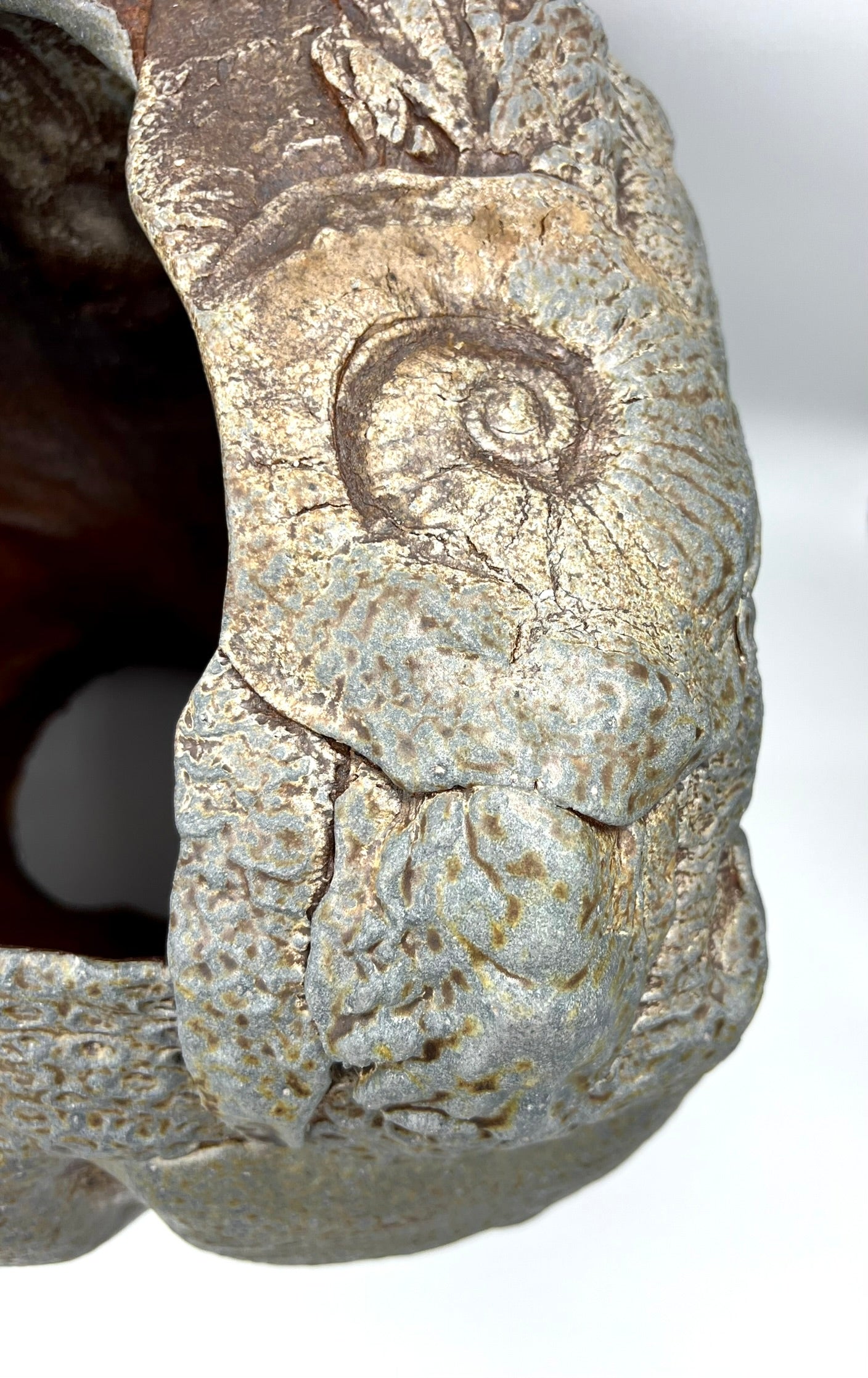 I threw this Armour on the potters wheel in 3 sections of Newcomb Tile Mix. I wedged a healthy amount of Ceramic Rutile into the clay body itself. I sculpted the tall cylinder on the wheel into the form you see here. The piece was fired in the old Chicken Cat wood/soda kiln at East Creek. it measures 13 inches wide x 11 inches deep x 16 inches tall.