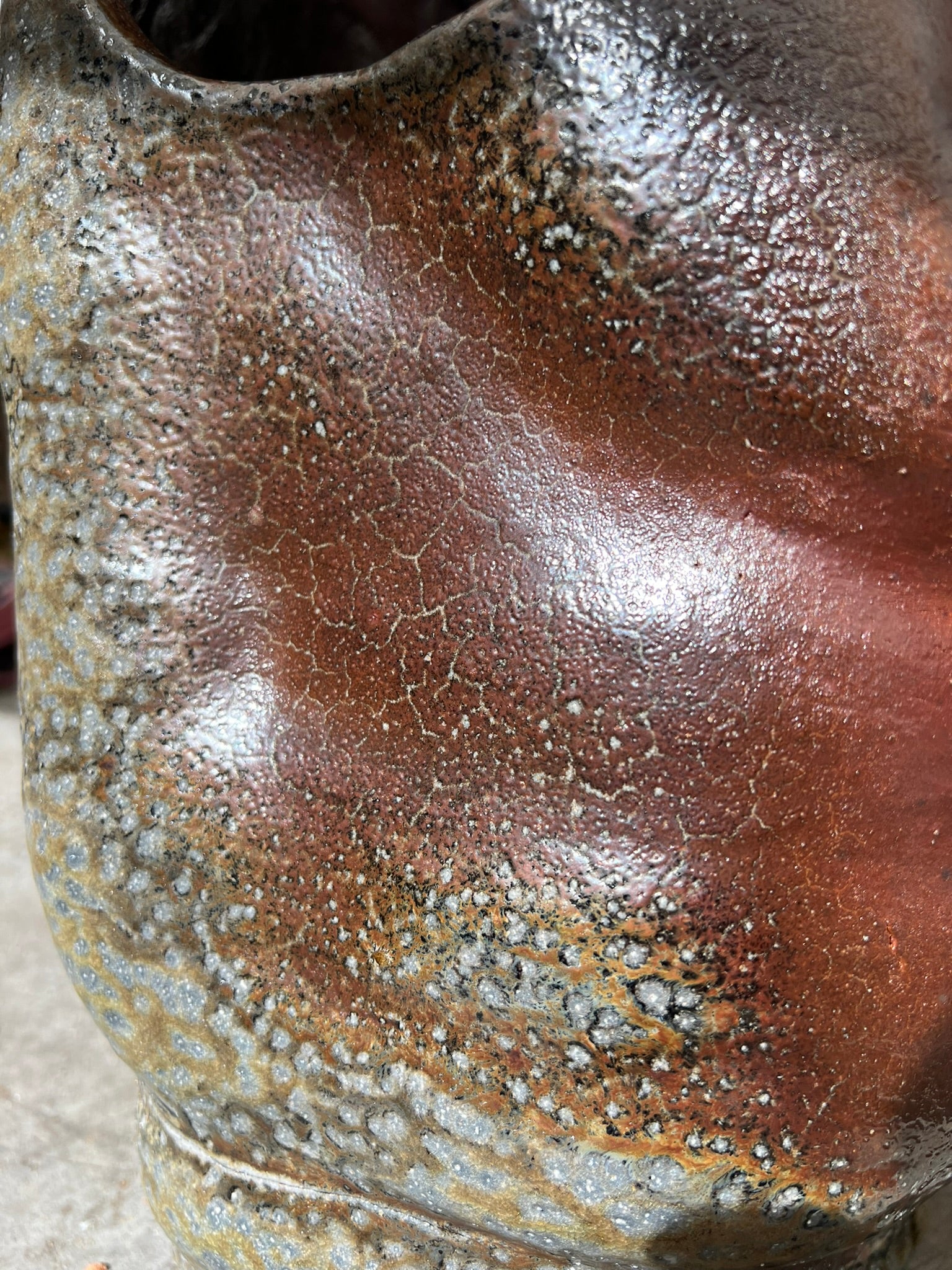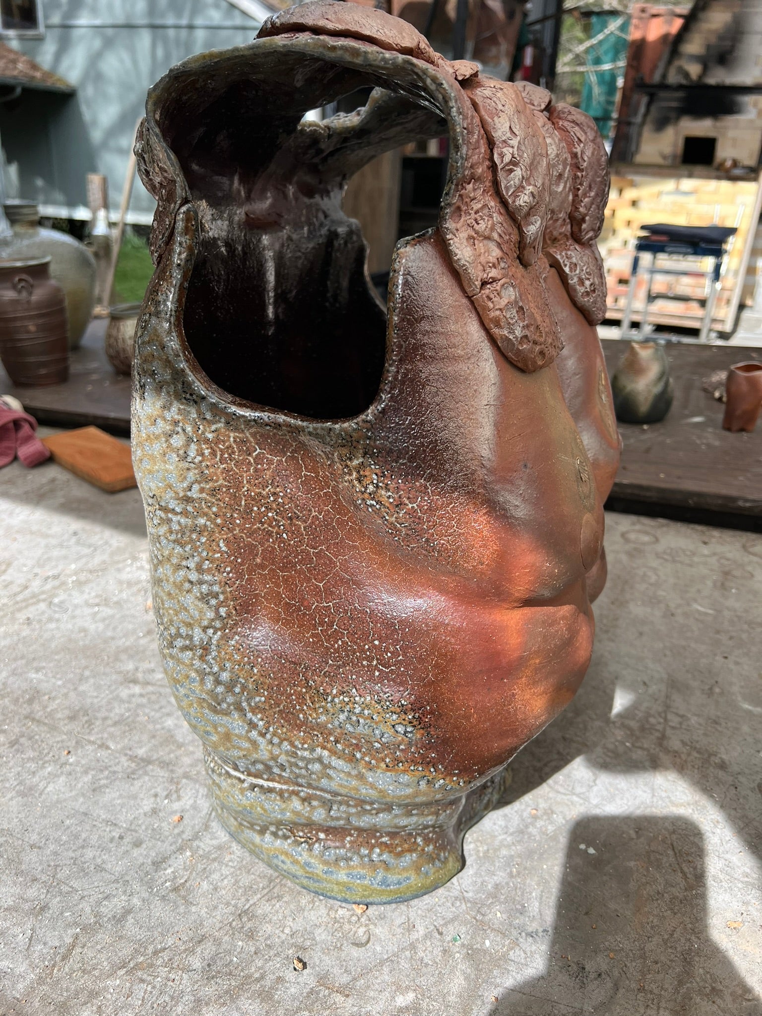 I threw this Armour on the potters wheel in 3 sections of Welmar clay. I wedged a healthy amount of Ceramic Rutile into the clay body itself. I sculpted the tall cylinder on the wheel into the form you see here. It was fired on its belly on seashells in the old Chicken Cat wood/soda kiln at East Creek. it measures 13 inches wide x 10 inches deep x 18 inches tall.