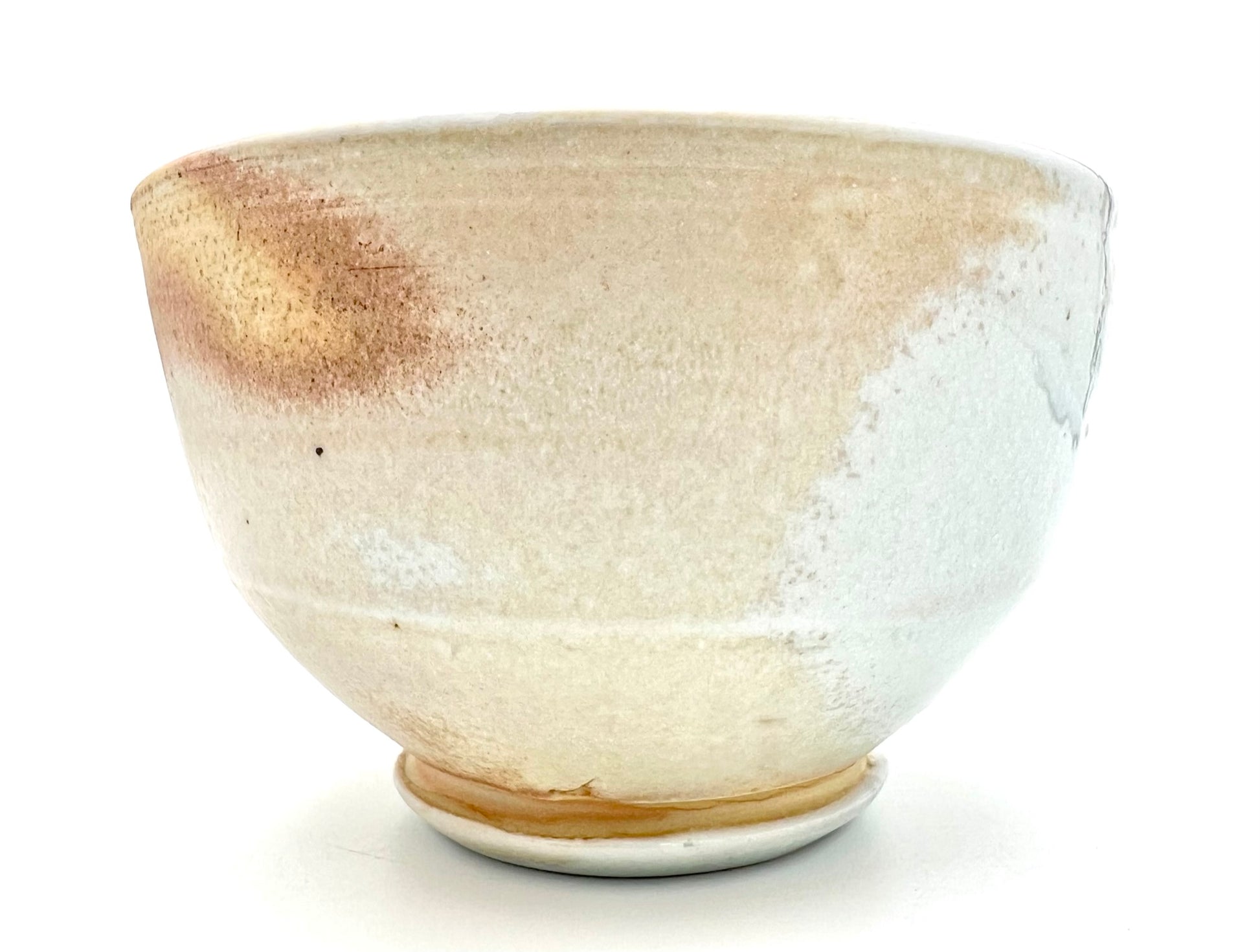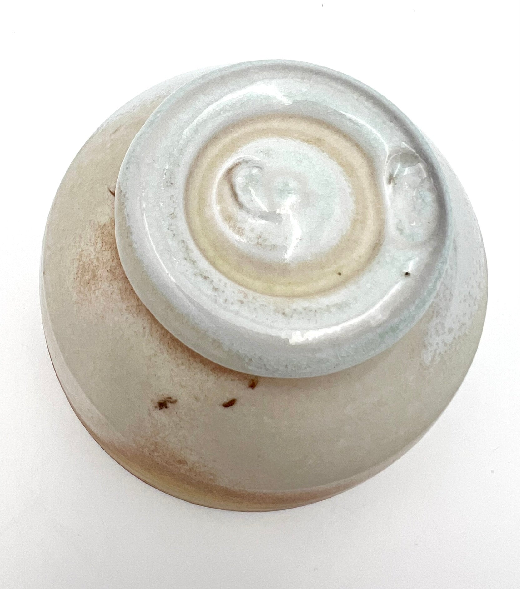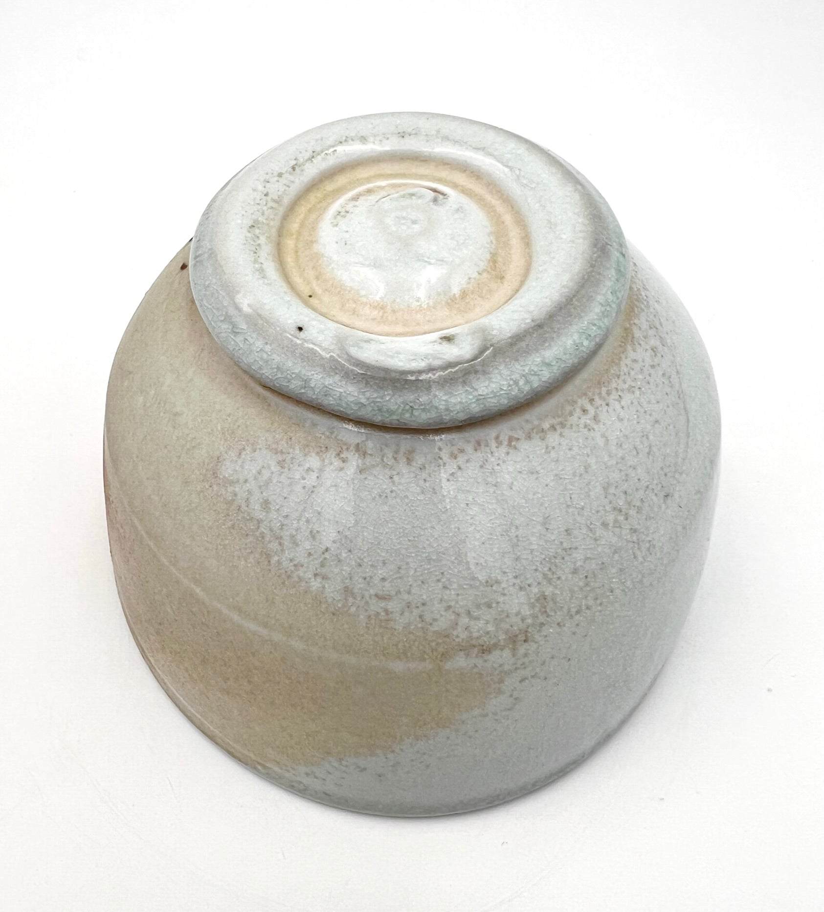 This bowl was thrown and trimmed on the wheel of NZ clay. What a beautiful example of what this clay can do. It was fired upside down in an anagama for many days. Where the ash collects, it presents as blue glass. In the more shielded areas the sandy flash appears. The bowl measures 5.5 inches wide.