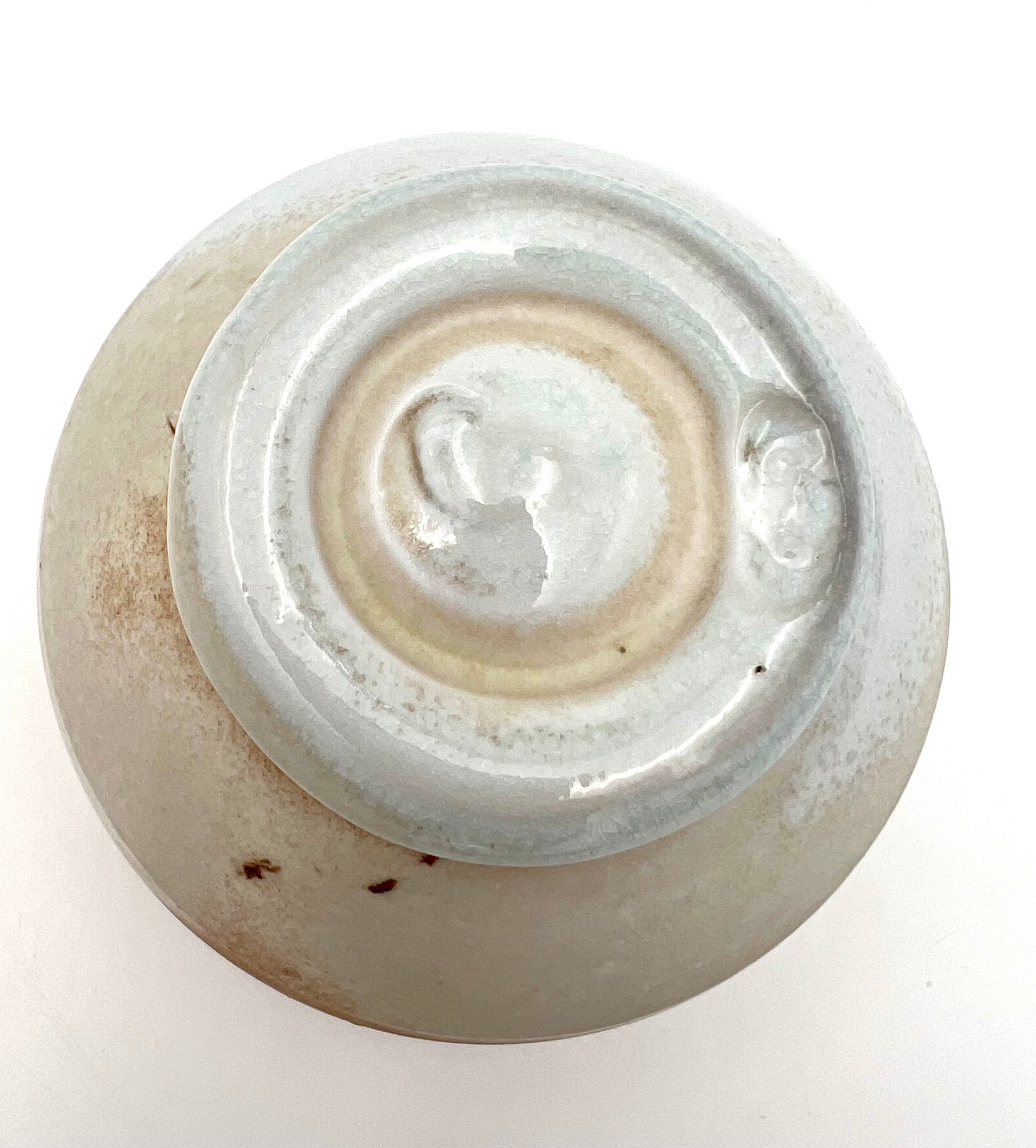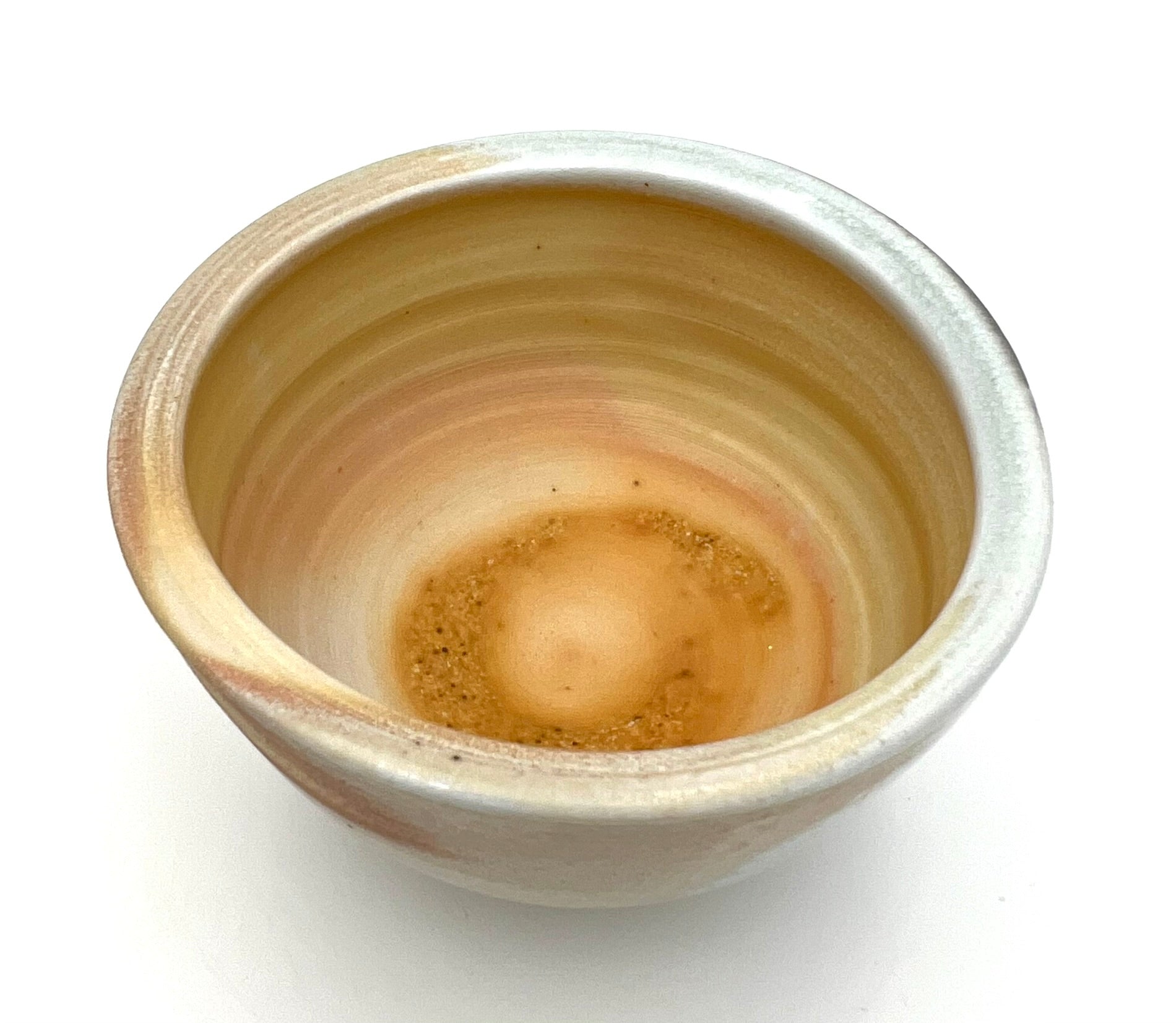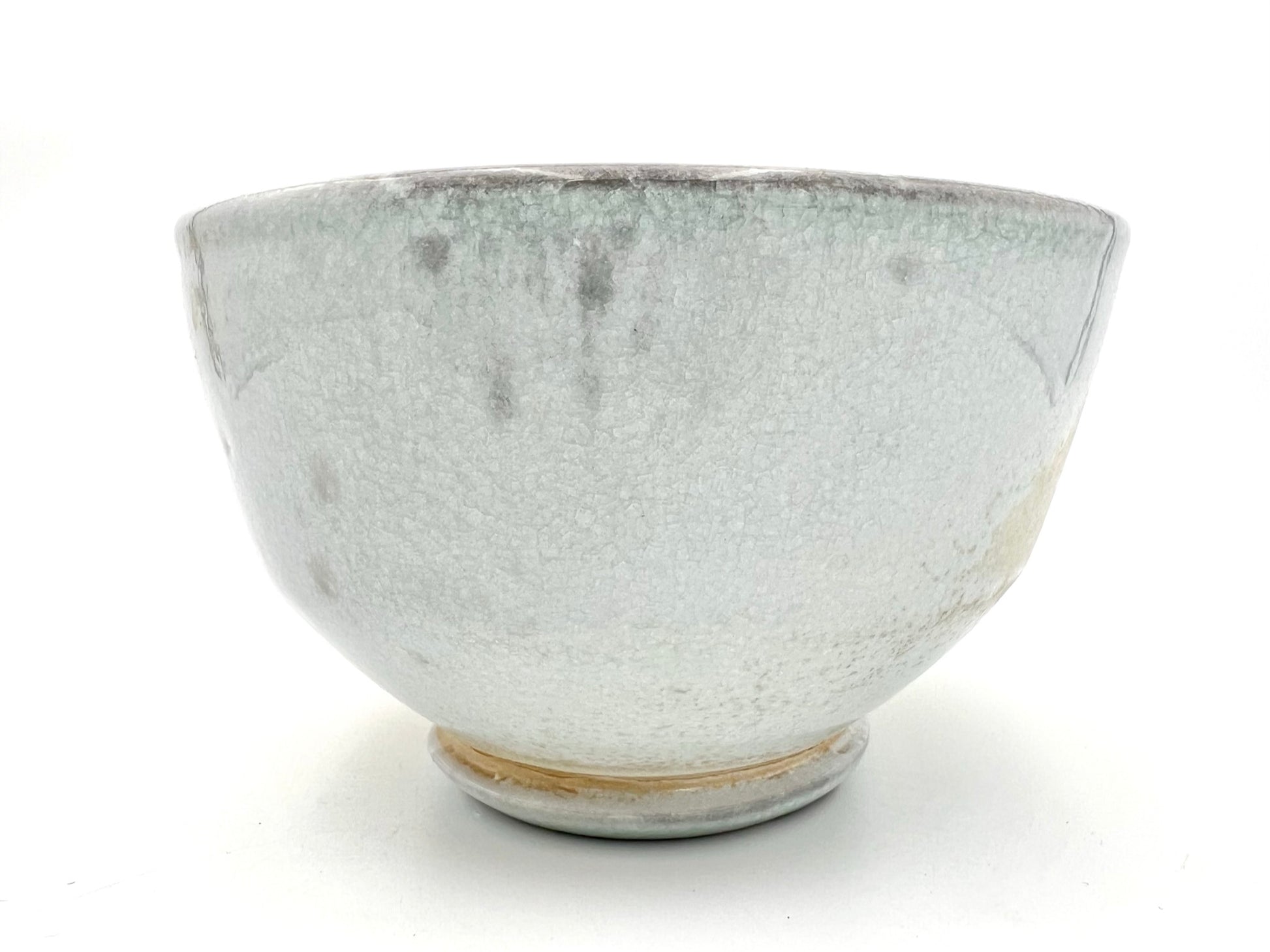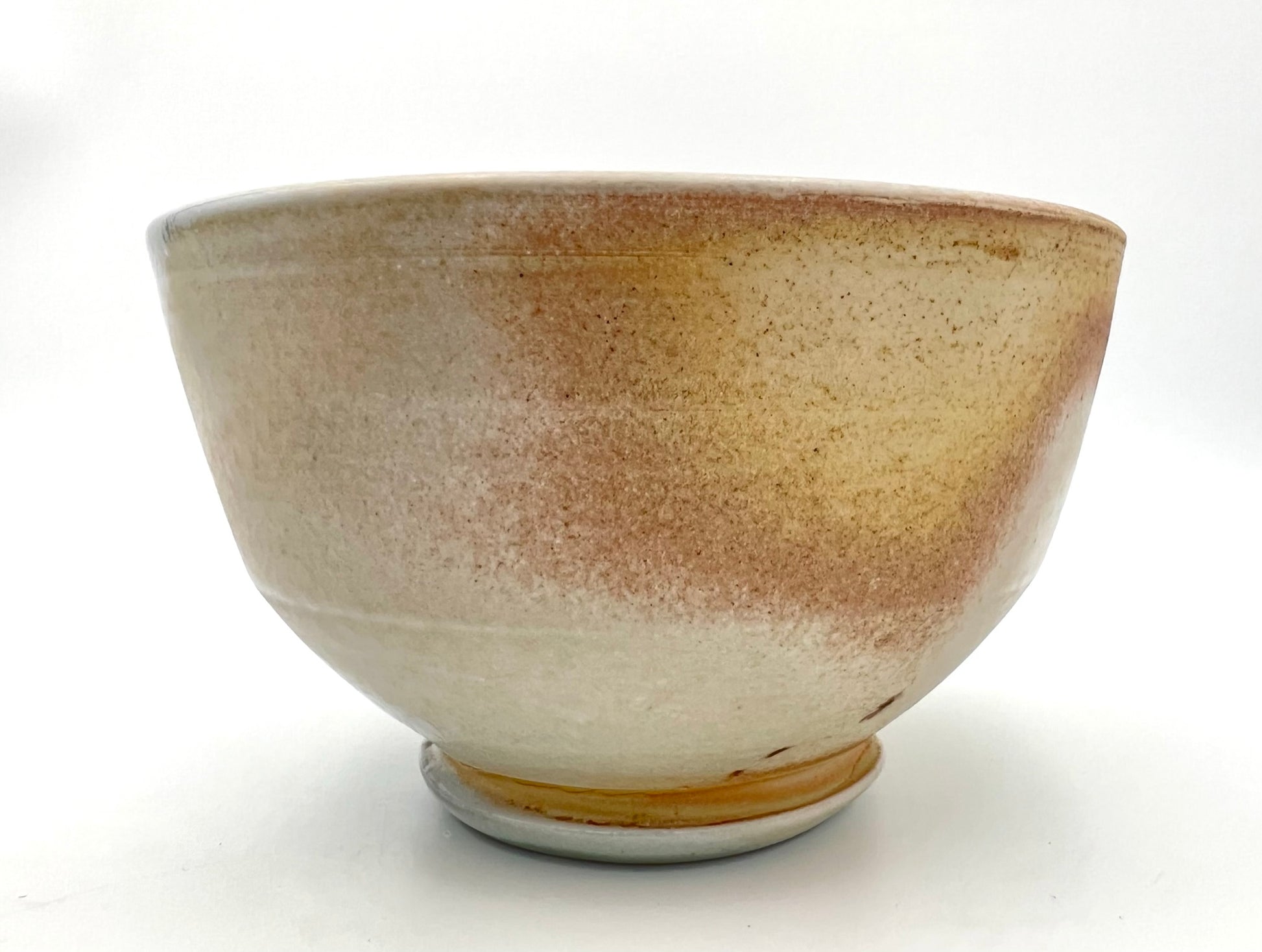 This bowl was thrown and trimmed on the wheel of NZ clay. What a beautiful example of what this clay can do. It was fired upside down in an anagama for many days. Where the ash collects, it presents as blue glass. In the more shielded areas the sandy flash appears. The bowl measures 5.5 inches wide.