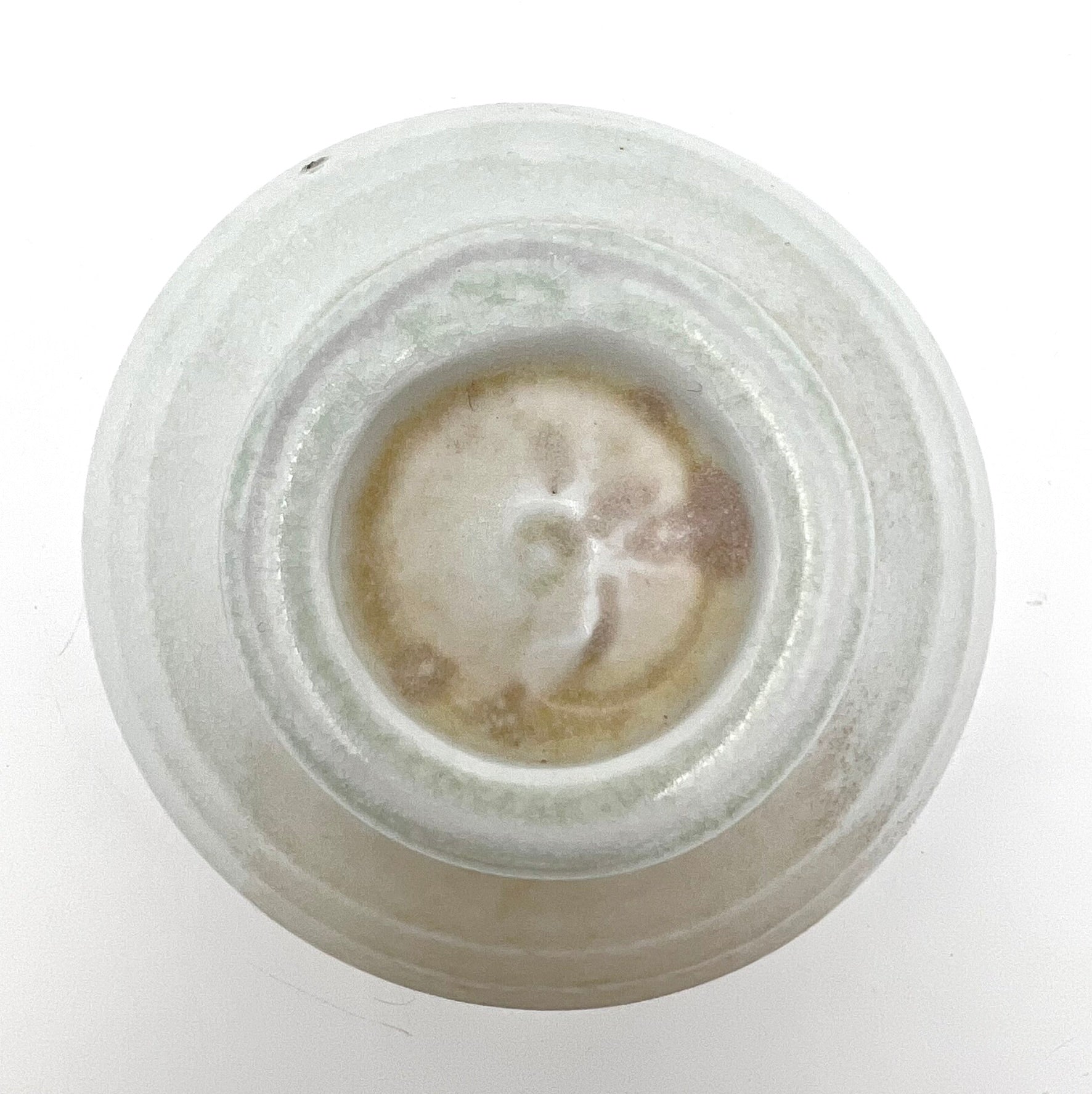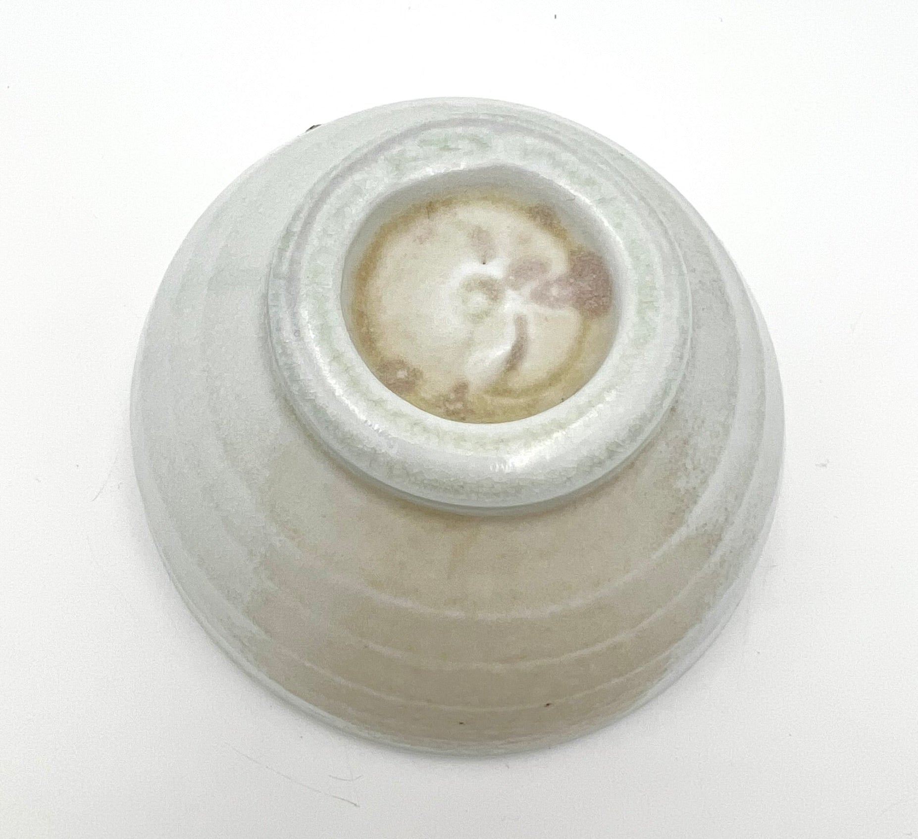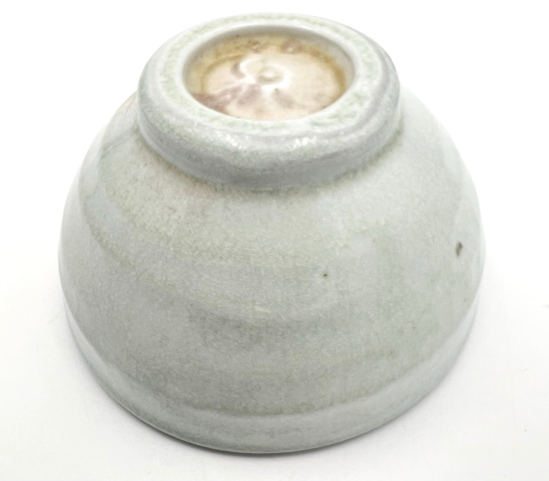 This bowl was thrown and trimmed on the wheel of NZ clay. It was fired upside down in an anagama for many days. What a beautiful example of what this clay can do. Where the ash collects, it presents as blue glass. In the more shielded areas the sandy flash appears. The bowl measures 5 inches wide.