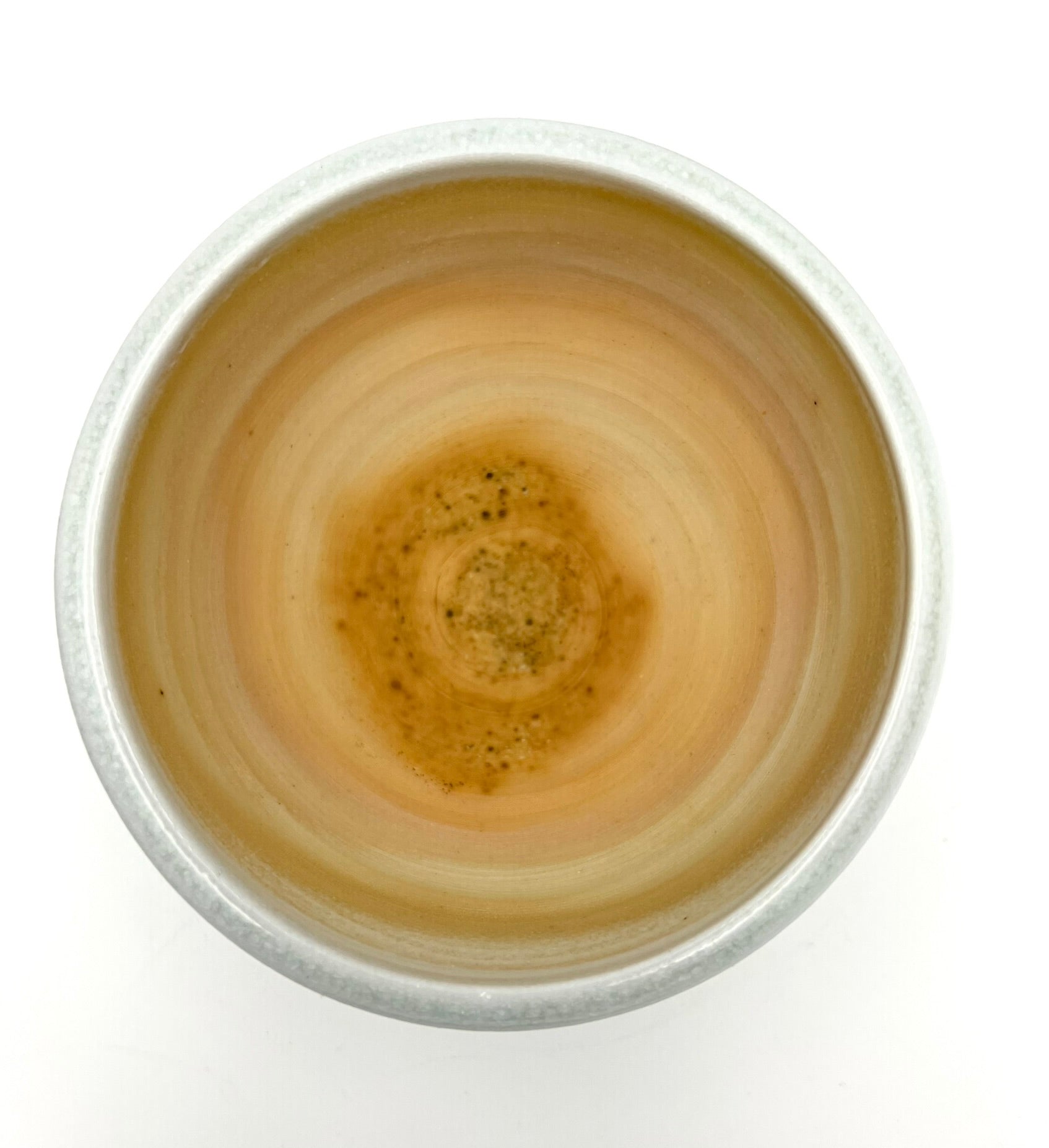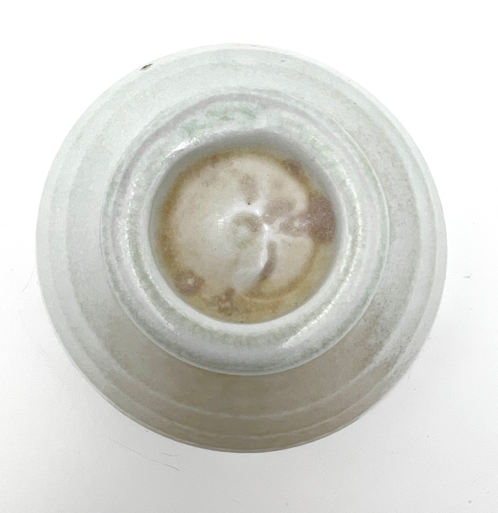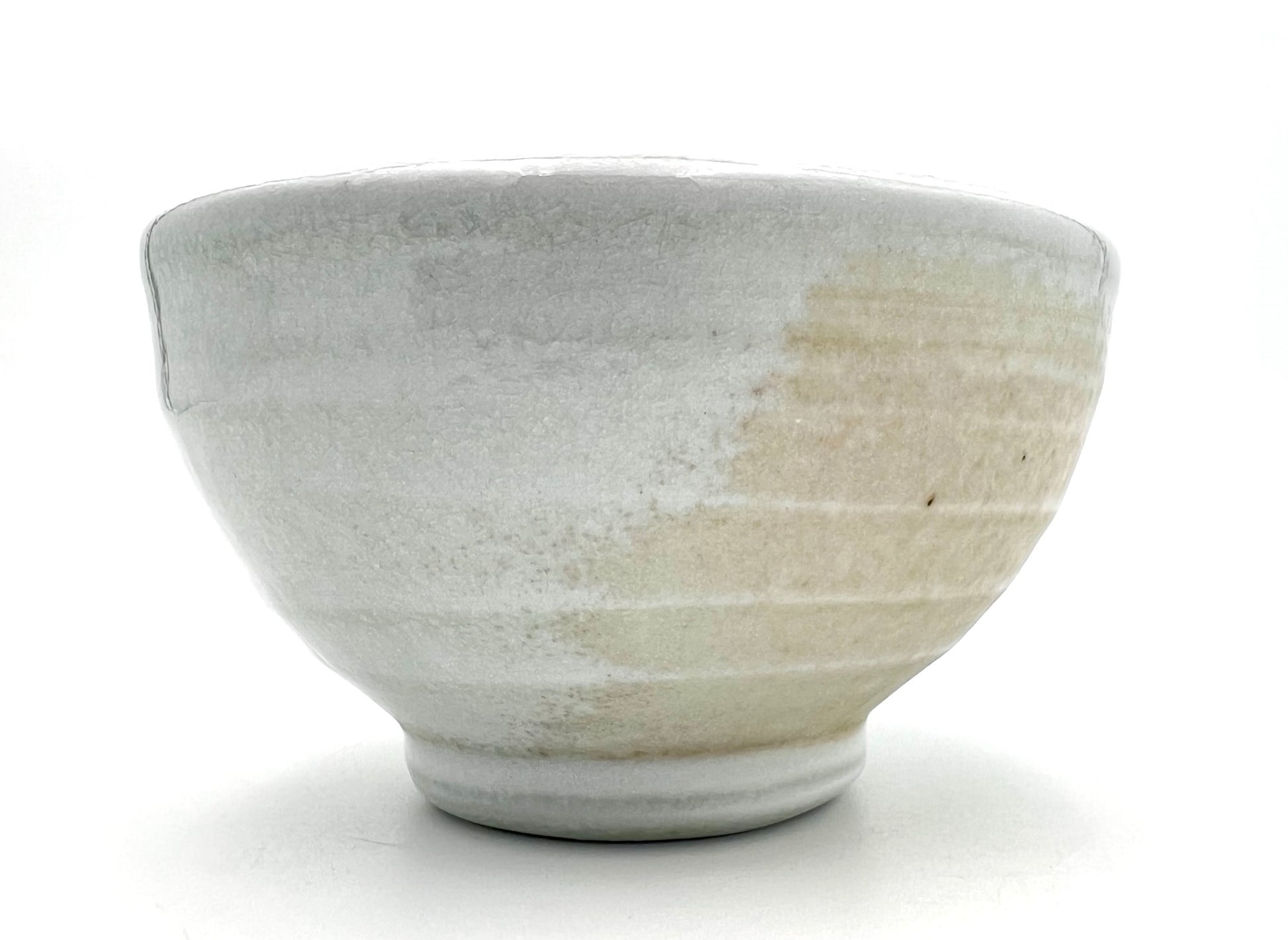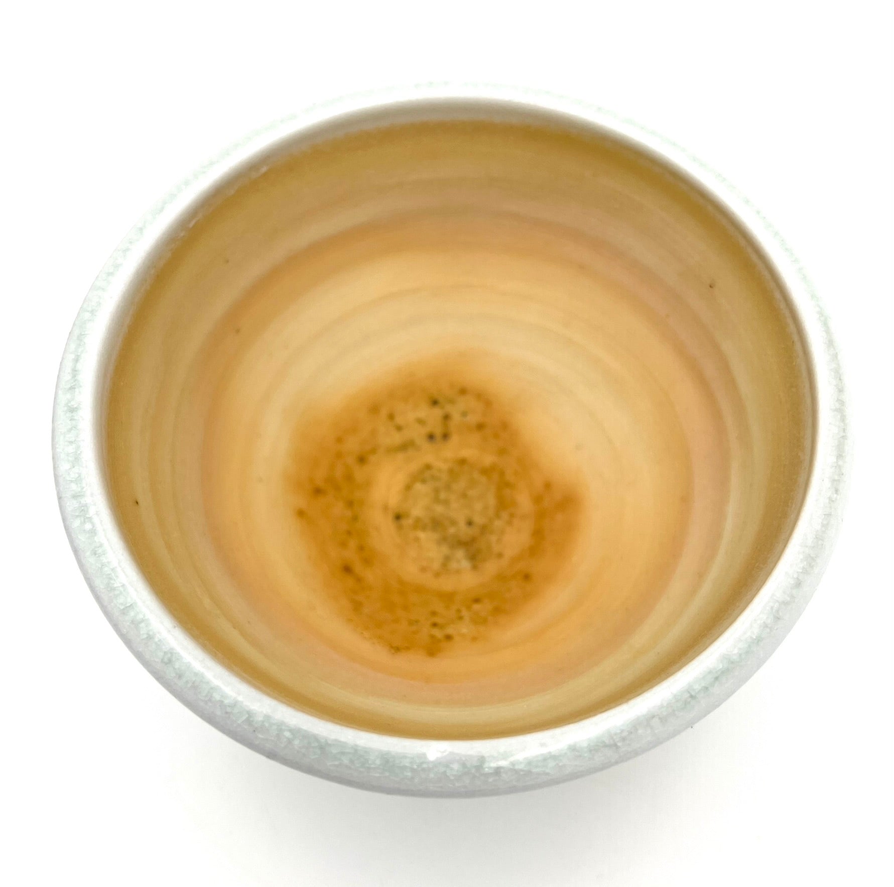 This bowl was thrown and trimmed on the wheel of NZ clay. It was fired upside down in an anagama for many days. What a beautiful example of what this clay can do. Where the ash collects, it presents as blue glass. In the more shielded areas the sandy flash appears. The bowl measures 5 inches wide.