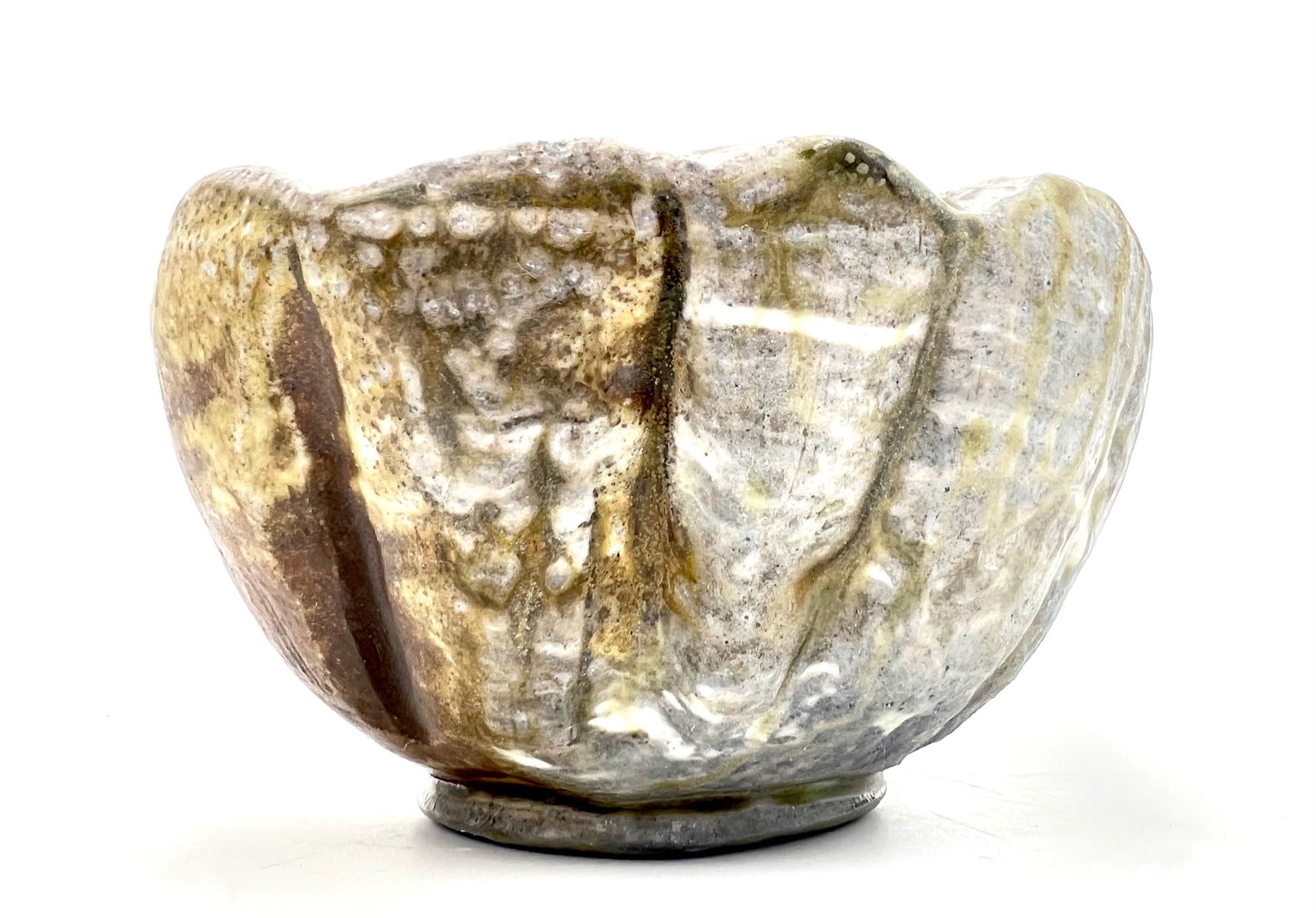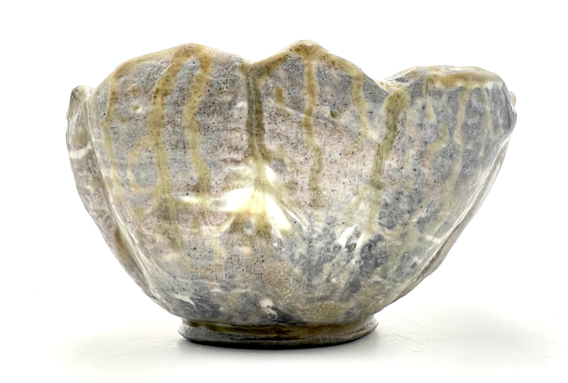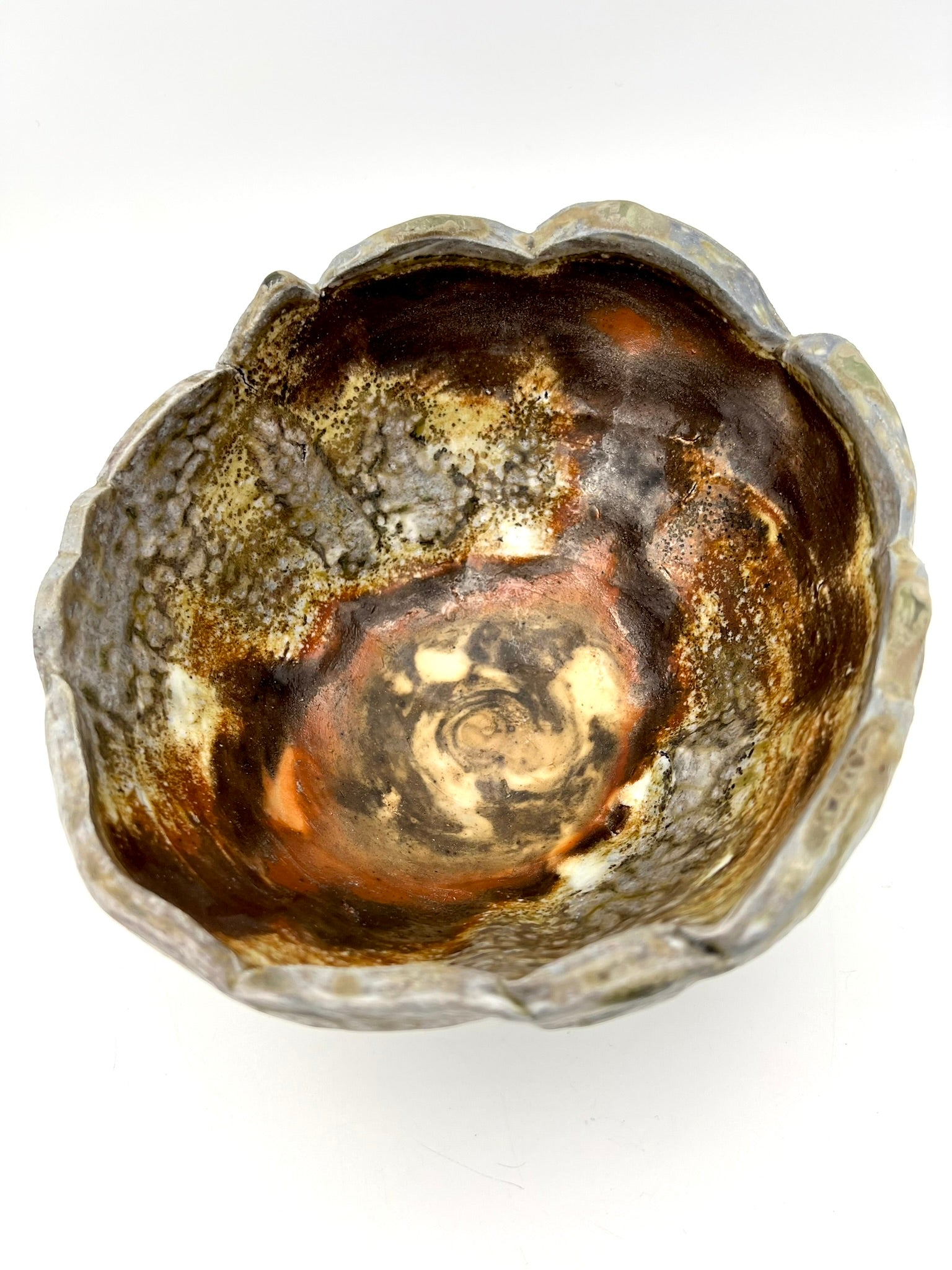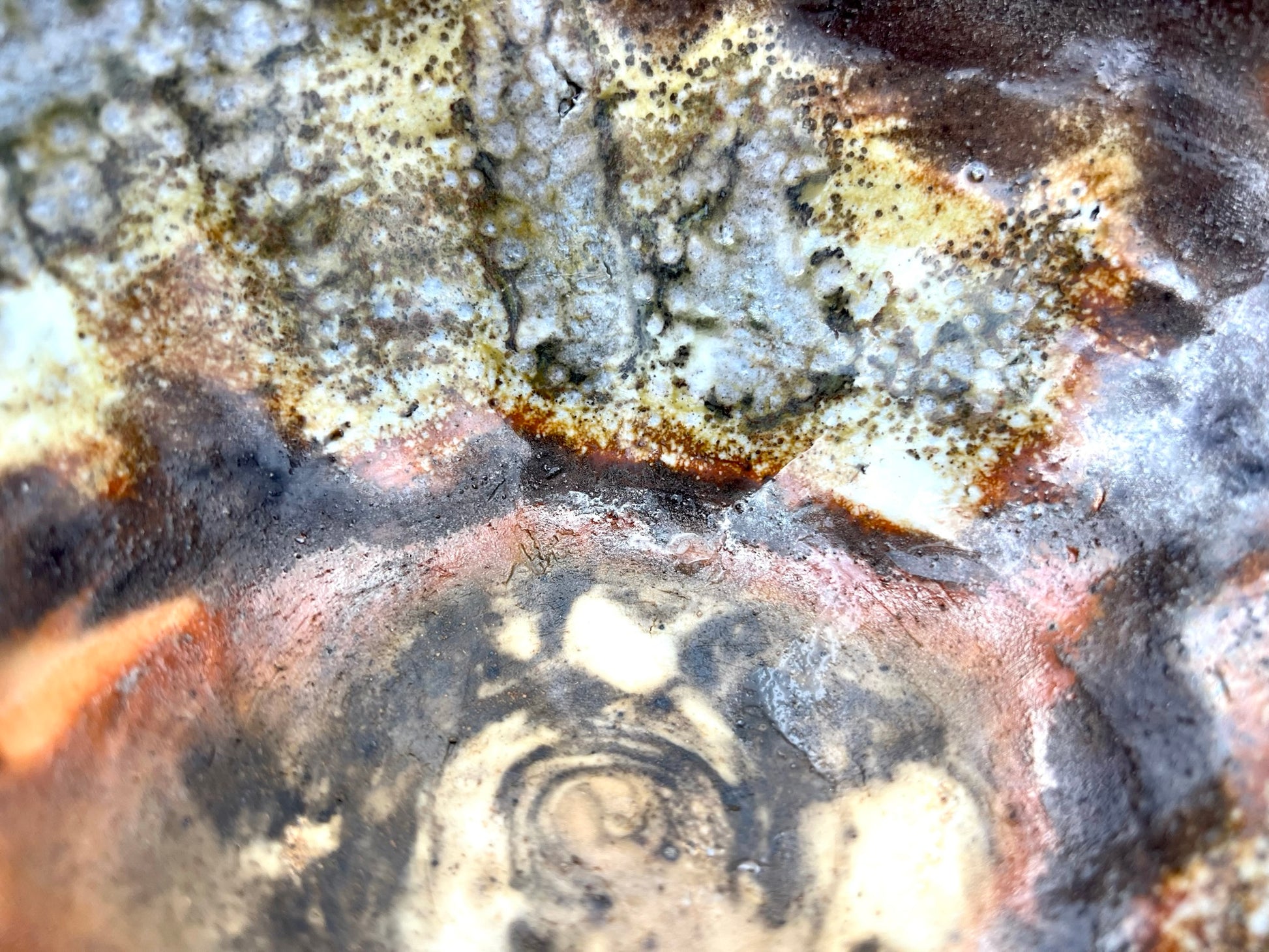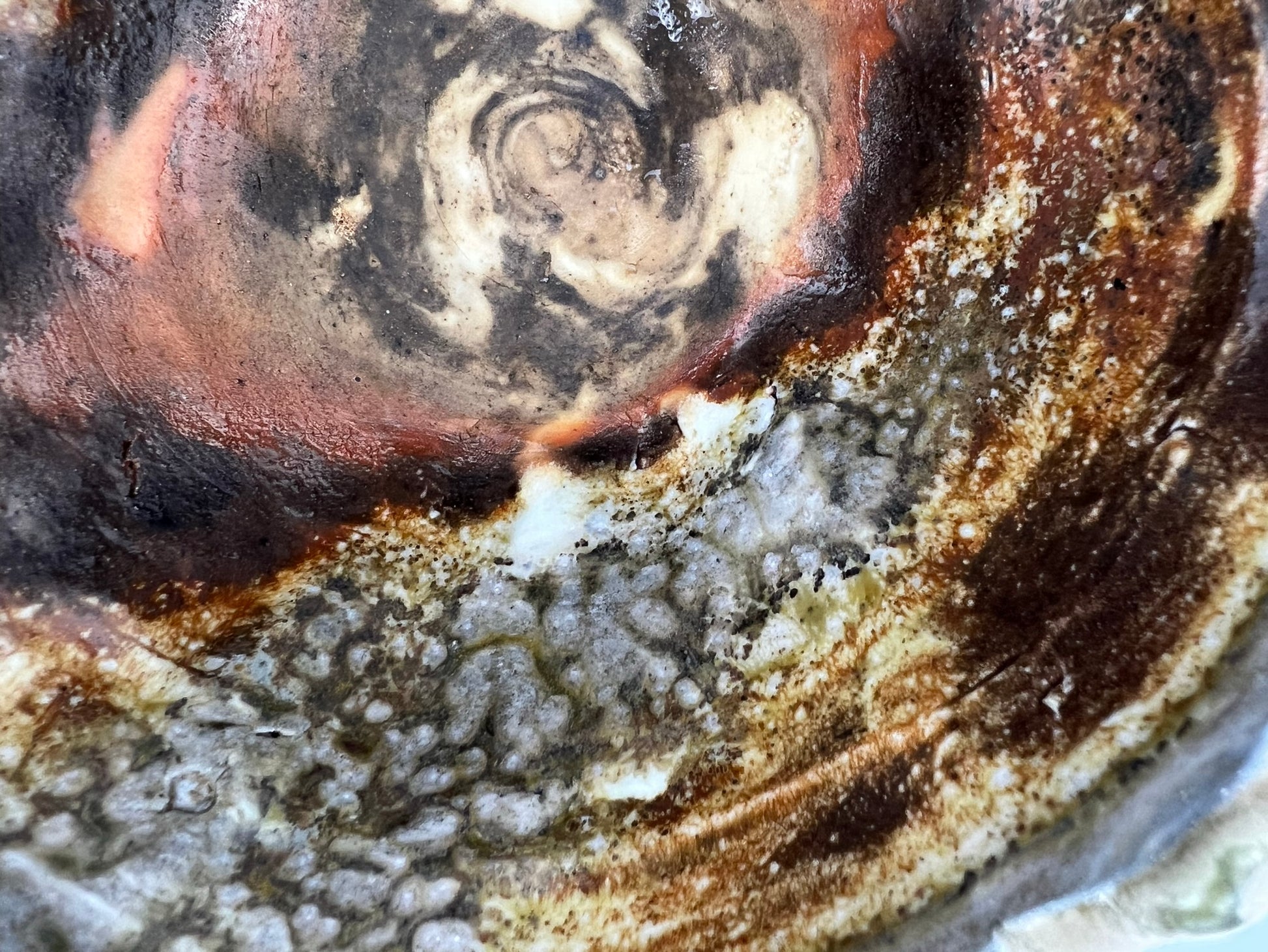 Wow. This bowl was thrown and trimmed on the wheel of Marbled porcelaneous stoneware clay. It was fired upside down in an anagama for many days. Rivulets cascade to the lip on the smammered side. NZ inclusions rise from the background like snow capped mountains. Ash snuck up inside as well, and left its orange peel deposits. Note the collection in the hand-carved foot as well. The bowl measures between 7 and 8 inches wide.