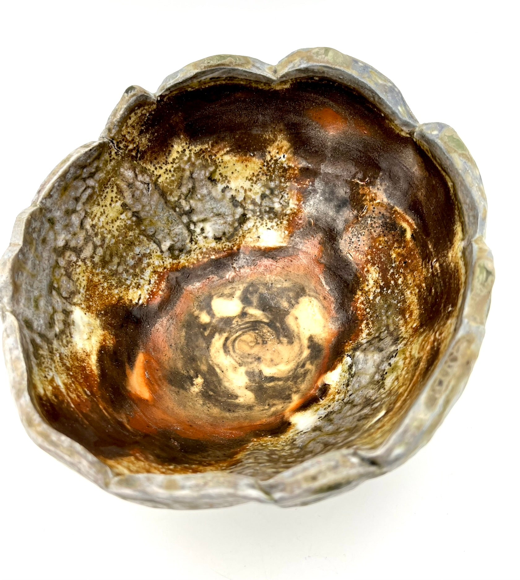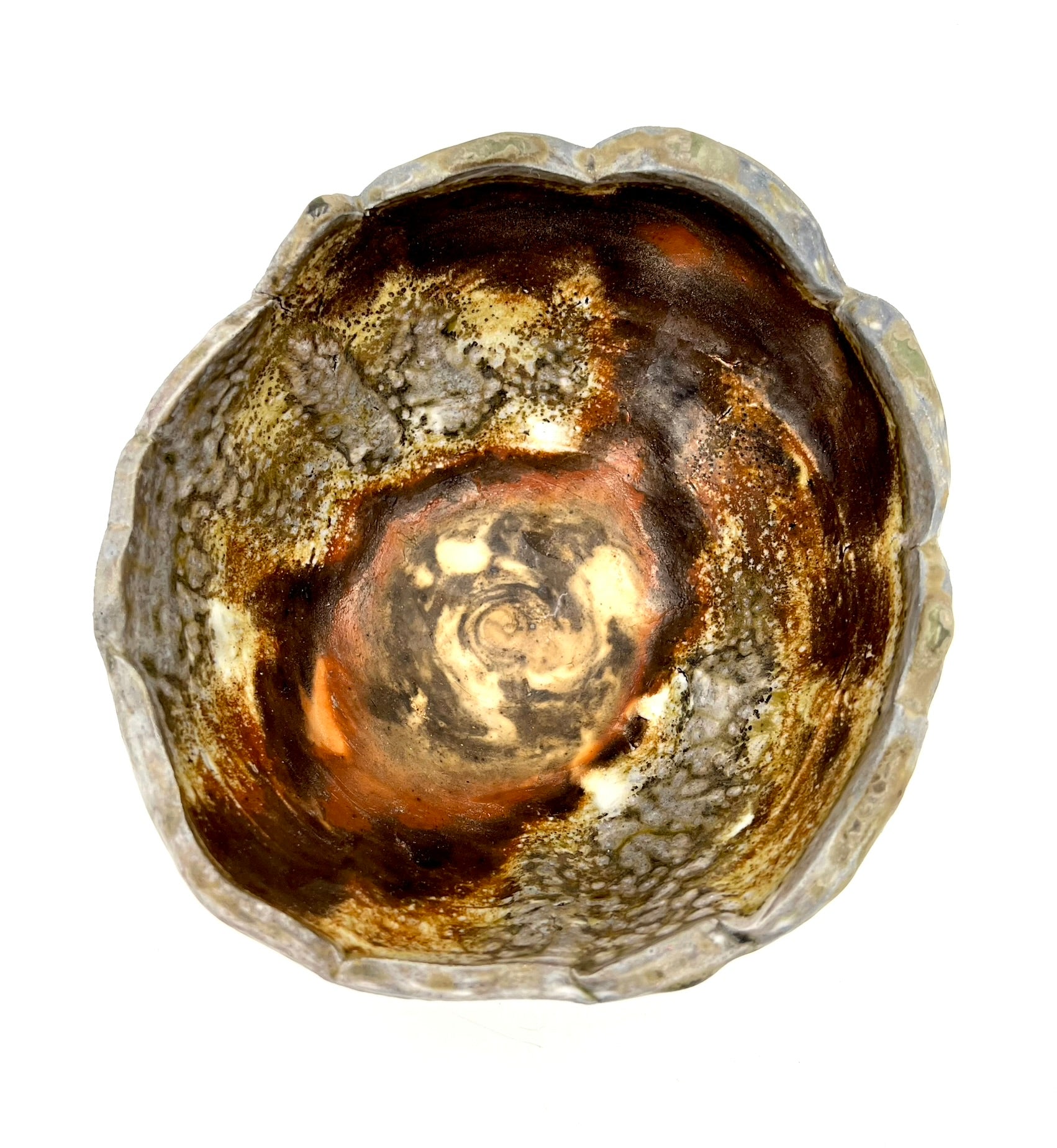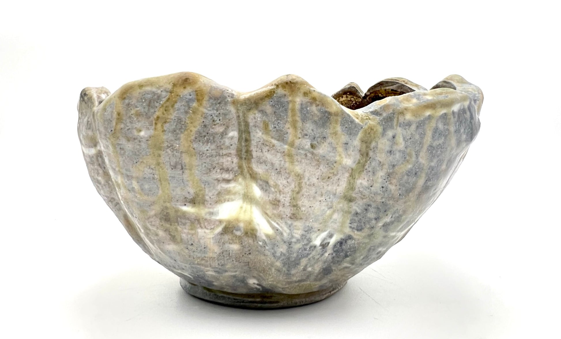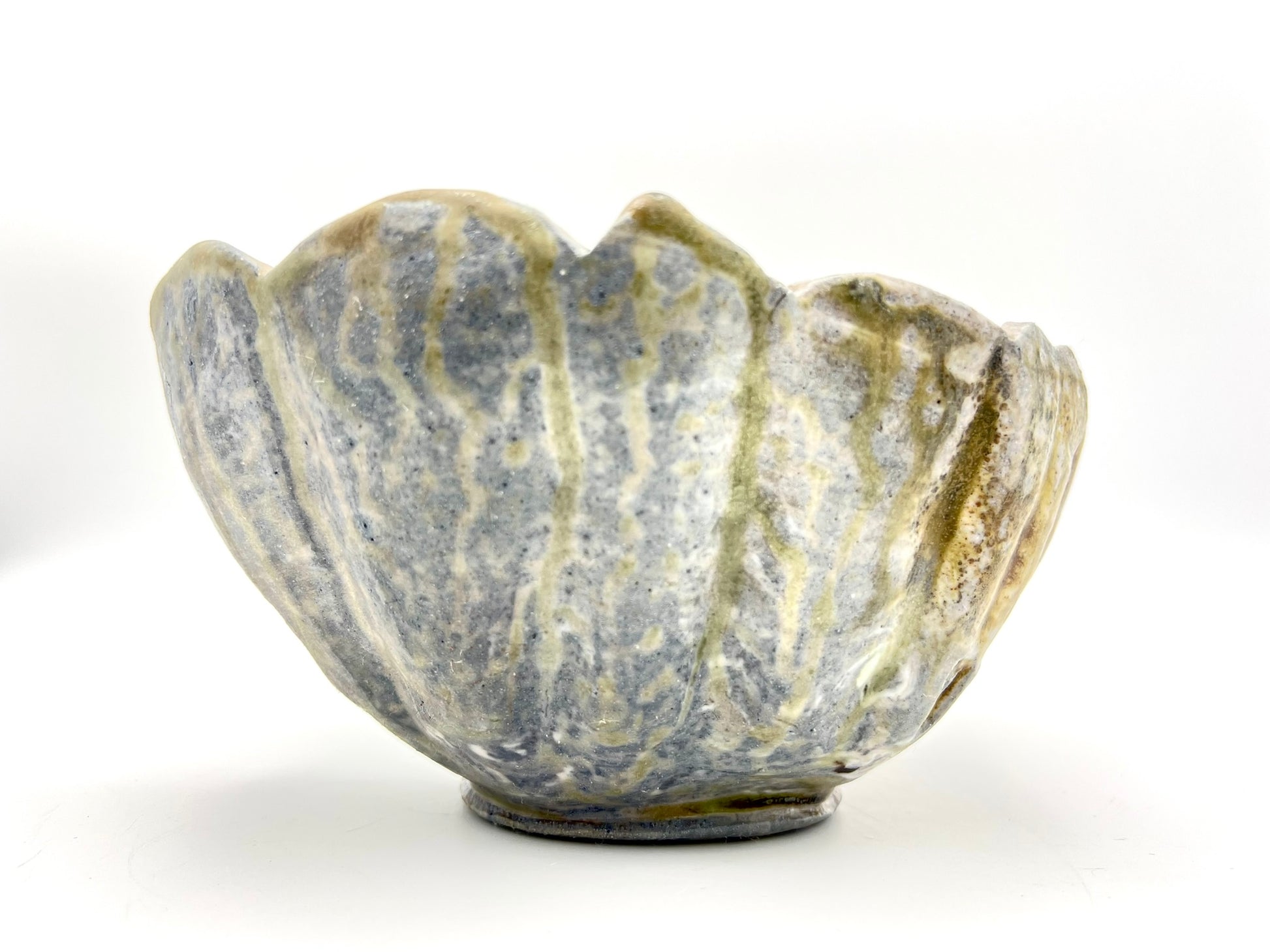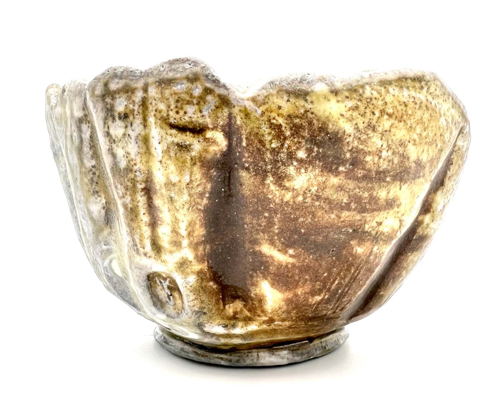 Wow. This bowl was thrown and trimmed on the wheel of Marbled porcelaneous stoneware clay. It was fired upside down in an anagama for many days. Rivulets cascade to the lip on the smammered side. NZ inclusions rise from the background like snow capped mountains. Ash snuck up inside as well, and left its orange peel deposits. Note the collection in the hand-carved foot as well. The bowl measures between 7 and 8 inches wide.