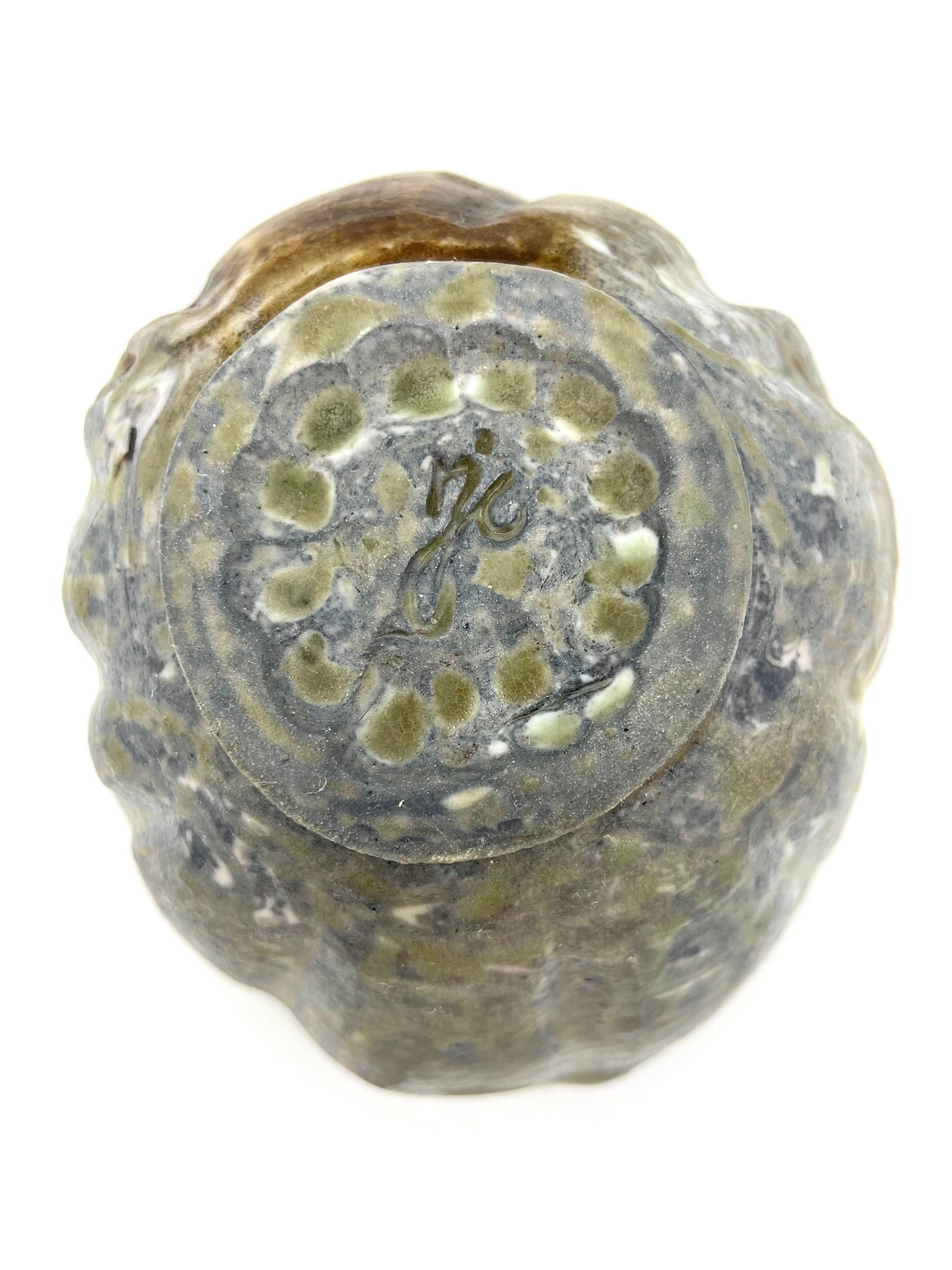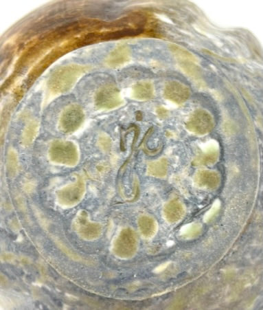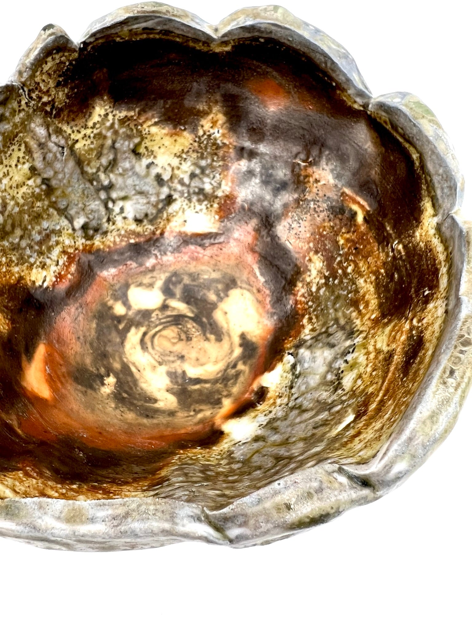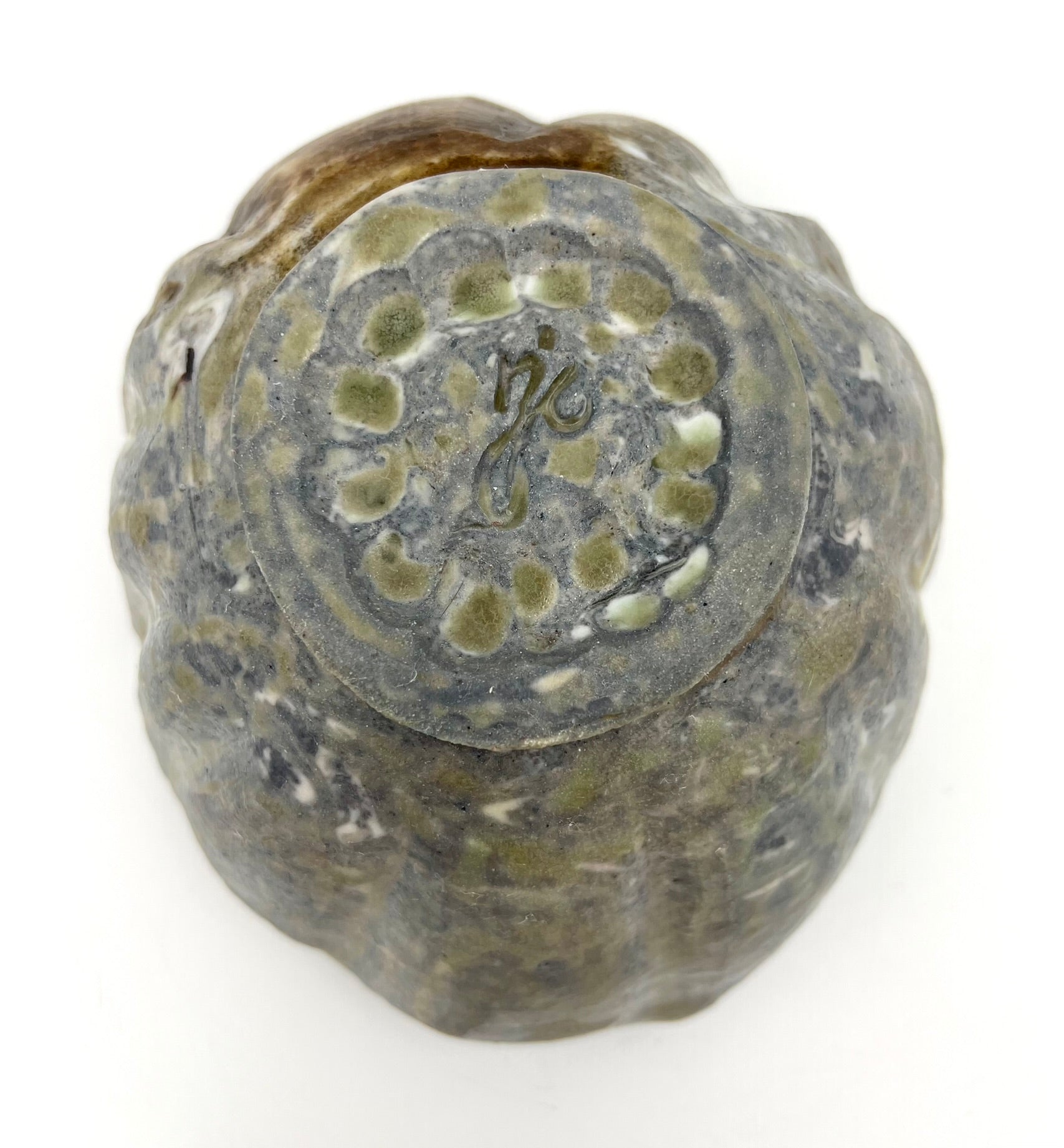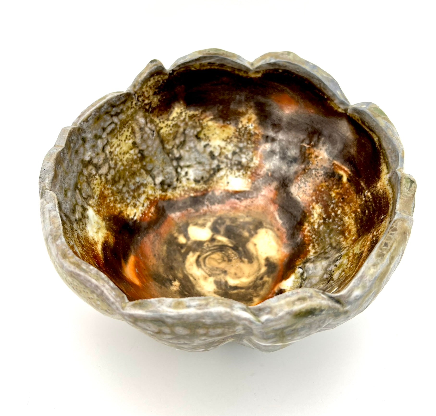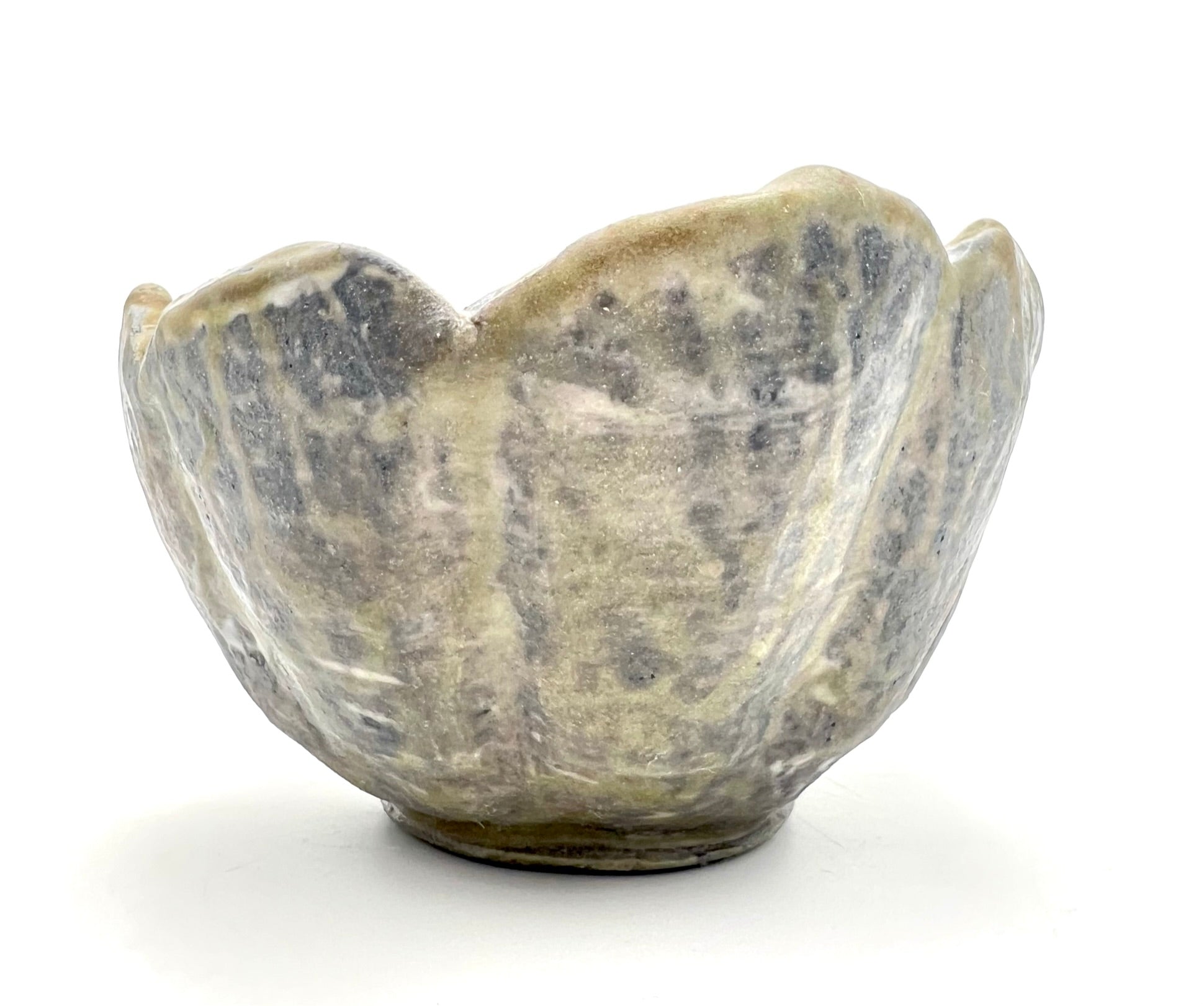 Wow. This bowl was thrown and trimmed on the wheel of Marbled porcelaneous stoneware clay. It was fired upside down in an anagama for many days. Rivulets cascade to the lip on the smammered side. NZ inclusions rise from the background like snow capped mountains. Ash snuck up inside as well, and left its orange peel deposits. Note the collection in the hand-carved foot as well. The bowl measures between 7 and 8 inches wide.