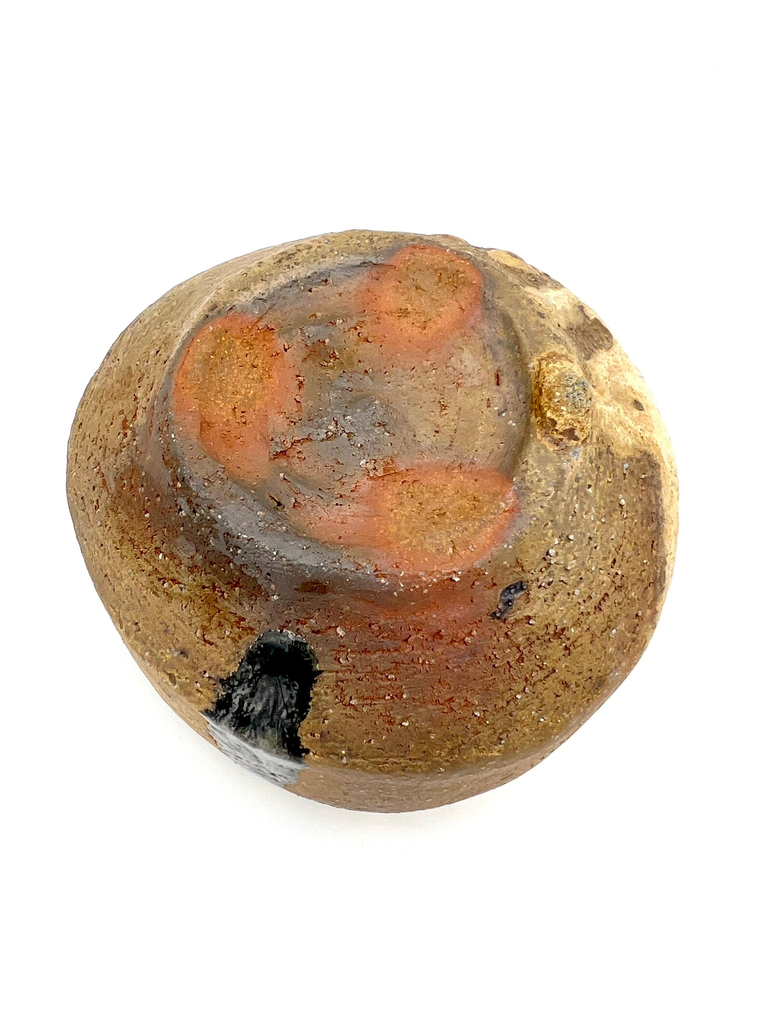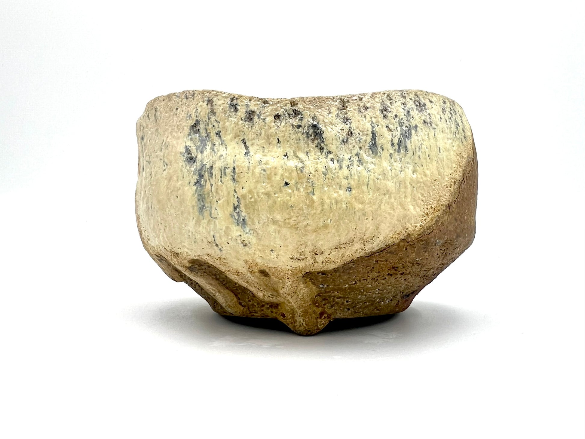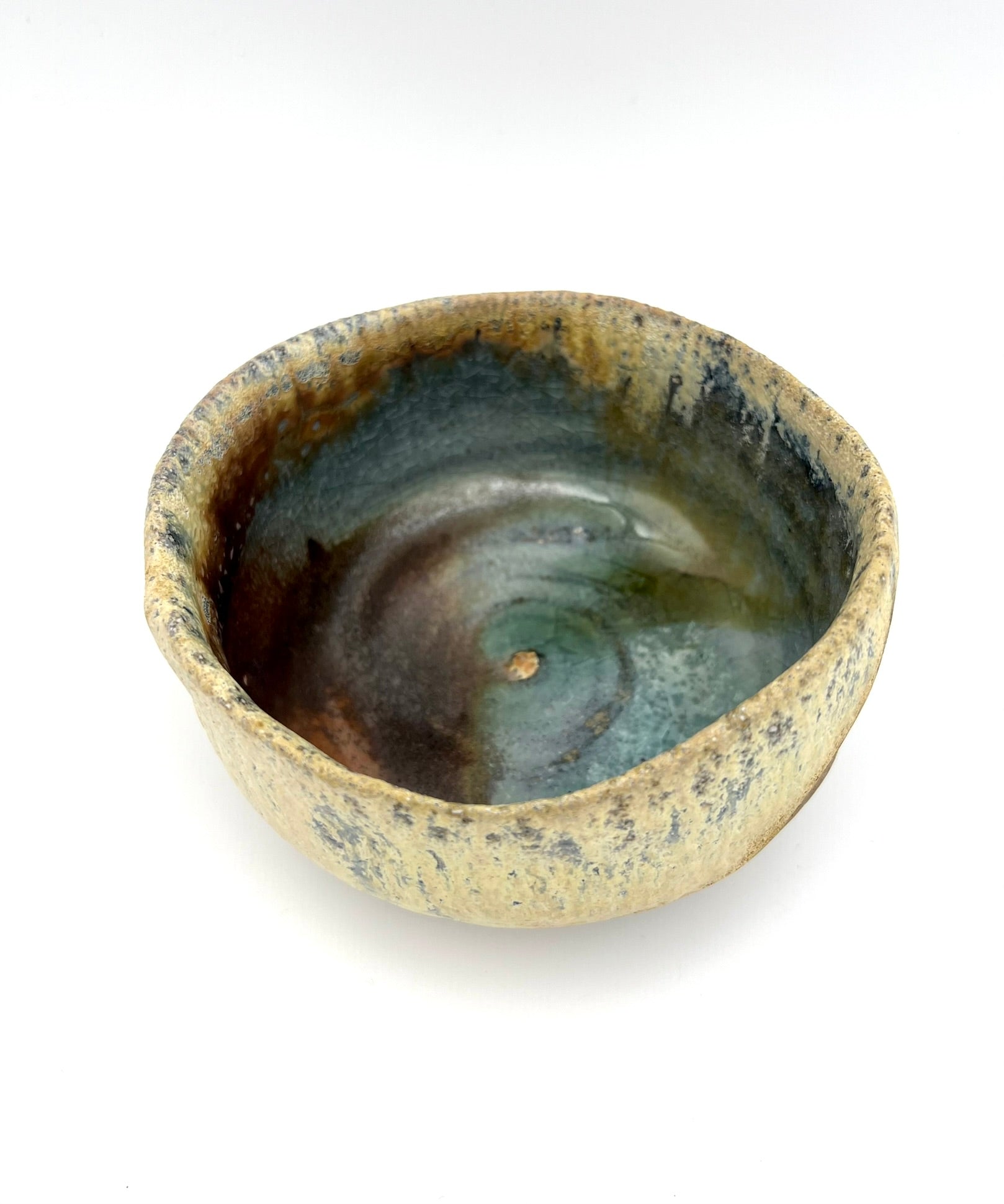 I threw this teabowl on the potters wheel of Bedrock clay. I wedged a lot of Ceramic Rutile into the clay body. It is lined in Penn State Shino. It was fired in the old Chicken Cat wood/soda kiln at East Creek. It measures 5 inches wide & 2.75 inches tall.