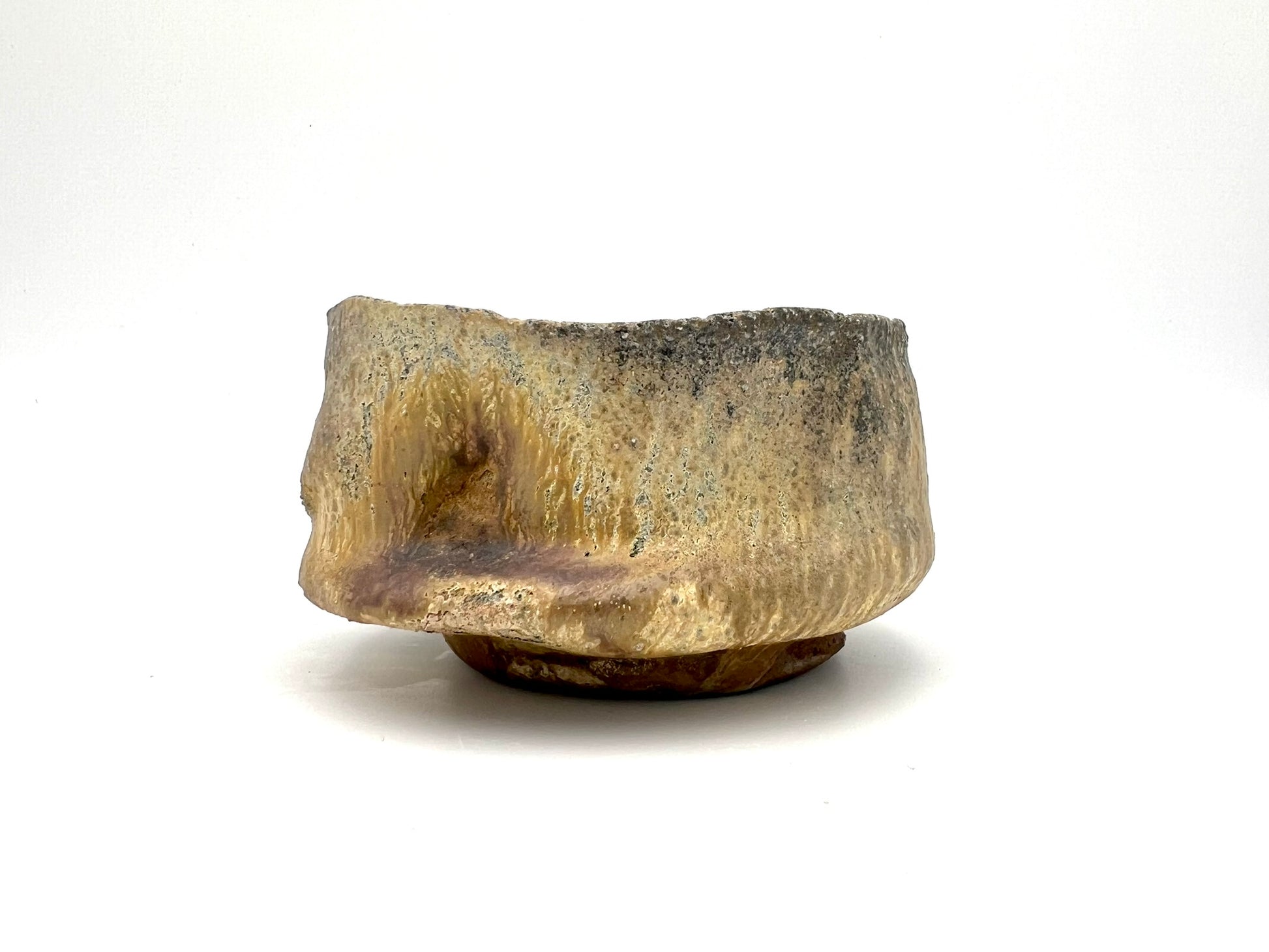 I threw this teabowl on the potters wheel of Bedrock clay. I wedged a lot of Ceramic Rutile into the clay body. It is lined in Penn State Shino. It was fired in the old Chicken Cat wood/soda kiln at East Creek. It measures 4.25 inches wide & 2.25 inches tall.