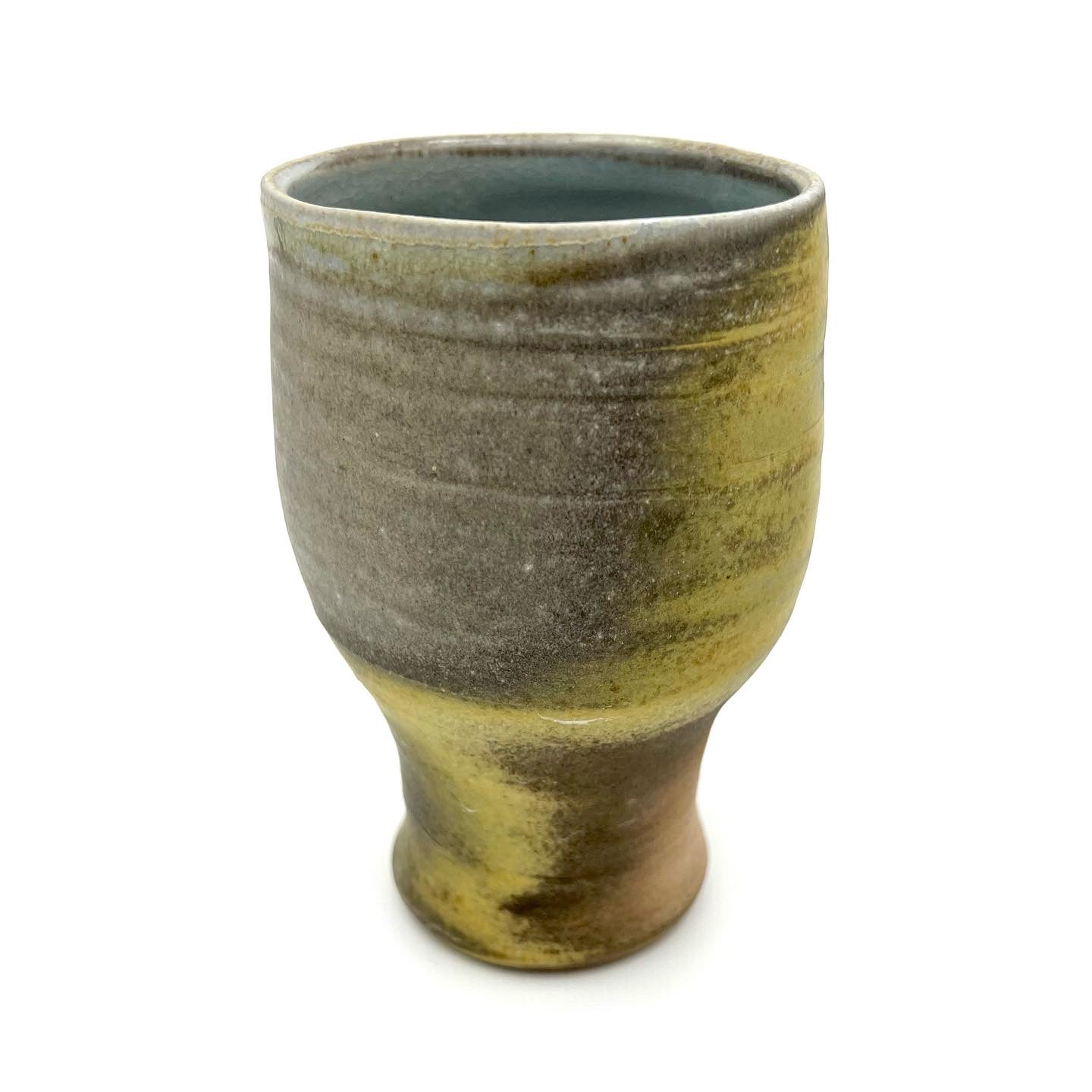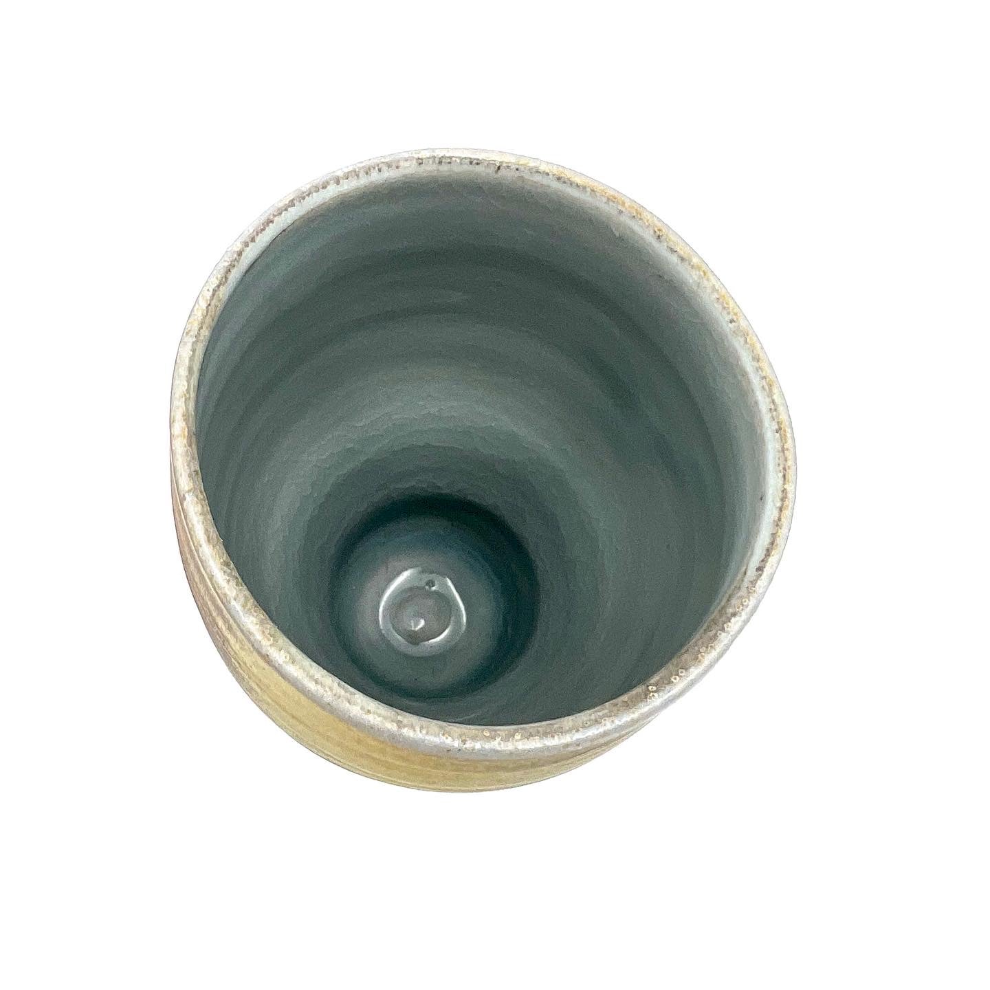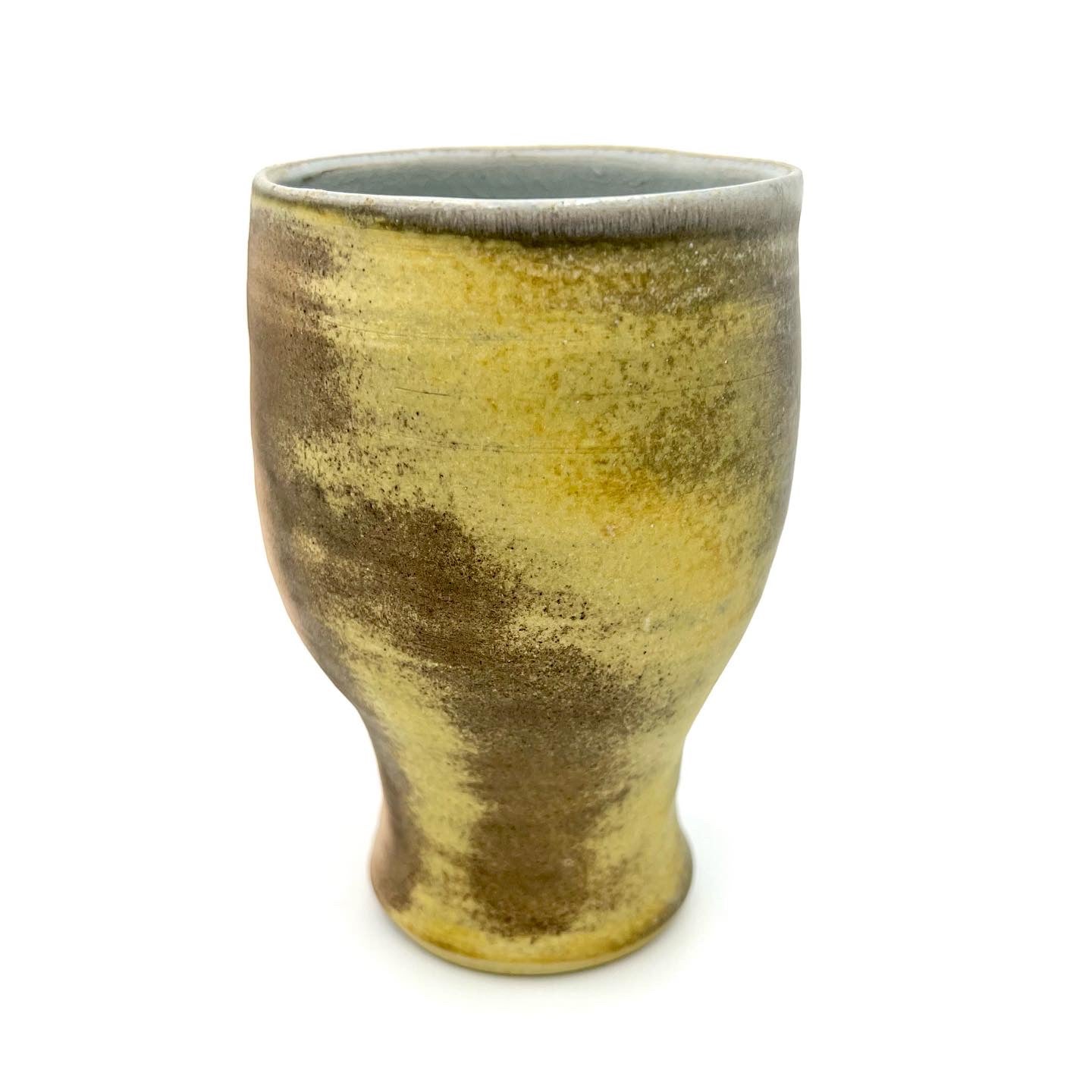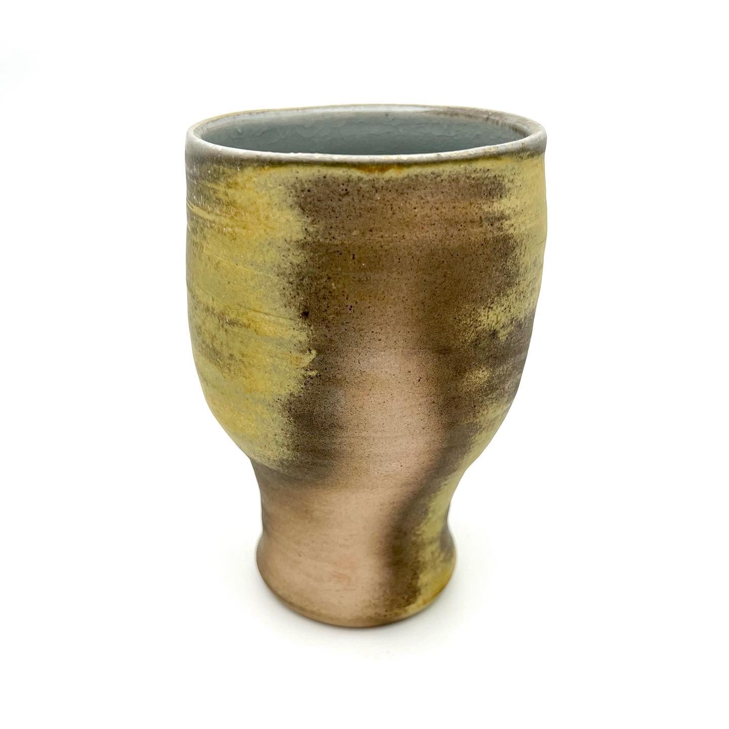 This tumbler was thrown on the wheel of White Rose clay. The interior was lined with AW2 (1 part blue/4 parts clear). It was fired in an anagama for many days. The flashing on this clay body is just wonderful. And the snowflake crystals in the ash field. Mua! 5.75 inches tall 4 inches at its widest Holds 18 oz.