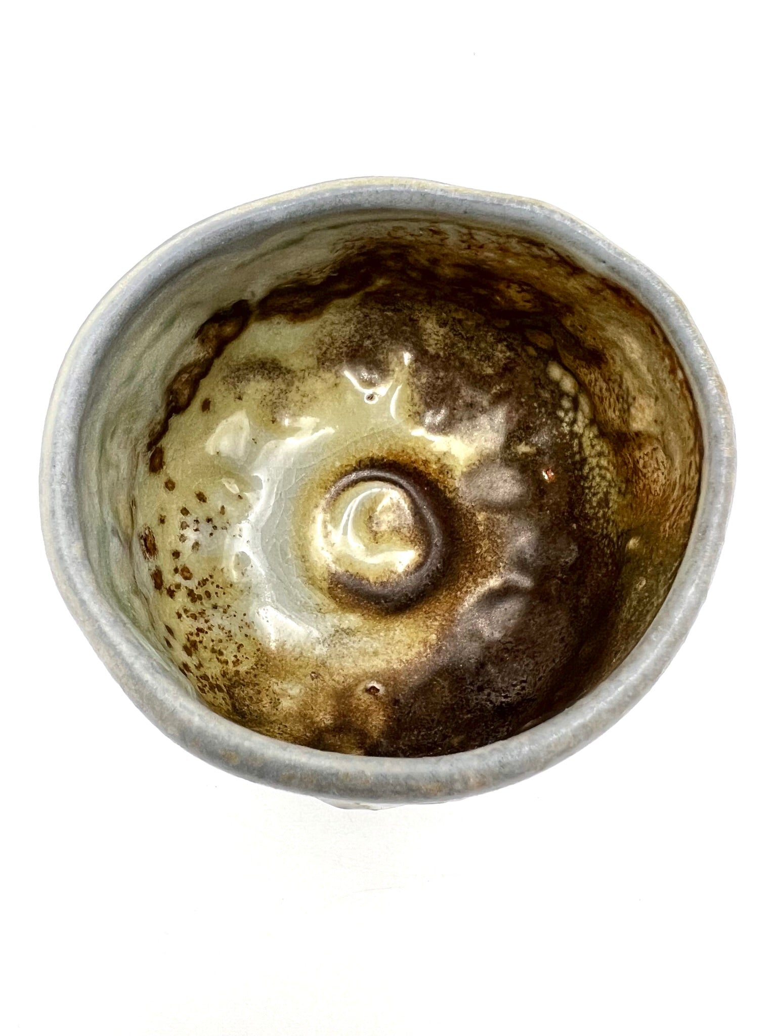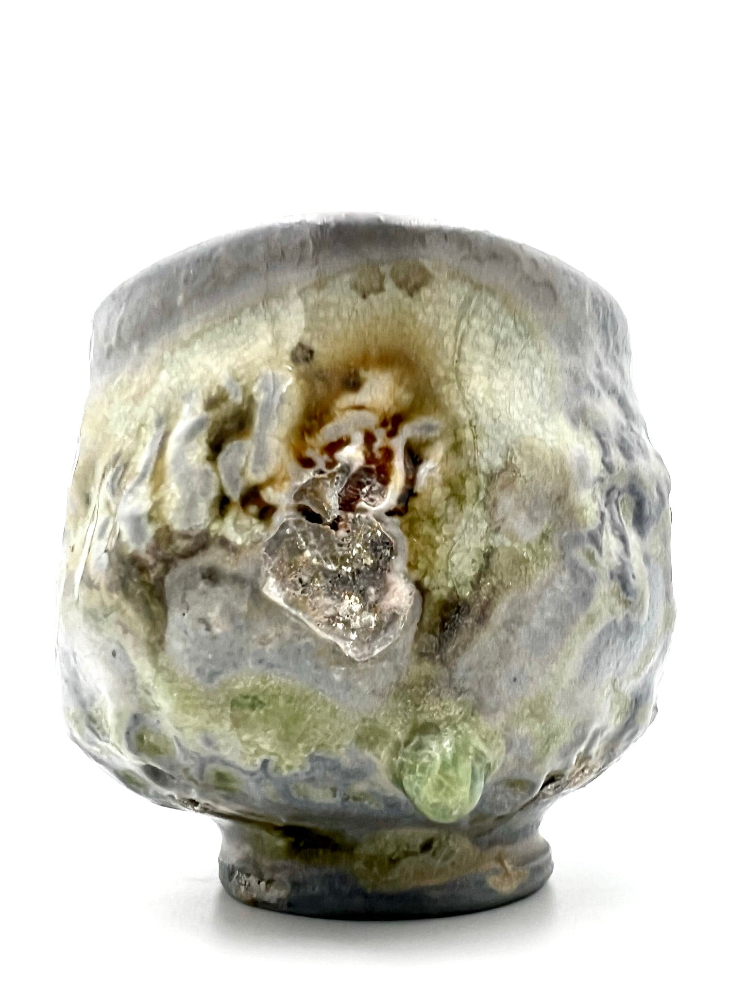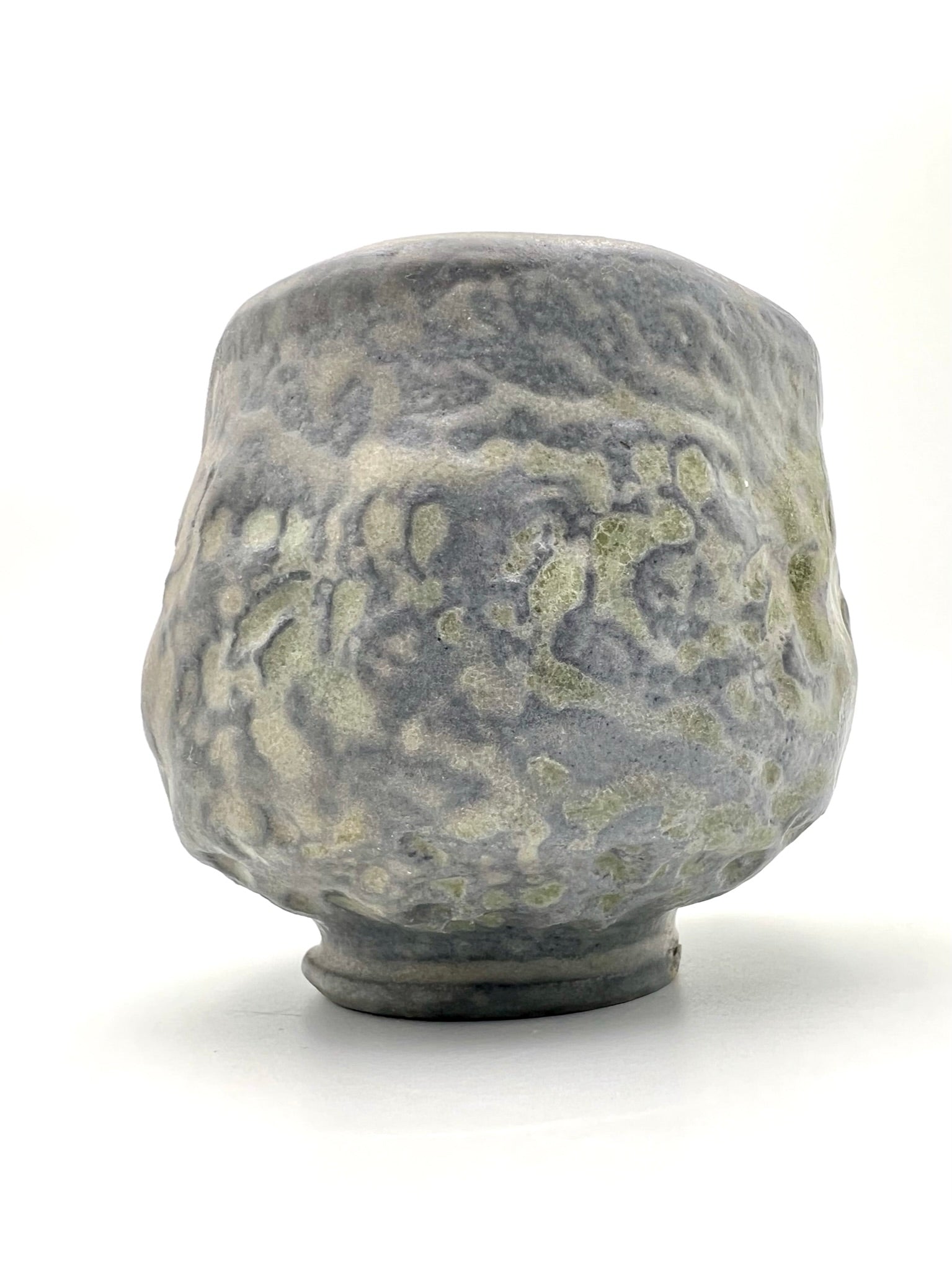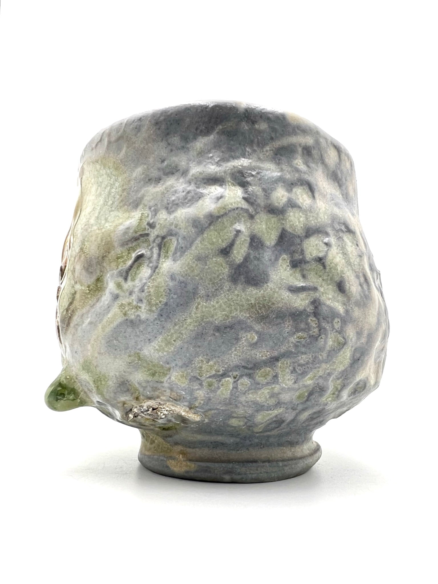 This cup was thrown on the potters wheel of Mac-10 clay. Press molds of fossilized star and brain coral were used to texture the walls. I hand carved the foot. It was lined with shino and fired on its side on seashells for many days in an anagama. The cup measures 3.5 inches tall and holds 10 ounces.