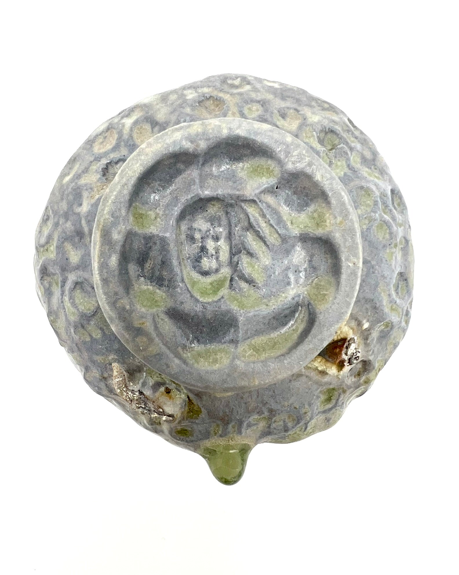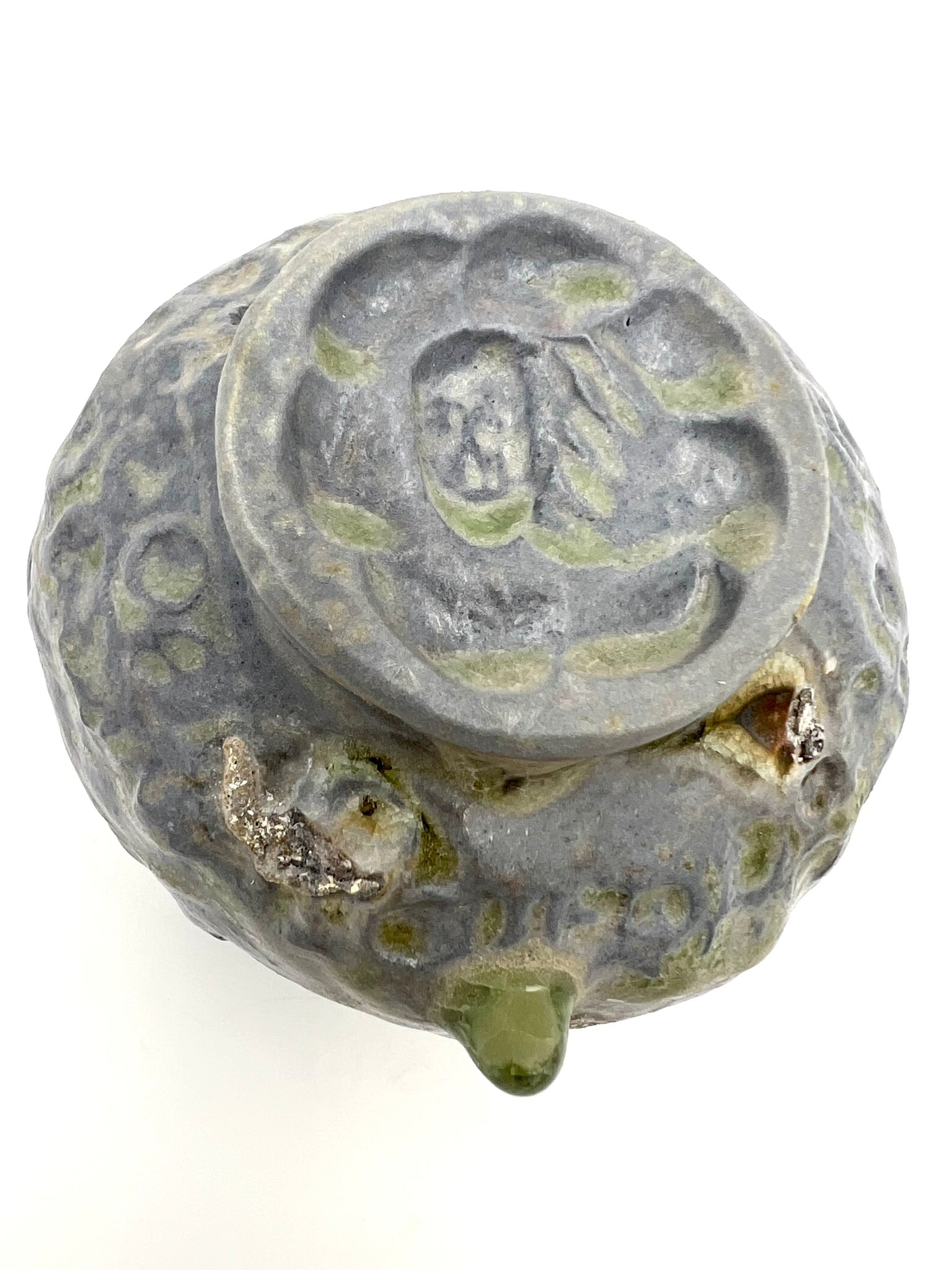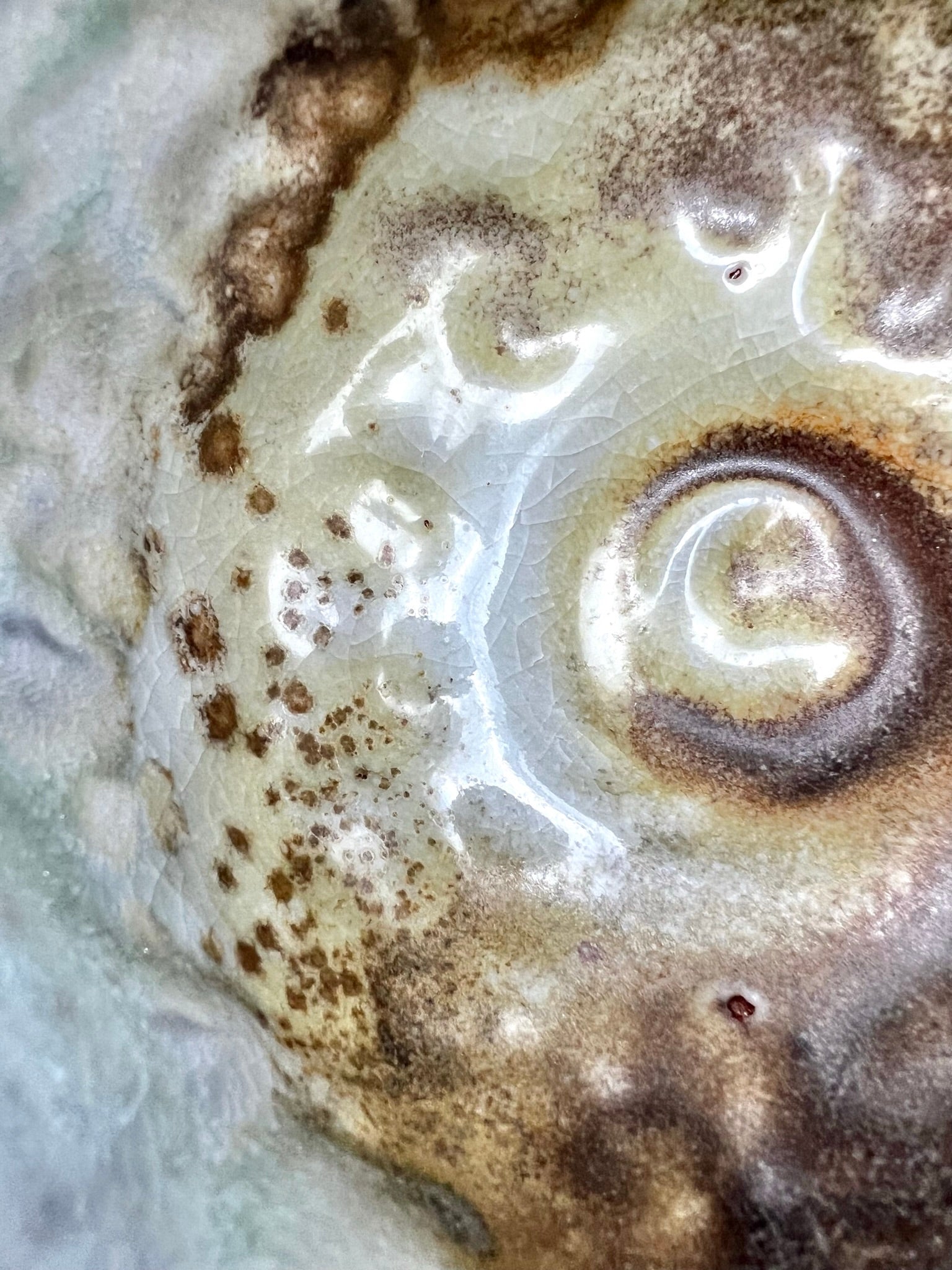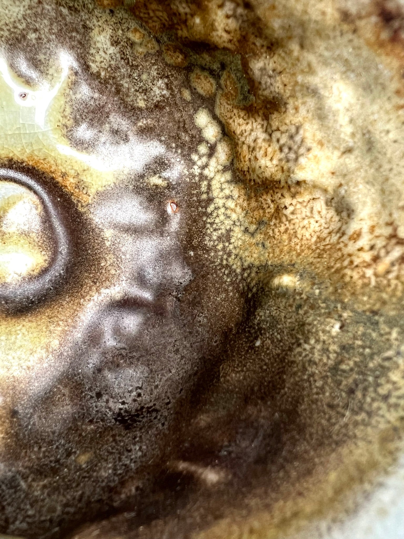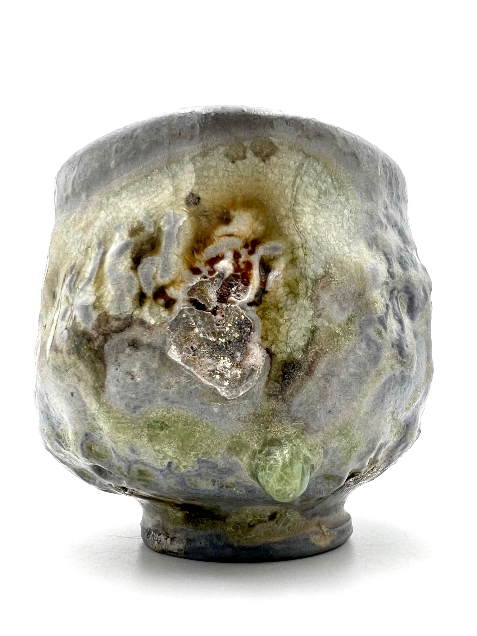 This cup was thrown on the potters wheel of Mac-10 clay. Press molds of fossilized star and brain coral were used to texture the walls. I hand carved the foot. It was lined with shino and fired on its side on seashells for many days in an anagama. The cup measures 3.5 inches tall and holds 10 ounces.