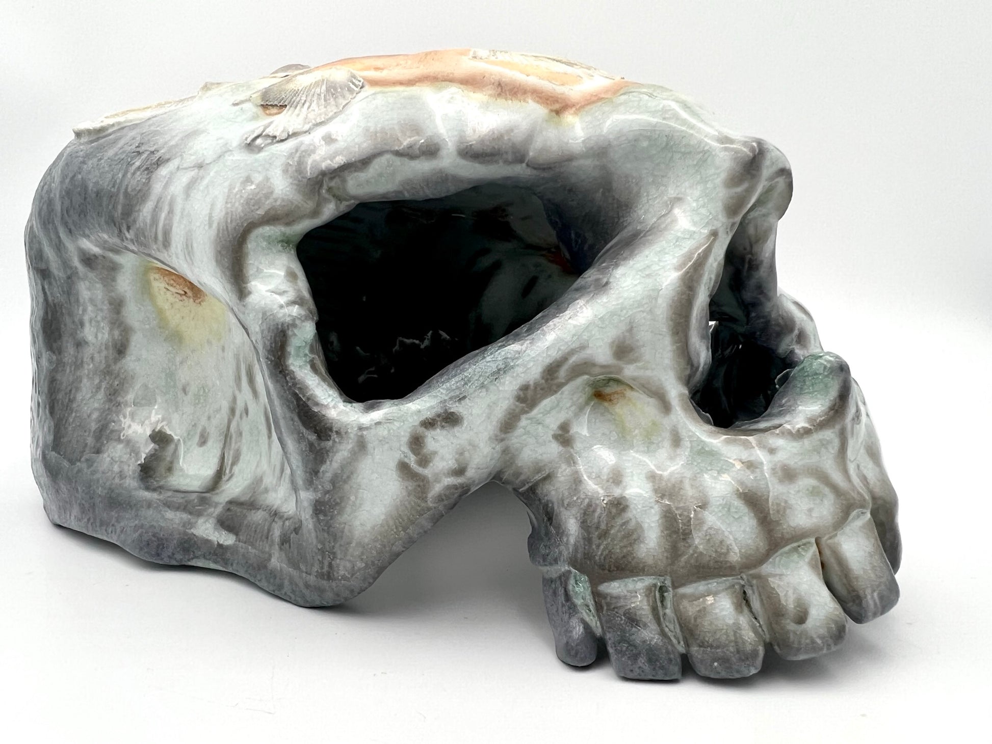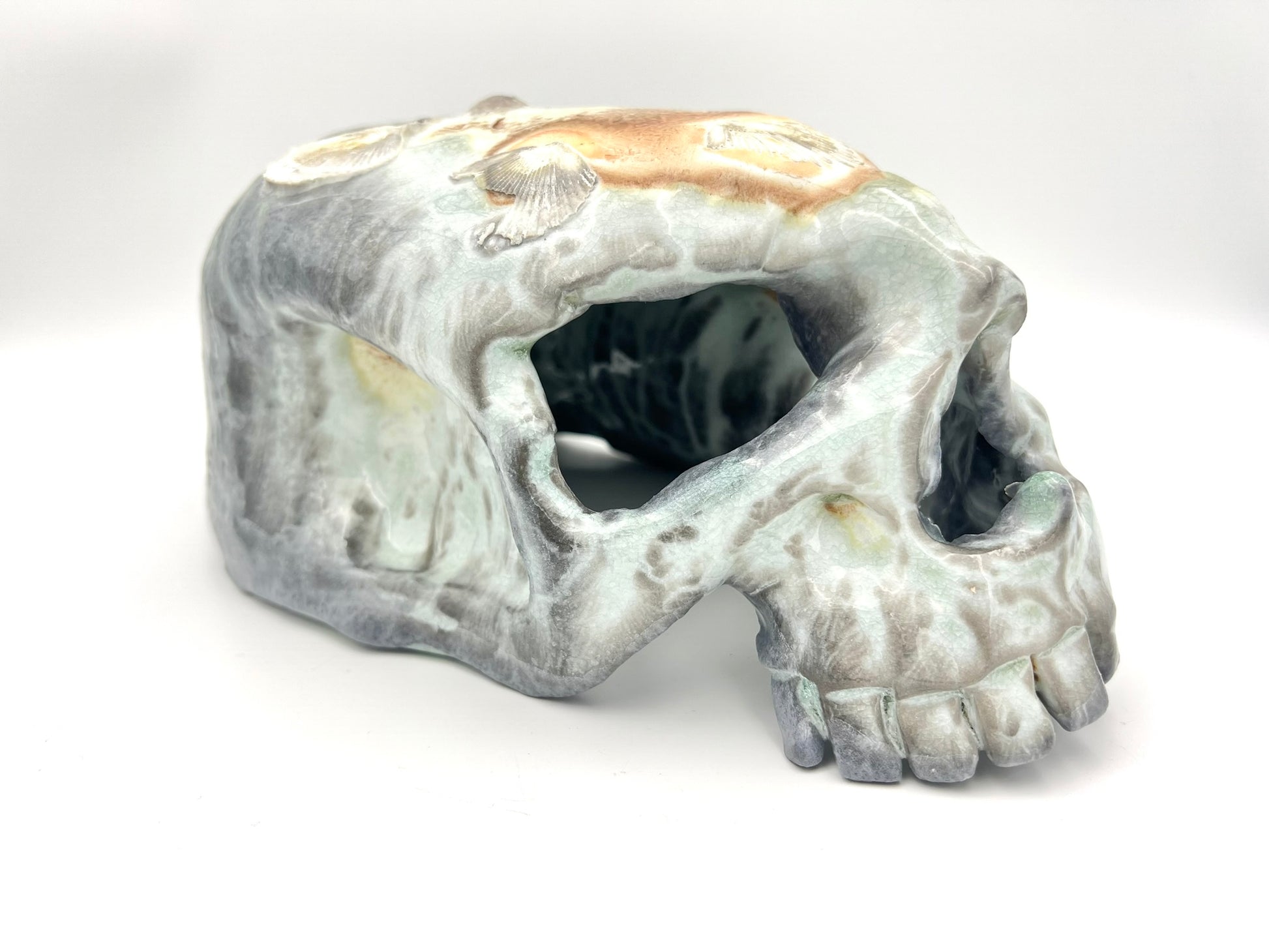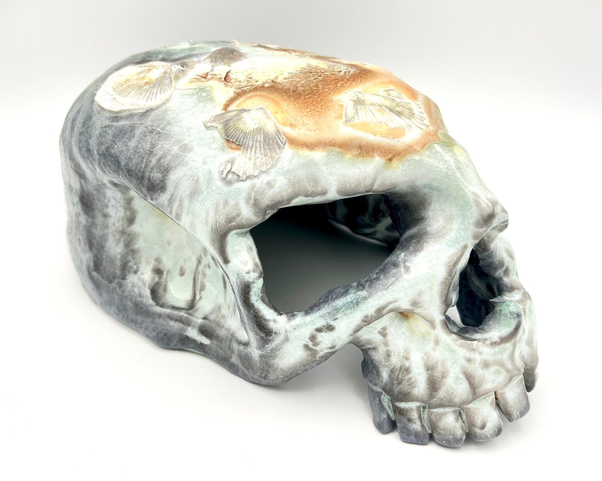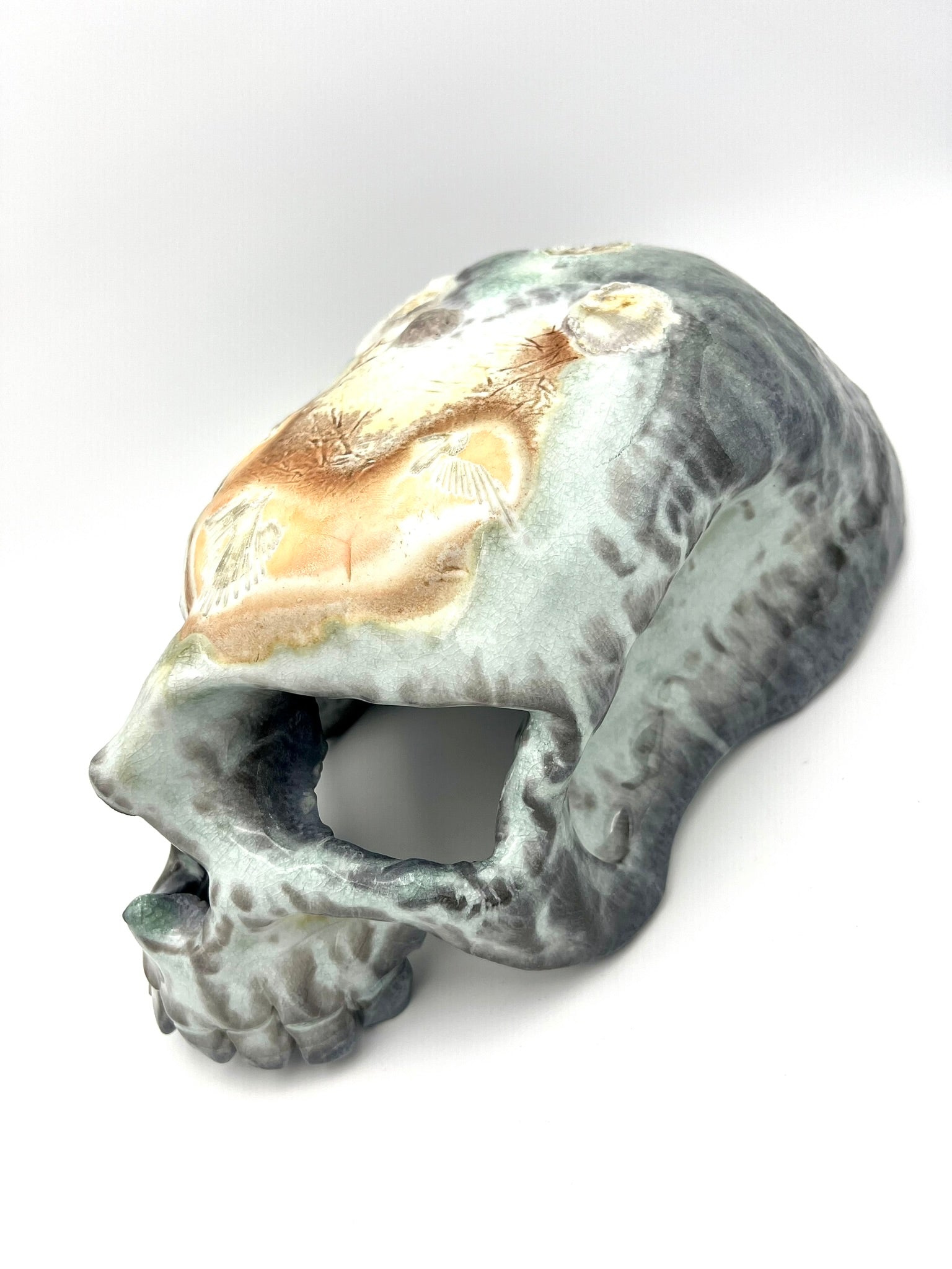This skull was thrown on the potters wheel of NZ clay. When it hardened up a little, I used a harp wire tool to carve out the shape. Then I fashioned teeth with a fettling knife. It was fired upside-down on seashells in the front of an anagama for many days. This artifact measures 5"x 5.5"x 11".