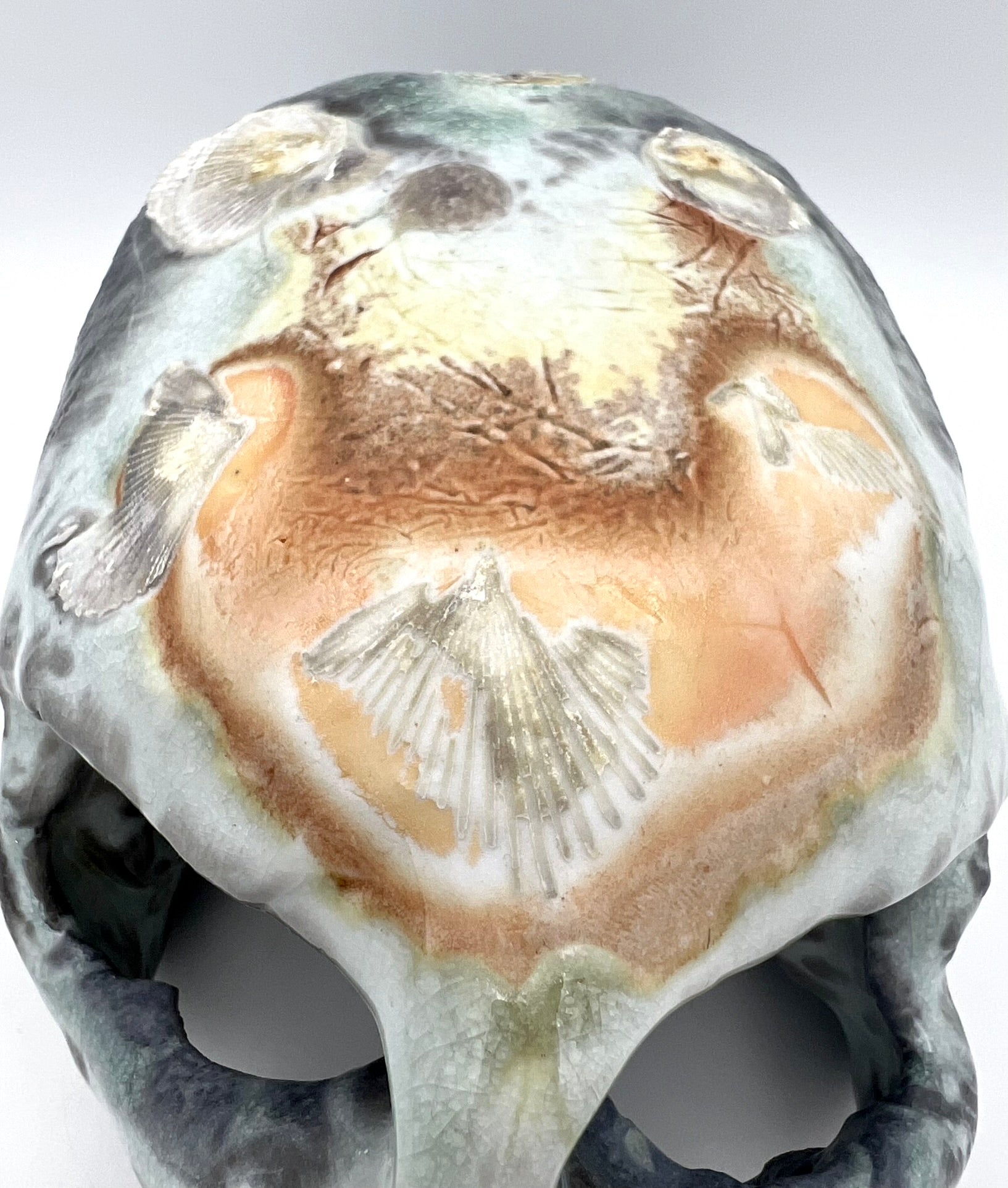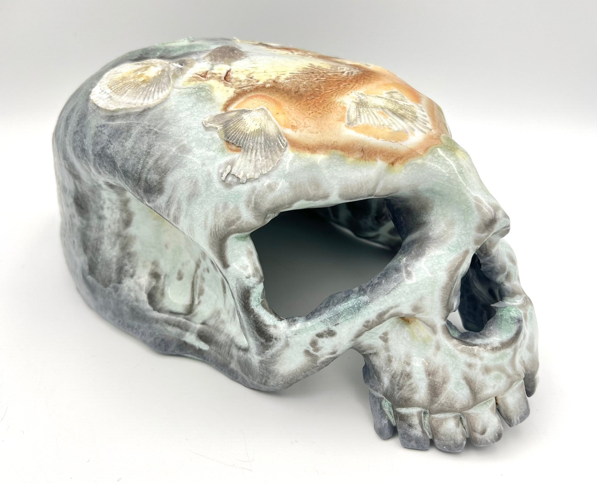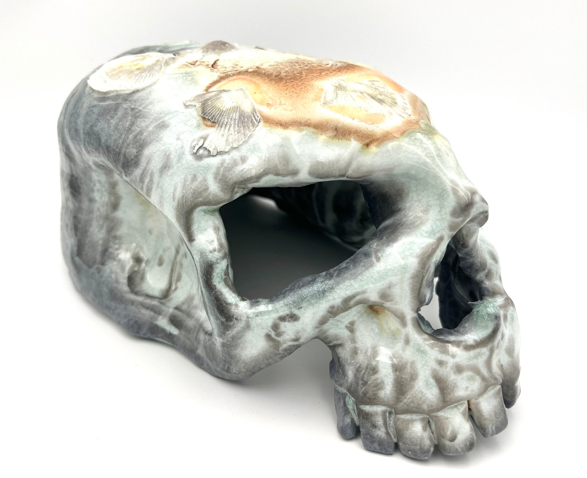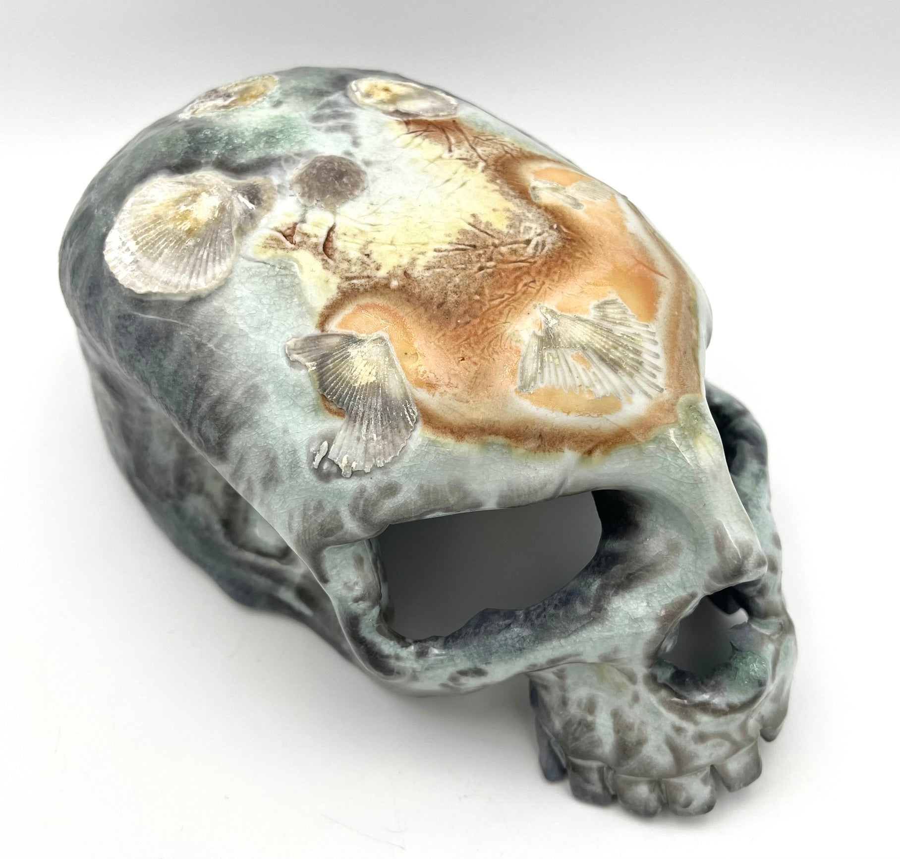 This skull was thrown on the potters wheel of NZ clay. When it hardened up a little, I used a harp wire tool to carve out the shape. Then I fashioned teeth with a fettling knife. It was fired upside-down on seashells in the front of an anagama for many days. This artifact measures 5"x 5.5"x 11".
