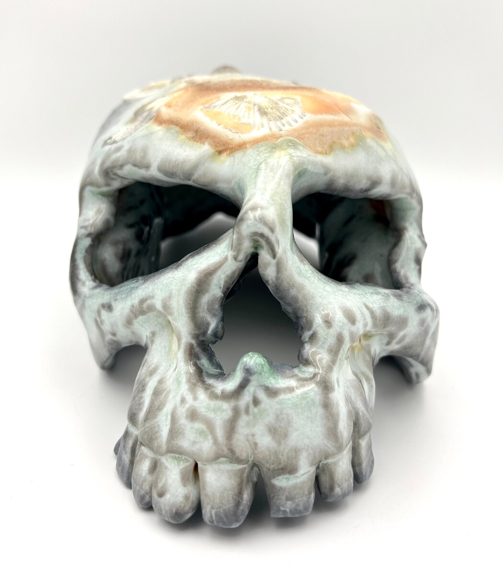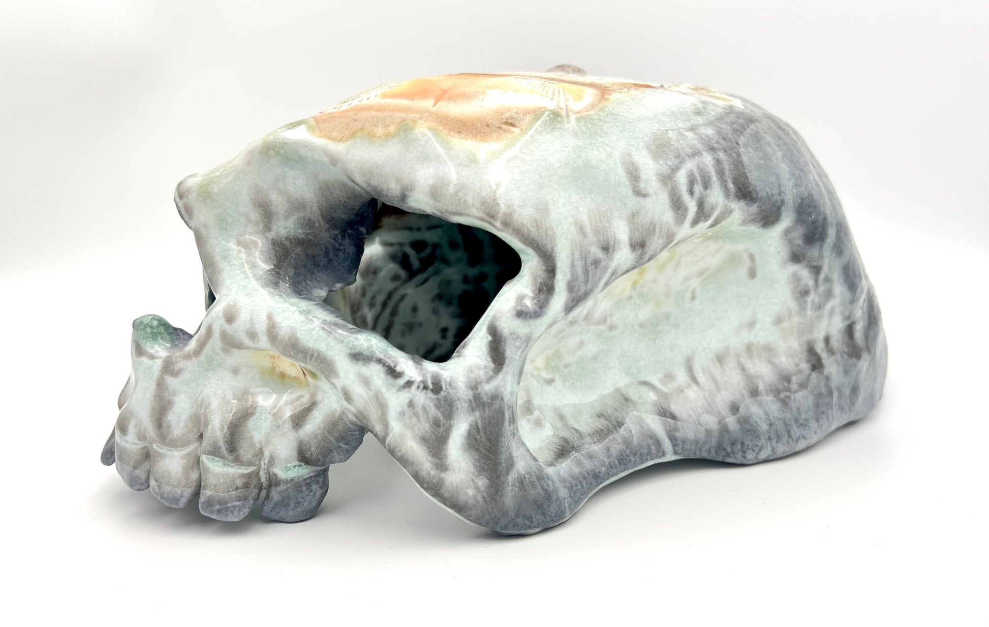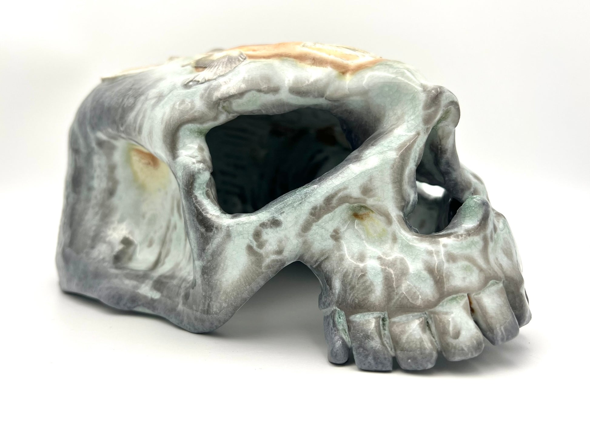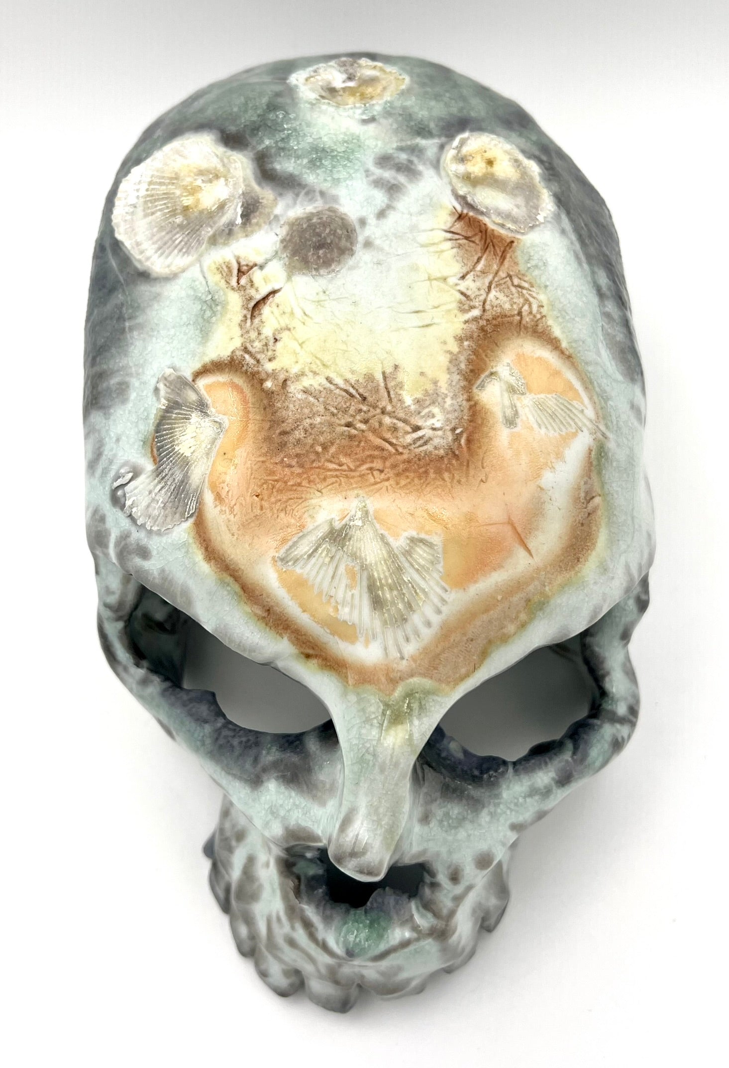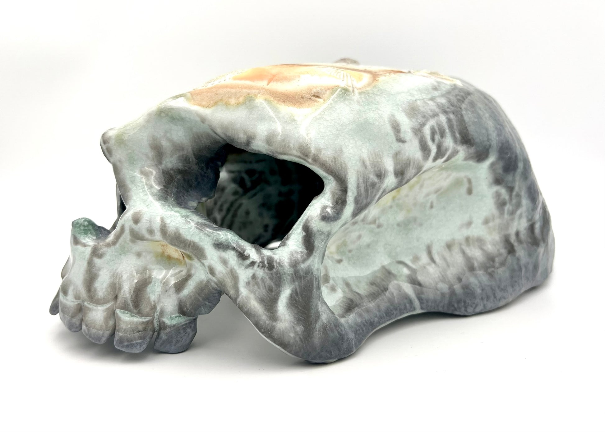This skull was thrown on the potters wheel of NZ clay. When it hardened up a little, I used a harp wire tool to carve out the shape. Then I fashioned teeth with a fettling knife. It was fired upside-down on seashells in the front of an anagama for many days. This artifact measures 5"x 5.5"x 11".