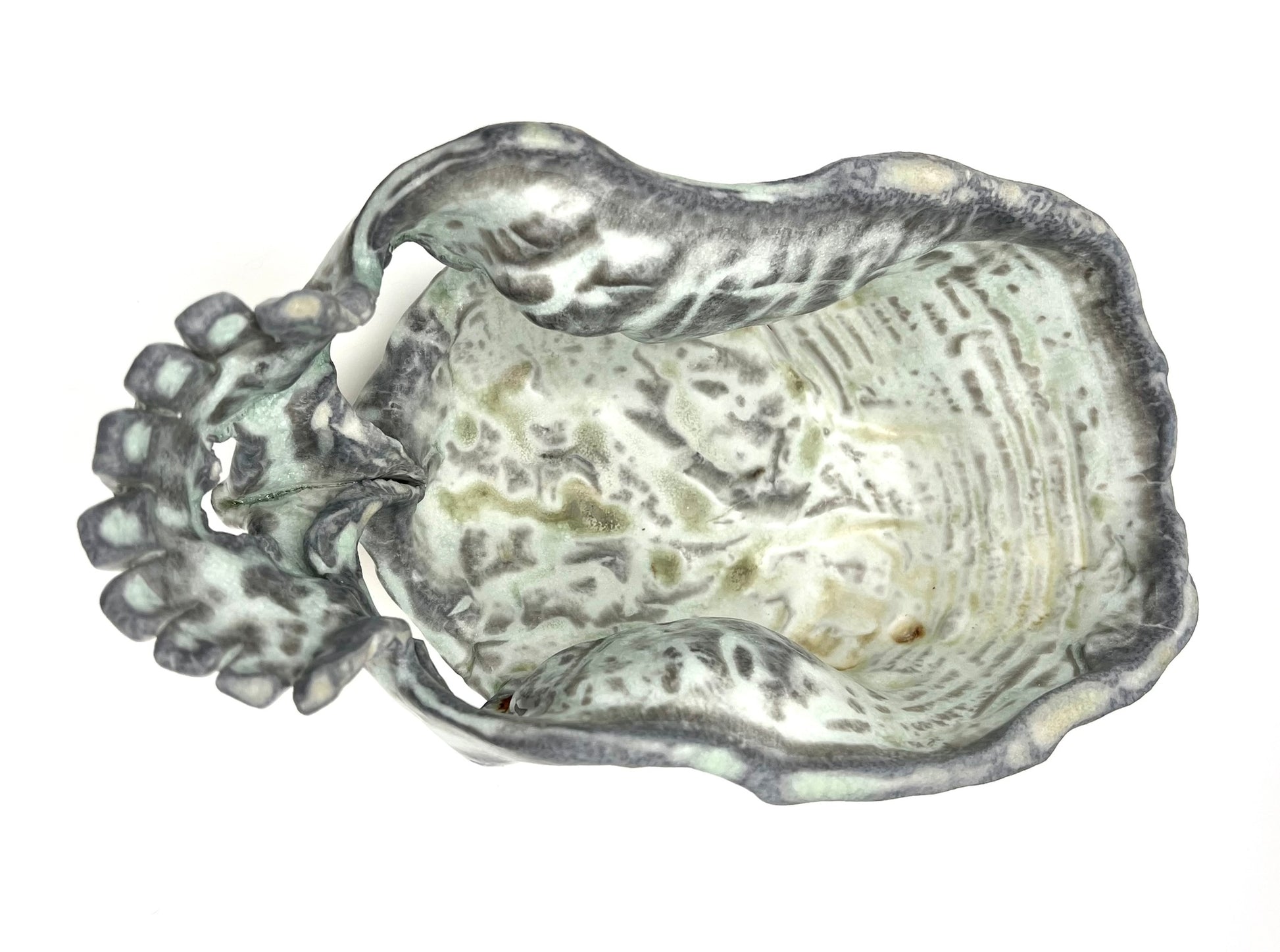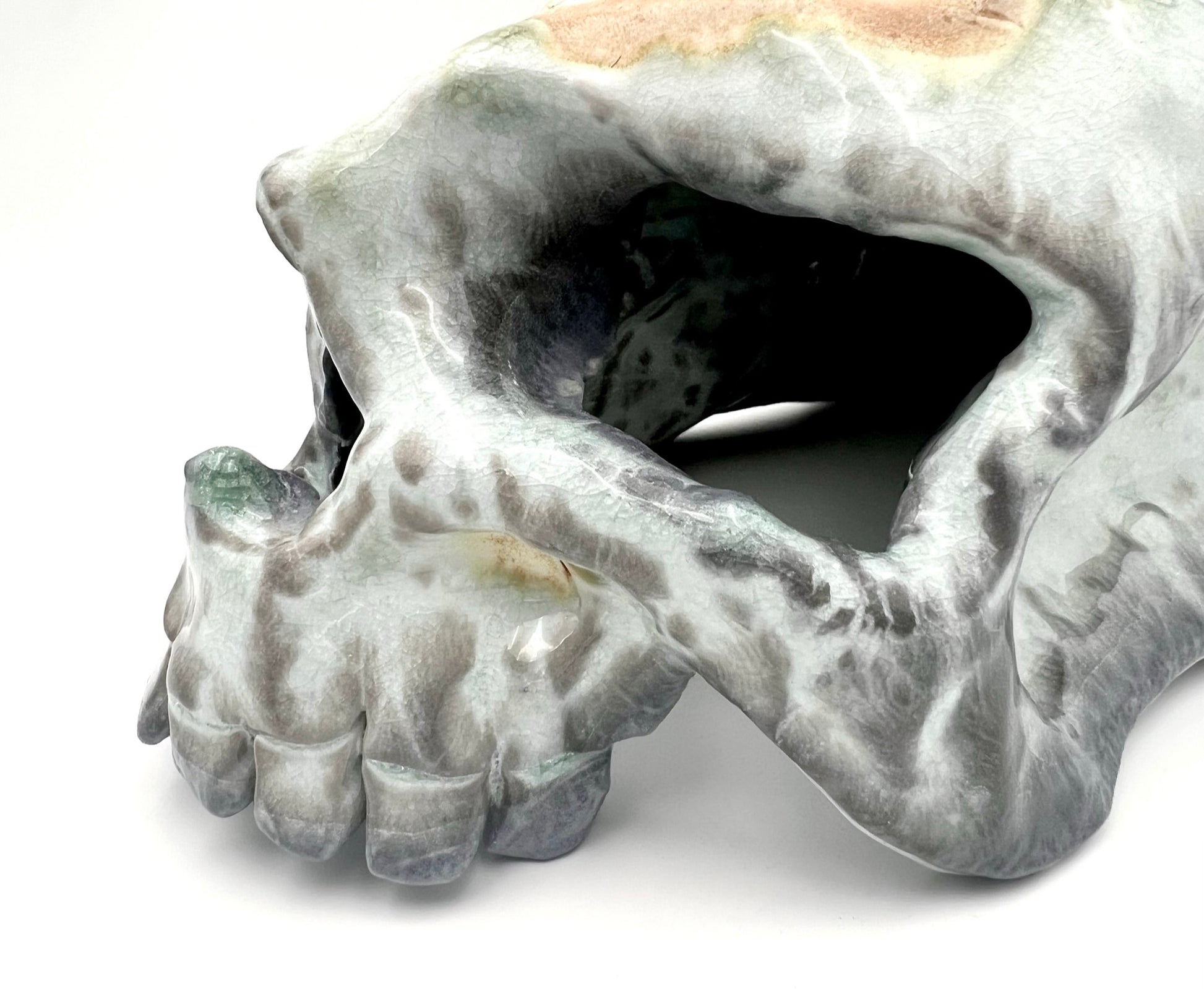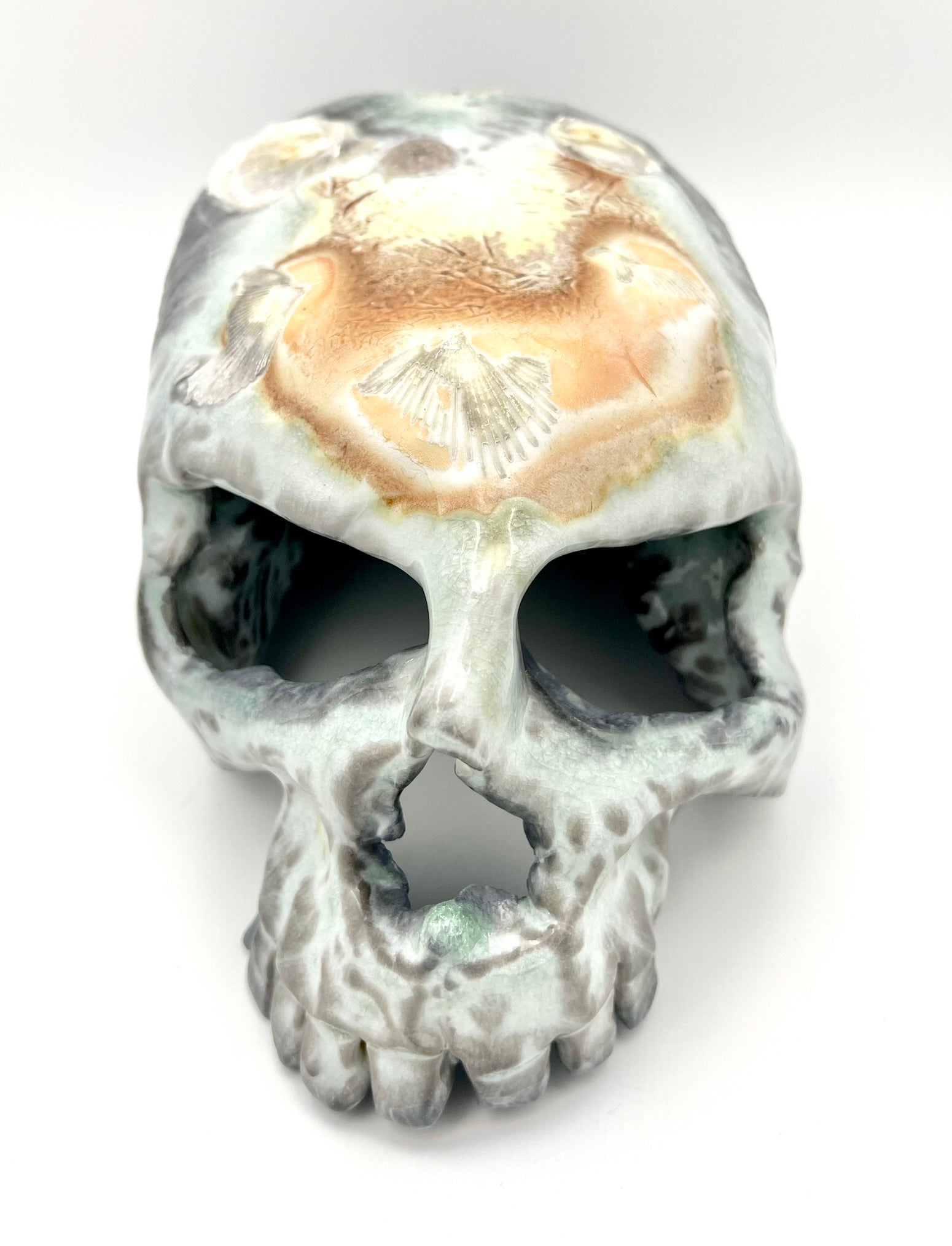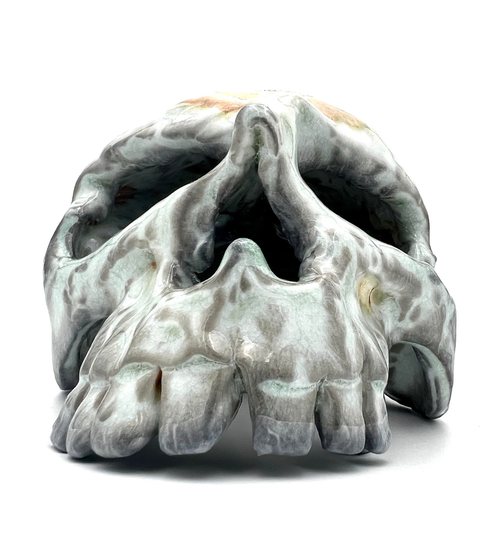 This skull was thrown on the potters wheel of NZ clay. When it hardened up a little, I used a harp wire tool to carve out the shape. Then I fashioned teeth with a fettling knife. It was fired upside-down on seashells in the front of an anagama for many days. This artifact measures 5"x 5.5"x 11".