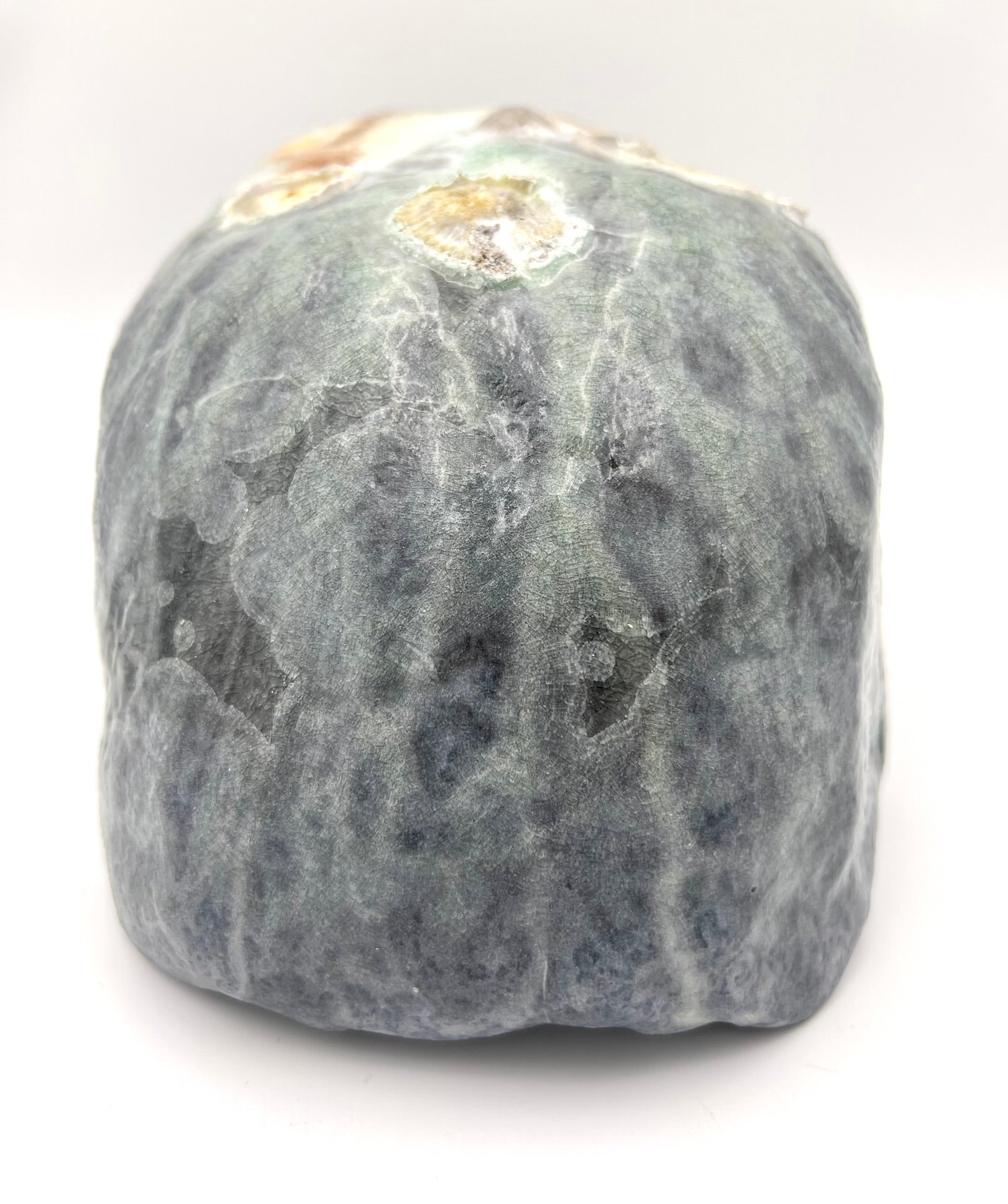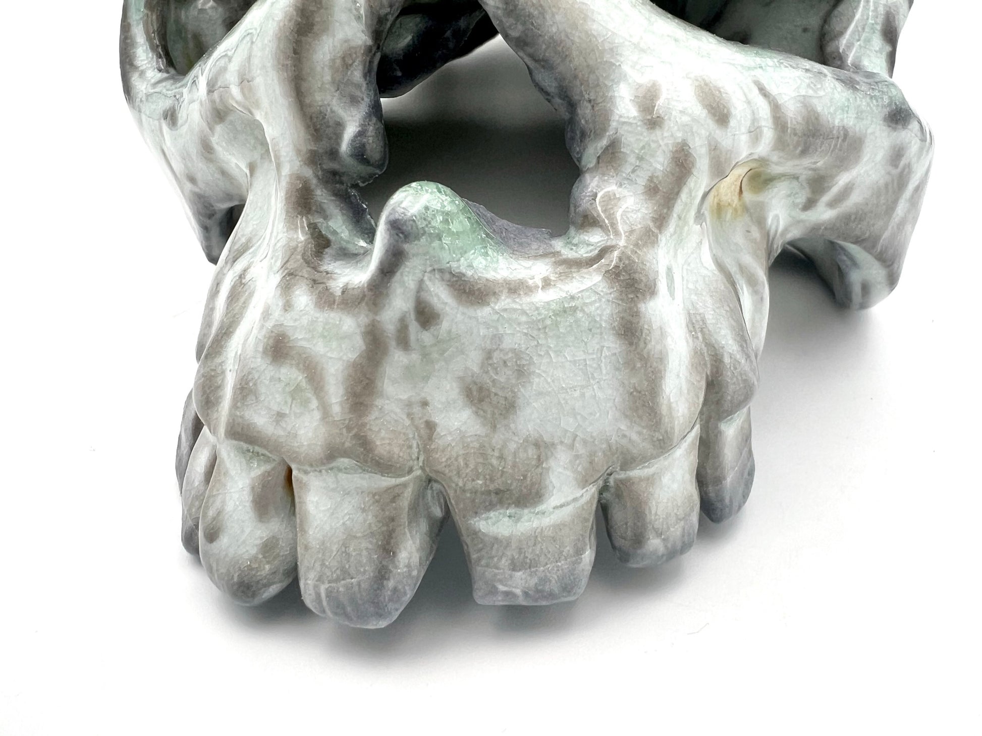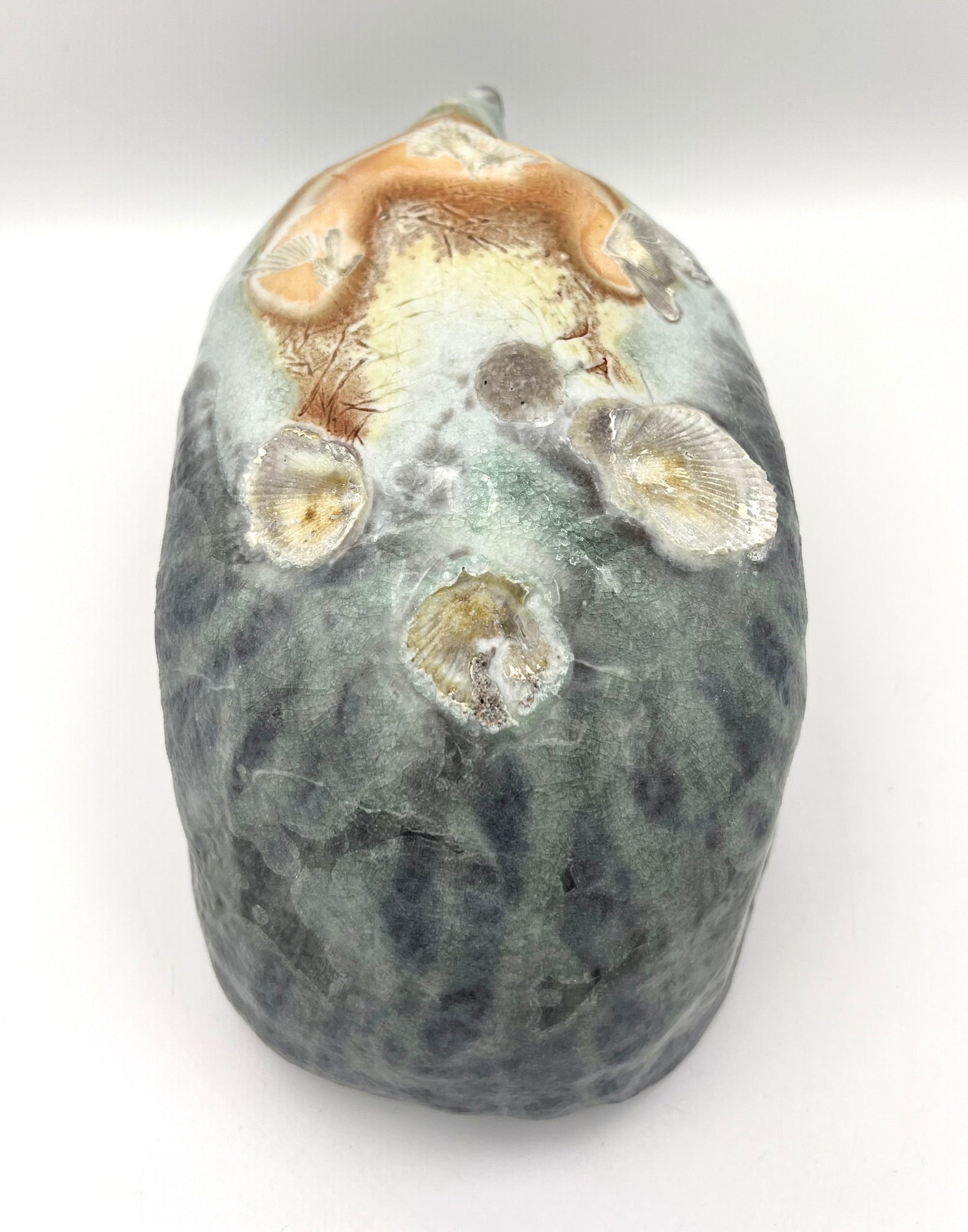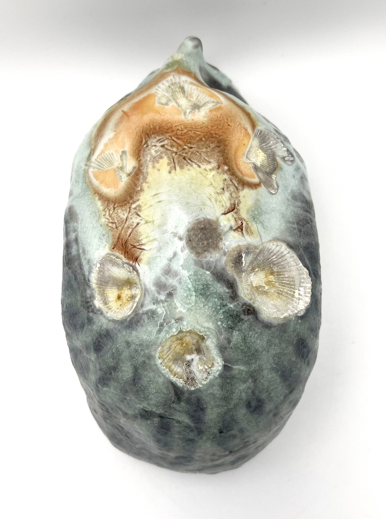 This skull was thrown on the potters wheel of NZ clay. When it hardened up a little, I used a harp wire tool to carve out the shape. Then I fashioned teeth with a fettling knife. It was fired upside-down on seashells in the front of an anagama for many days. This artifact measures 5"x 5.5"x 11".