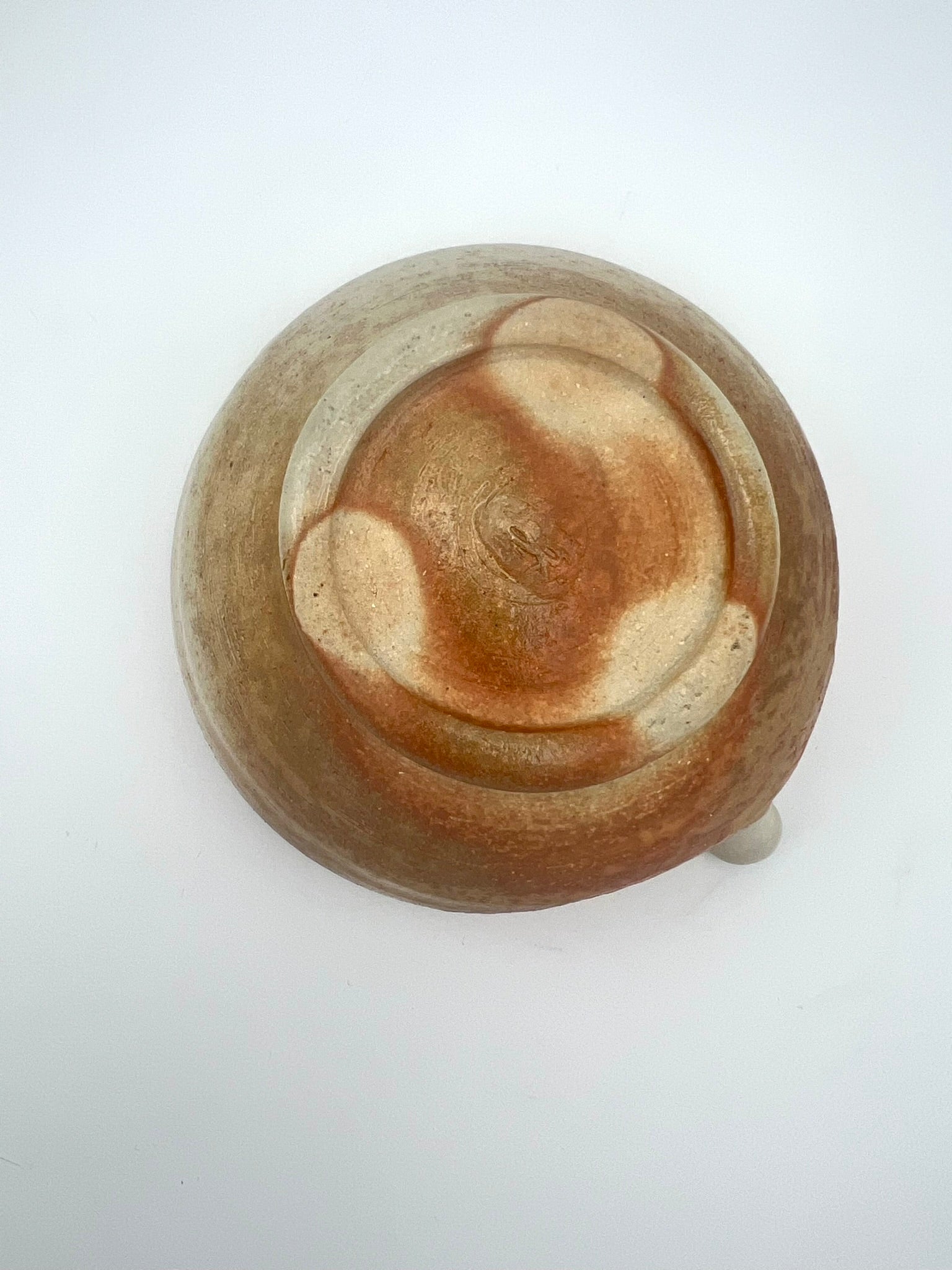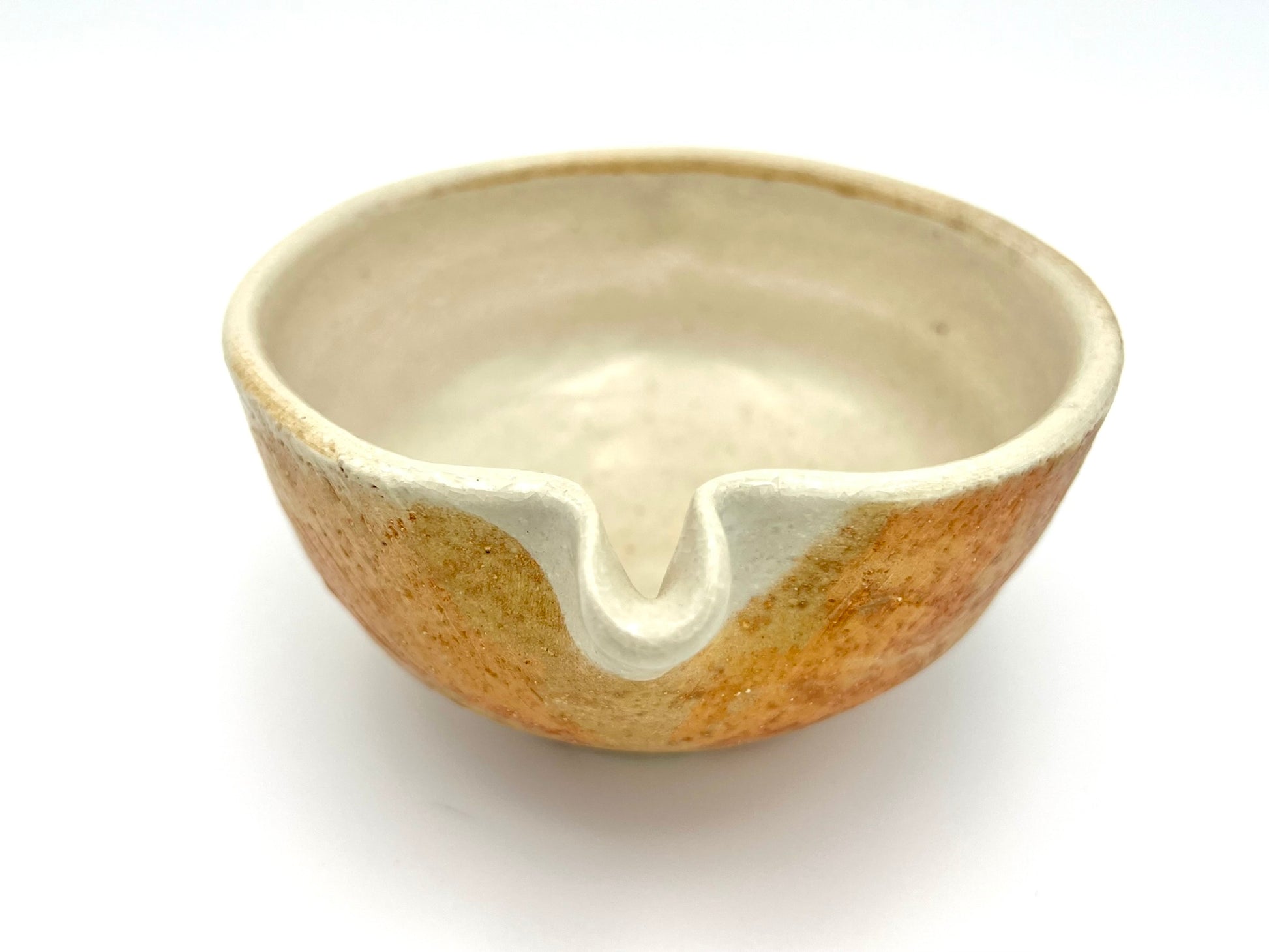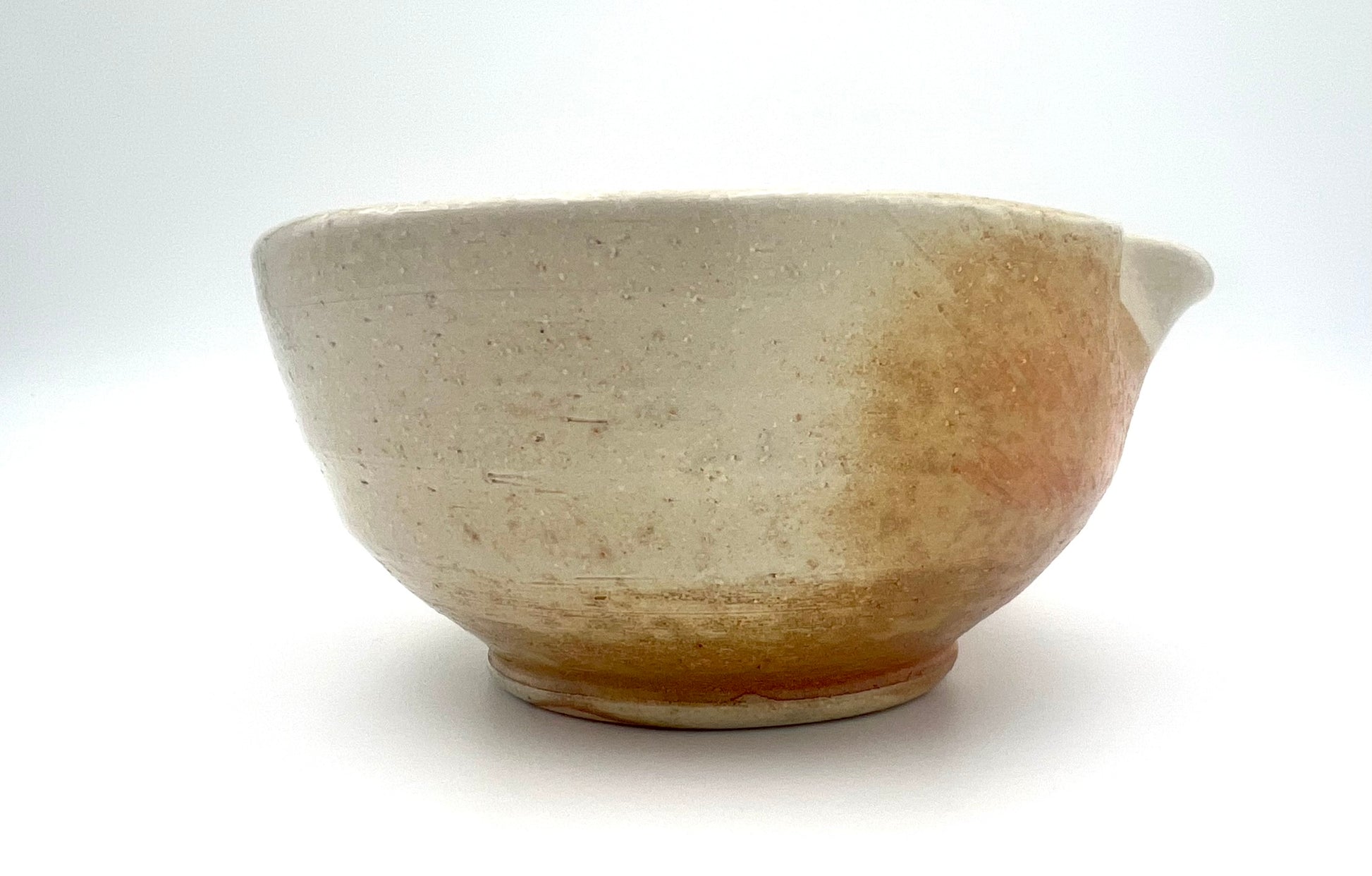 I threw this matcha pouring vessel on the potters wheel of Macnamee kaolin. I wedged molochite and 30 mesh silica sand into the clay body. It is lined in Penn State Shino. It was fired in the wood/soda kiln in Seabeck, WA. It measures 5 inches wide & 3 inches tall.