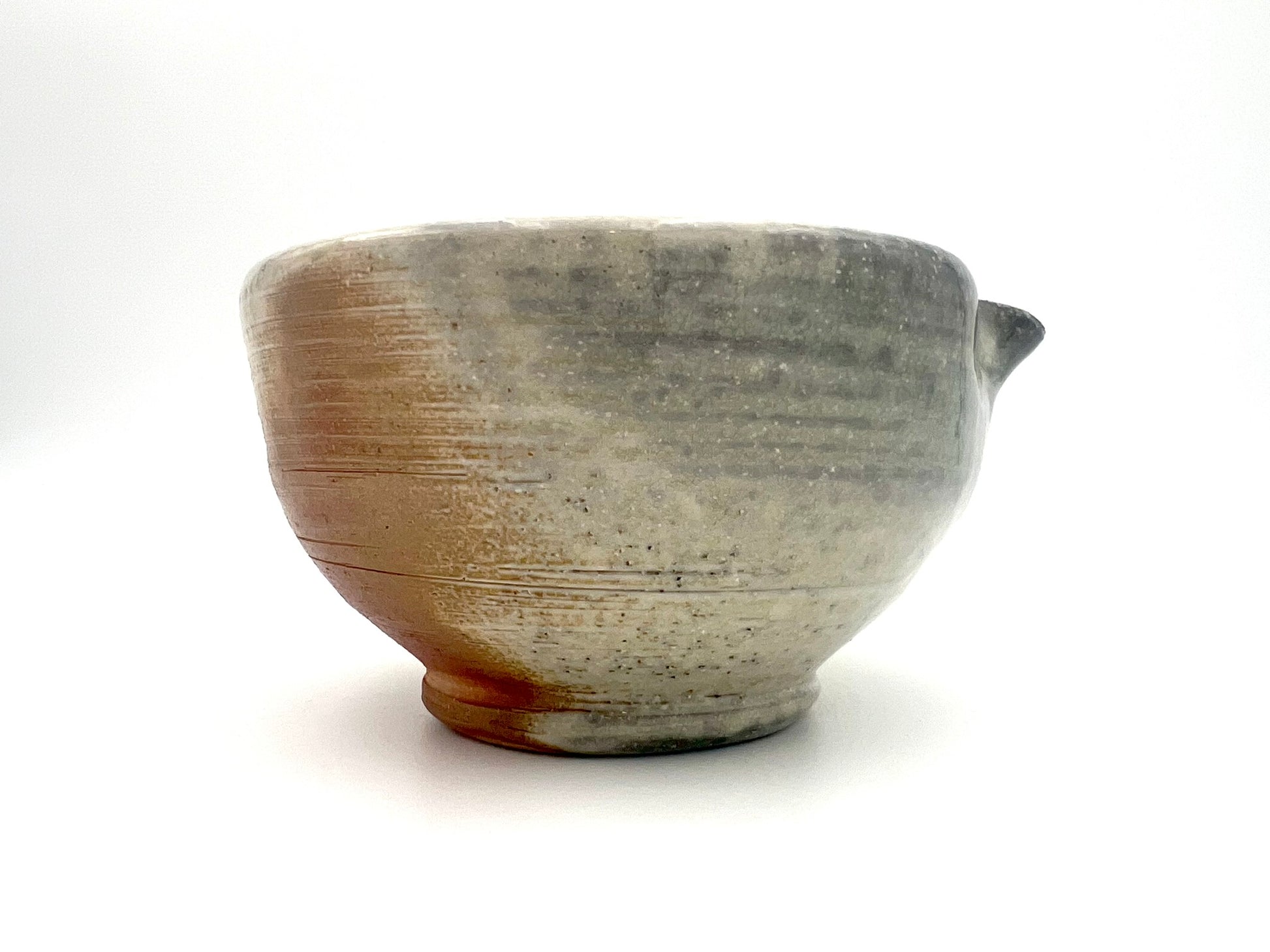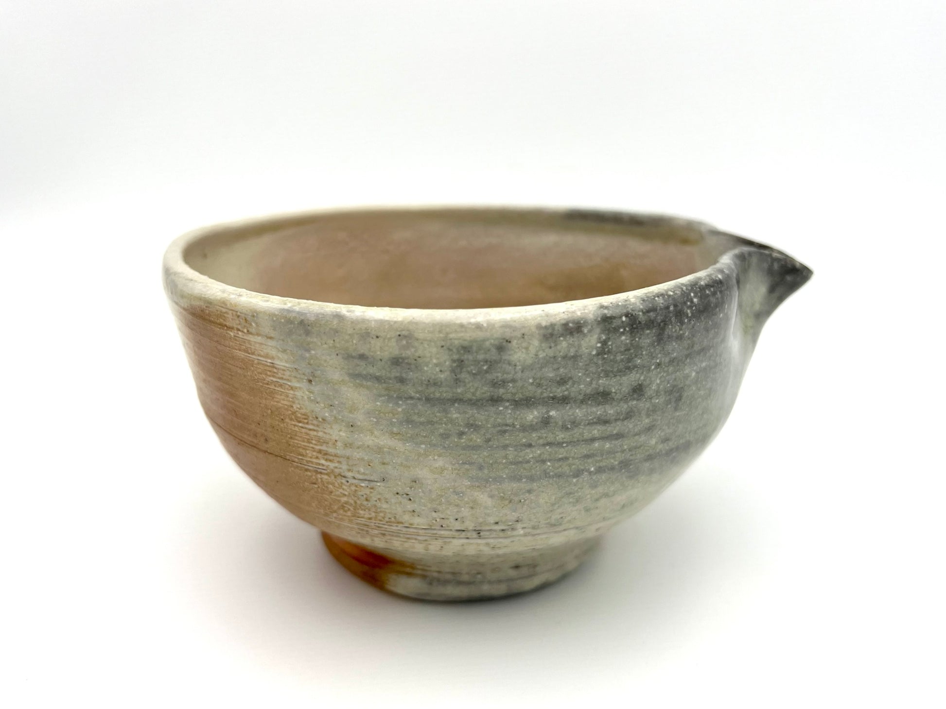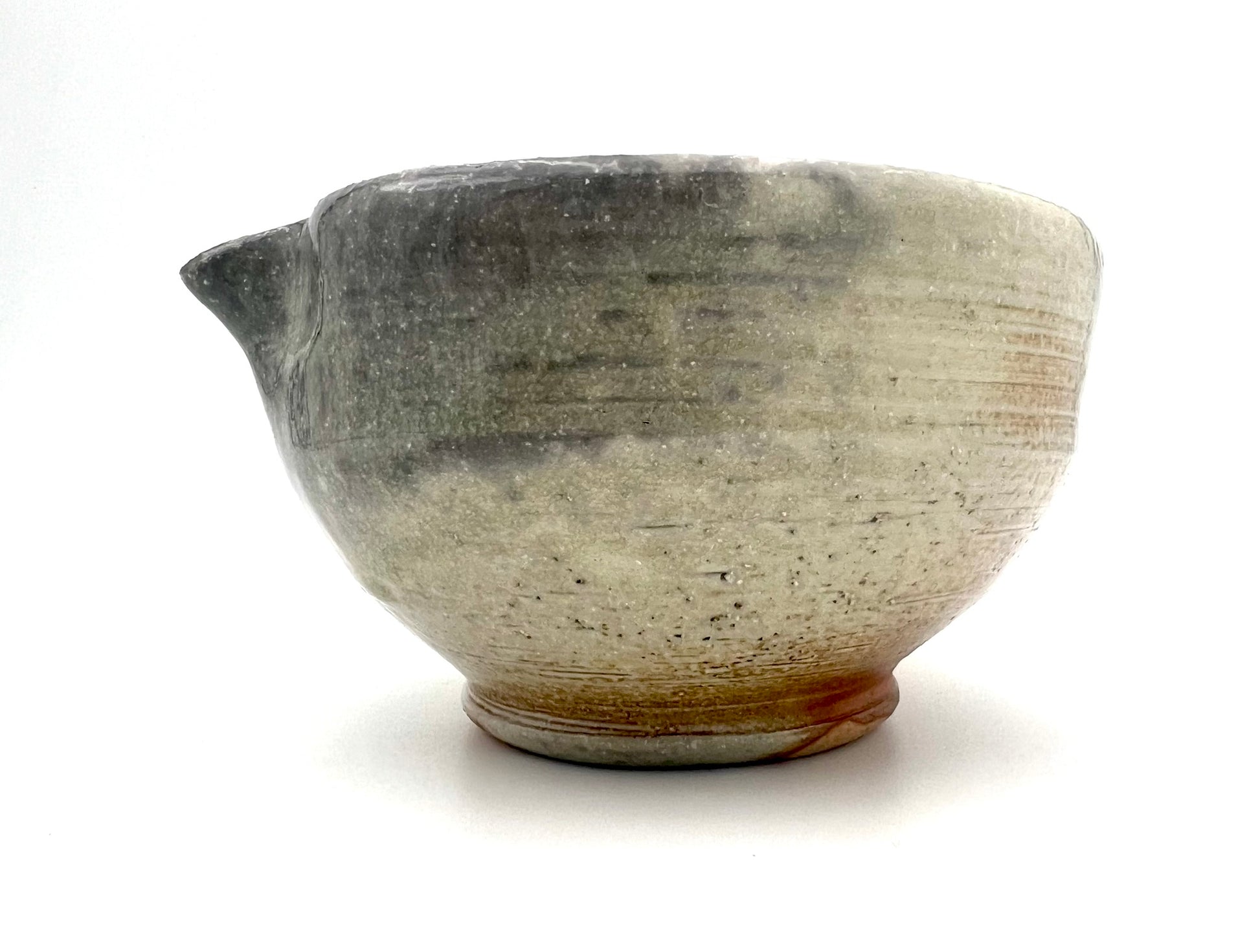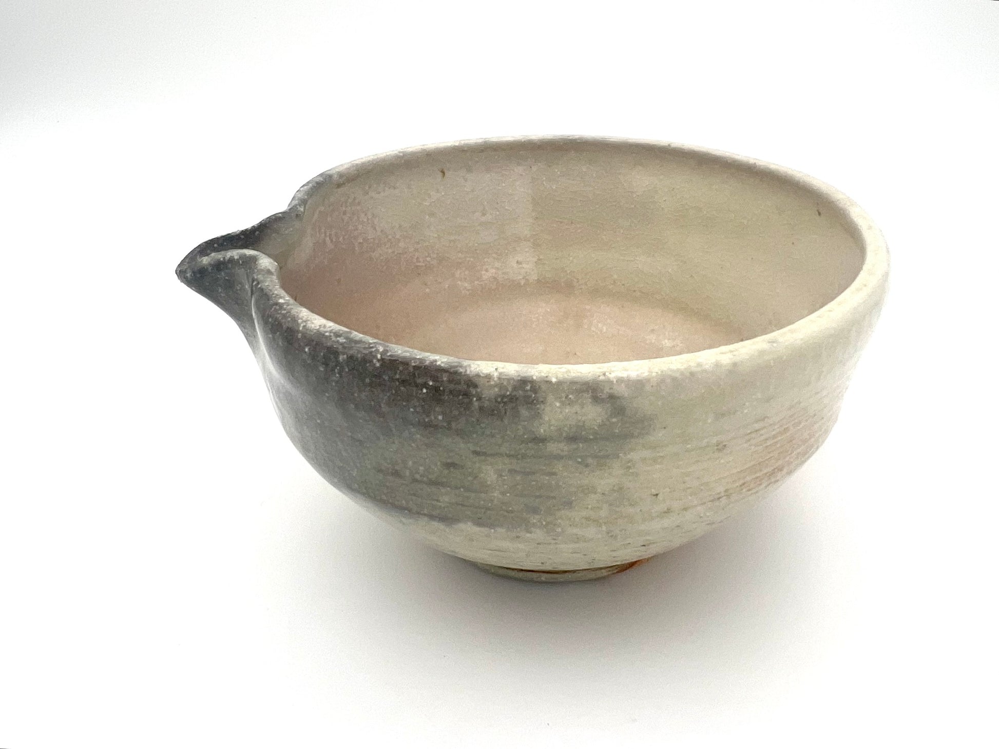 I threw this matcha pouring vessel on the potters wheel of Macnamee kaolin. I wedged molochite and 30 mesh silica sand into the clay body. It is lined in Penn State Shino. It was fired in the wood/soda kiln in Seabeck, WA. It measures 5 inches wide & 3.75 inches tall.
