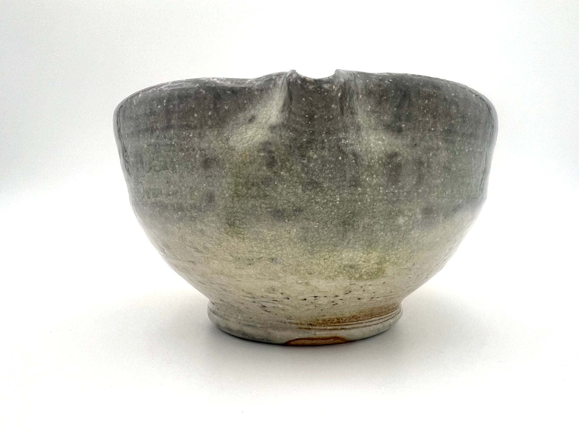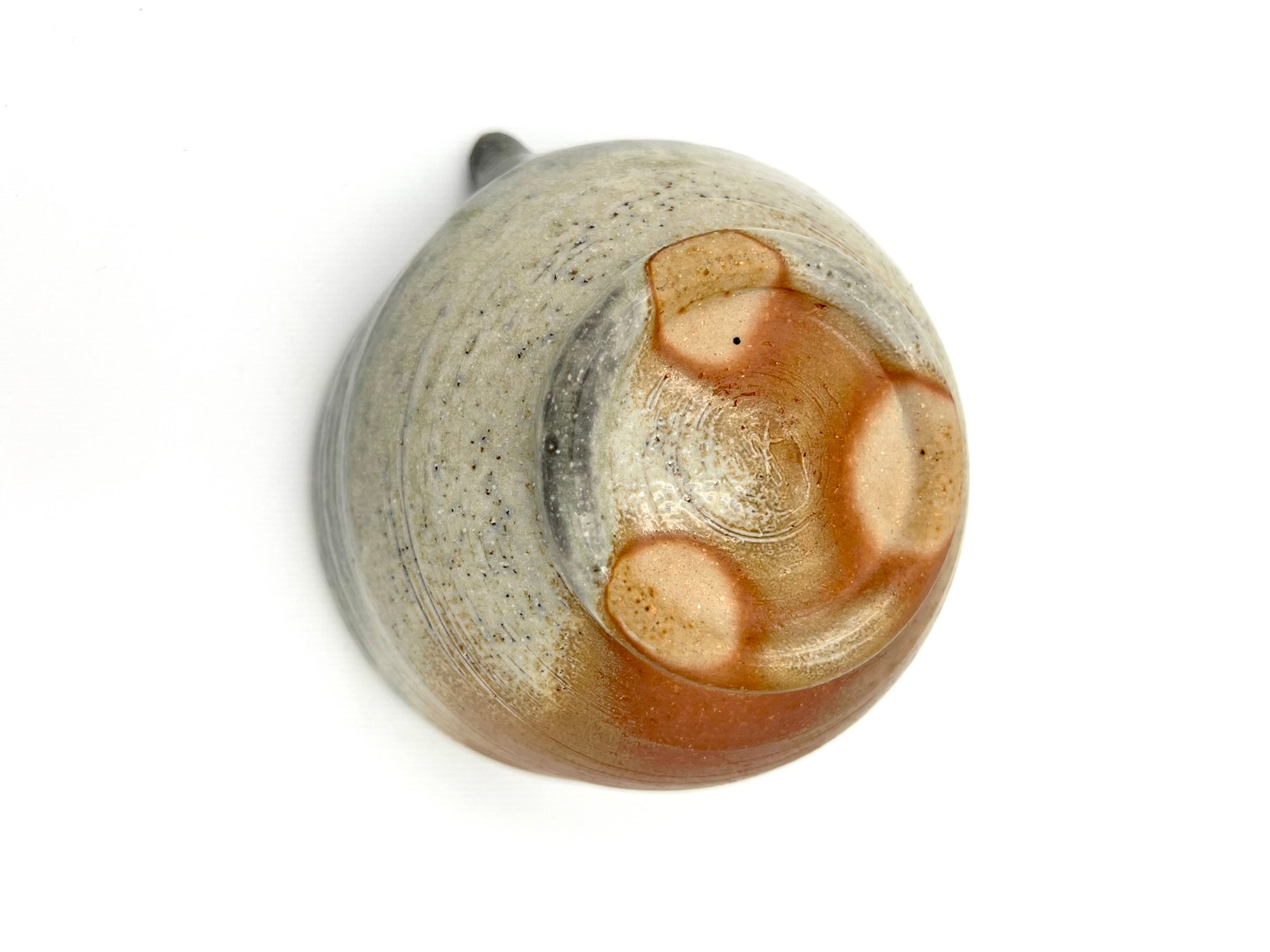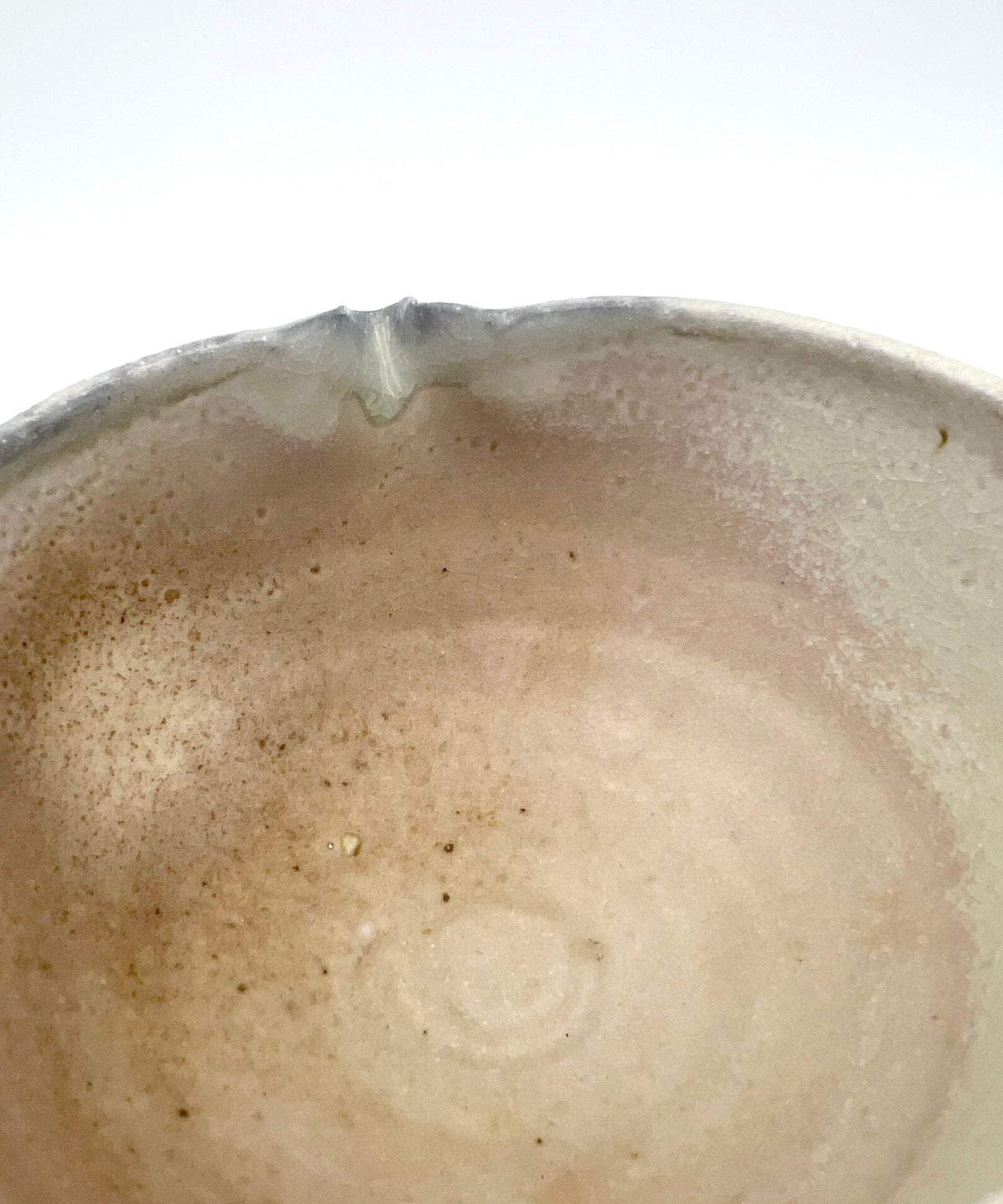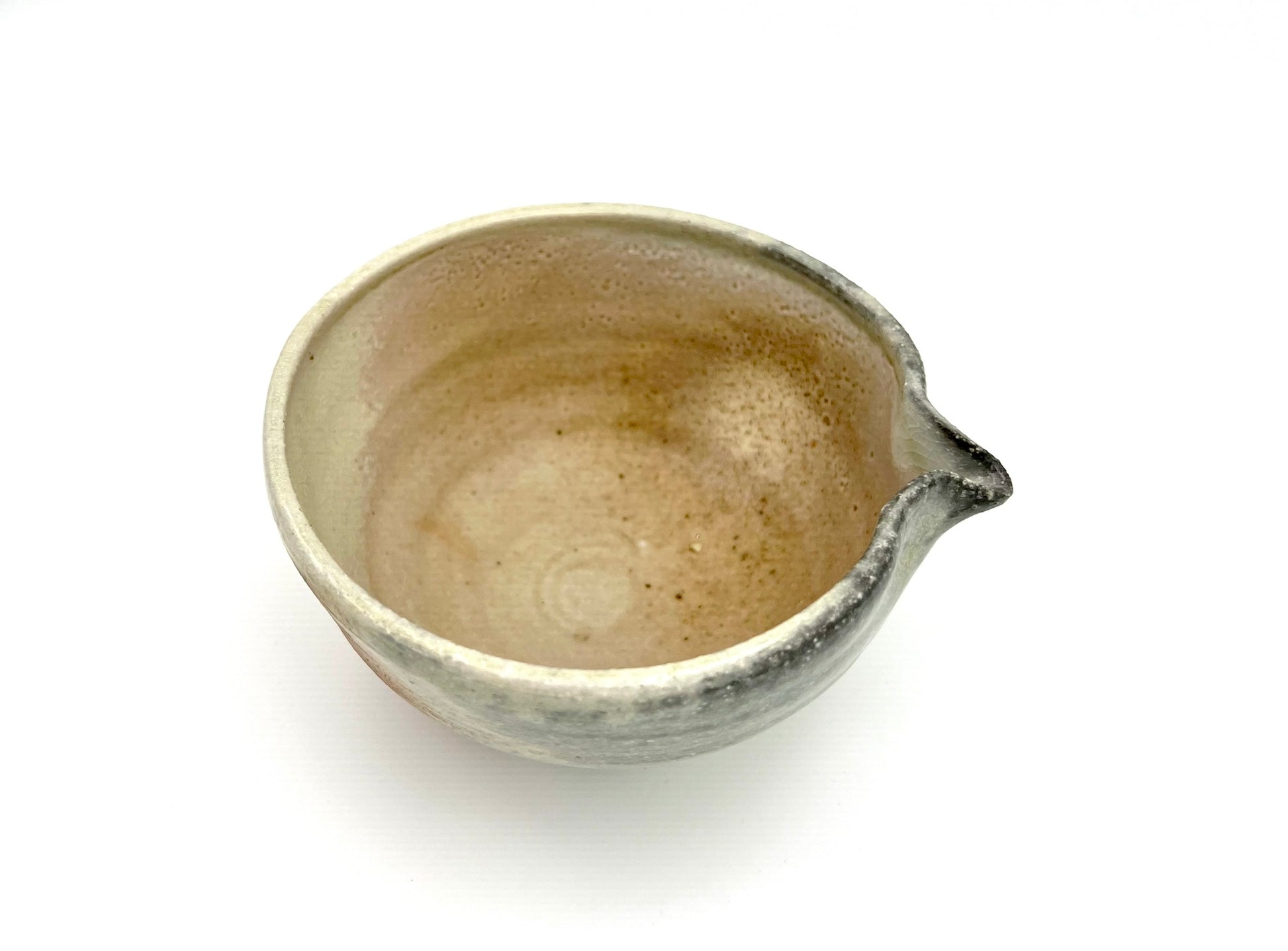 I threw this matcha pouring vessel on the potters wheel of Macnamee kaolin. I wedged molochite and 30 mesh silica sand into the clay body. It is lined in Penn State Shino. It was fired in the wood/soda kiln in Seabeck, WA. It measures 5 inches wide & 3.75 inches tall.