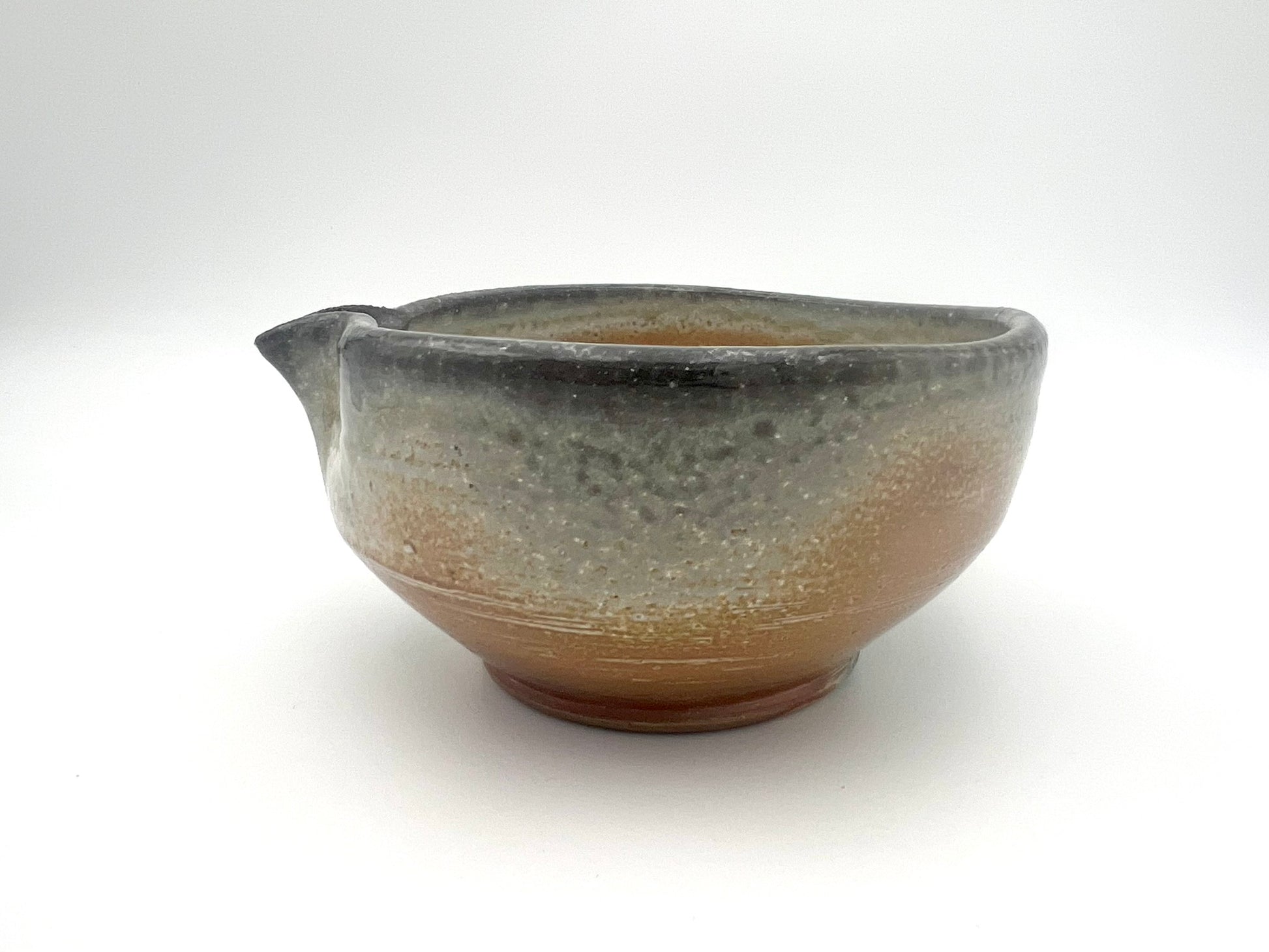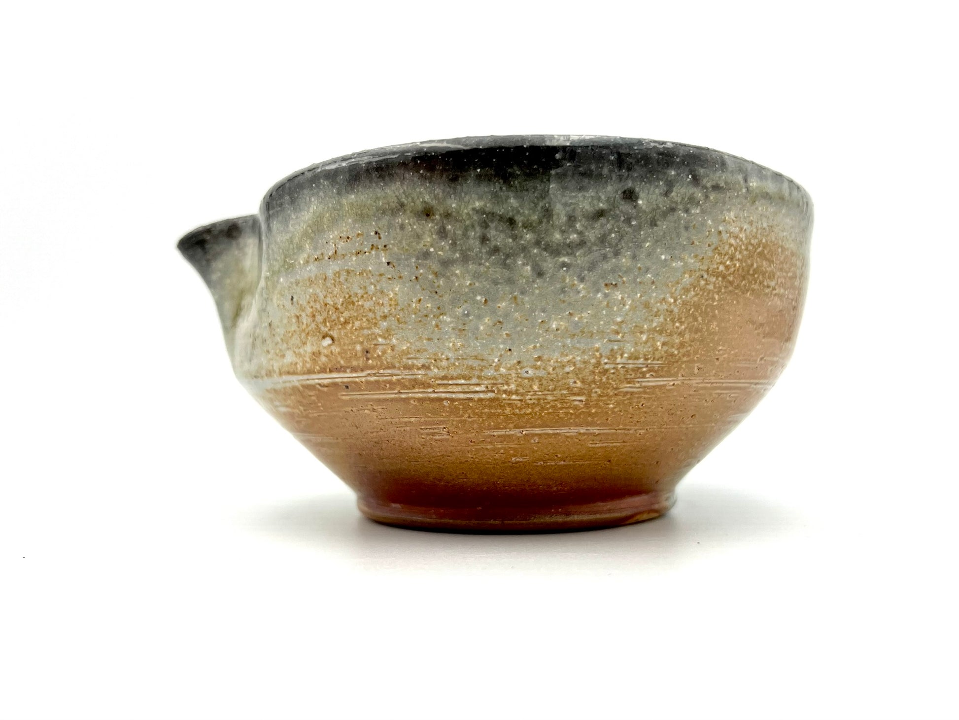 I threw this matcha pouring vessel on the potters wheel of Macnamee kaolin. I wedged molochite and 30 mesh silica sand into the clay body. It is lined in Penn State Shino. It was fired in the wood/soda kiln in Seabeck, WA. It measures 5.5 inches wide & 3 inches tall.
