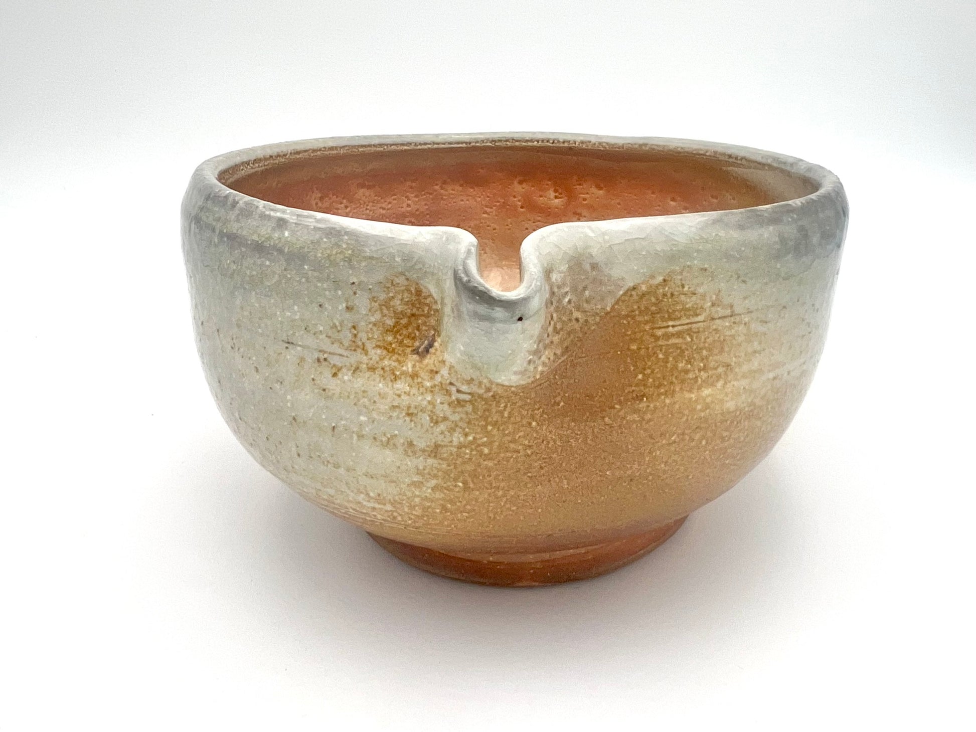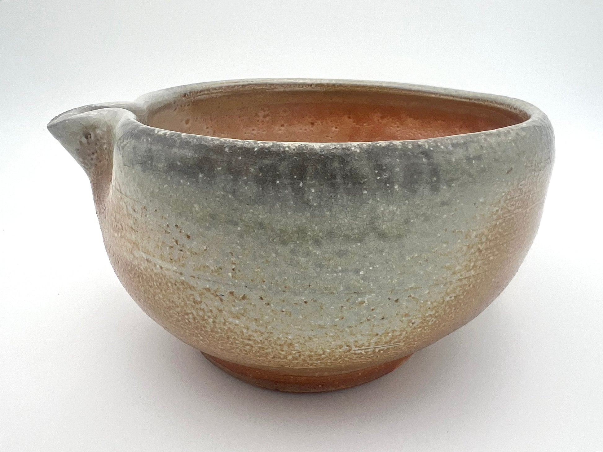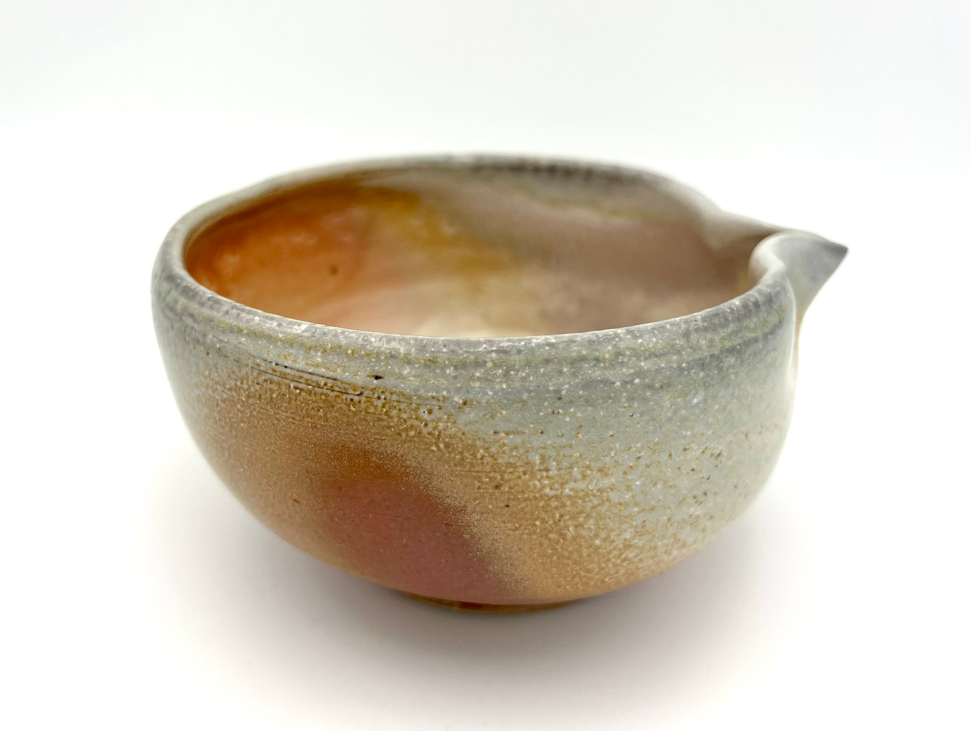 I threw this matcha pouring vessel on the potters wheel of Macnamee kaolin. I wedged molochite and 30 mesh silica sand into the clay body. It is lined in Penn State Shino. It was fired in the wood/soda kiln in Seabeck, WA. It measures 5.5 inches wide & 3 inches tall.