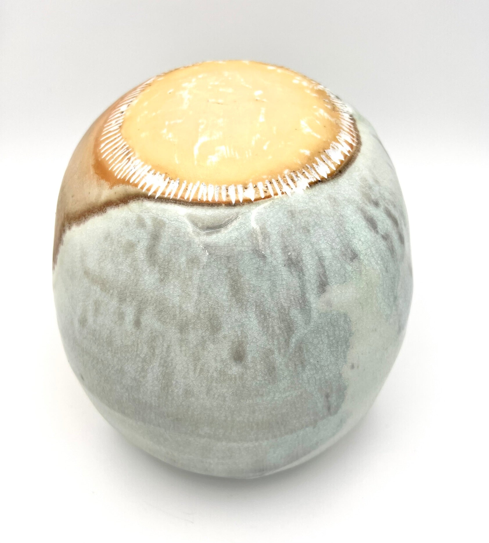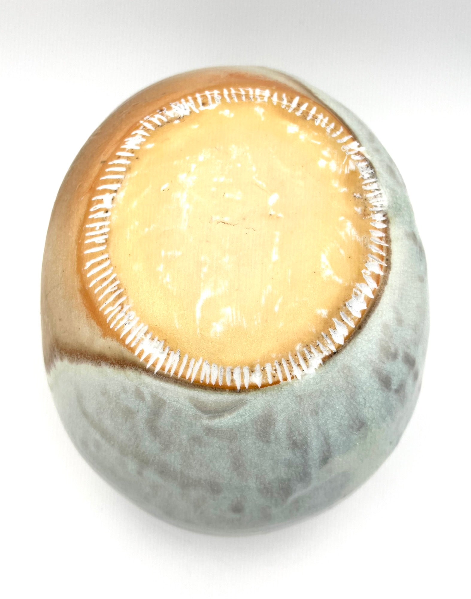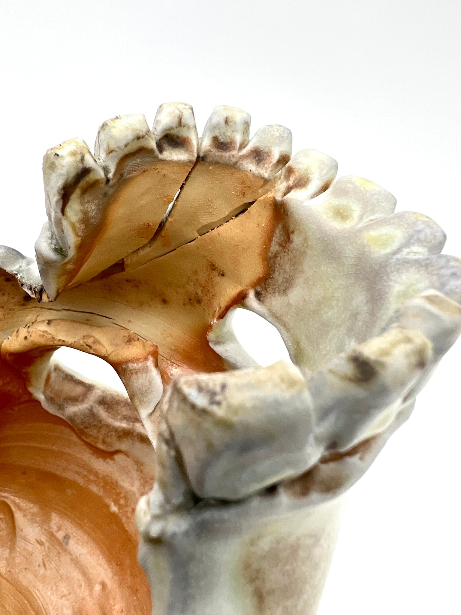 This skull was thrown on the potters wheel of NZ clay. When it hardened up a little, I used a harp wire tool to carve out the shape. Then I fashioned teeth with a fettling knife. It was fired upside-down in an anagama for many days. A Miracle of the woodfire ash was repairing a cracked upper mandible by fusing the pieces together from the outside. Skull measures 6"x 6"x 9".