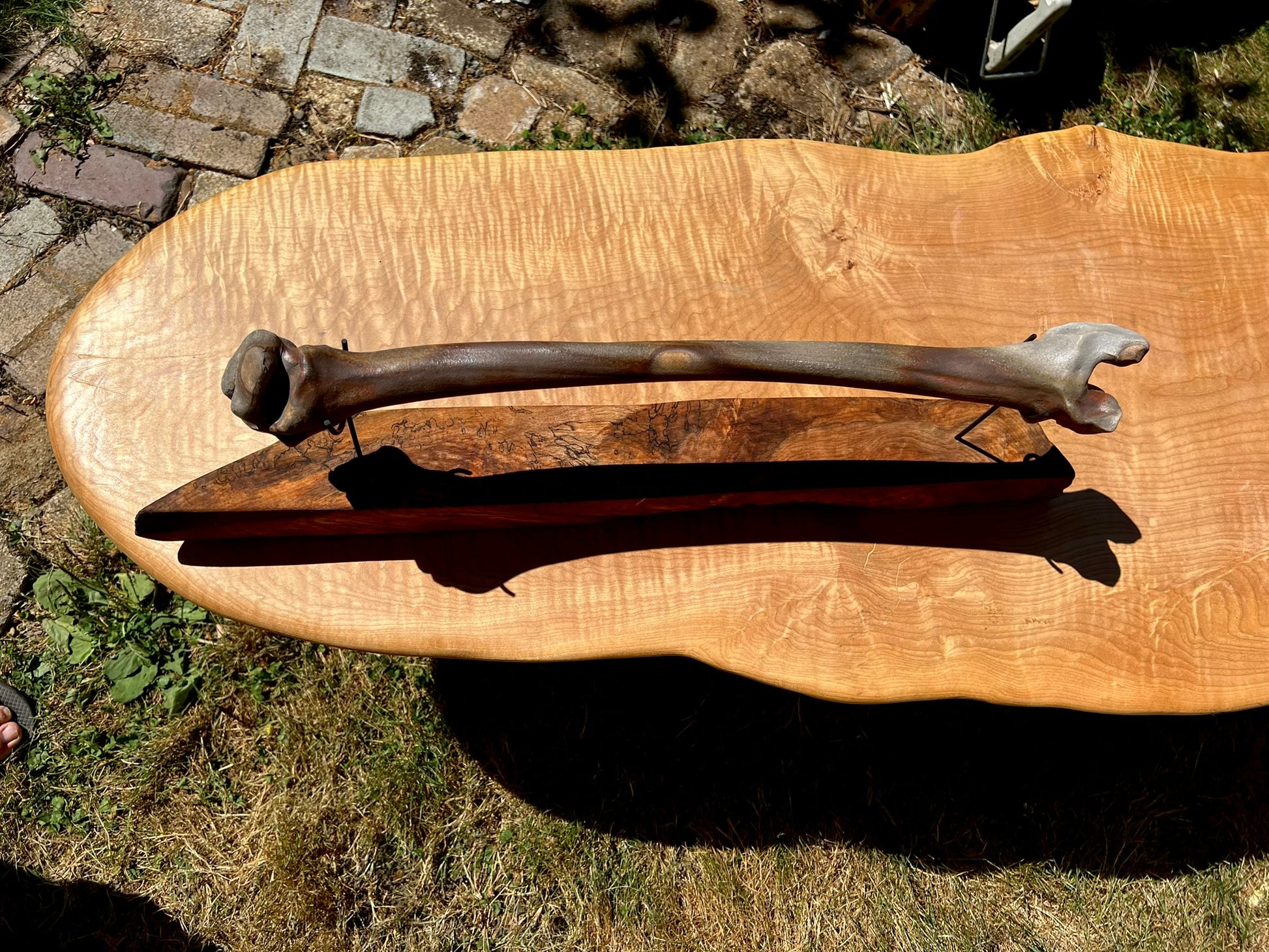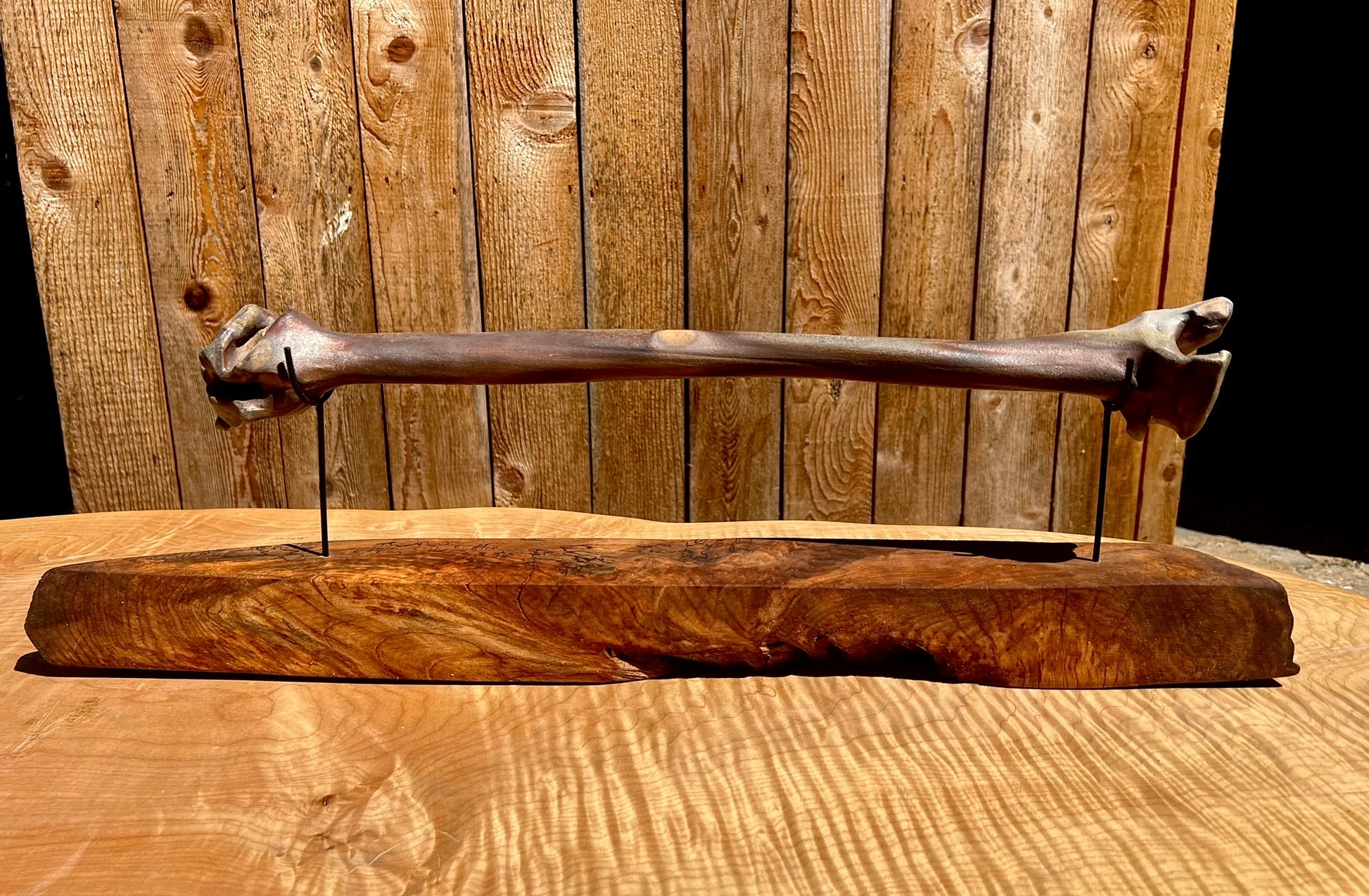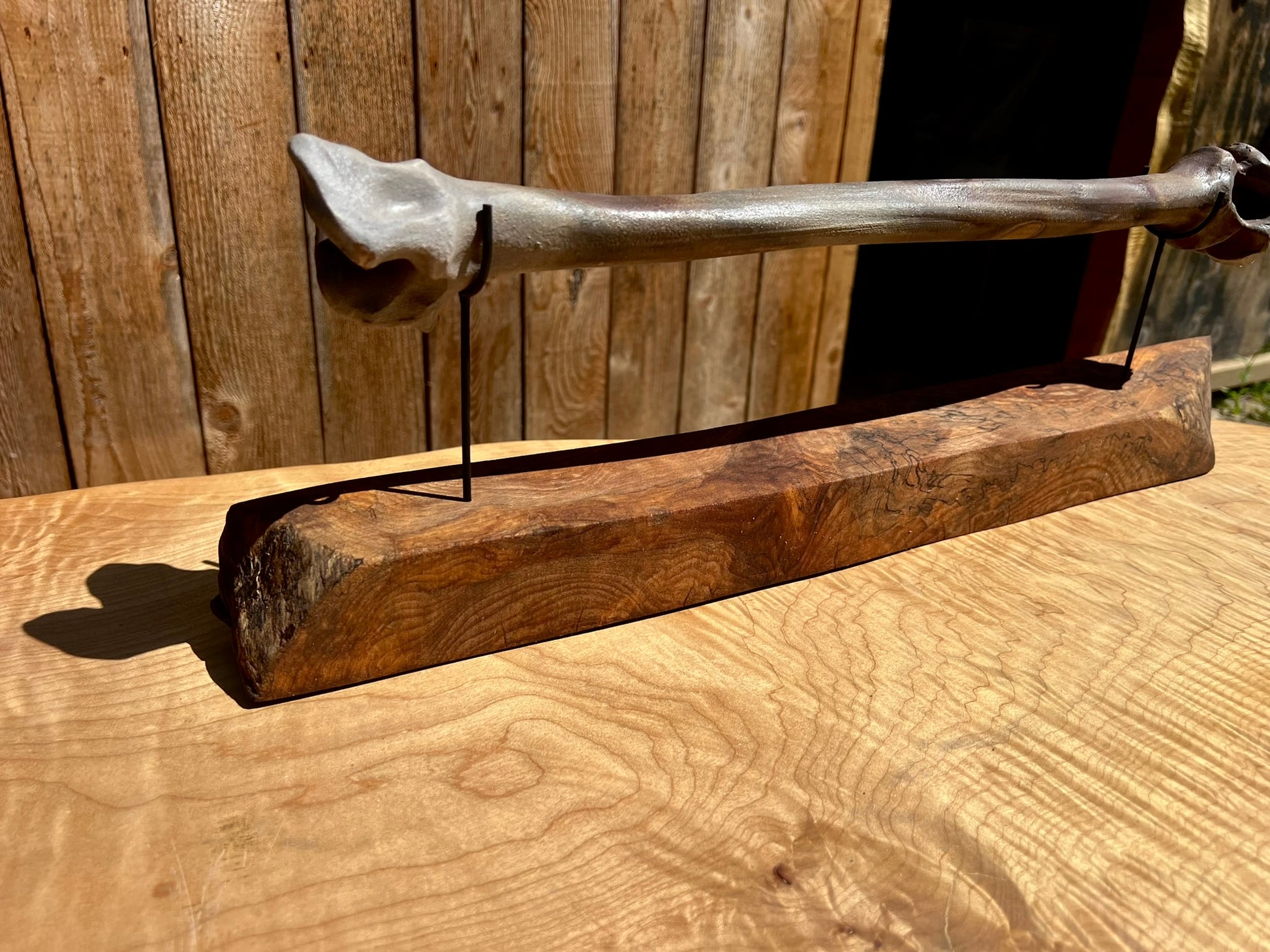 This bone is made of clay. It was fired in an anagama. I welded museum quality mounts and elevated this bone on a wooden plinth.