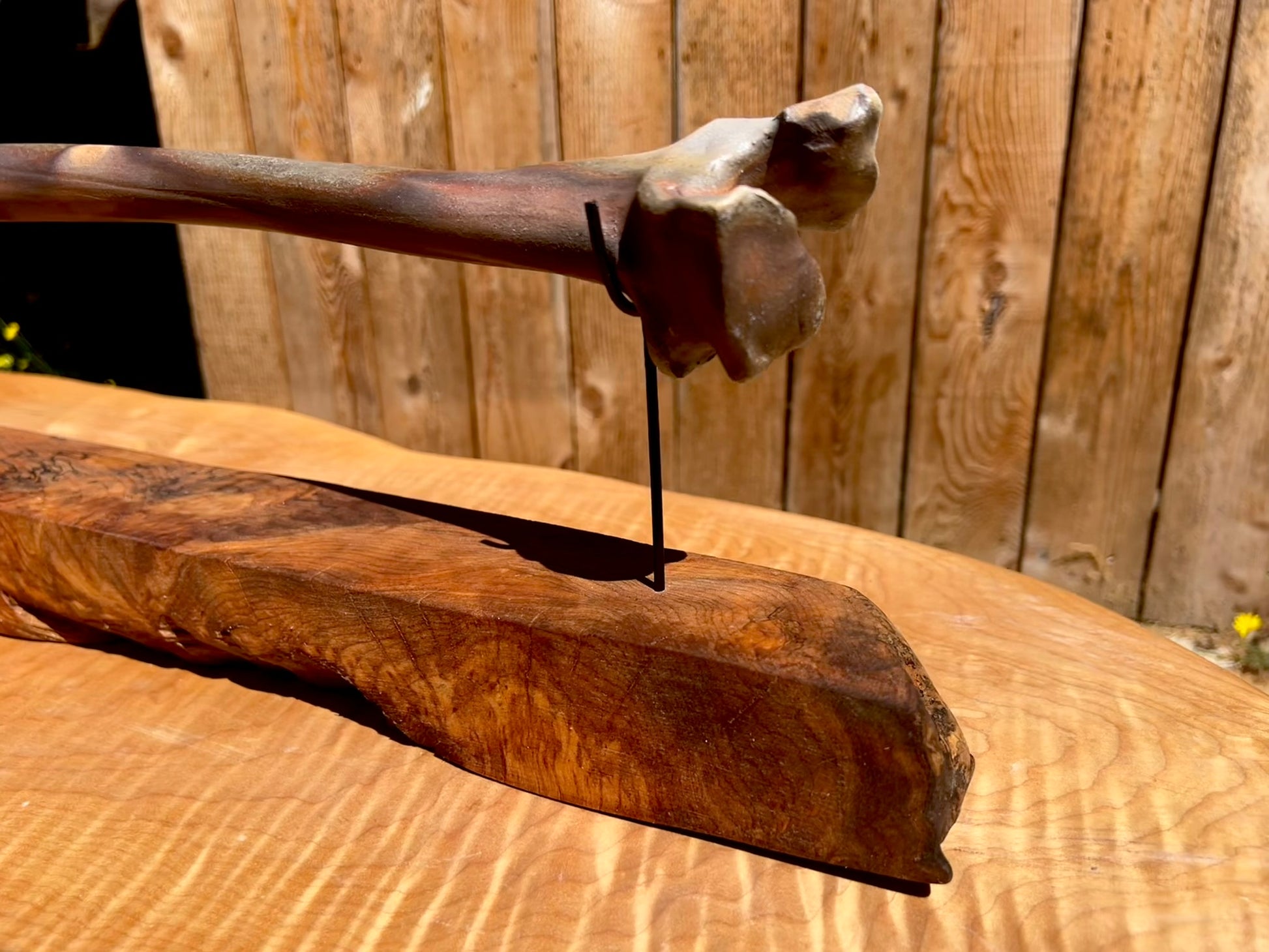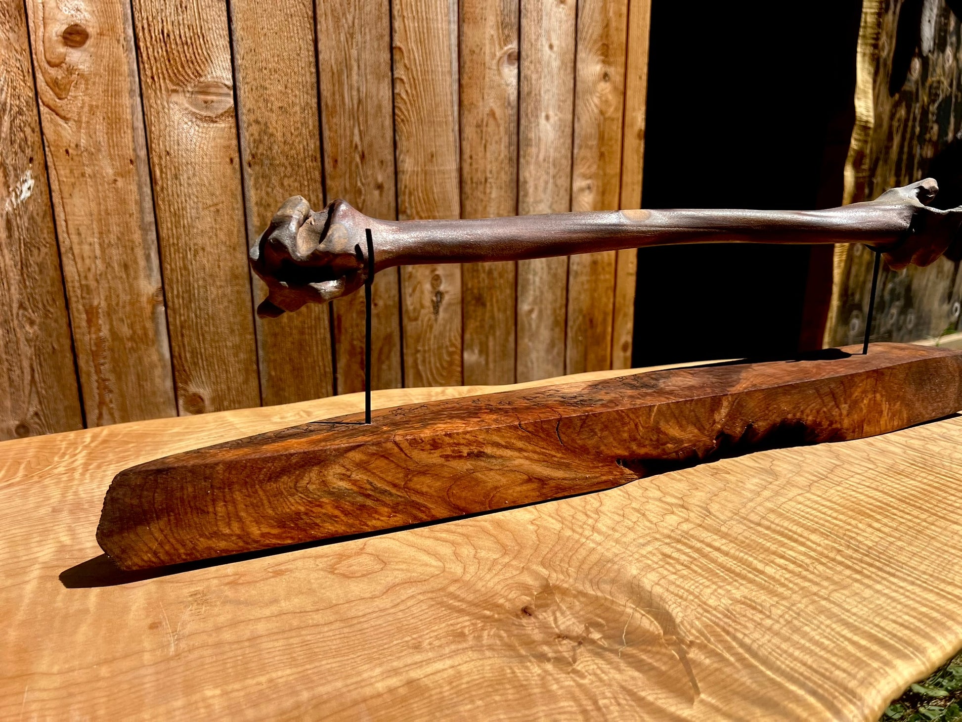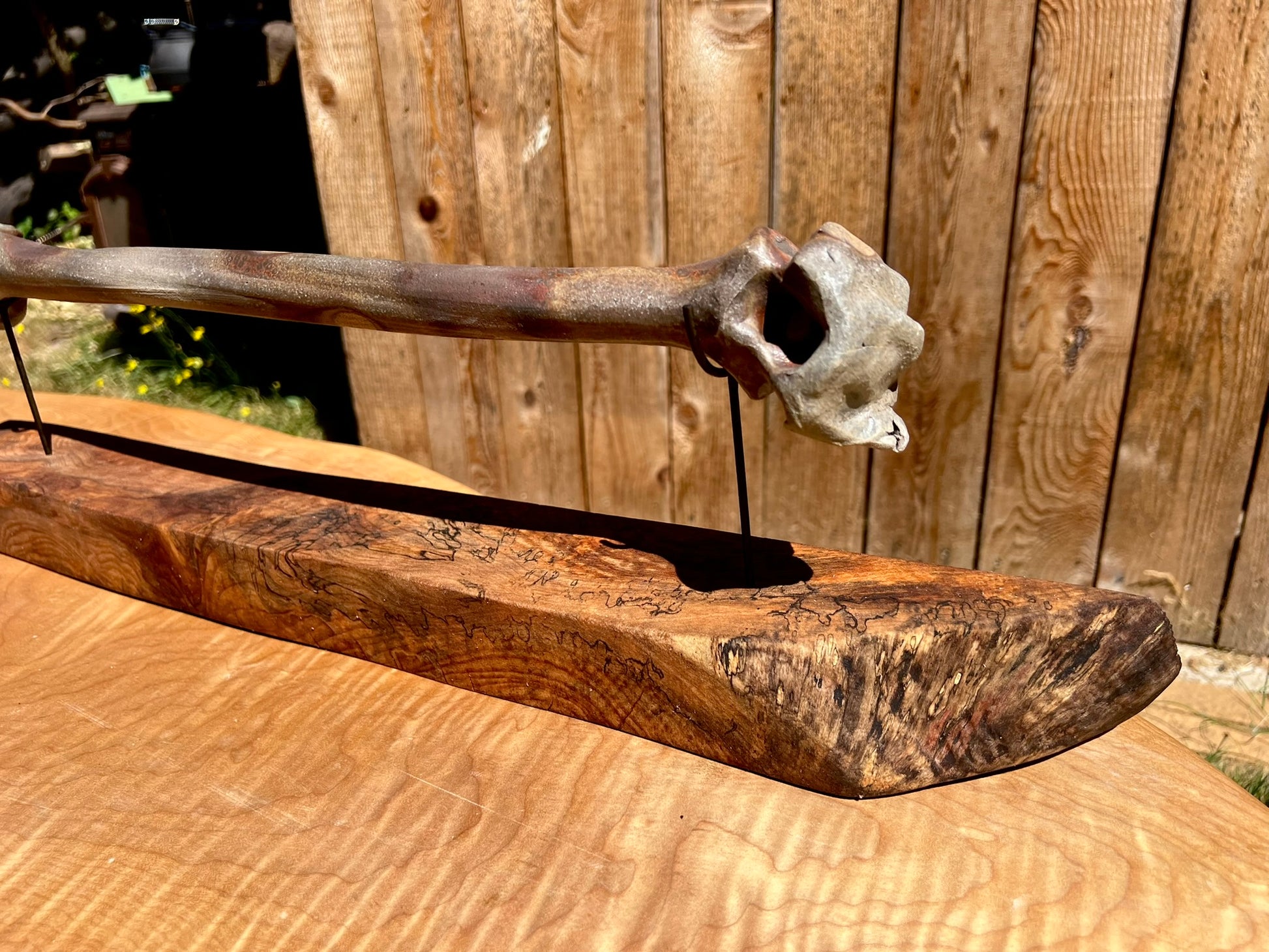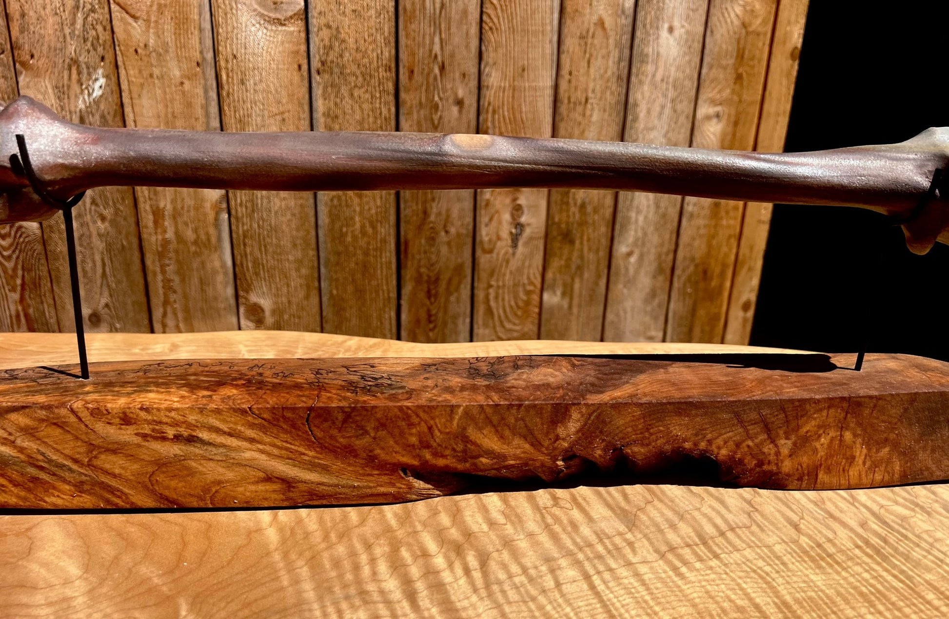This bone is made of clay. It was fired in an anagama. I welded museum quality mounts and elevated this bone on a wooden plinth.
