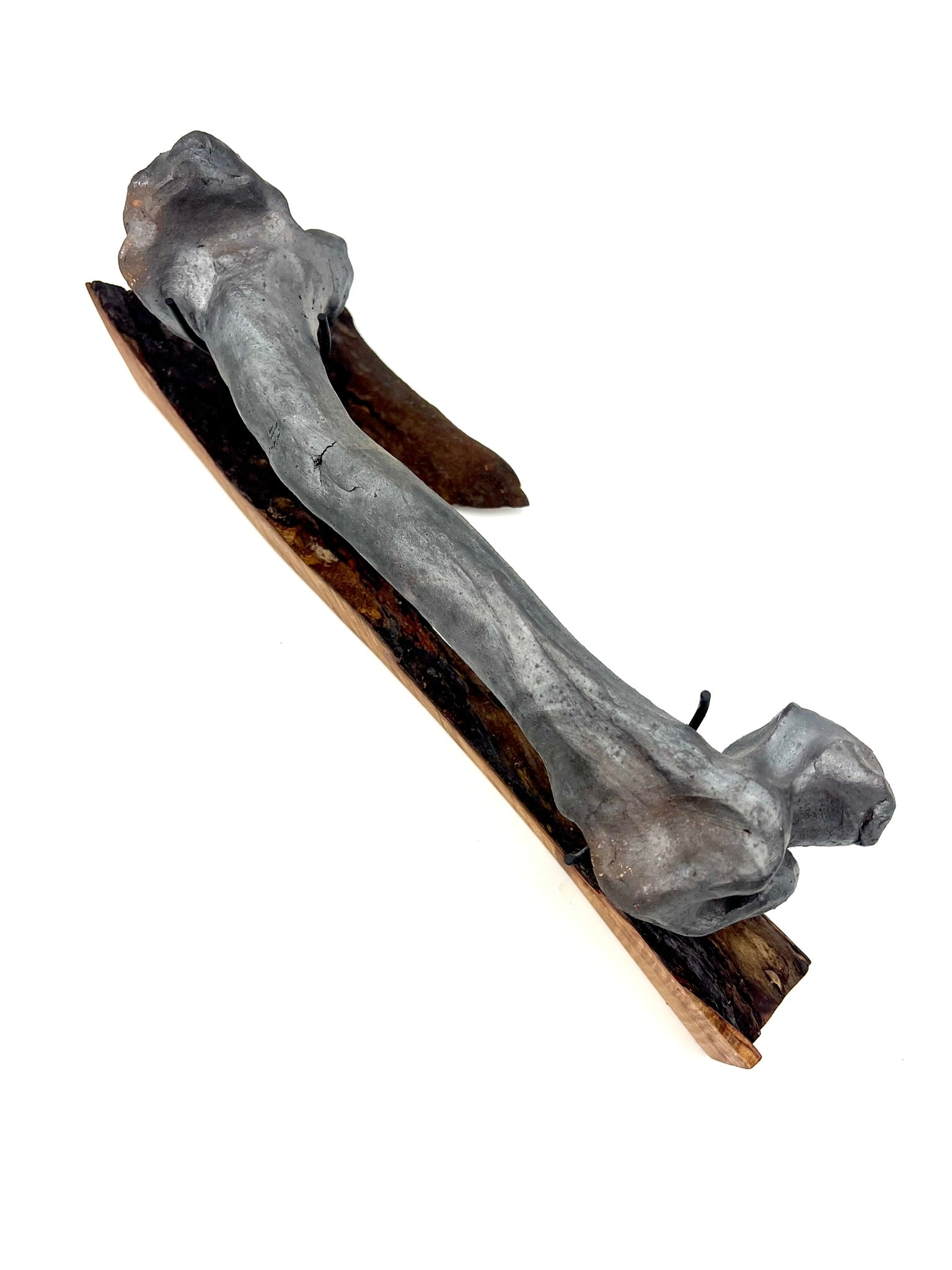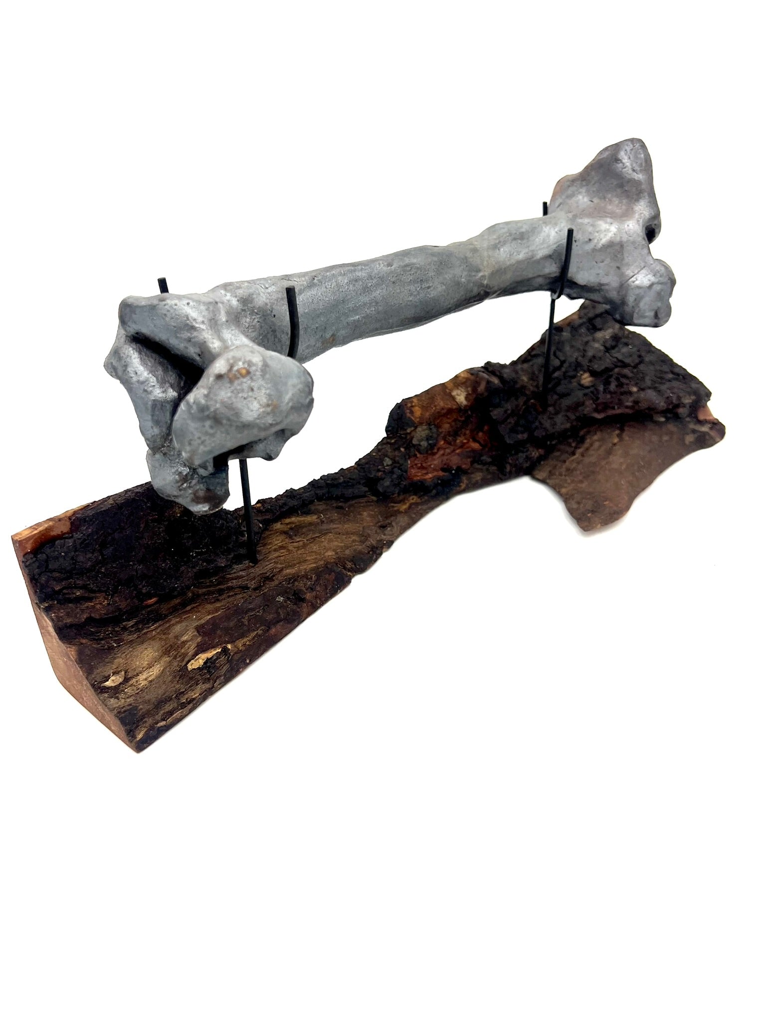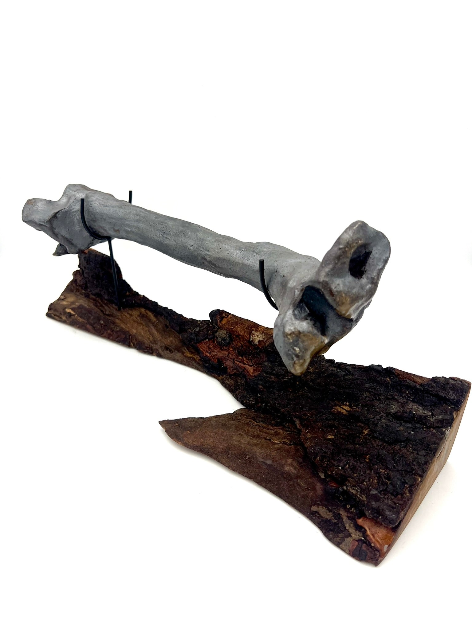 This bone is made of clay. It was fired in an anagama. I welded museum quality mounts and elevated this bone on a wooden plinth.