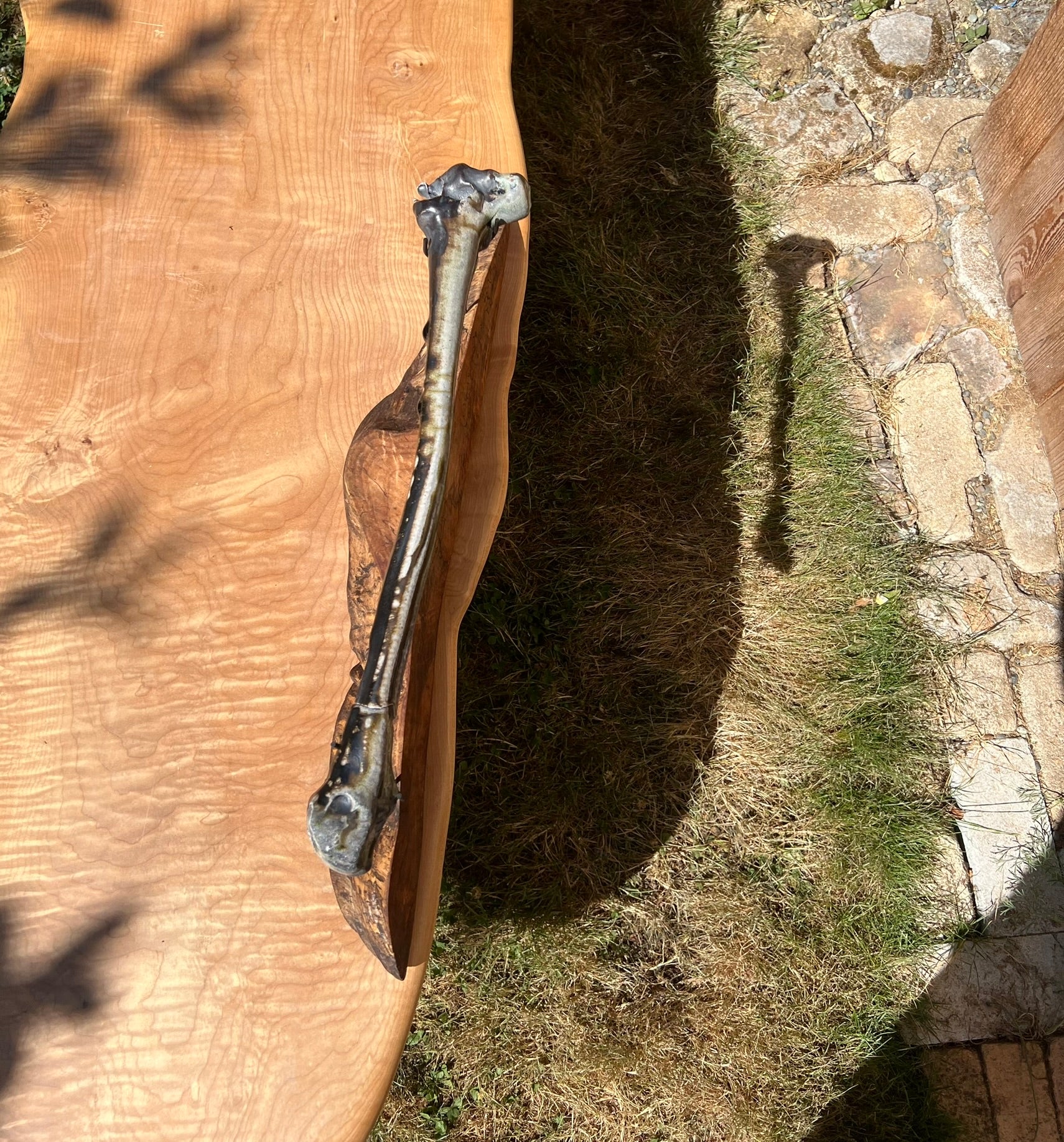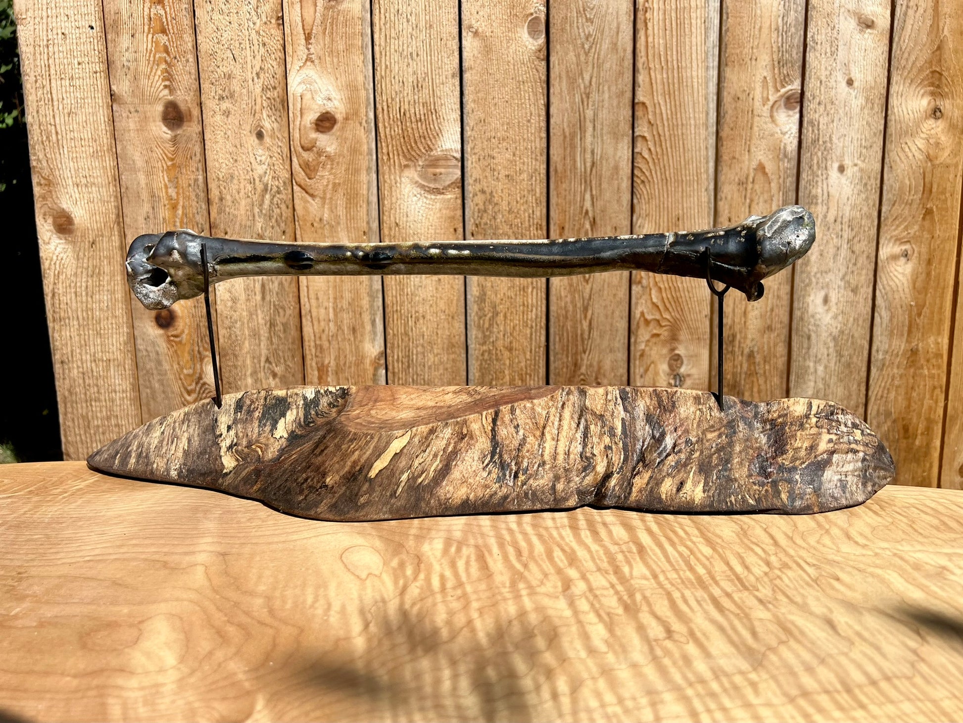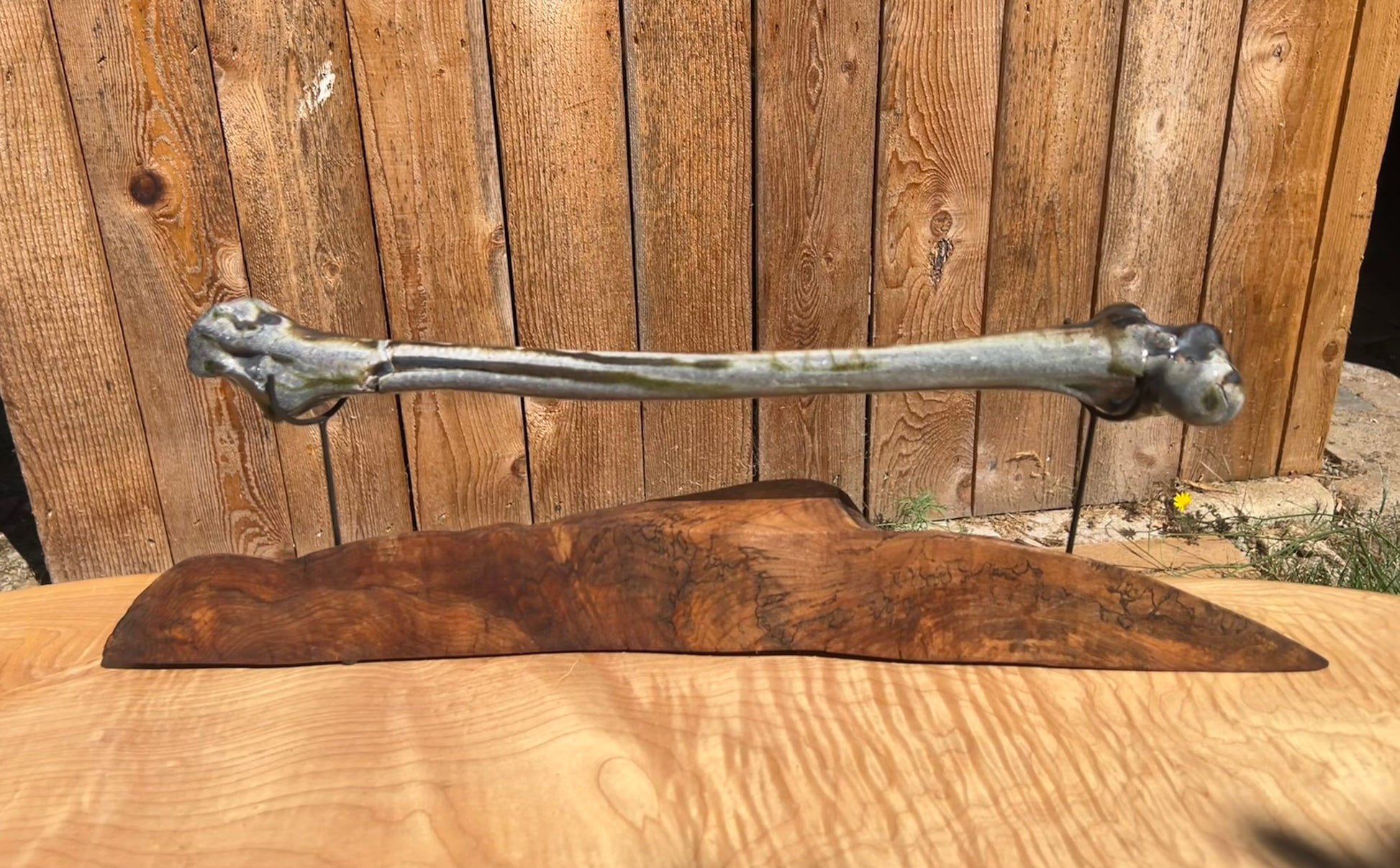 This bone is made of clay. It was fired in a wood/soda kiln. I welded museum quality mounts and elevated this bone on a wooden plinth.