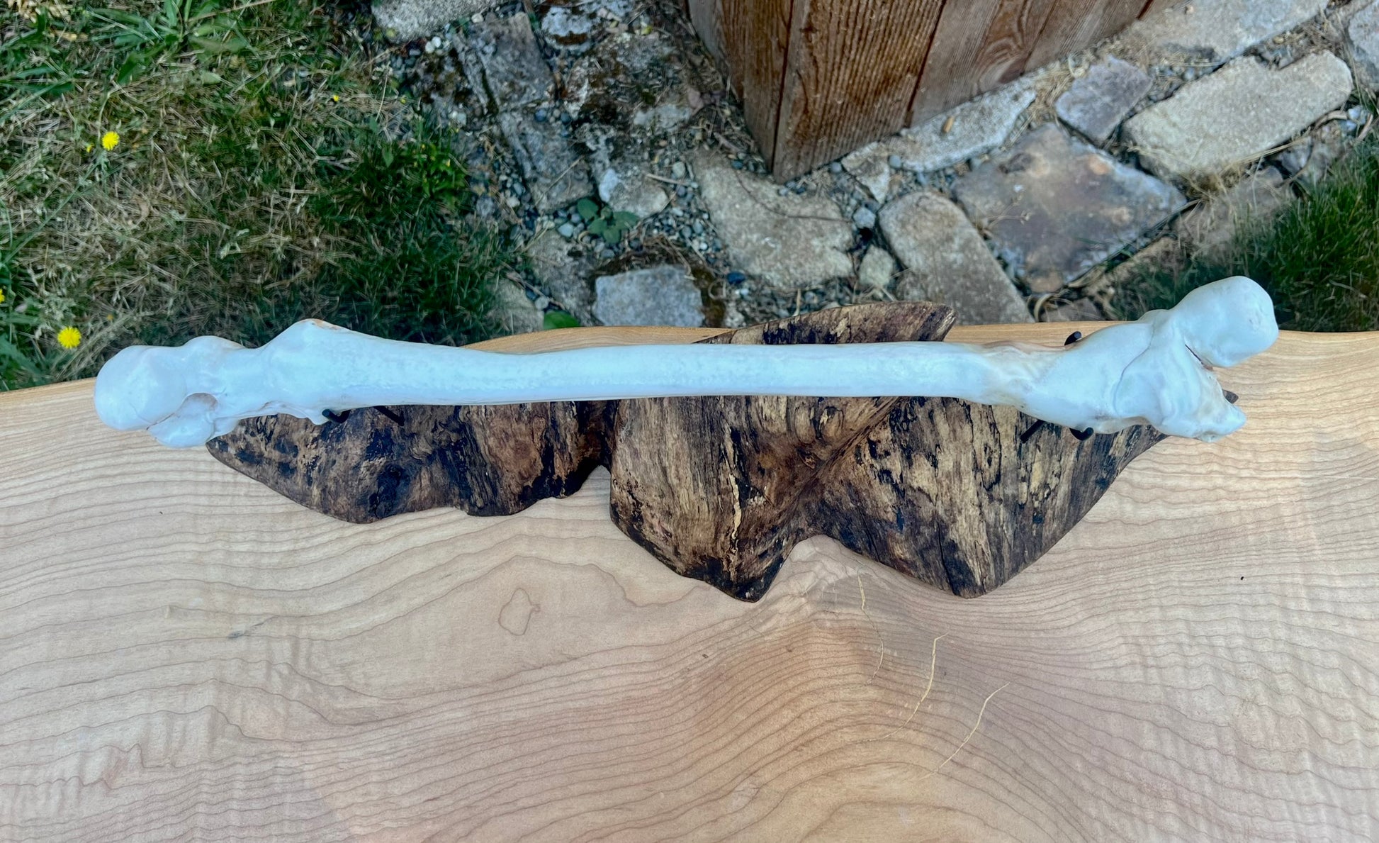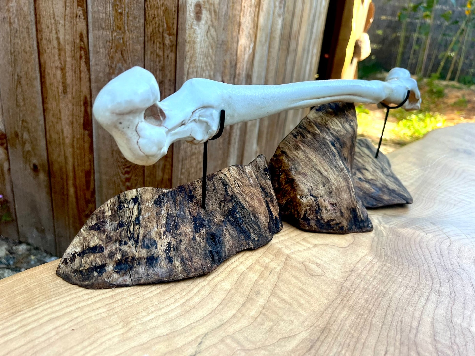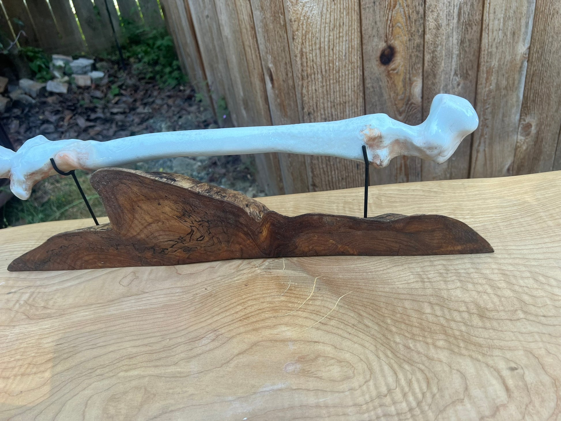 This bone is made of clay. It was fired in an anagama. I welded museum quality mounts and elevated this bone on a wooden plinth.