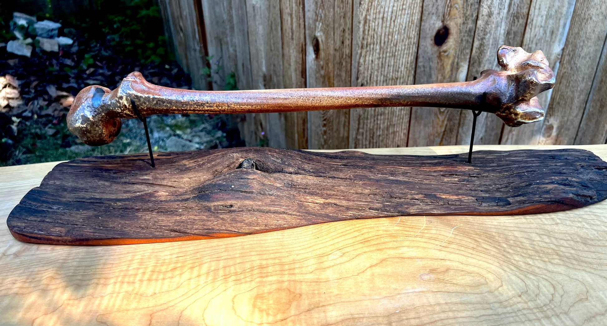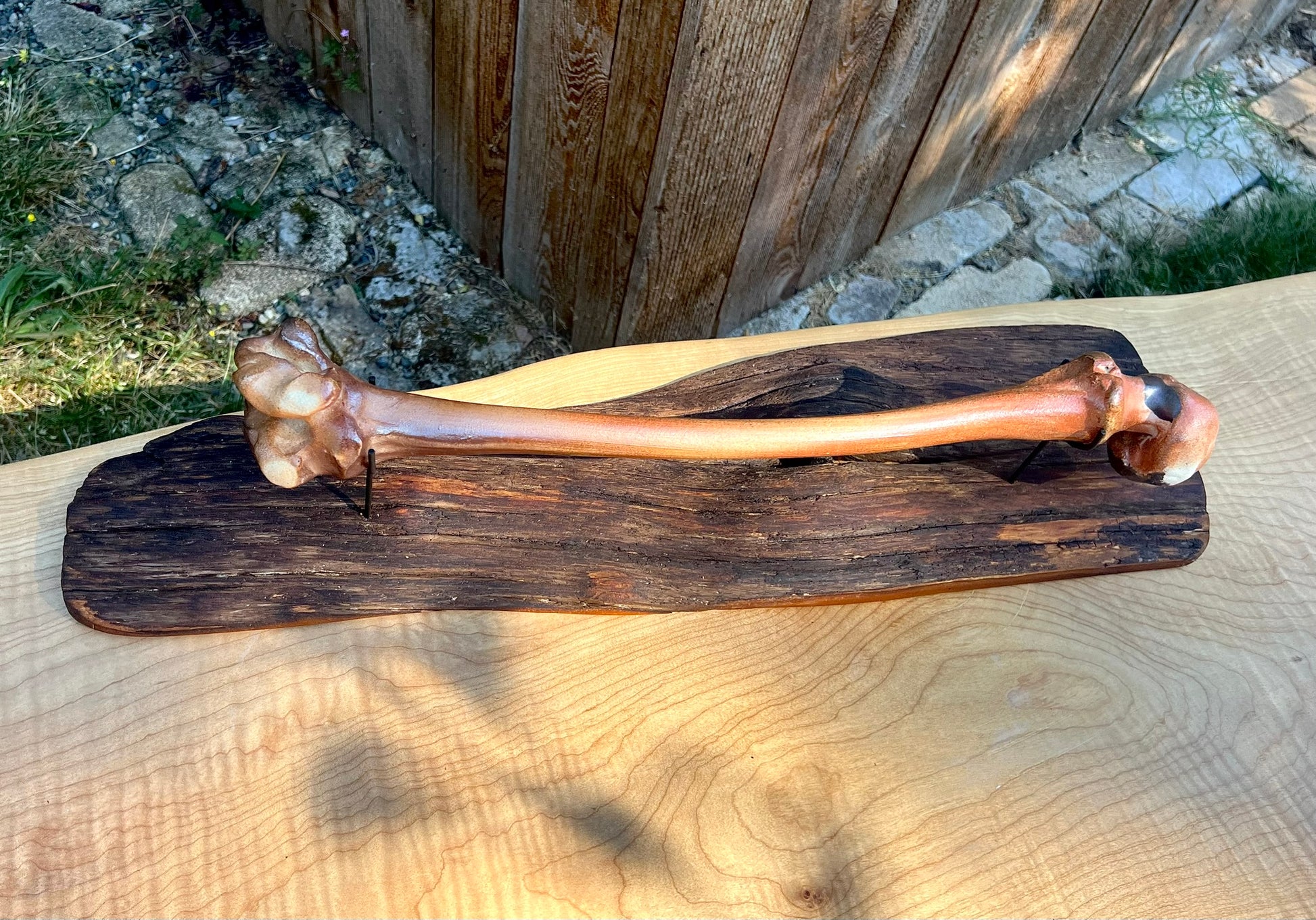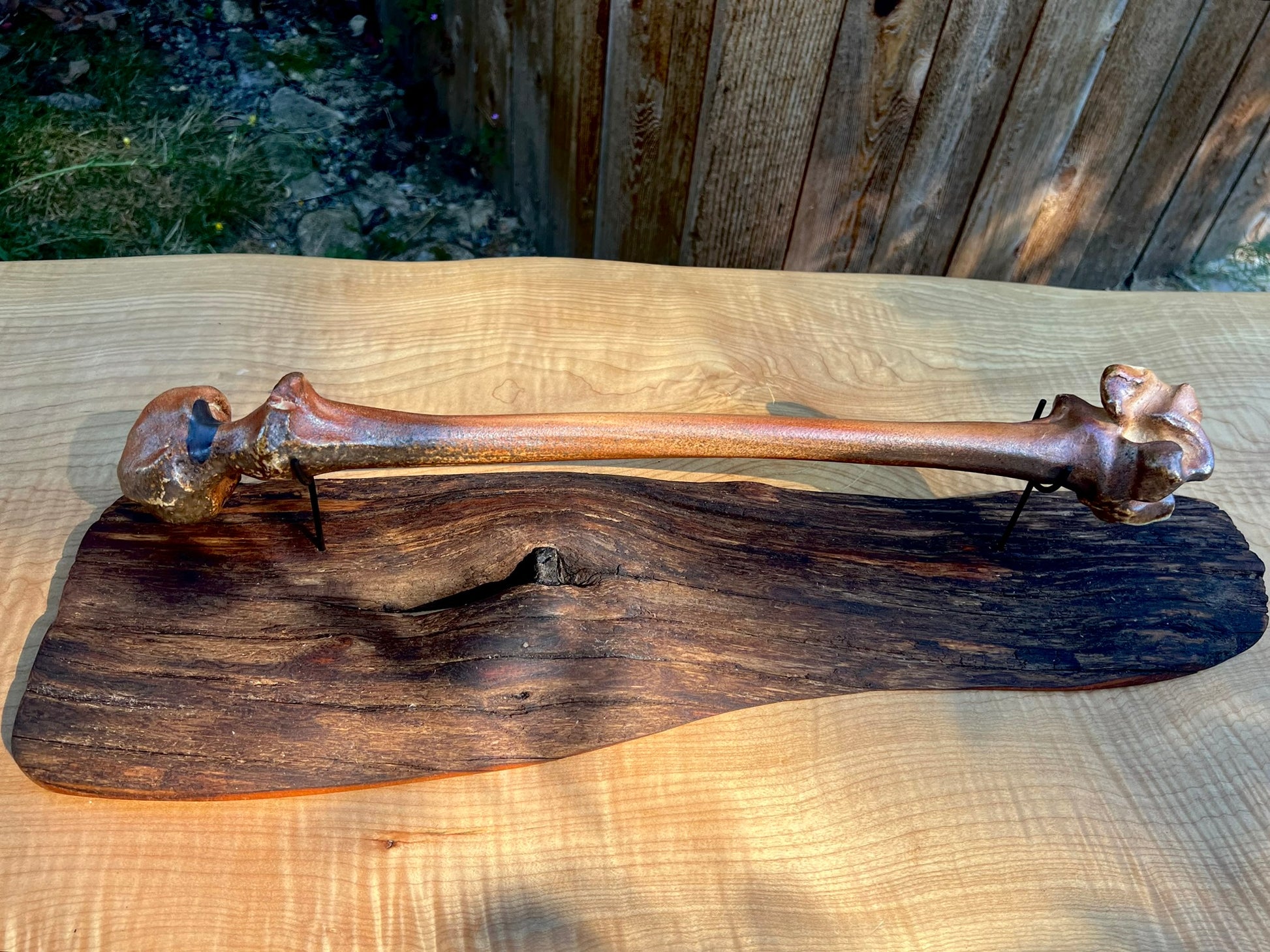 This bone is made of clay. It was fired in an anagama. I welded museum quality mounts and elevated this bone on a wooden plinth.