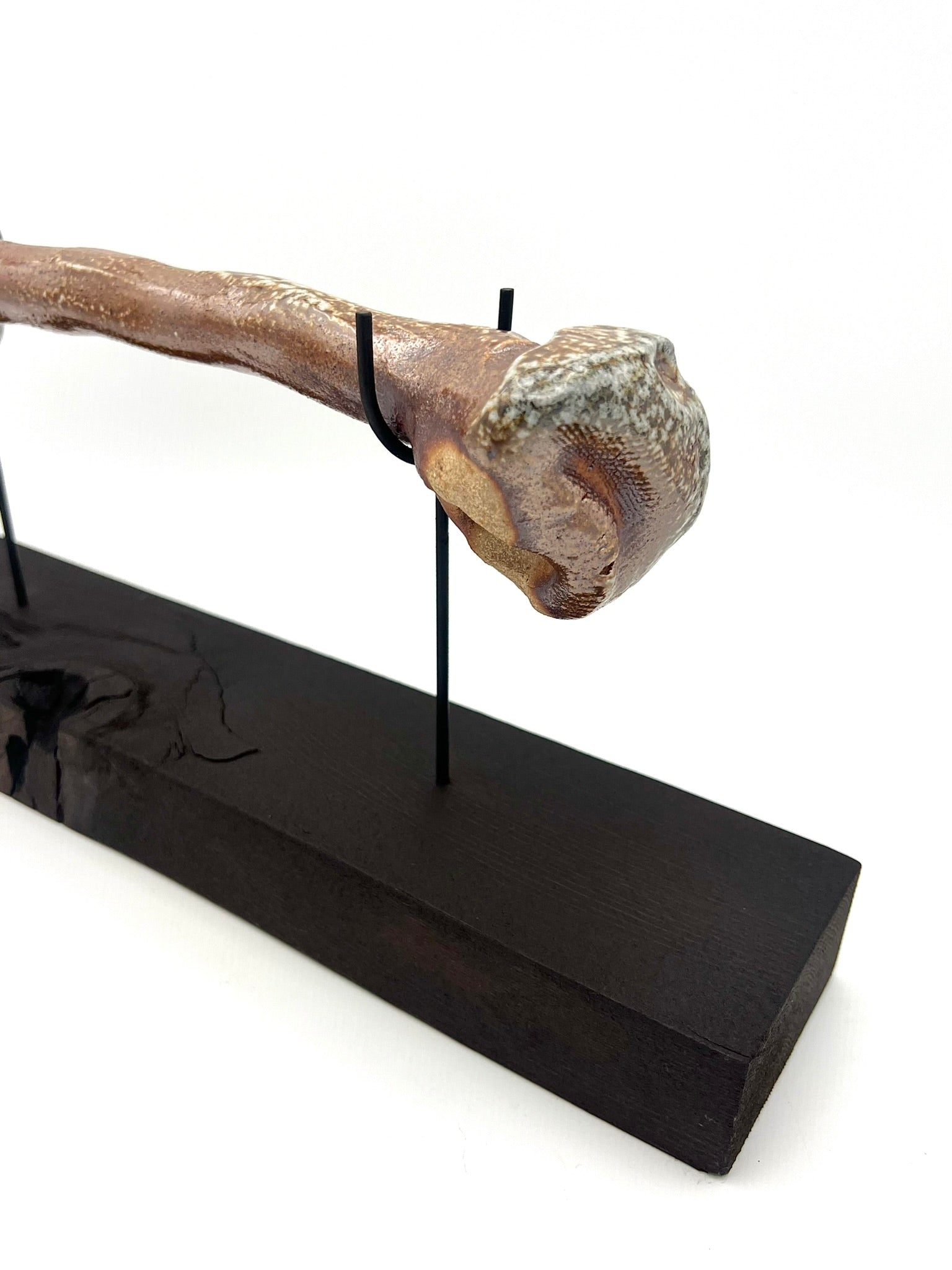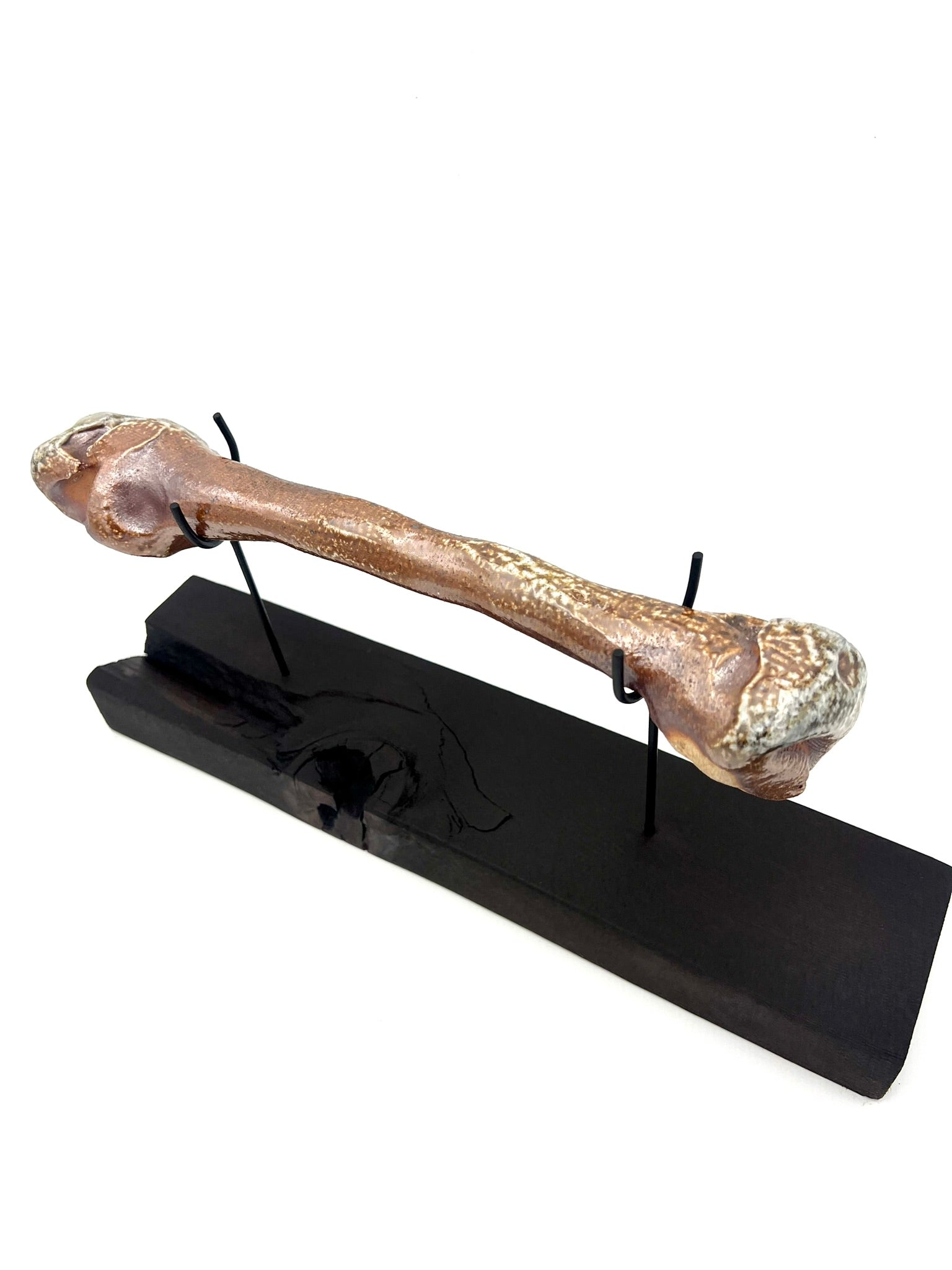 This bone is made of clay. It was fired in an anagama. I welded museum quality mounts and elevated this bone on a wooden plinth.