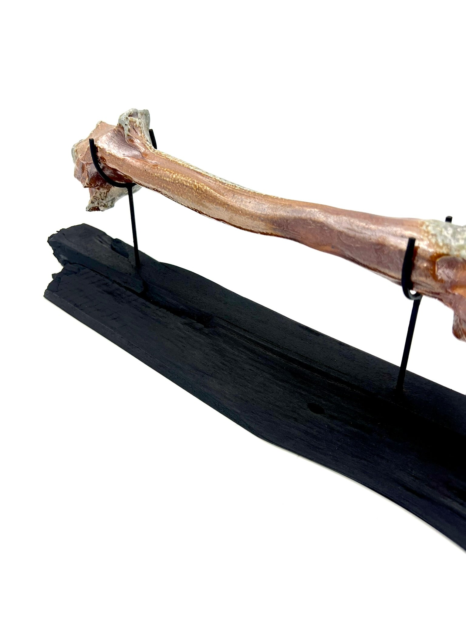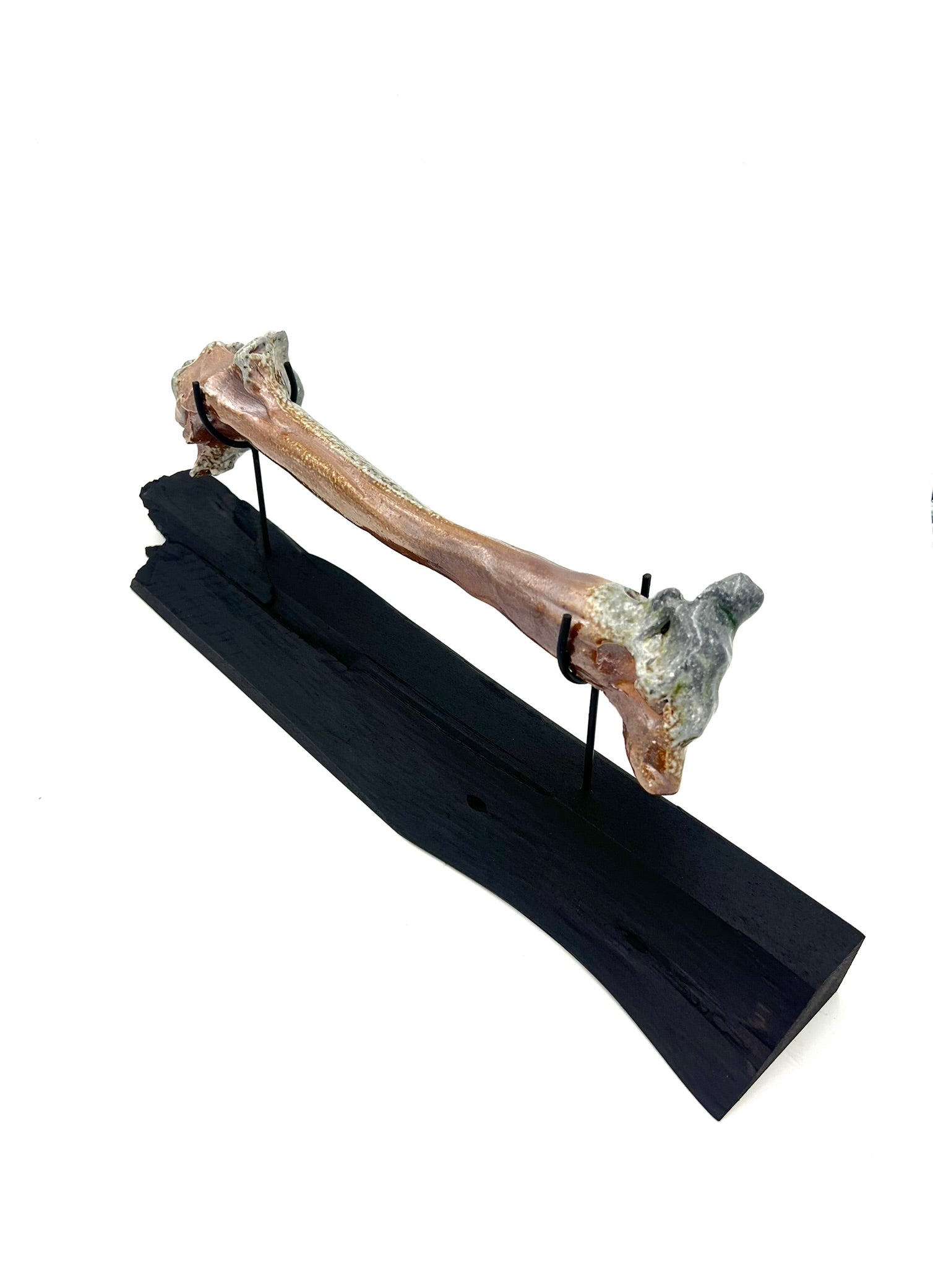 This bone is made of clay. It was fired in a wood/soda kiln and fell into the firebox mid fire. I welded museum quality mounts and elevated this bone on a wooden plinth.