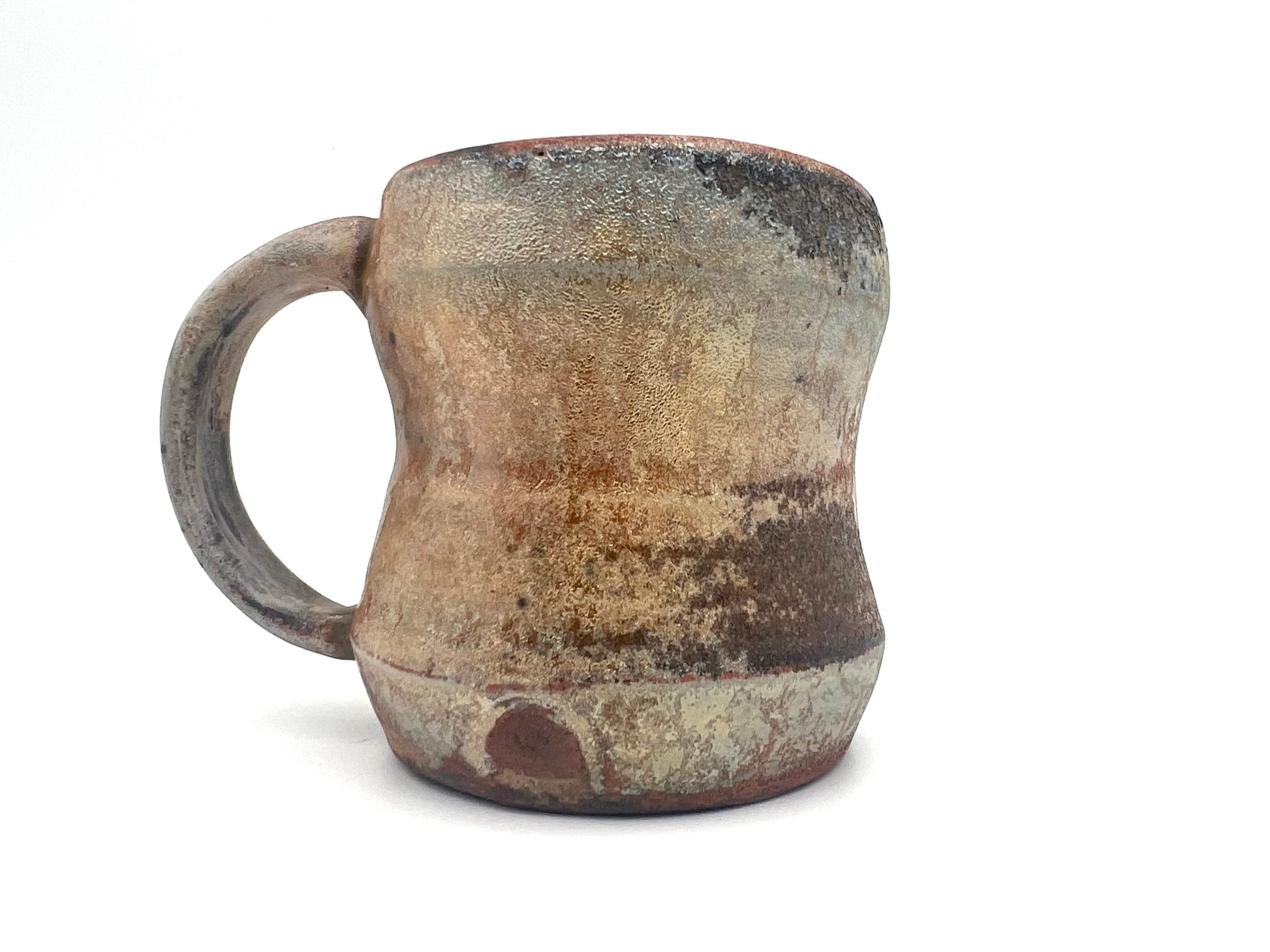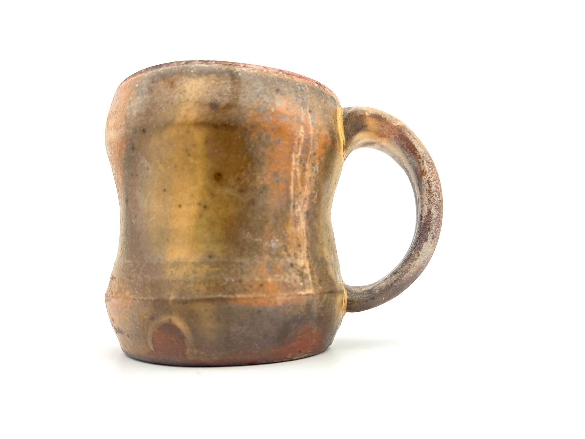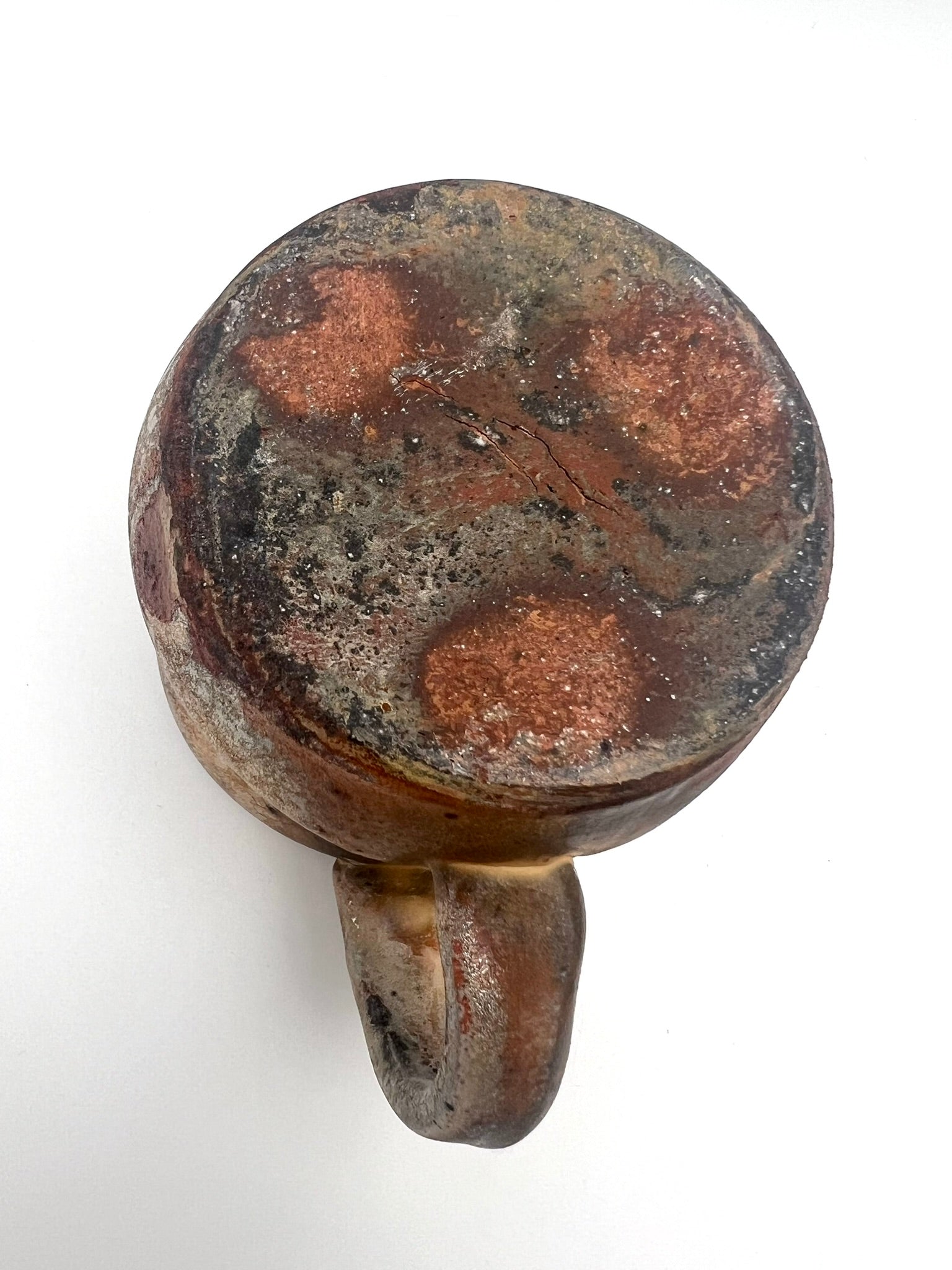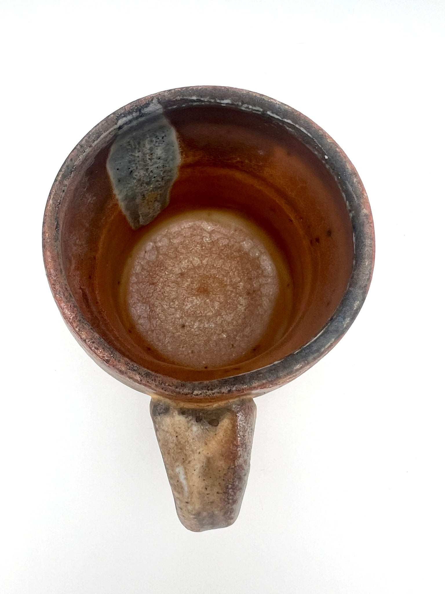 This mug was thrown on the potters wheel. It is made of Newcomb Tile Mix clay with an ungodly amount of ceramic rutile wedged in. It was lined with Penn State Shino. This was reduction cooled in the old Chicken Cat wood/soda kiln. The mug measures 3 inches wide by 4 inches tall.