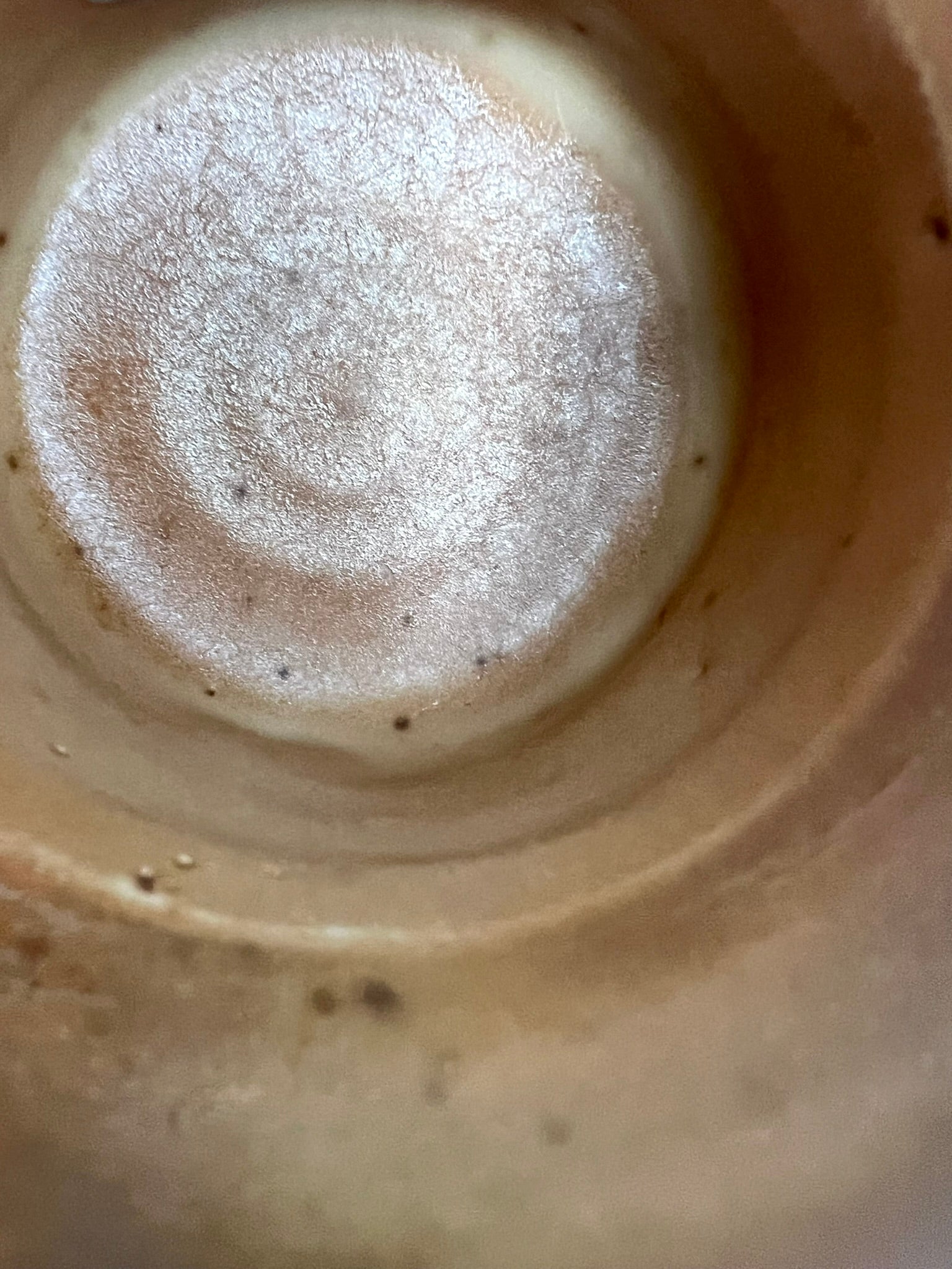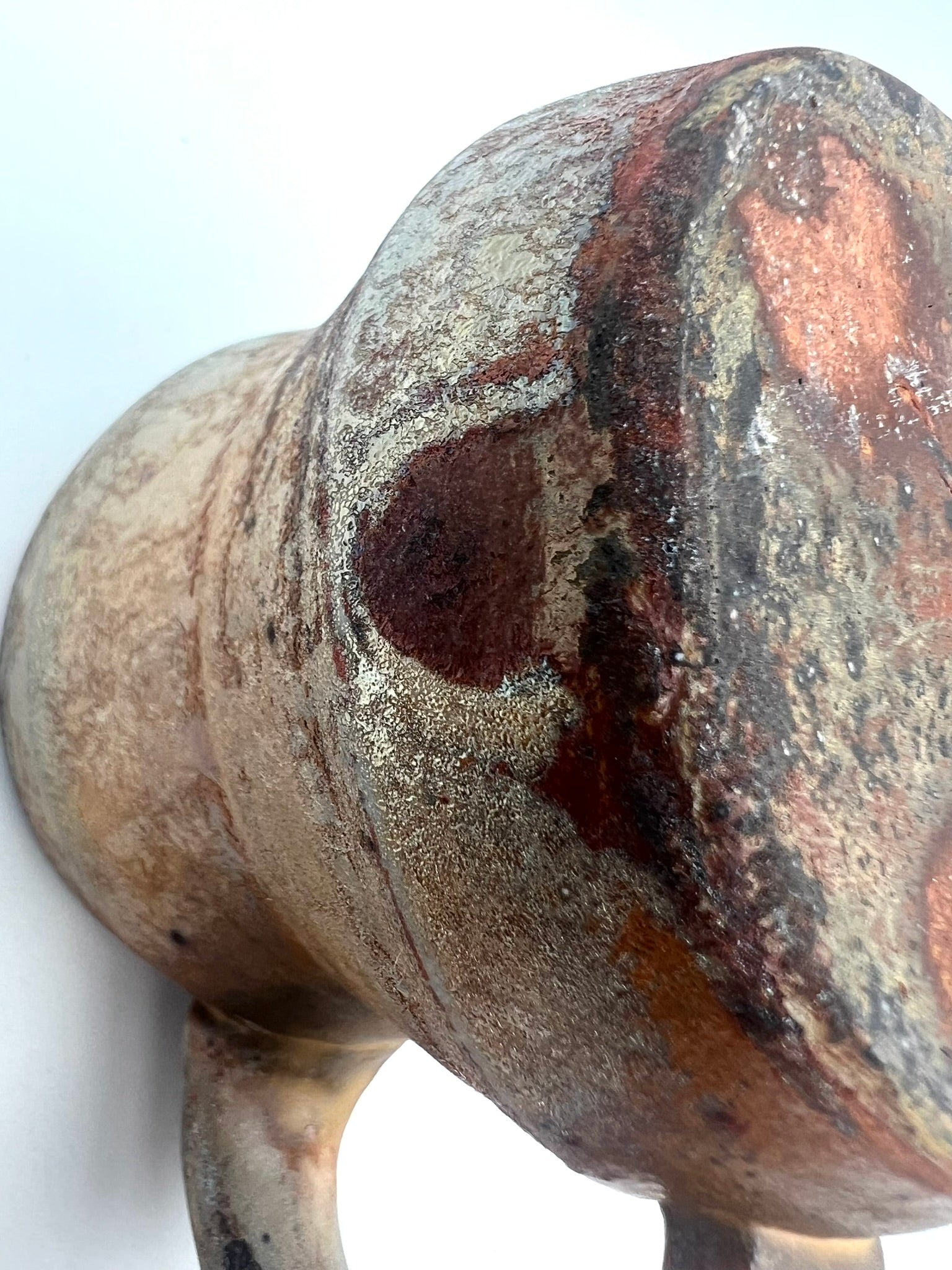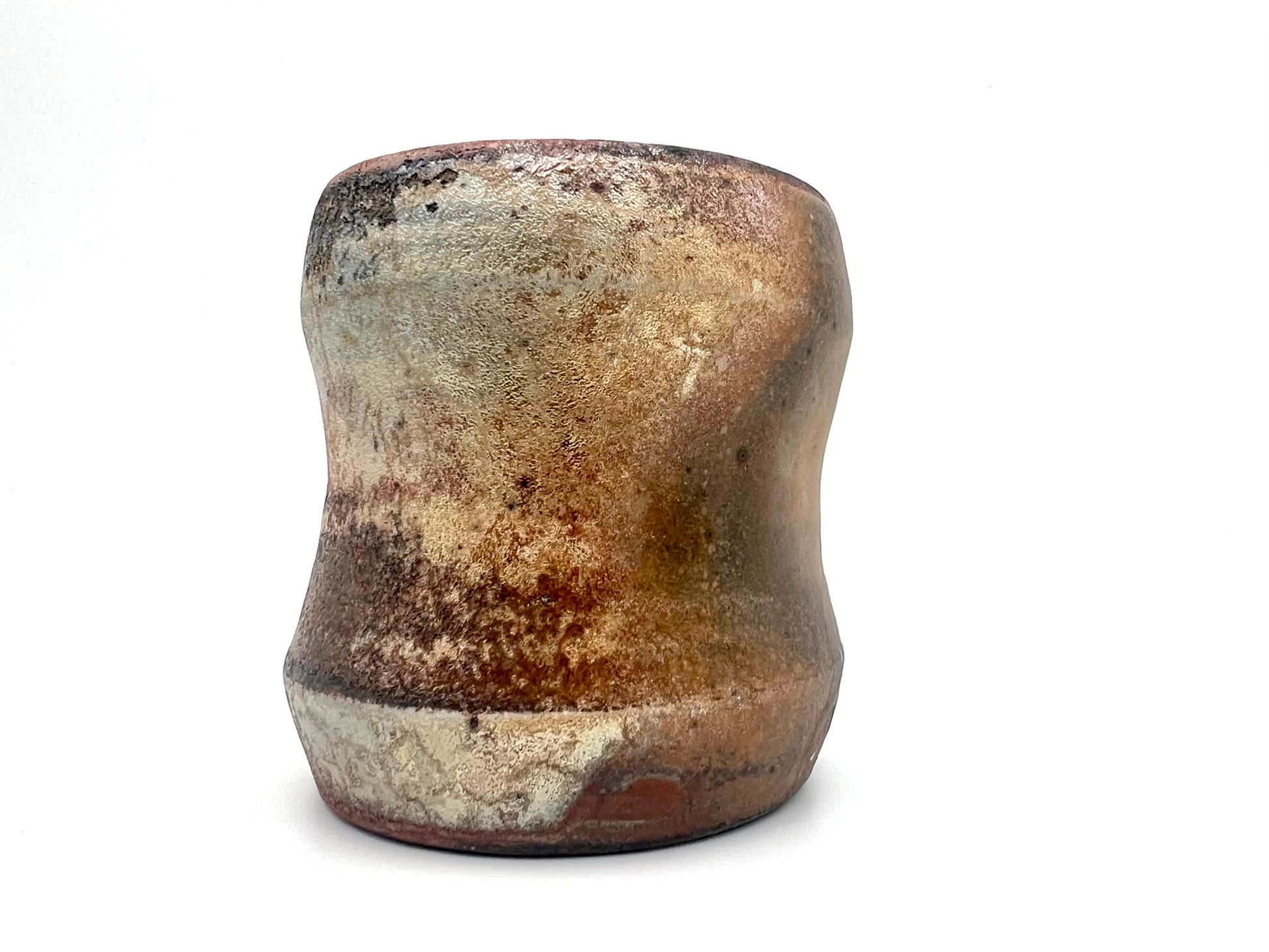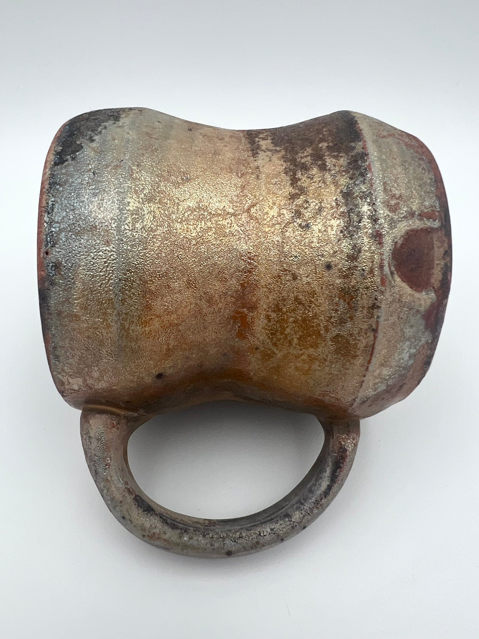 This mug was thrown on the potters wheel. It is made of Newcomb Tile Mix clay with an ungodly amount of ceramic rutile wedged in. It was lined with Penn State Shino. This was reduction cooled in the old Chicken Cat wood/soda kiln. The mug measures 3 inches wide by 4 inches tall.