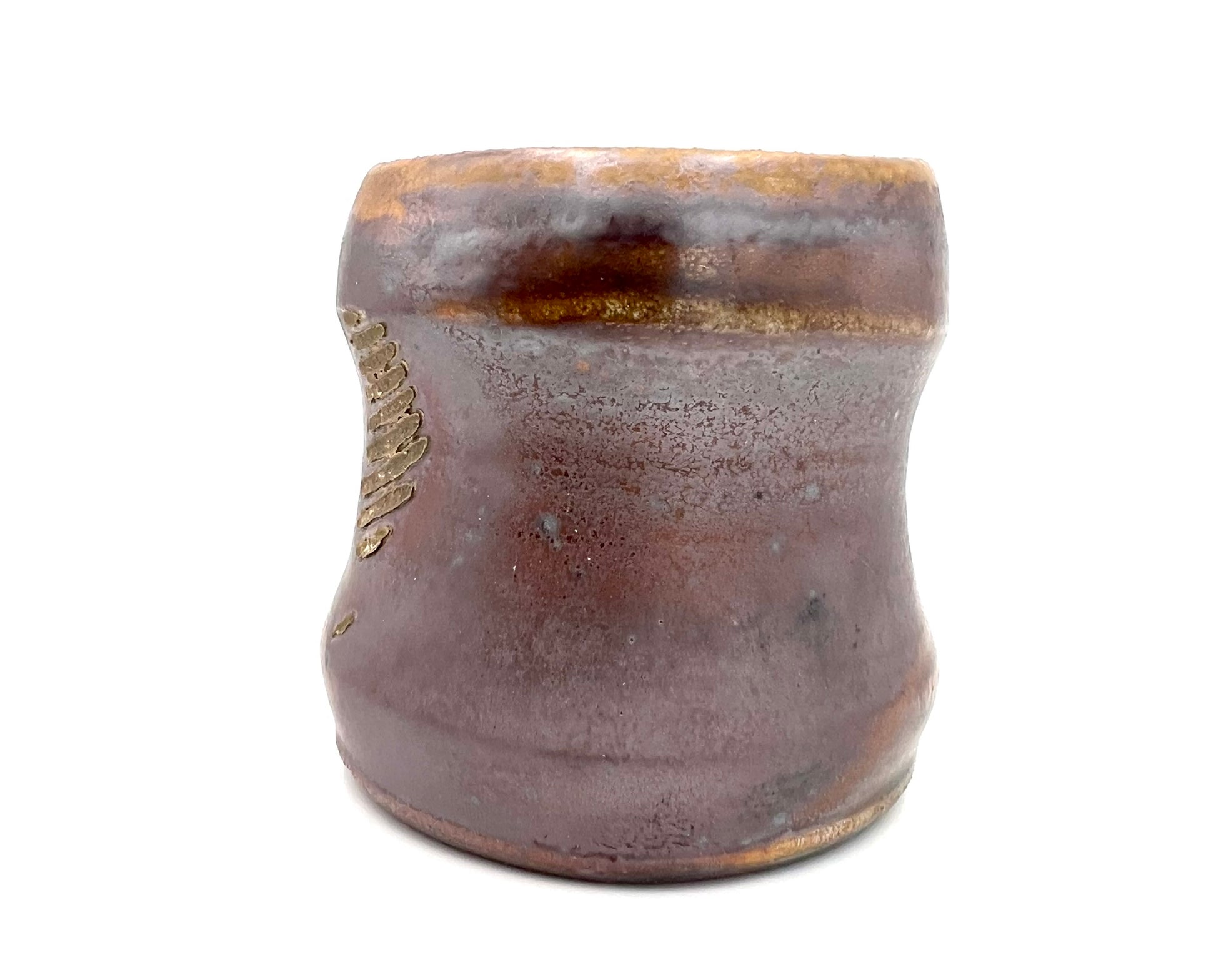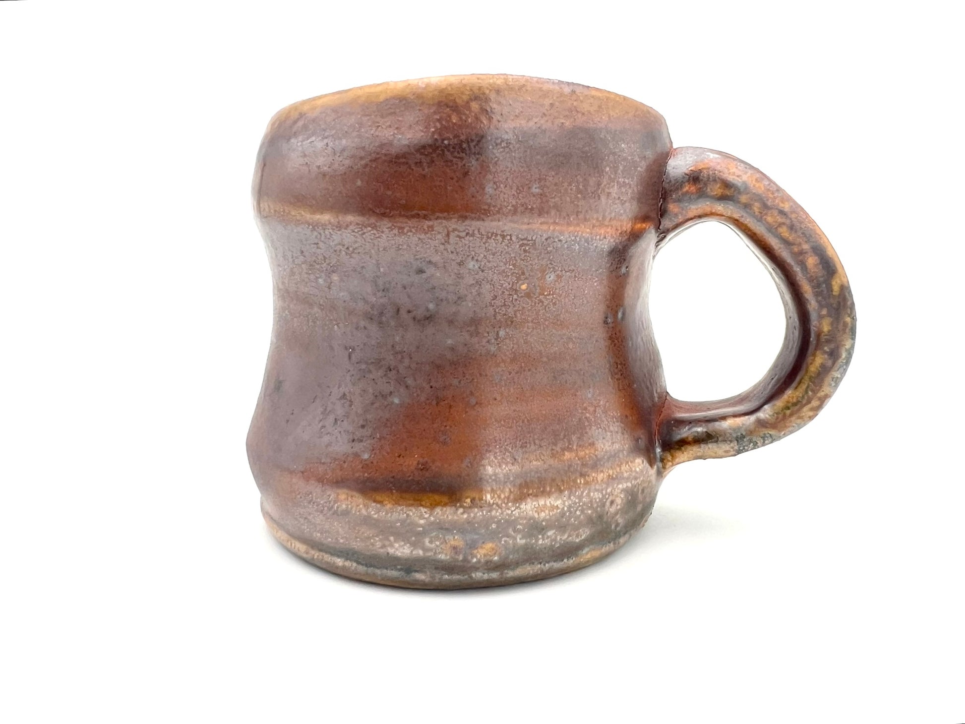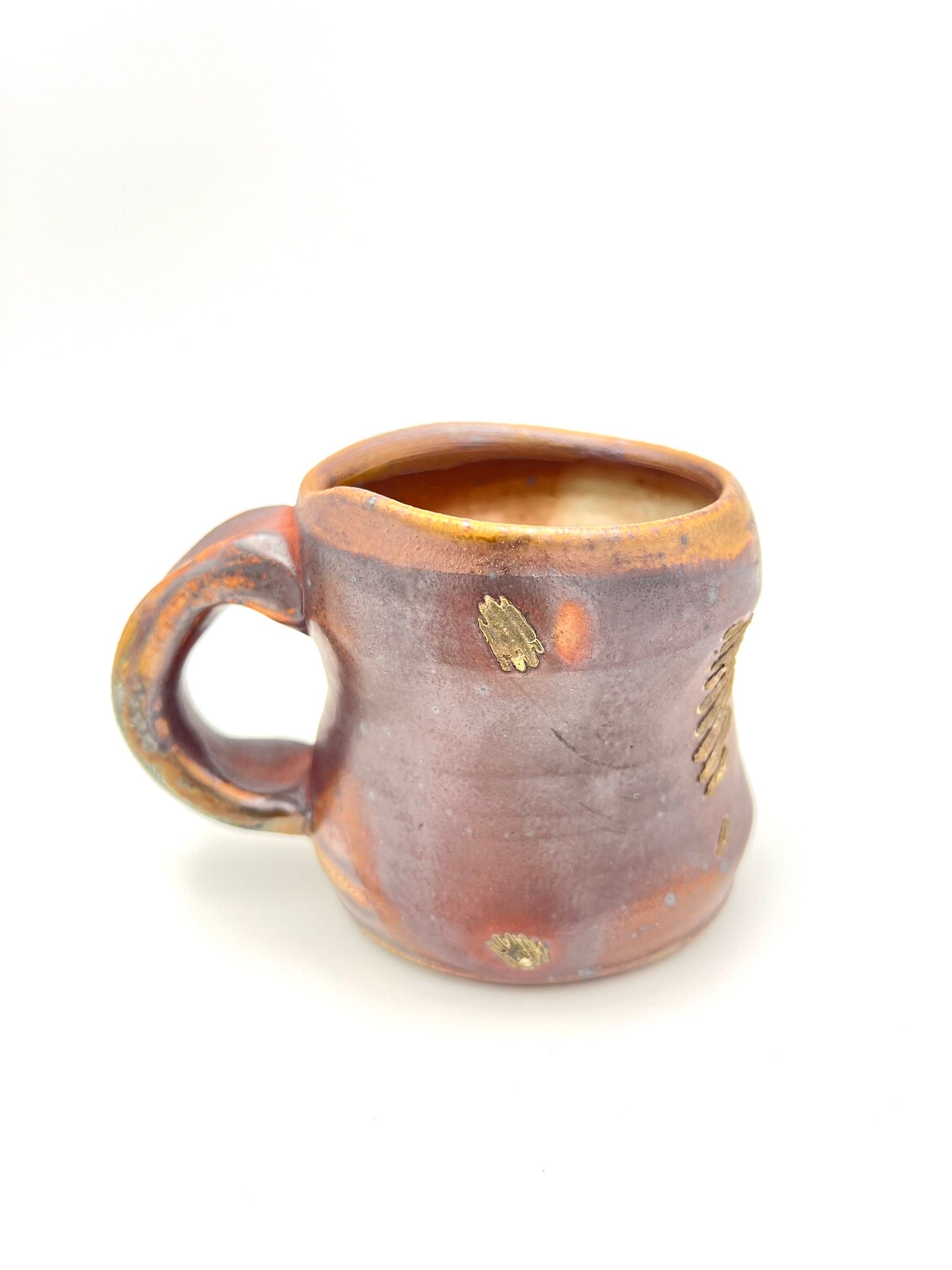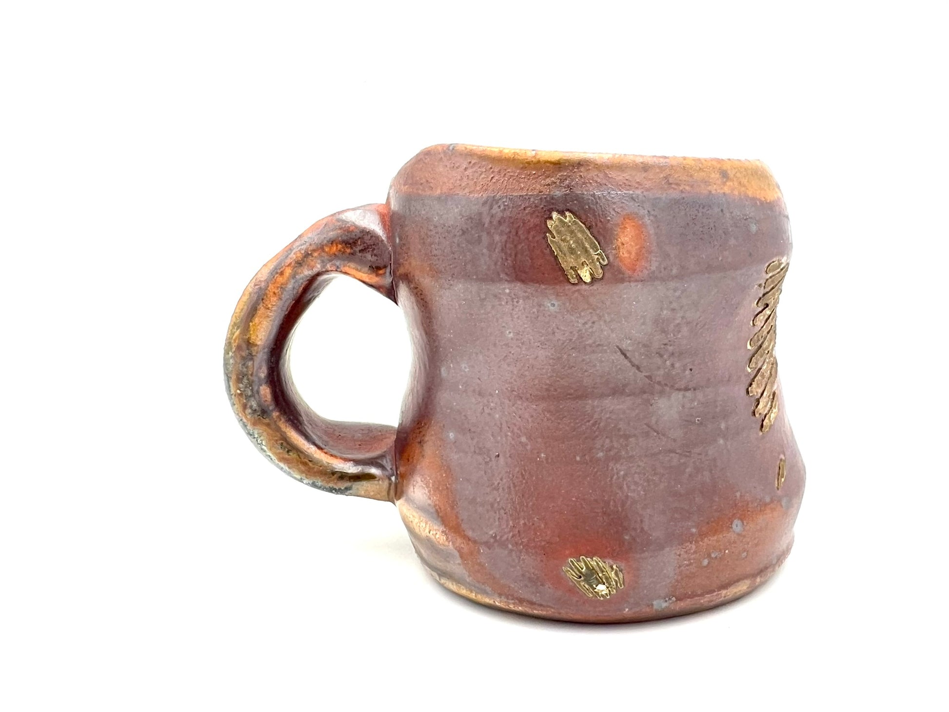 This smaller mug was thrown on the potters wheel. It is made of Newcomb Tile Mix clay with an ungodly amount of ceramic rutile wedged in. It was dipped in EPK slip and fired in the old Chicken Cat wood/soda kiln to cone 12. Scars from seashells adorn one side, as it was side fired on seashells. The mug measures 3.5 inches wide by 3 inches tall.