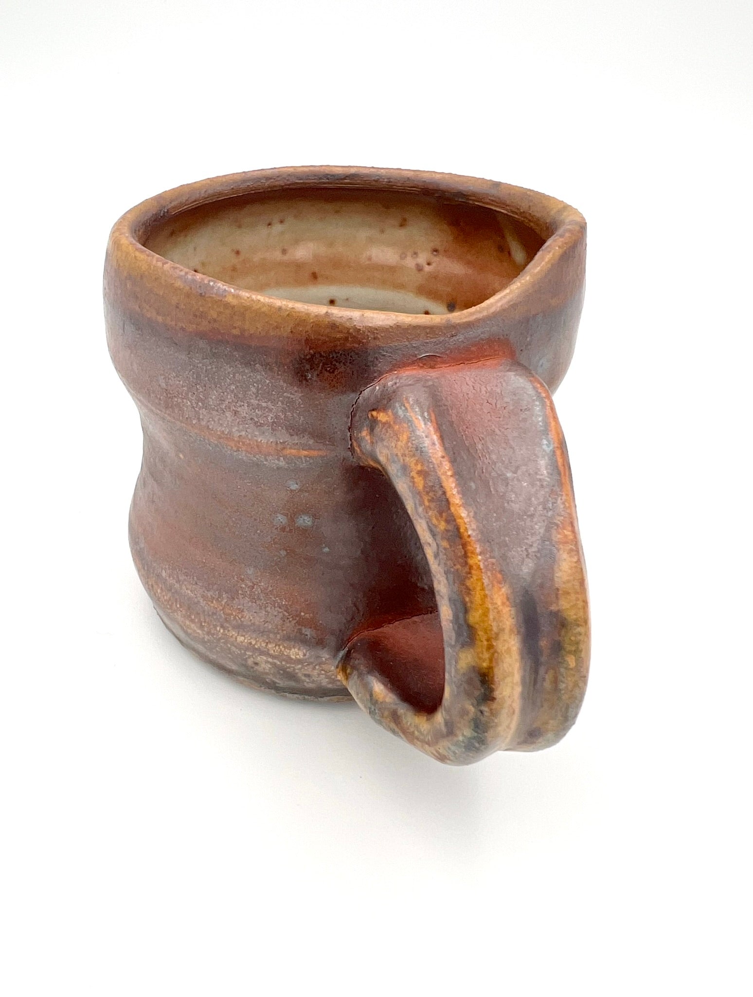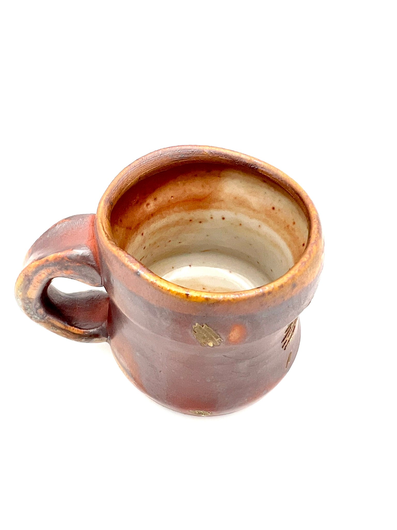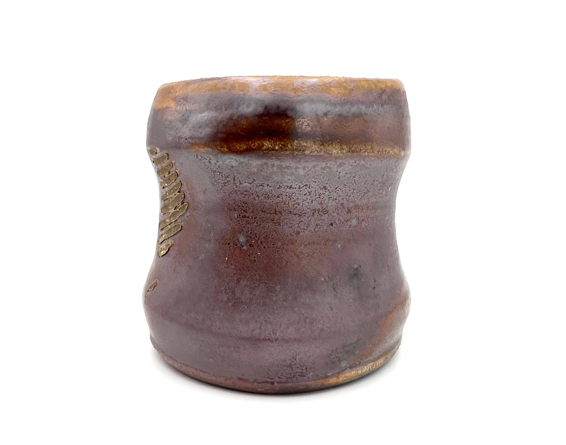 This smaller mug was thrown on the potters wheel. It is made of Newcomb Tile Mix clay with an ungodly amount of ceramic rutile wedged in. It was dipped in EPK slip and fired in the old Chicken Cat wood/soda kiln to cone 12. Scars from seashells adorn one side, as it was side fired on seashells. The mug measures 3.5 inches wide by 3 inches tall.