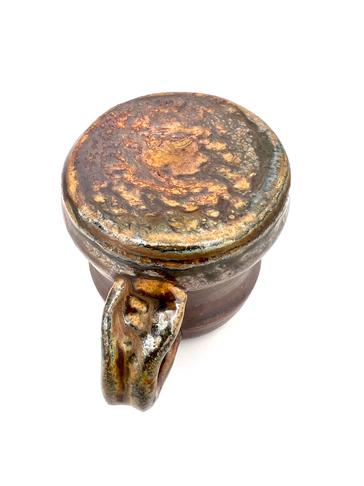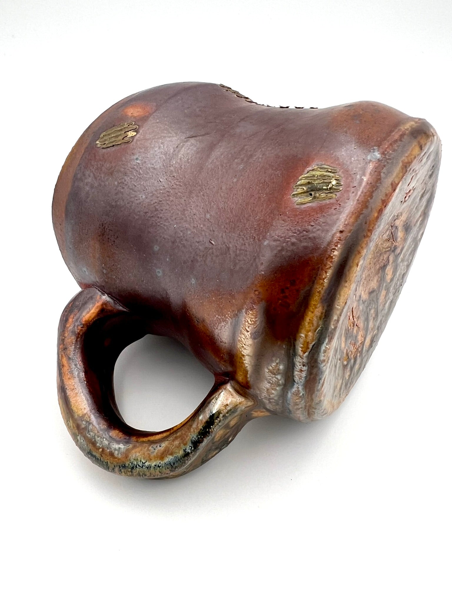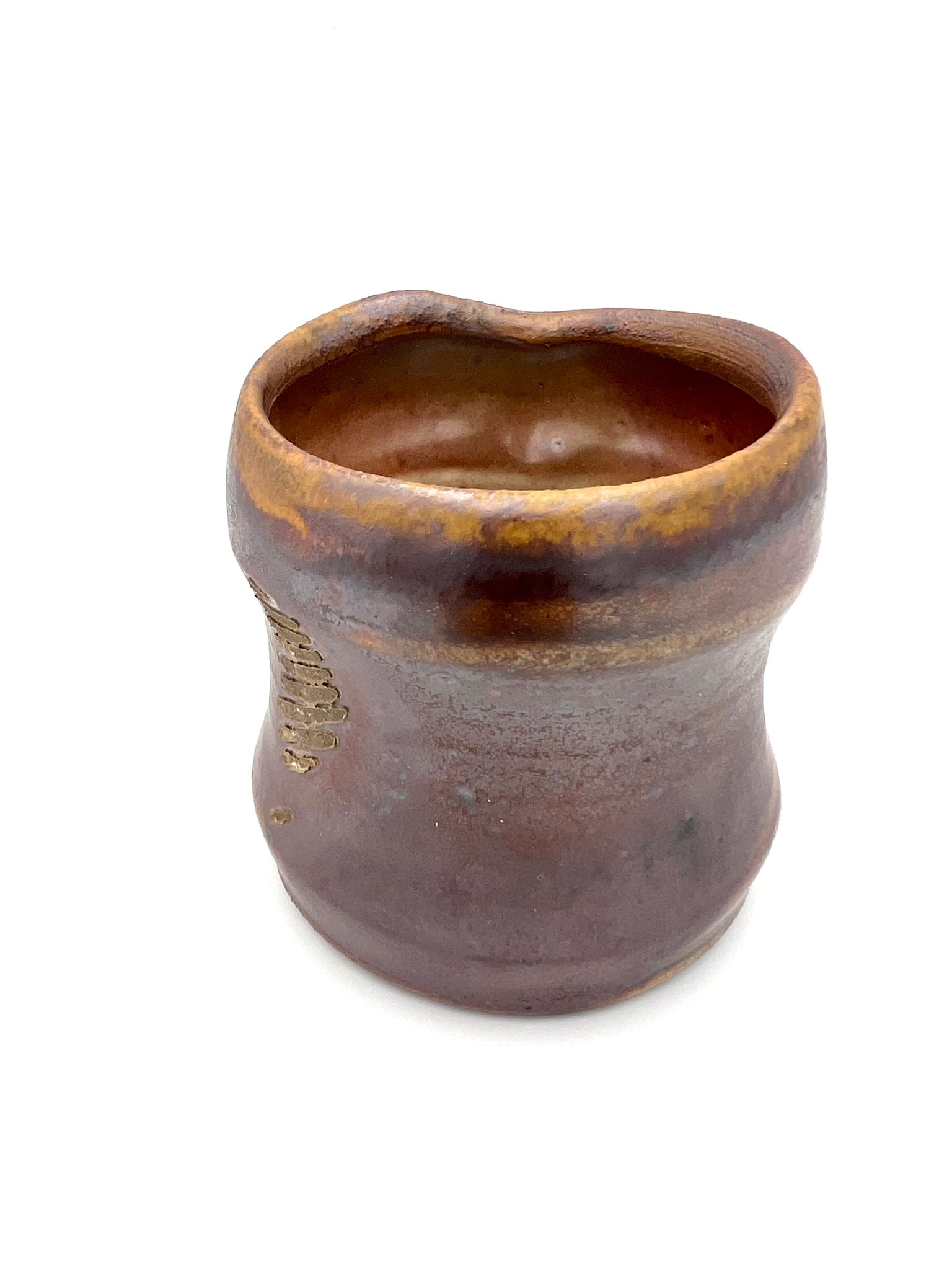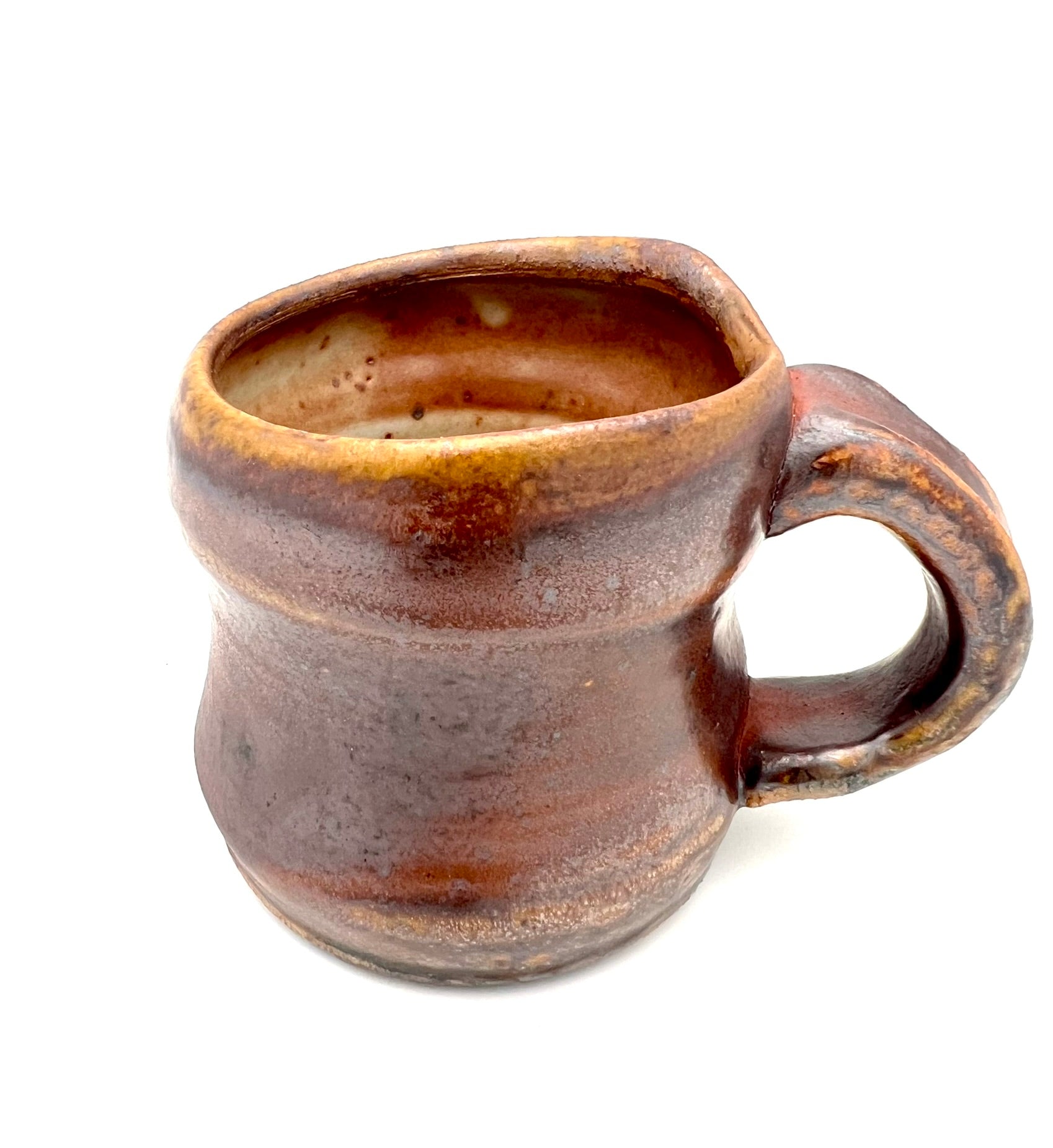 This smaller mug was thrown on the potters wheel. It is made of Newcomb Tile Mix clay with an ungodly amount of ceramic rutile wedged in. It was dipped in EPK slip and fired in the old Chicken Cat wood/soda kiln to cone 12. Scars from seashells adorn one side, as it was side fired on seashells. The mug measures 3.5 inches wide by 3 inches tall.