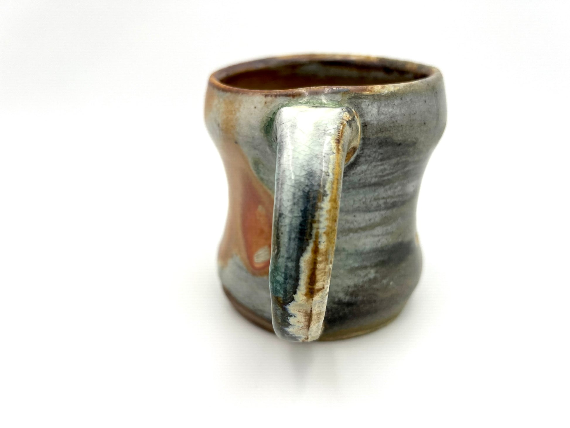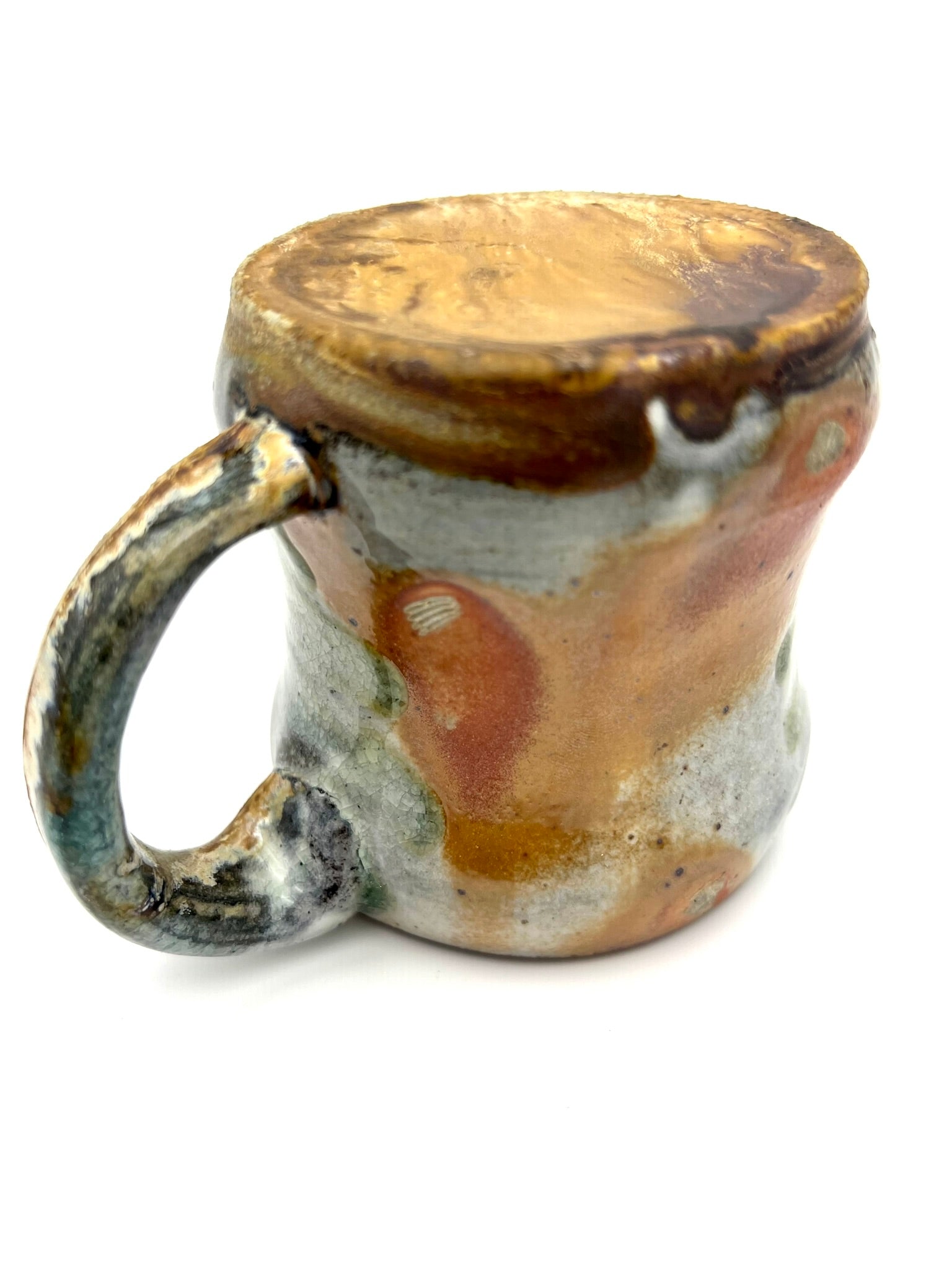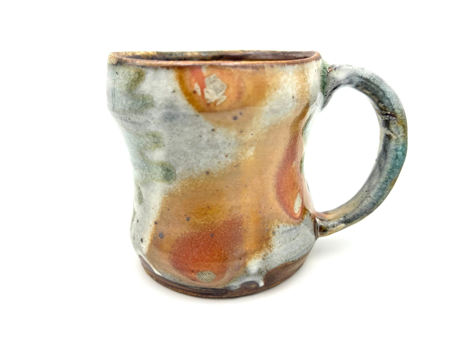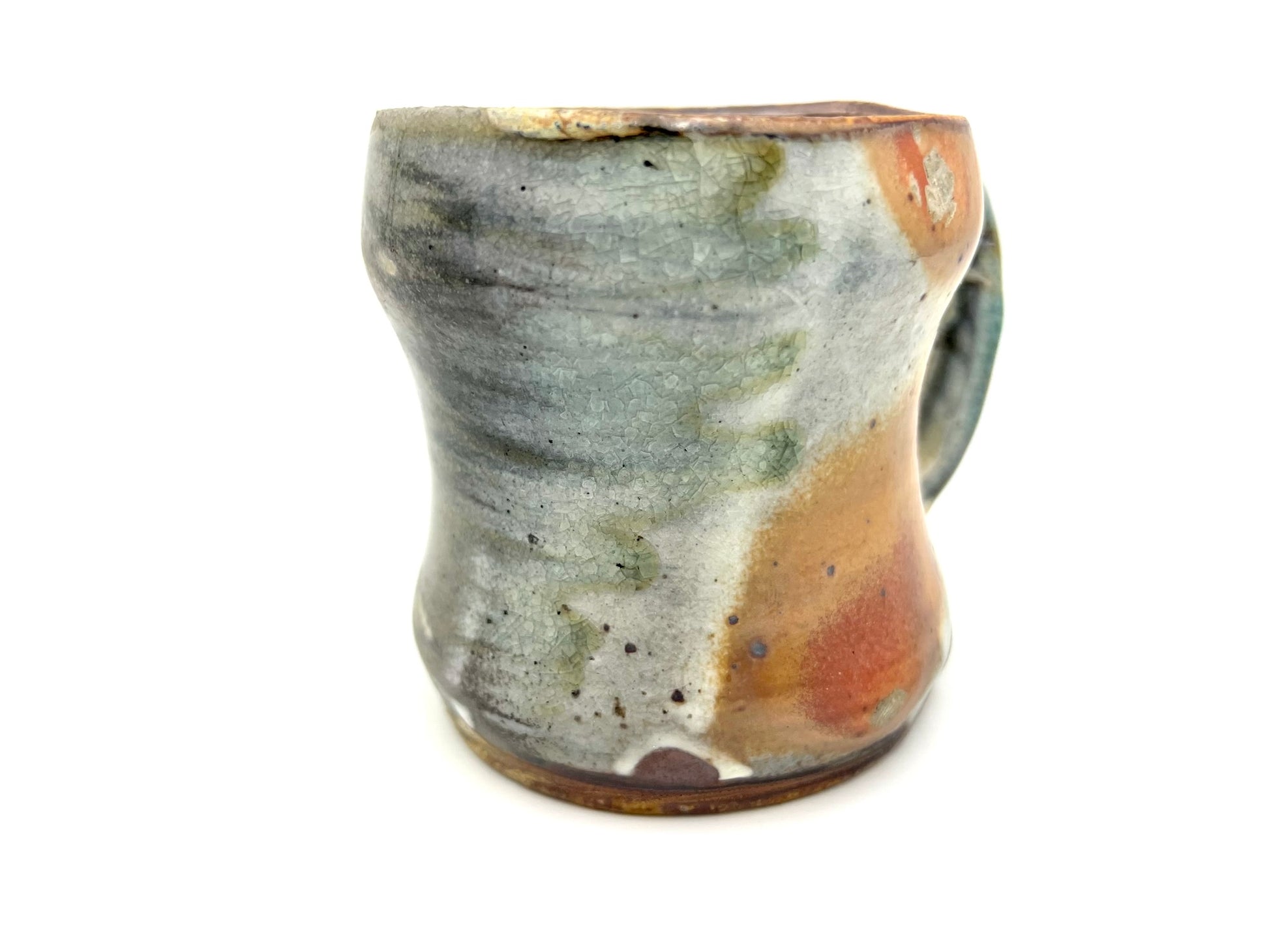 This mug was thrown on the potters wheel. It is made of Newcomb Tile Mix clay with an ungodly amount of ceramic rutile wedged in. It was dipped in EPK slip and fired in the old Chicken Cat wood/soda kiln to cone 12. Scars from seashells adorn one side, as it was side fired on seashells. The mug measures 3.25 inches wide by 3.5 inches tall.