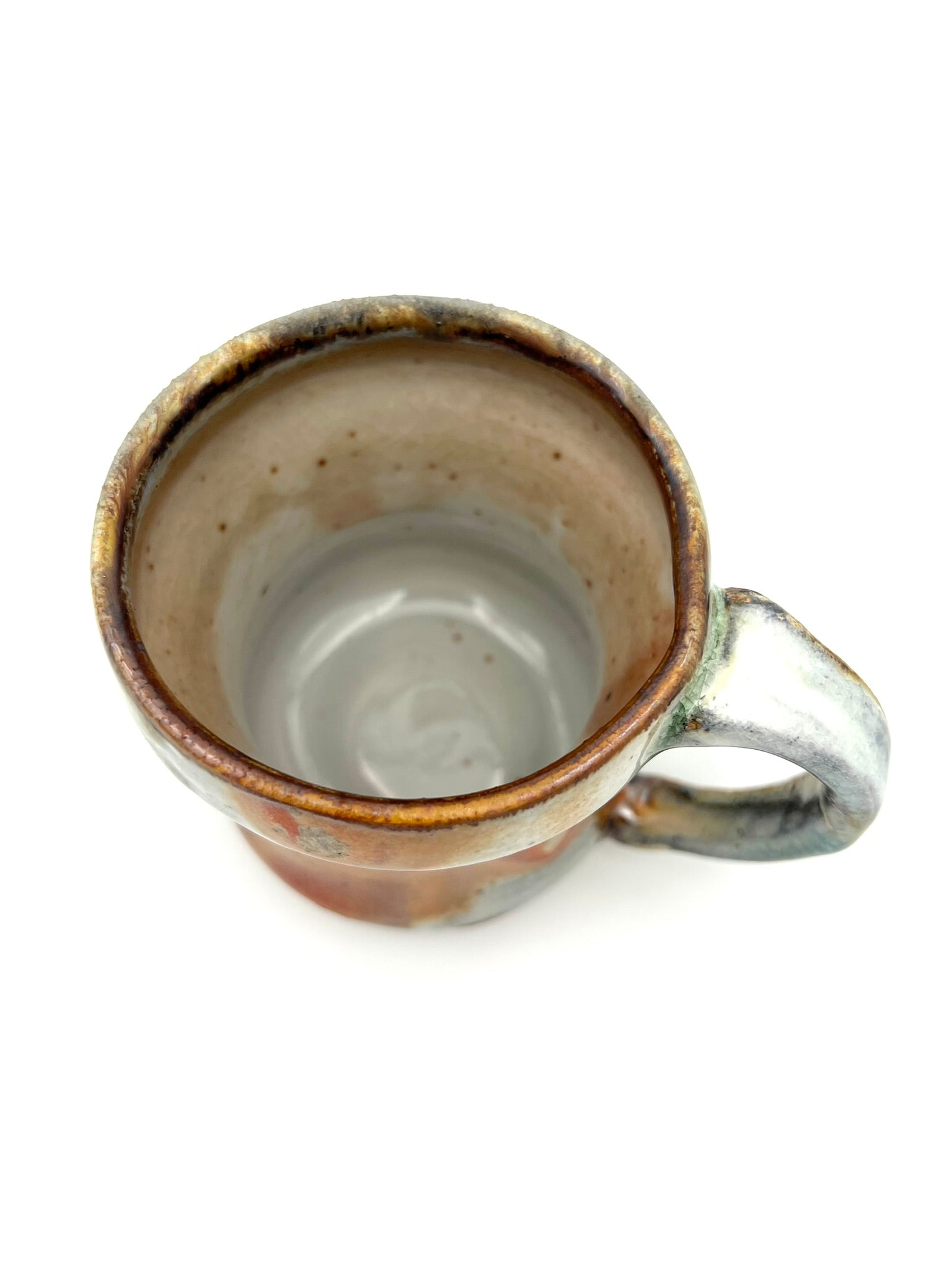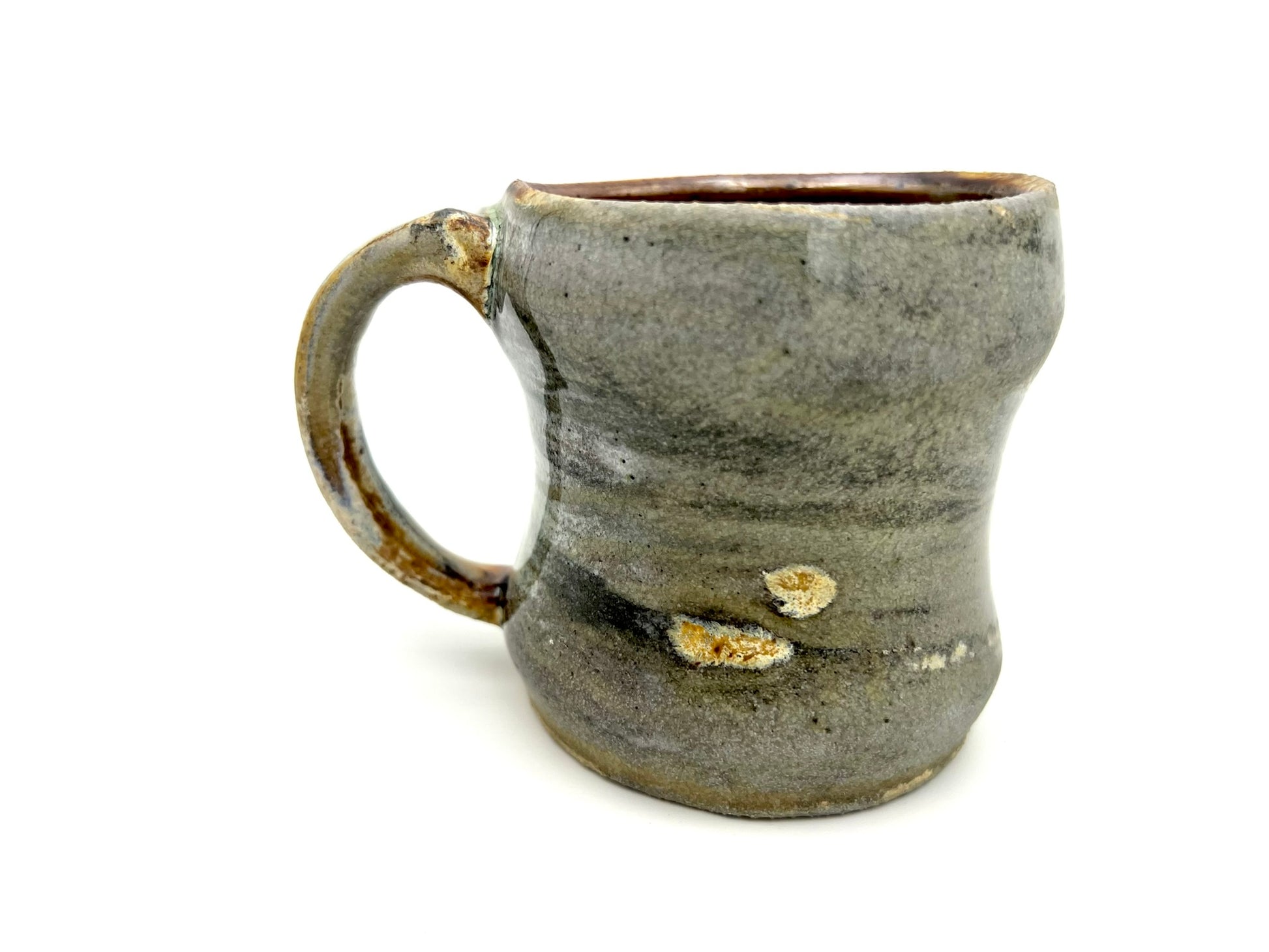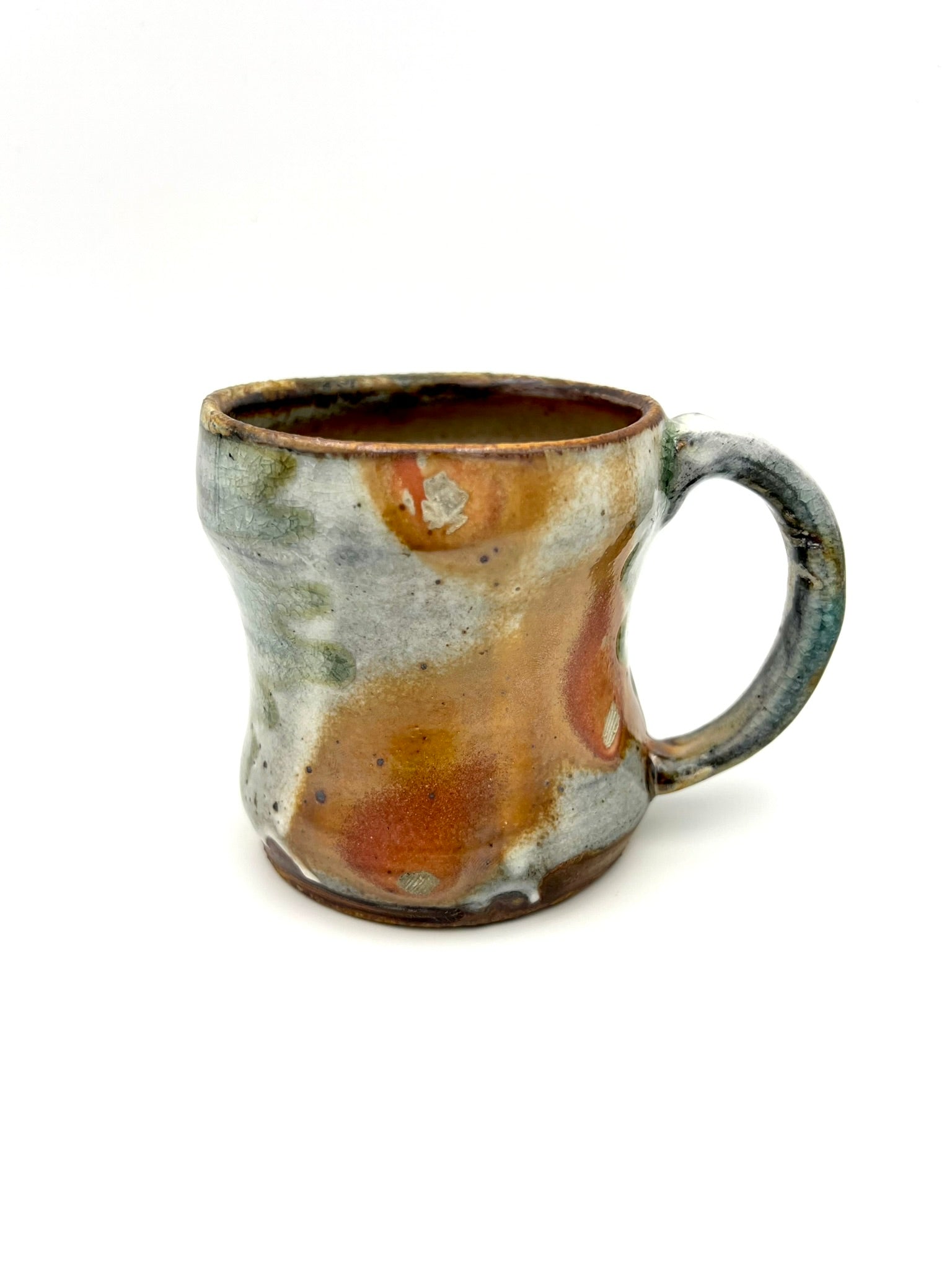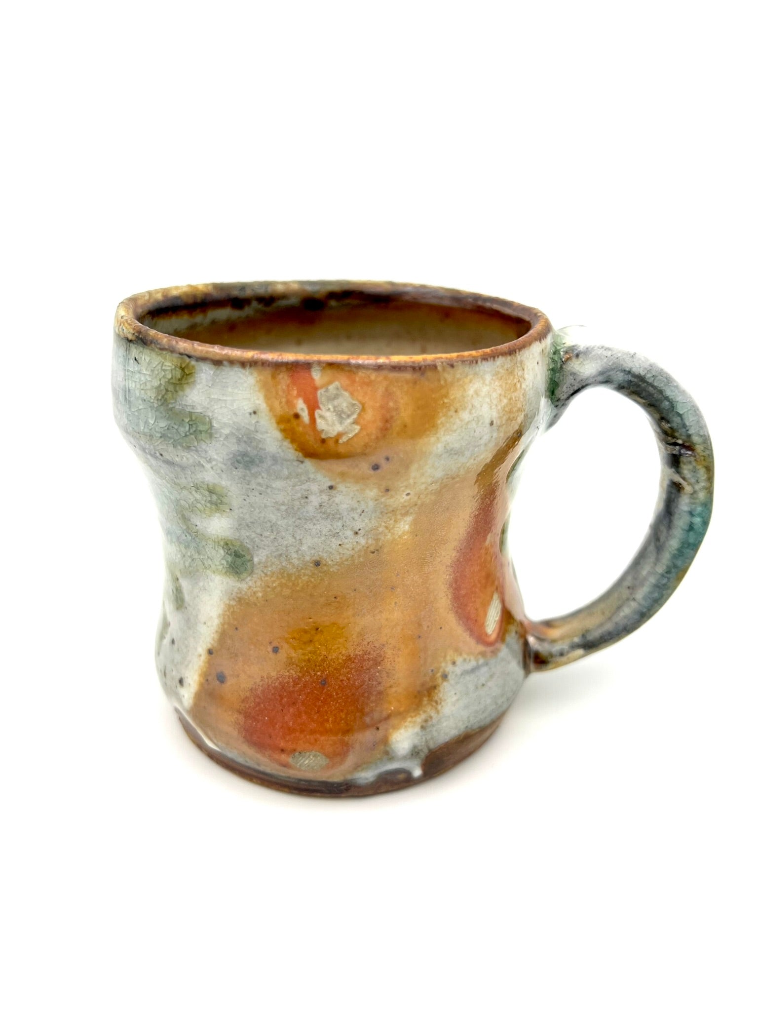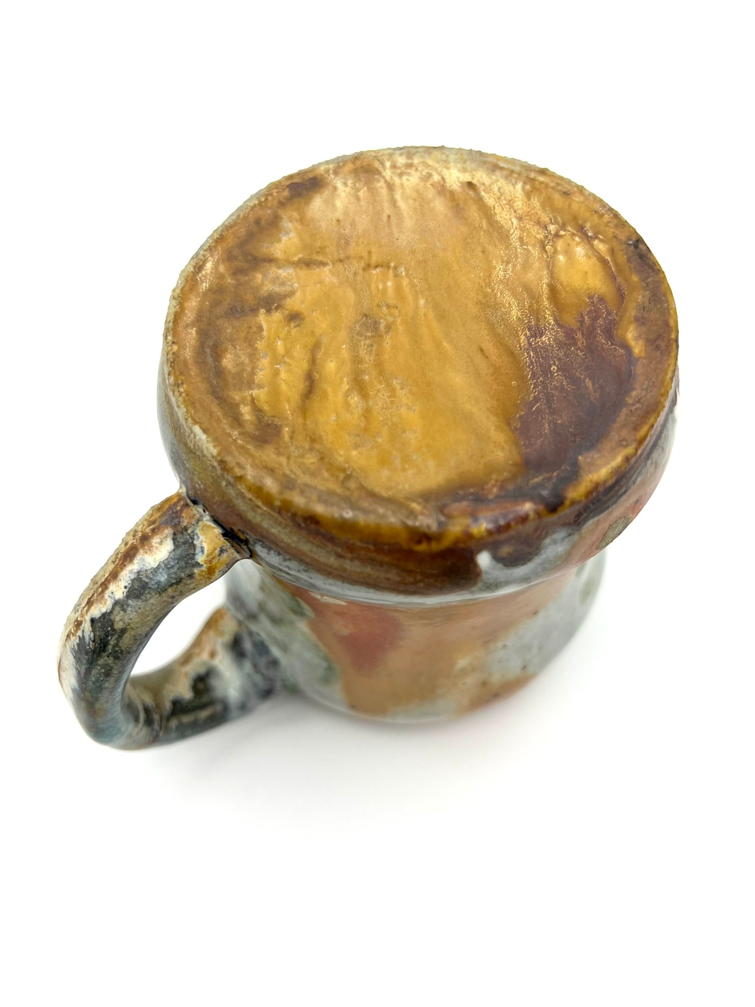 This mug was thrown on the potters wheel. It is made of Newcomb Tile Mix clay with an ungodly amount of ceramic rutile wedged in. It was dipped in EPK slip and fired in the old Chicken Cat wood/soda kiln to cone 12. Scars from seashells adorn one side, as it was side fired on seashells. The mug measures 3.25 inches wide by 3.5 inches tall.