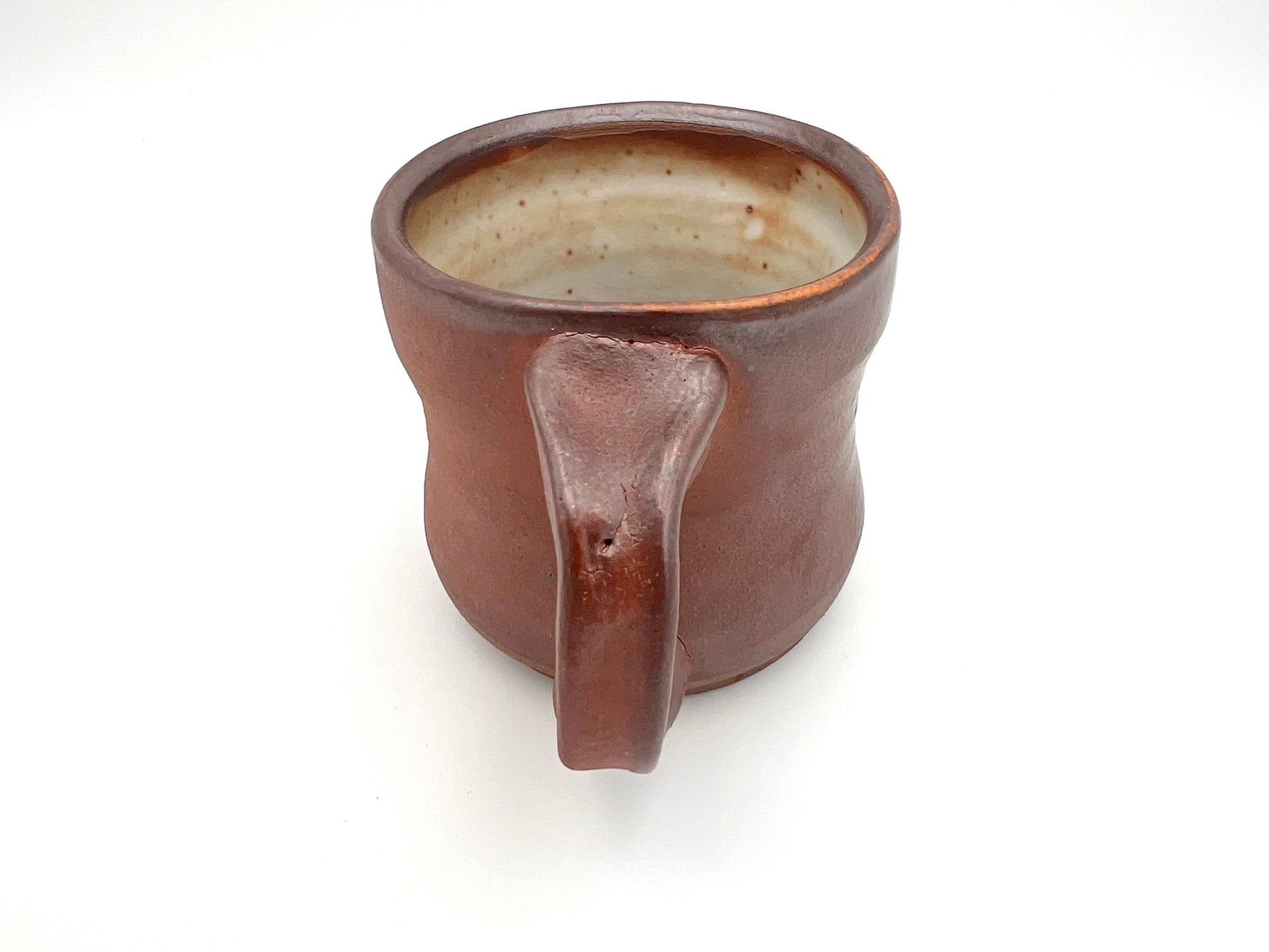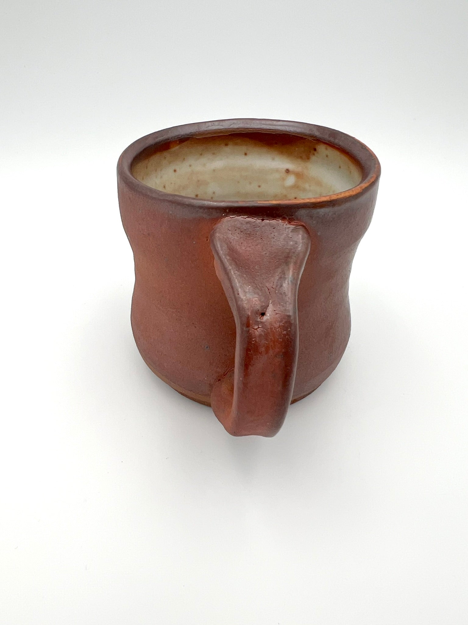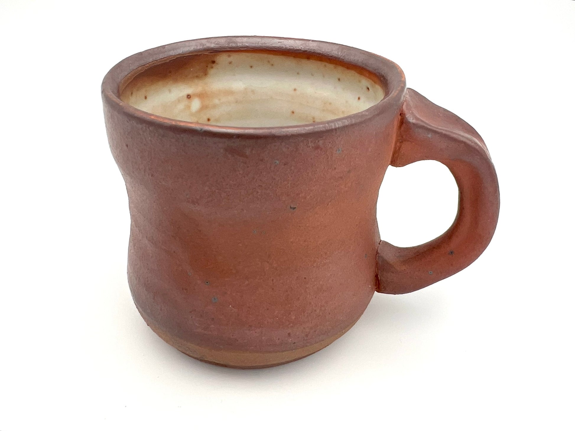 This smaller mug was thrown on the potters wheel. It is made of Newcomb Tile Mix clay with an ungodly amount of ceramic rutile wedged in. It was dipped in EPK slip and lined with Penn State Shino. This was reduction cooled in the old Chicken Cat wood/soda kiln. The mug measures 3 inches wide by 3.25 inches tall.