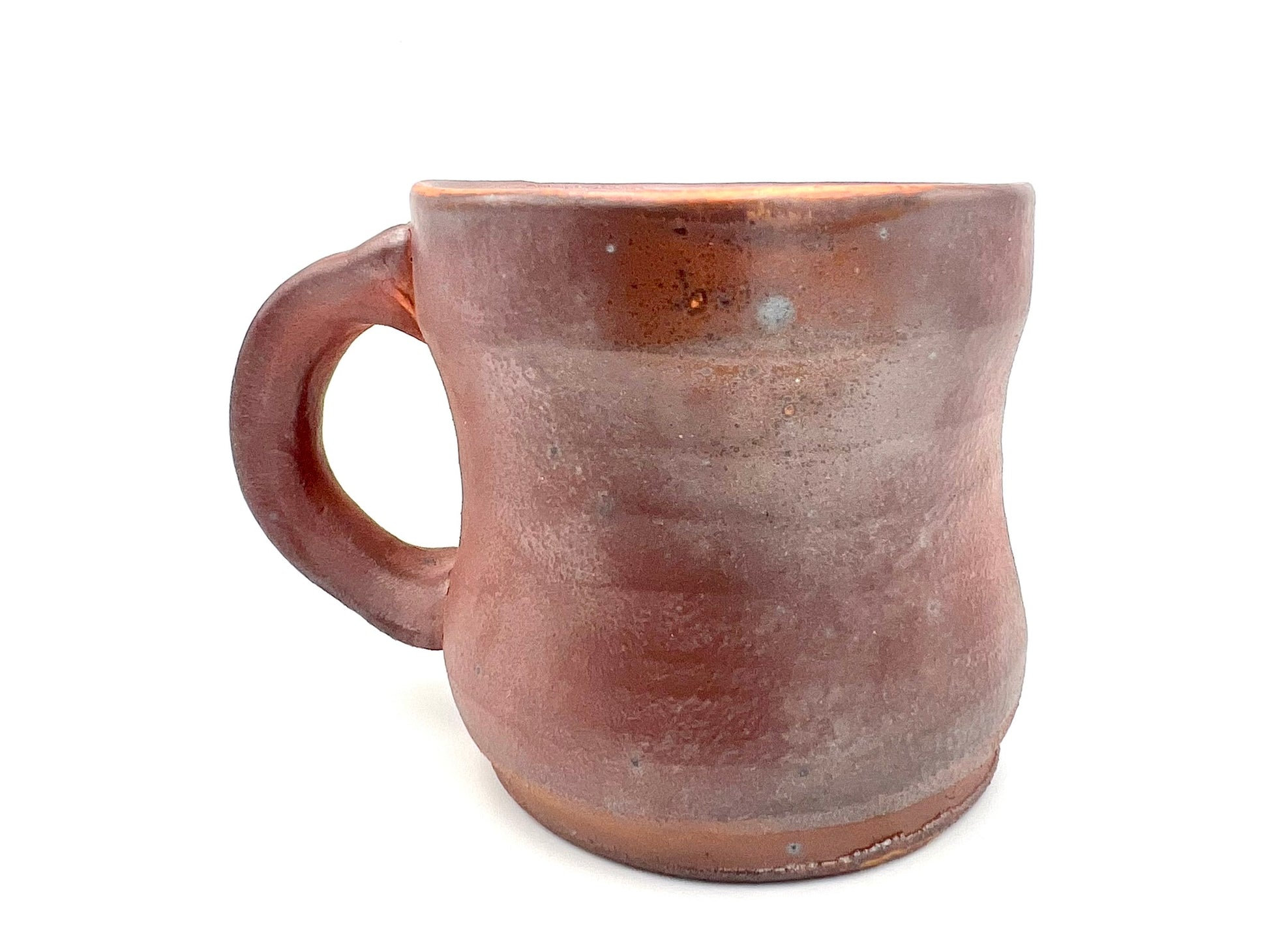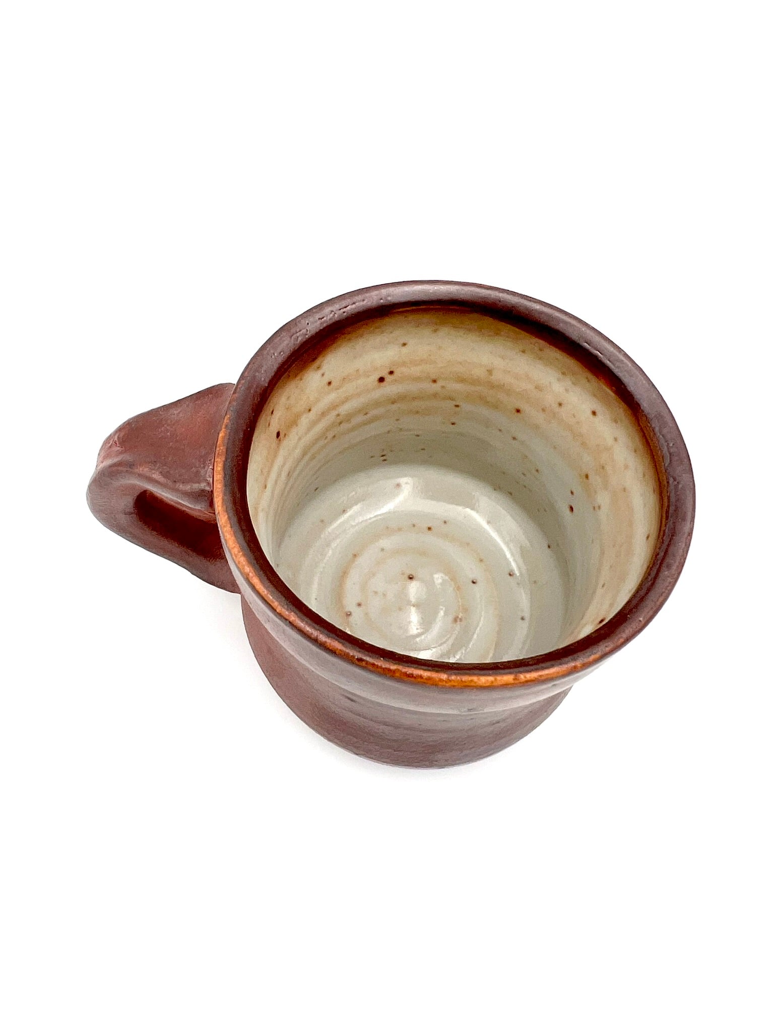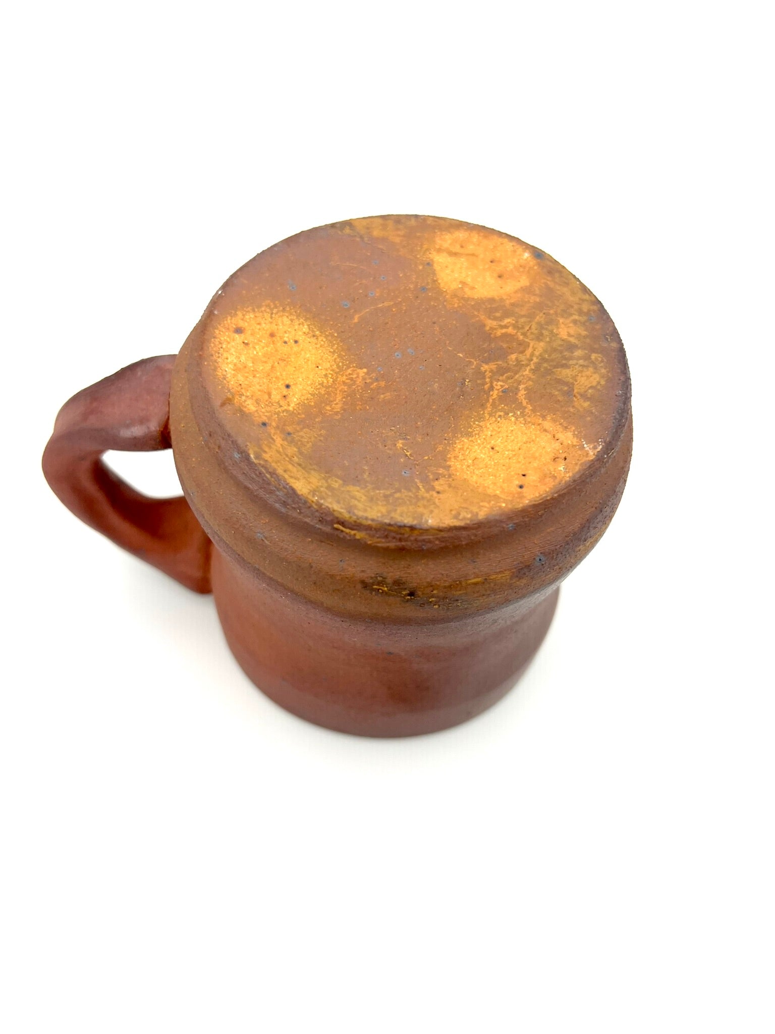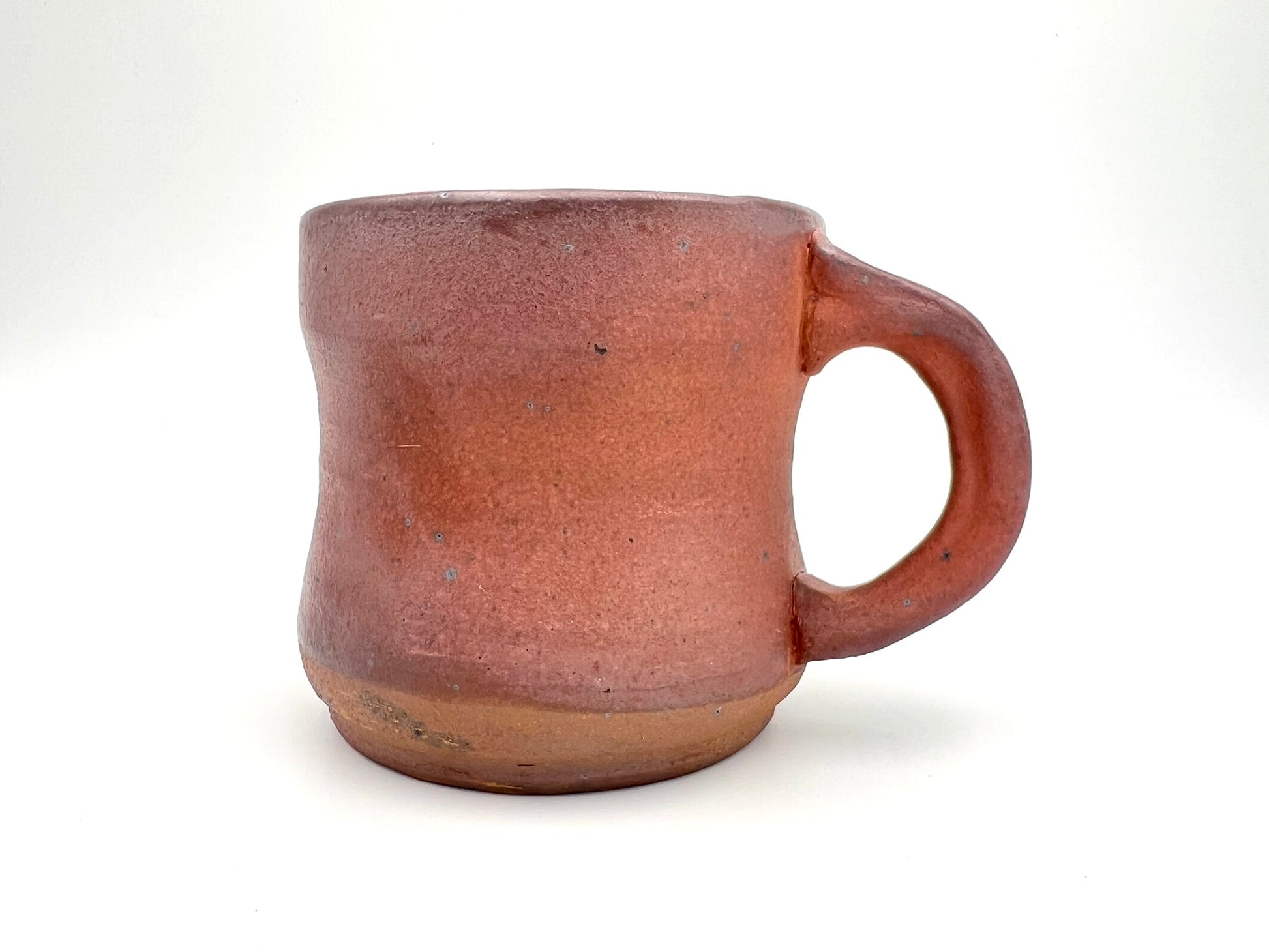 This smaller mug was thrown on the potters wheel. It is made of Newcomb Tile Mix clay with an ungodly amount of ceramic rutile wedged in. It was dipped in EPK slip and lined with Penn State Shino. This was reduction cooled in the old Chicken Cat wood/soda kiln. The mug measures 3 inches wide by 3.25 inches tall.