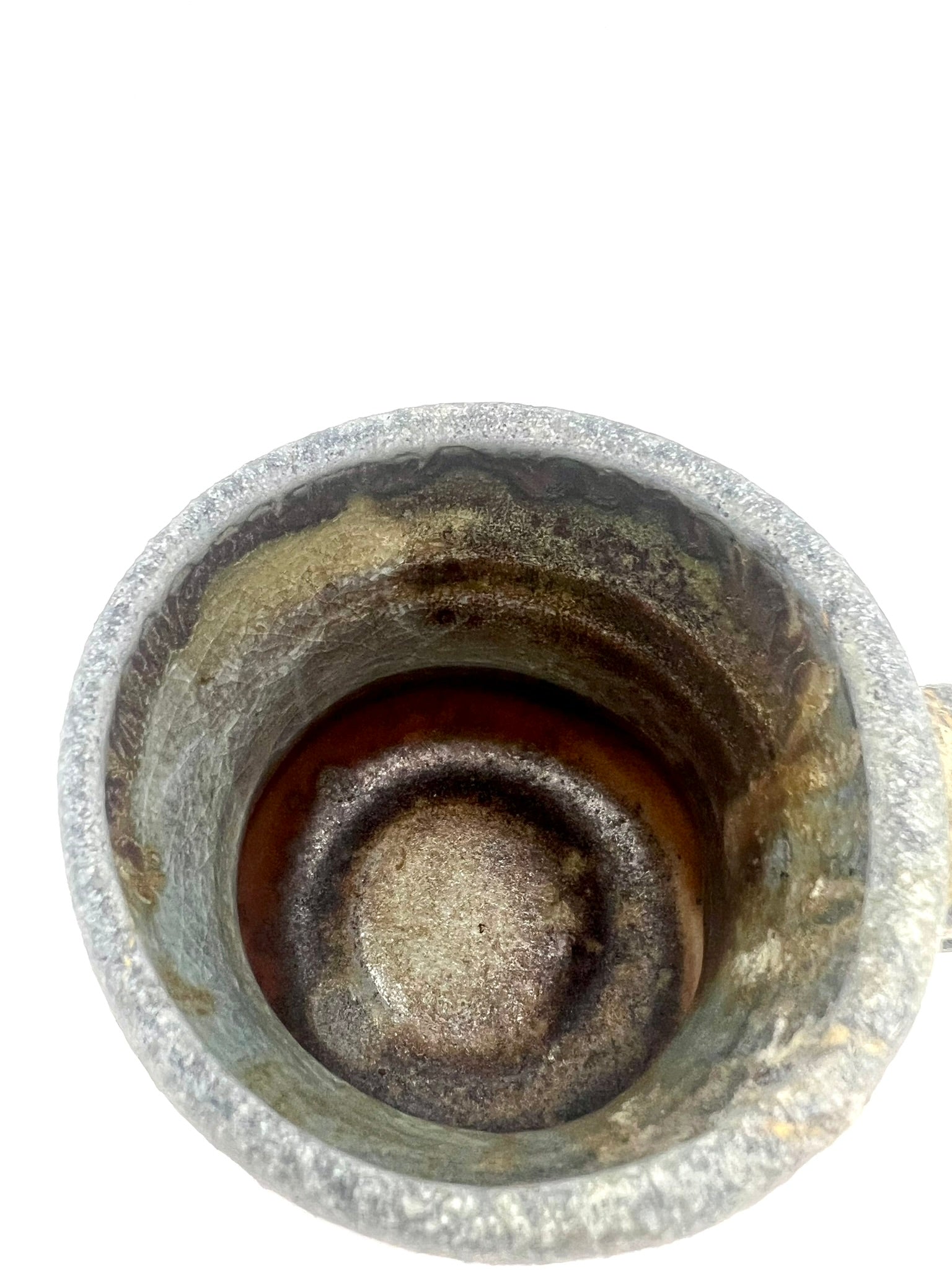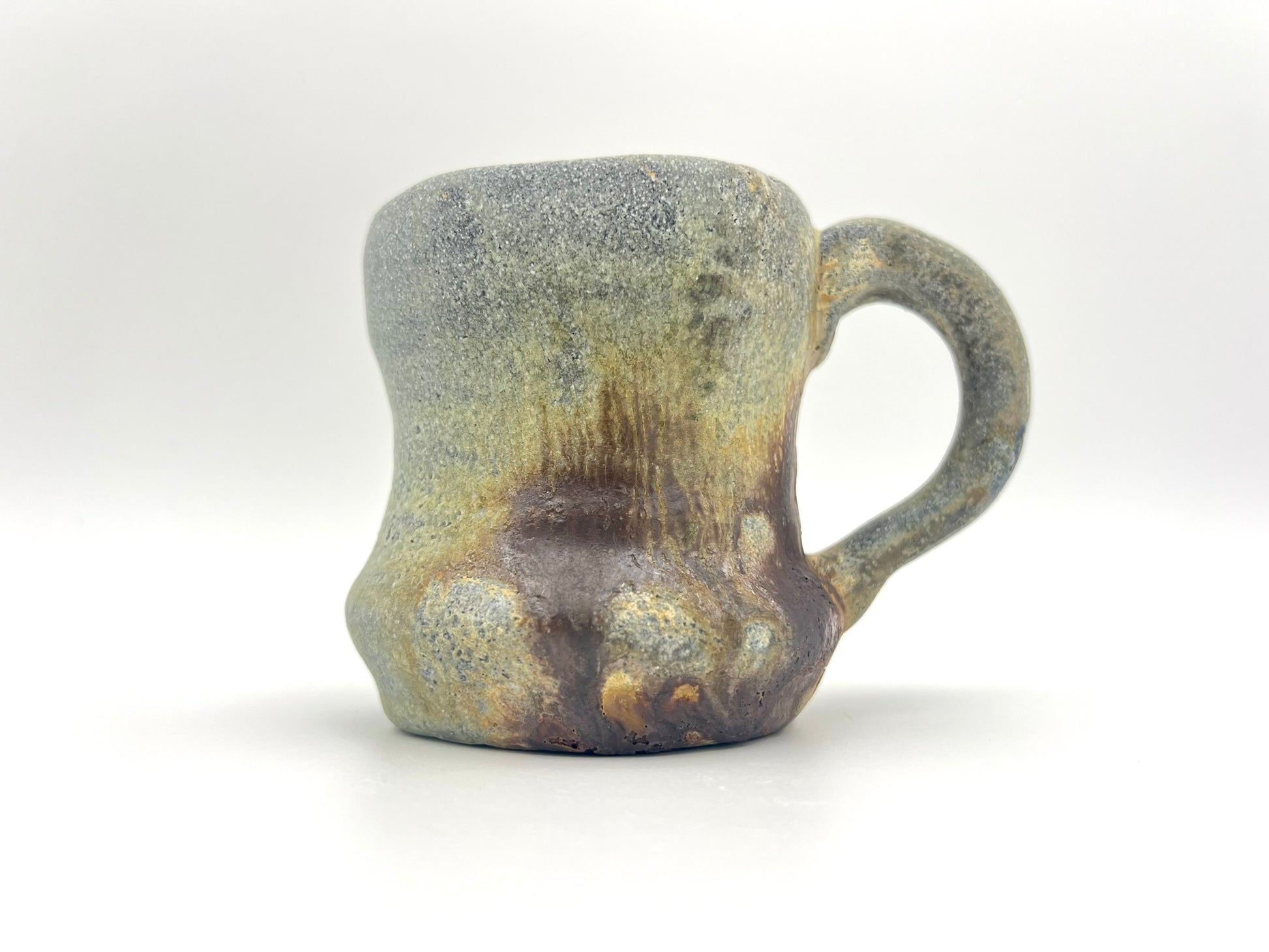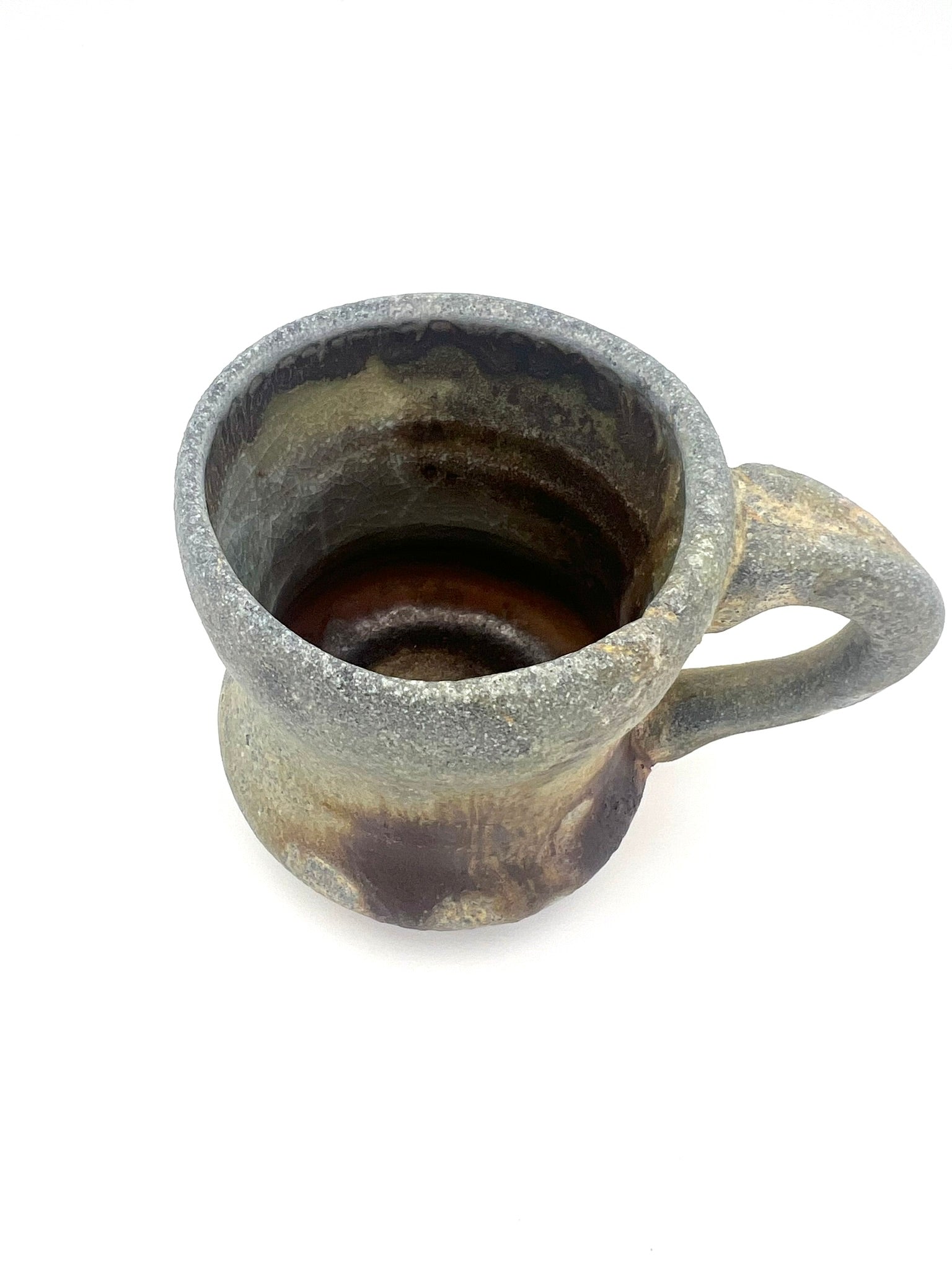 This smaller mug was thrown on the potters wheel. It is made of Newcomb Tile Mix clay with an ungodly amount of ceramic rutile wedged in. It was dipped in EPK slip and lined with Penn State Shino. This was reduction cooled in the old Chicken Cat wood/soda kiln. The mug measures 3 inches wide by 3.25 inches tall.